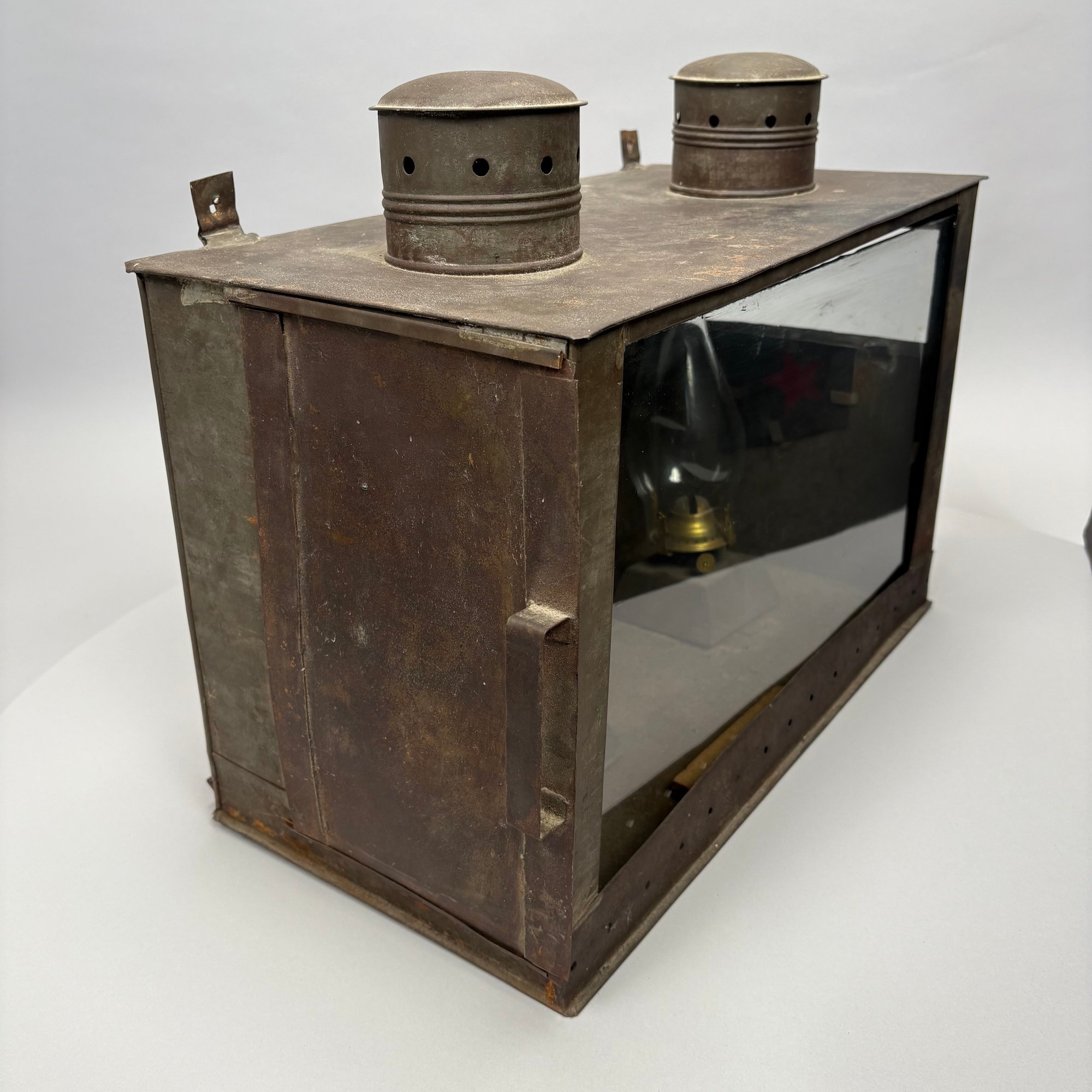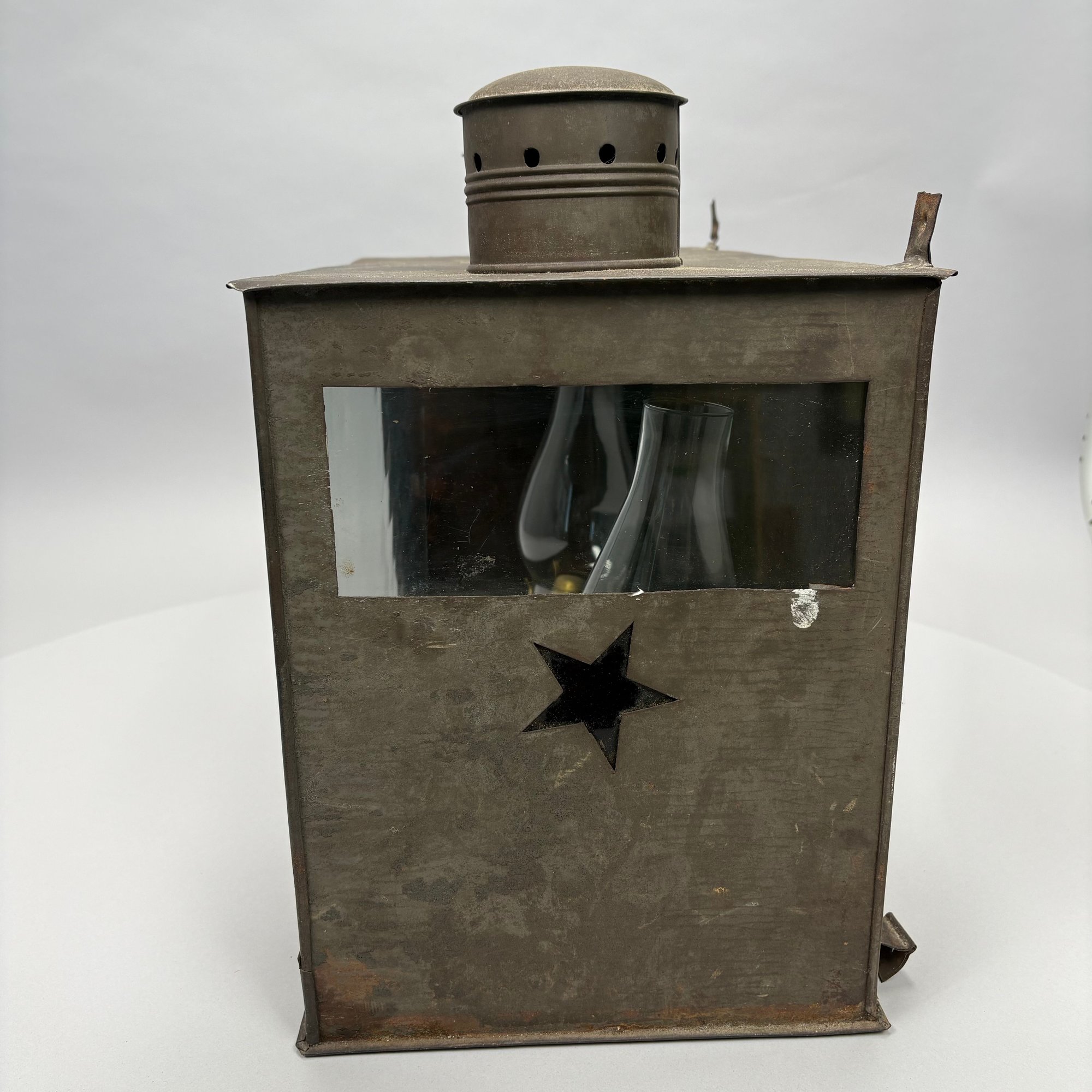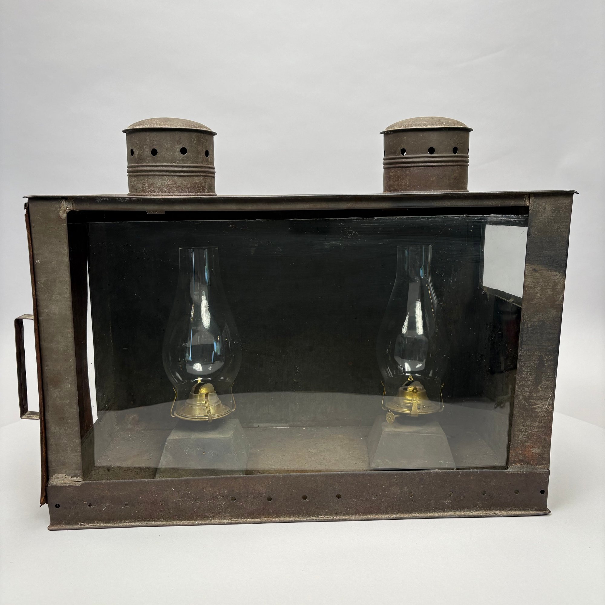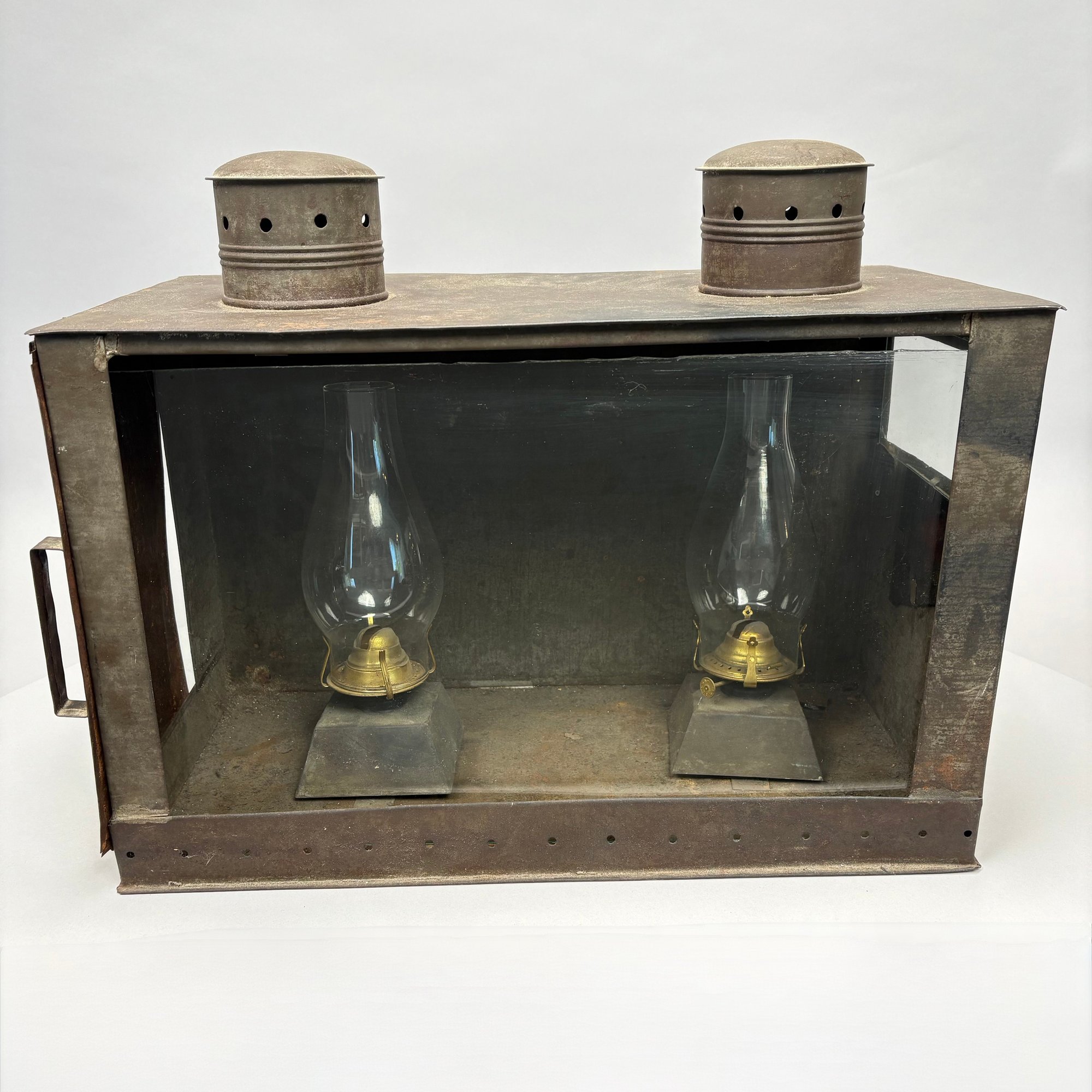 American Rectangular Tin Double Lantern, 19th Century. One end with a door (detached) and the other end with a glass pane over a punched star, fitted with two burners and glass shades, the top with two chimneys.