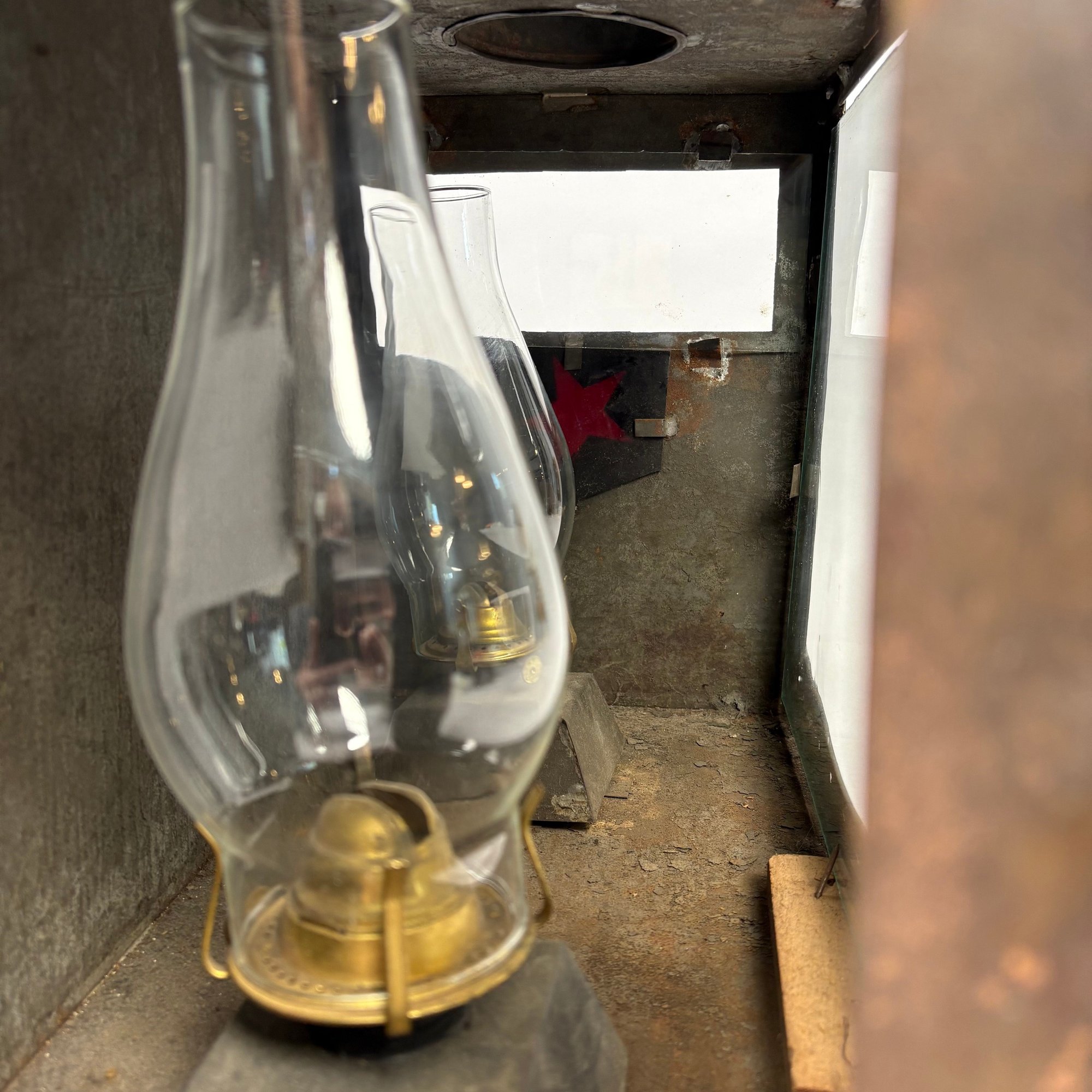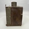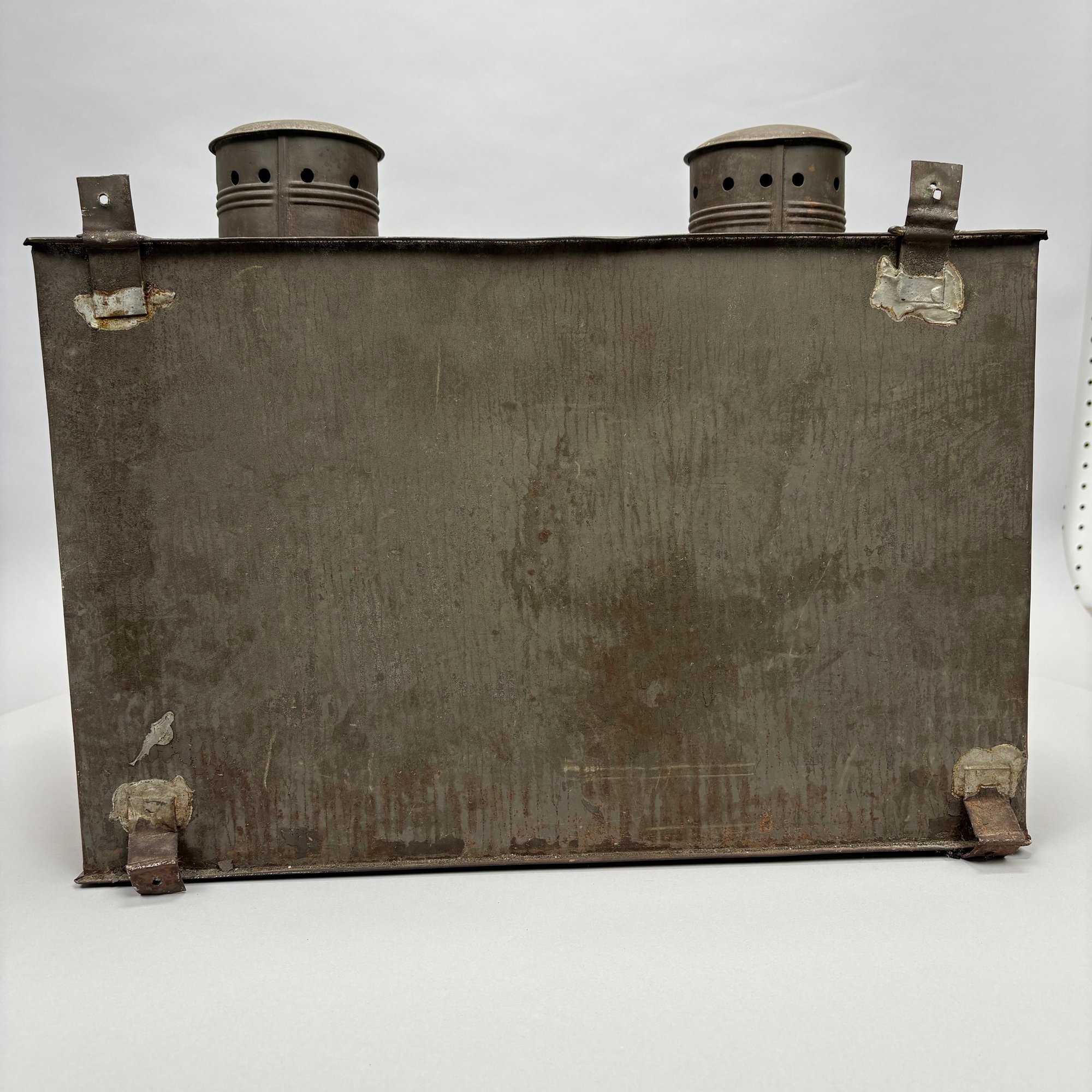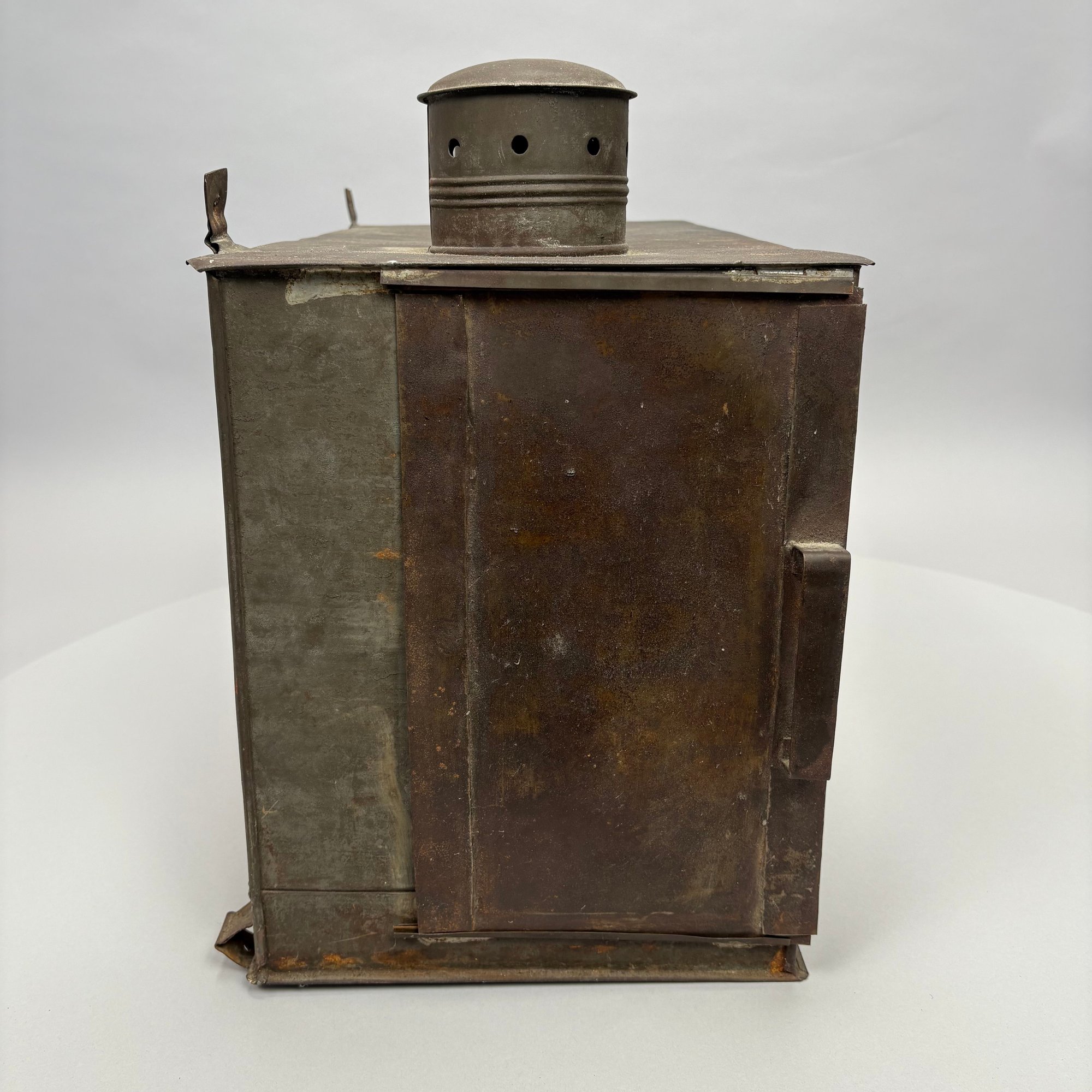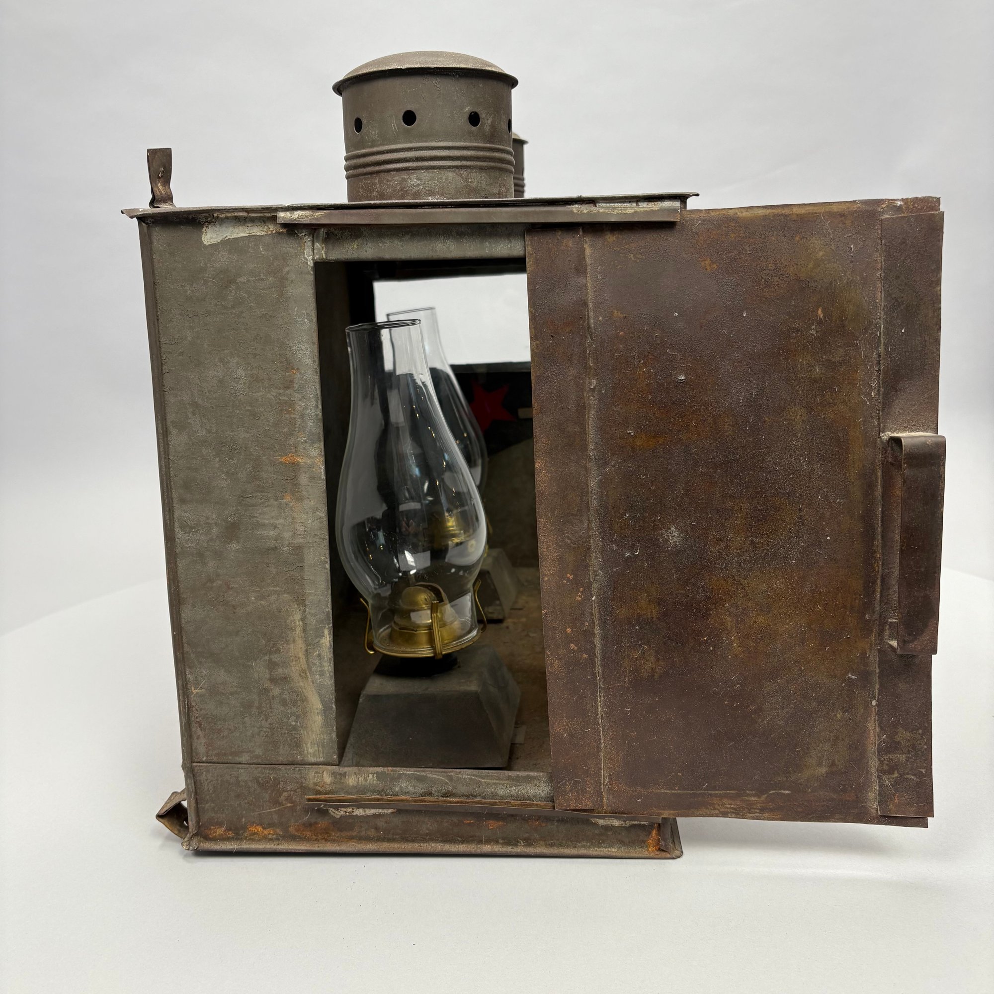 American Rectangular Tin Double Lantern, 19th Century. One end with a door (detached) and the other end with a glass pane over a punched star, fitted with two burners and glass shades, the top with two chimneys.