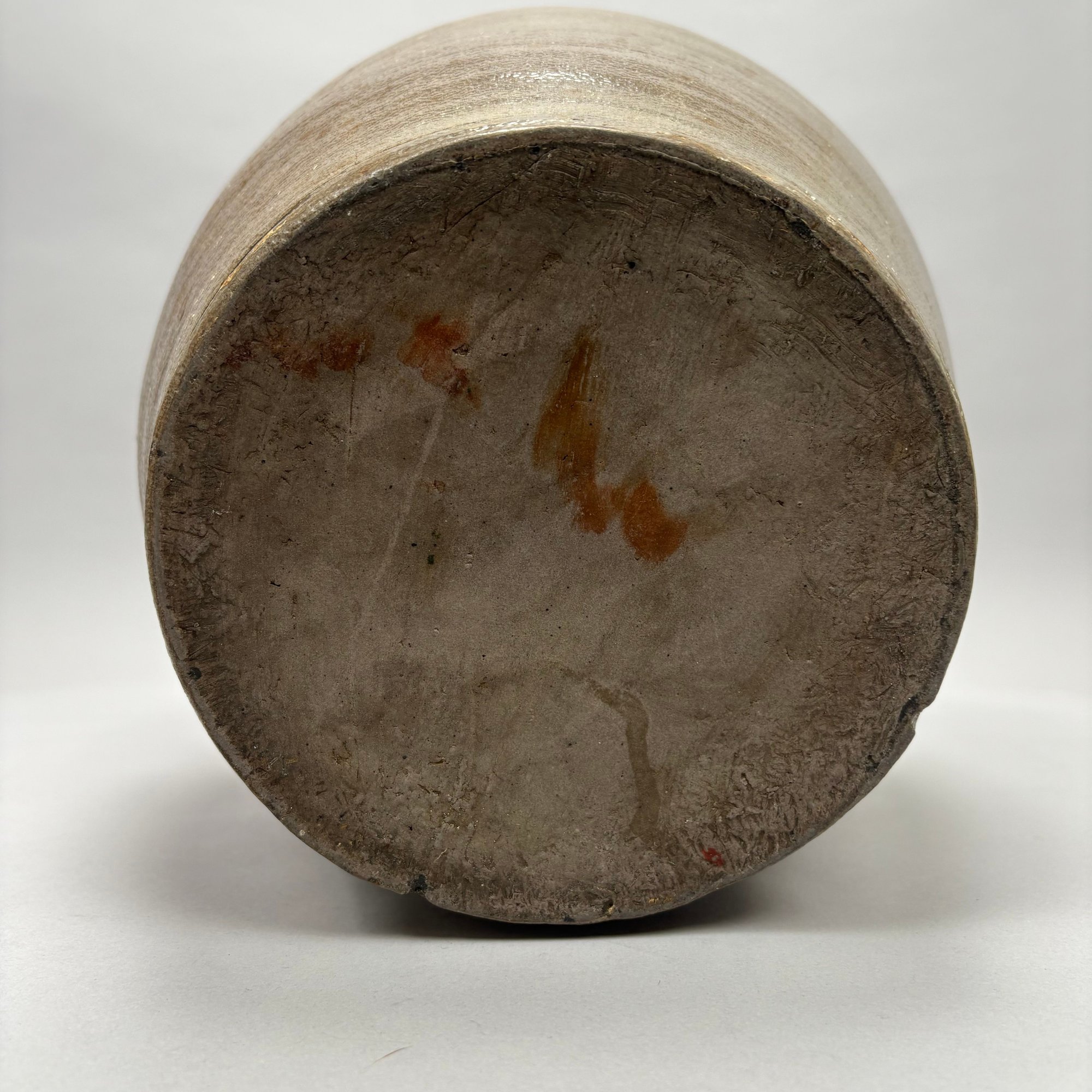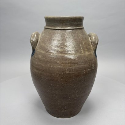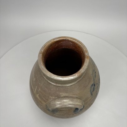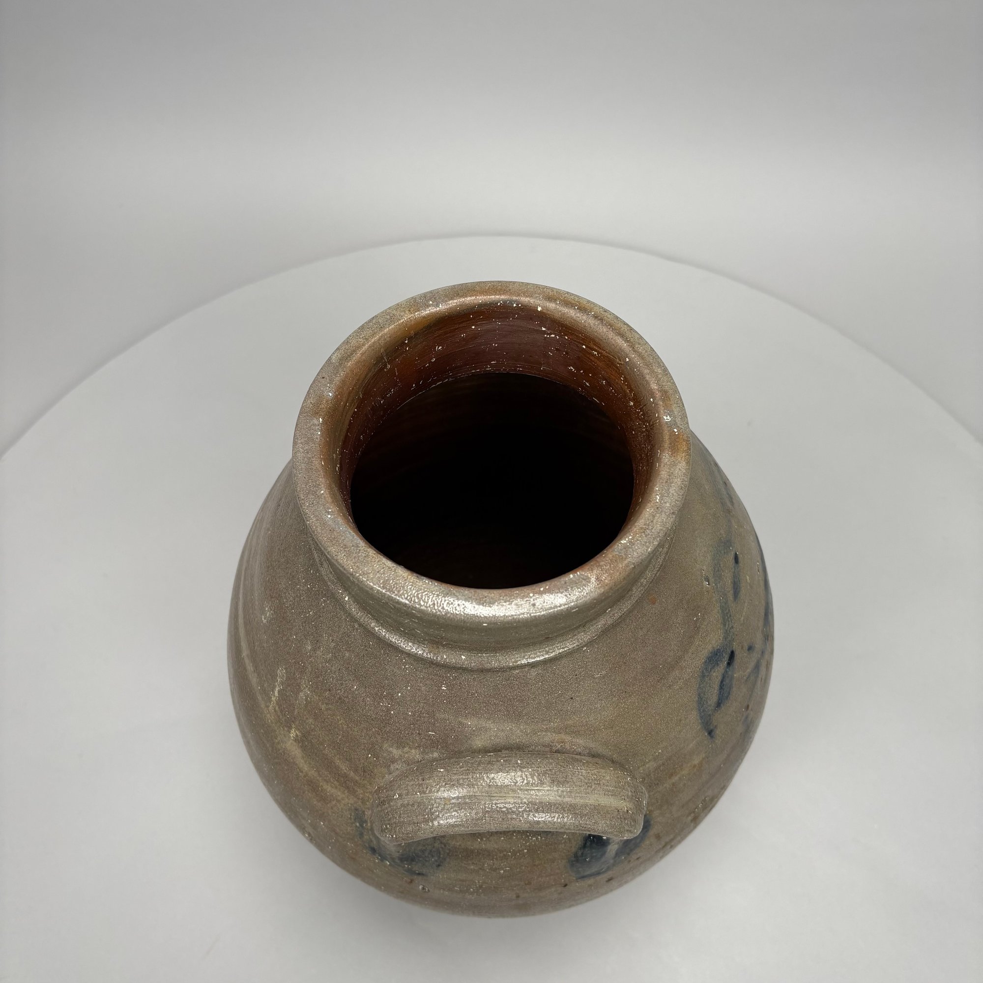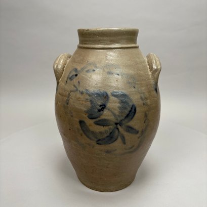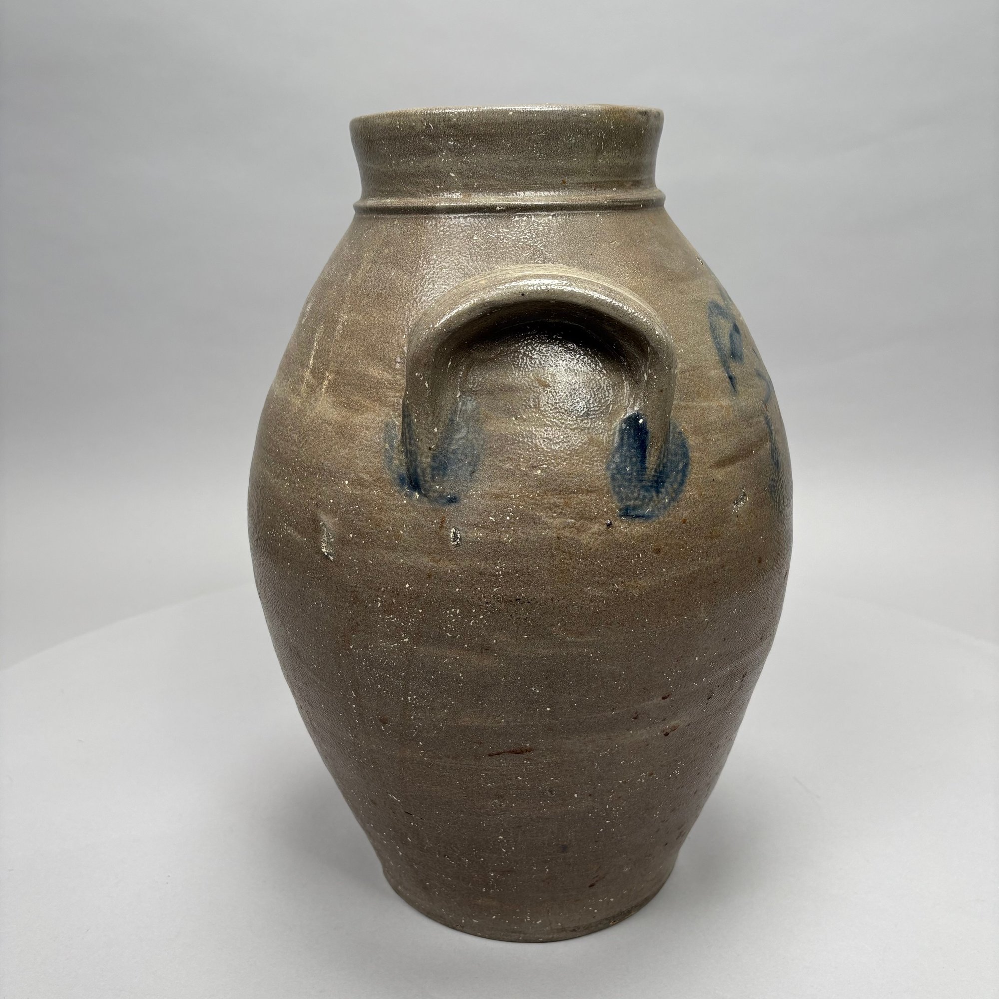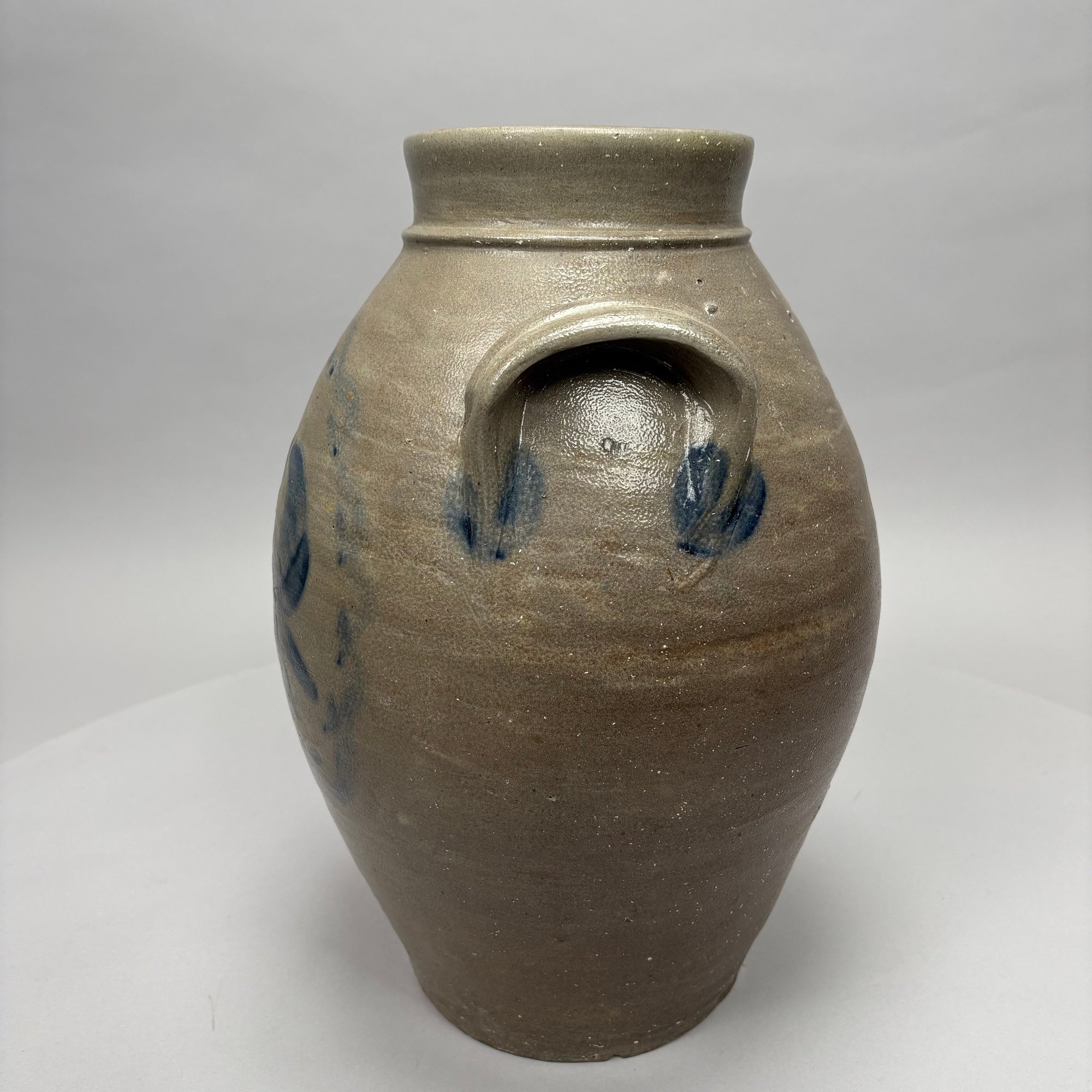 American Saltglaze Stoneware Cobalt Blue-Decorated Jar, 19th Century. Painted with a tulip surrounded by a circle, the lug handle terminals heightened in cobalt blue.