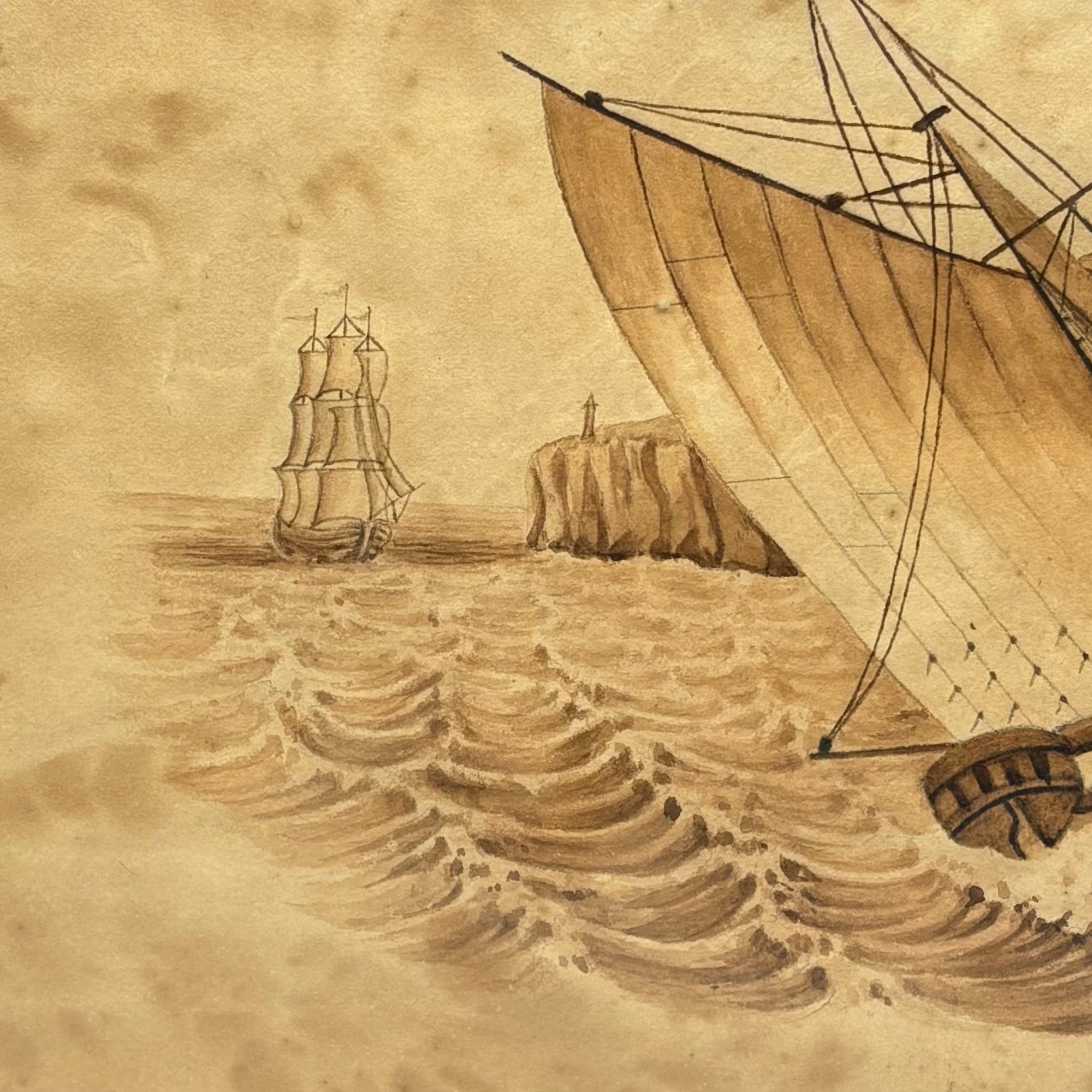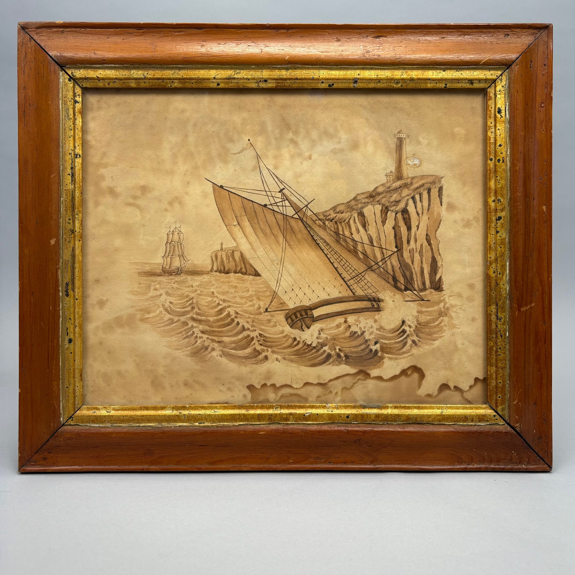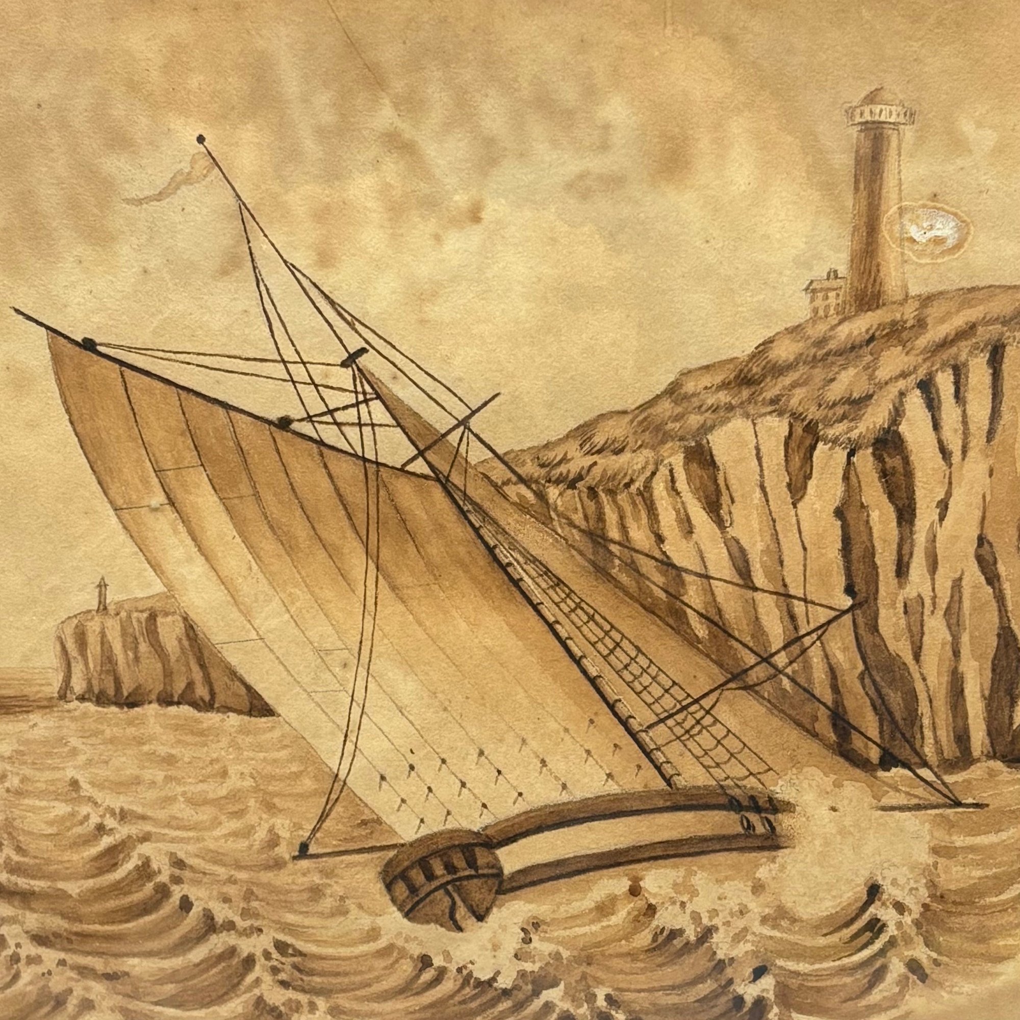 American School. Coastal View, 19th Century. Watercolor and drawing on paper, depicting a lighthouse on a high bluff, a sailboat in choppy waters and a lighthouse and ship in the distance, (9.875 x 12.875 inches, sight).