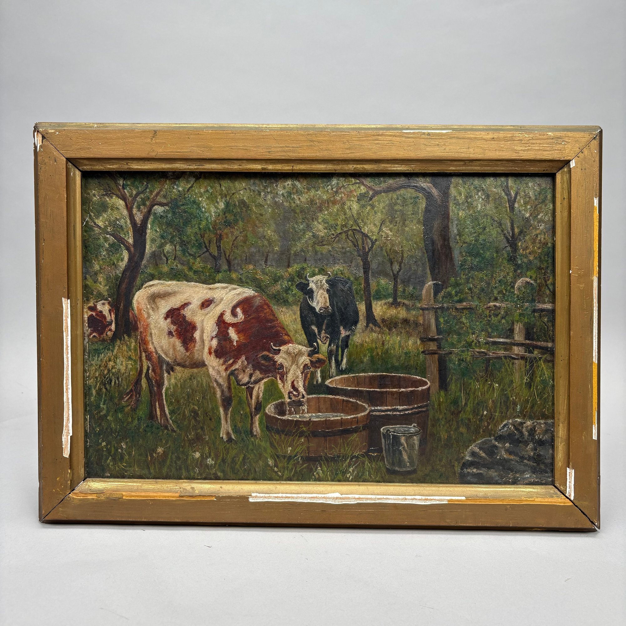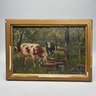 American School. Watering Cattle, 19th Century. Oil on academy board, (10.625 x 15.625 inches), Frost & Adams Co., Boston artists' supplies label on the reverse.