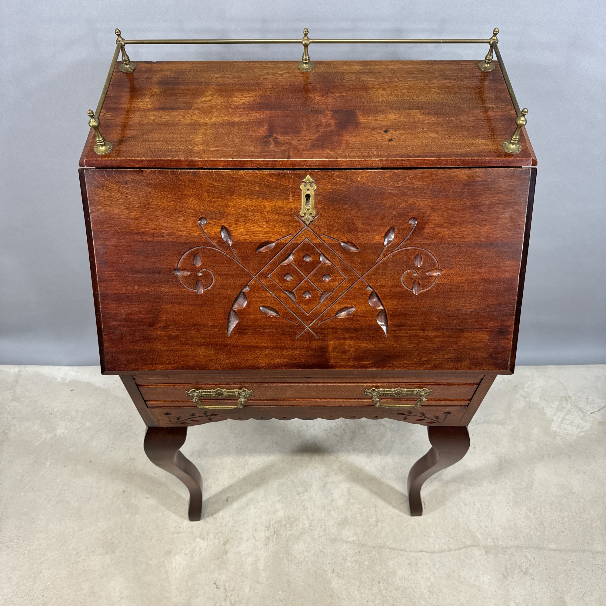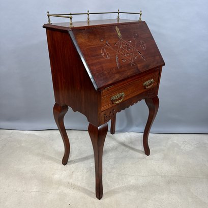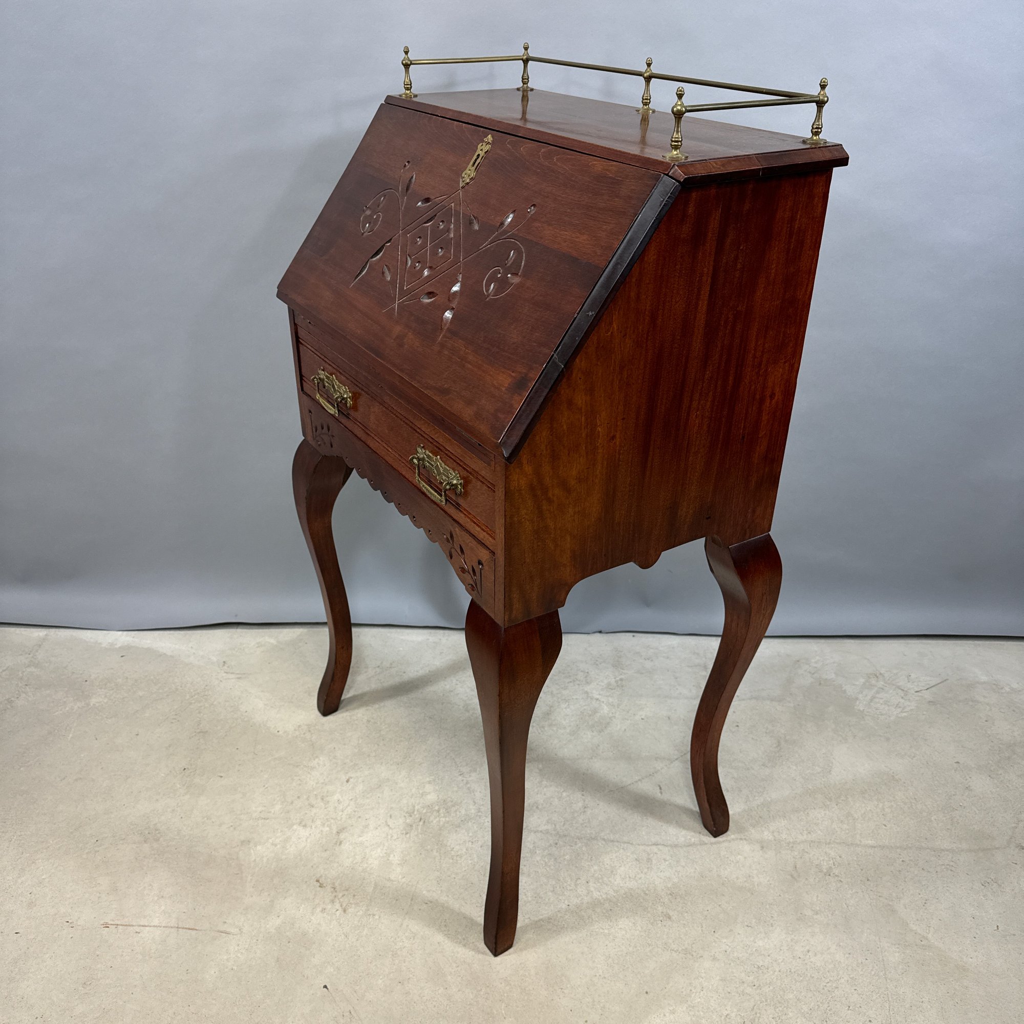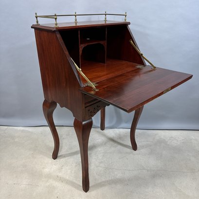 American Stained Birch Ladies Fall-Front Desk, 19th Century. The brass gallery top above the fall-front incise-carved in a trellis diamond diaper and scroll pattern, opening to a fitted interior, above a drawer and scalloped apron, raised on tall S-curved legs.