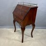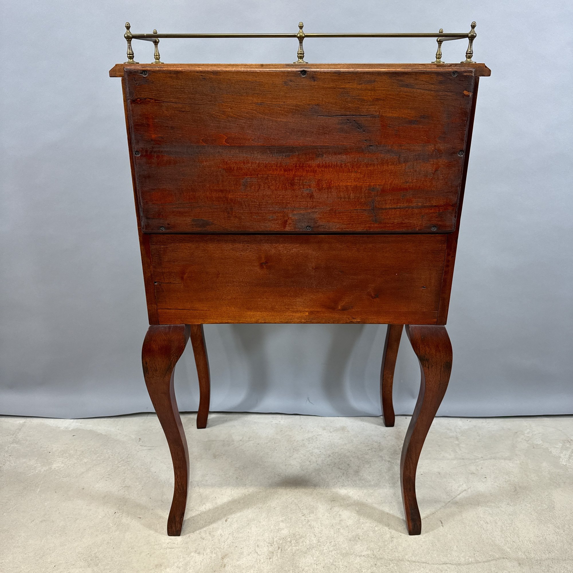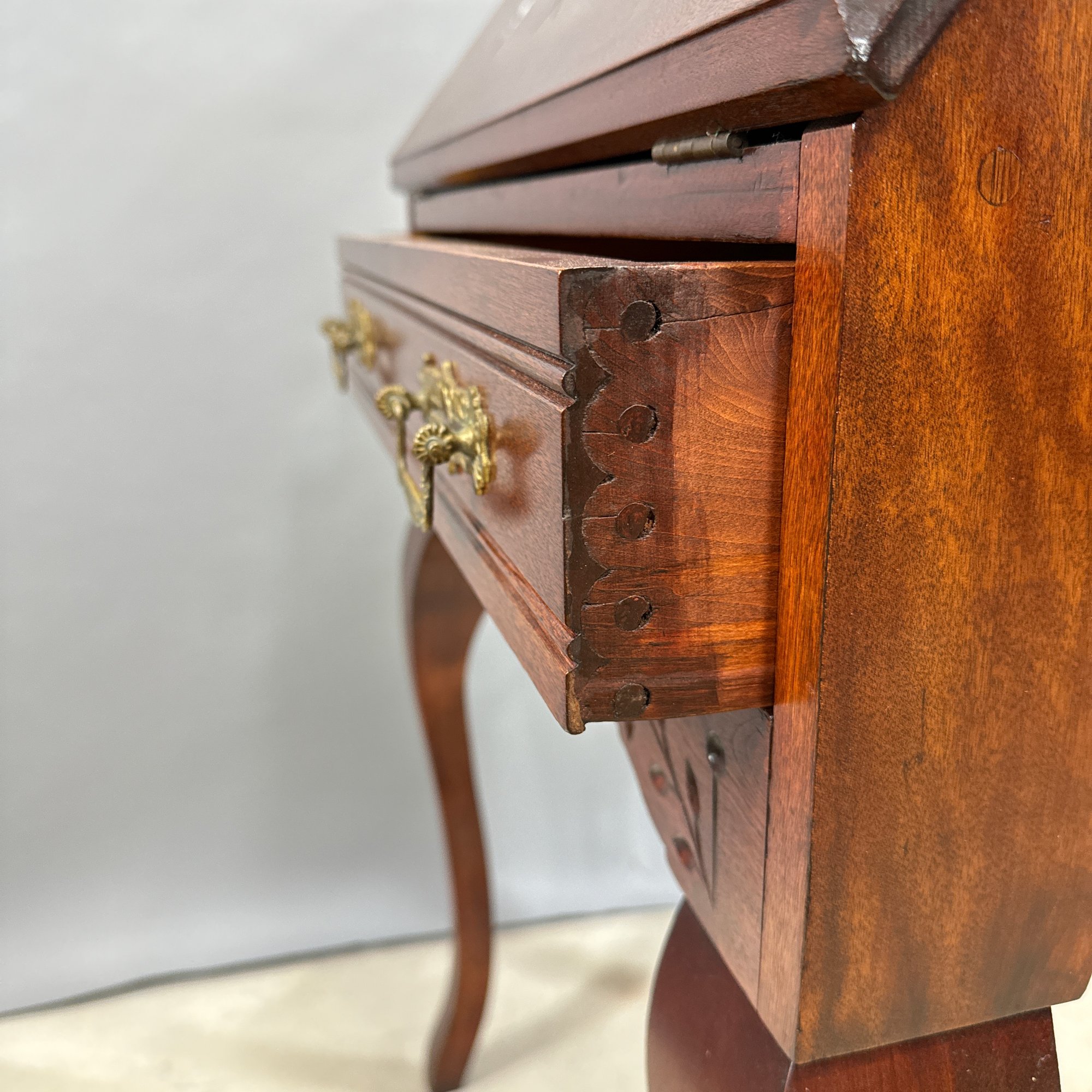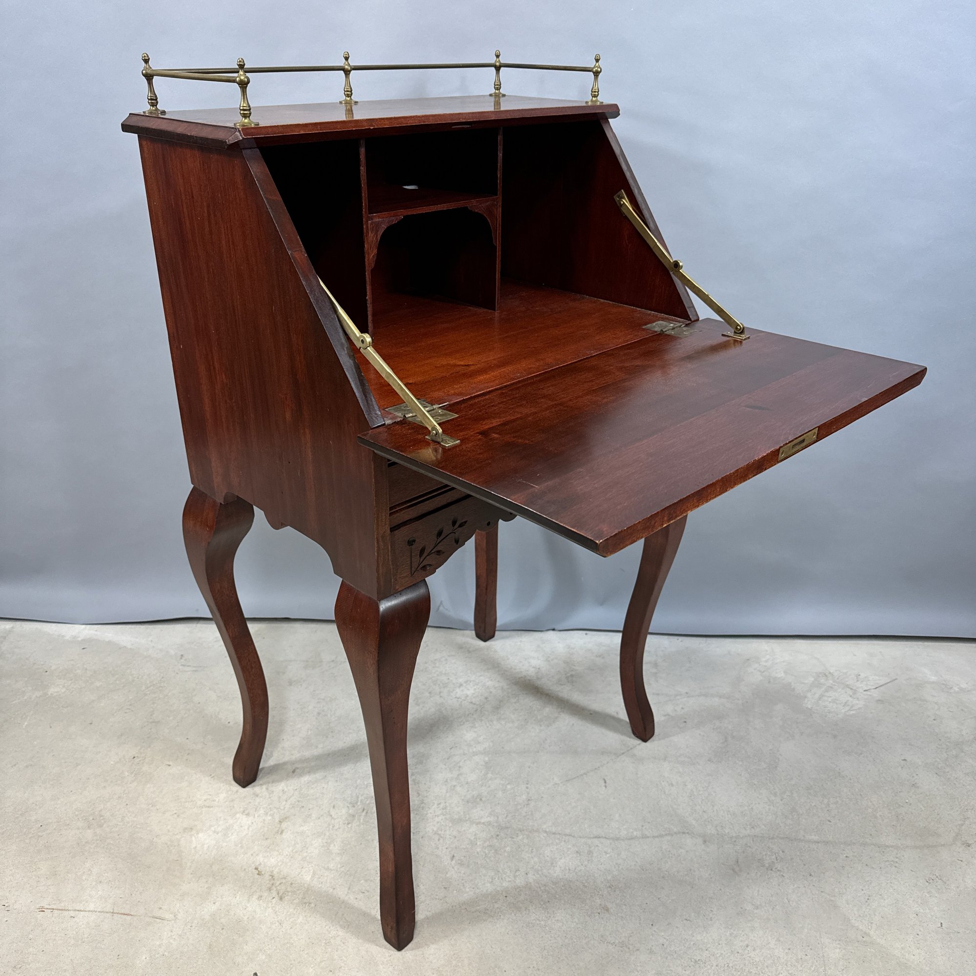 American Stained Birch Ladies Fall-Front Desk, 19th Century. The brass gallery top above the fall-front incise-carved in a trellis diamond diaper and scroll pattern, opening to a fitted interior, above a drawer and scalloped apron, raised on tall S-curved legs.