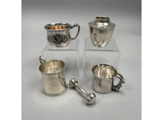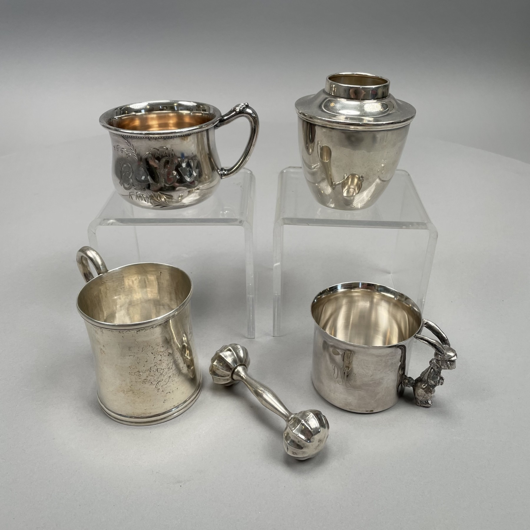 Engraved "Patti from CLL," not monogrammed, stamped "MERRIMAN" into a rectangle. Together with a sterling silver vase, S.Kirk & Son Co., 1896-1924, a pair of sterling silver custom-made candlesticks, and a sterling silver baby rattle; and a silverplate "BABY" cup, and a child's cup with bunny handle, engraved with the initials "DMA," both Reed & Barton. (7)