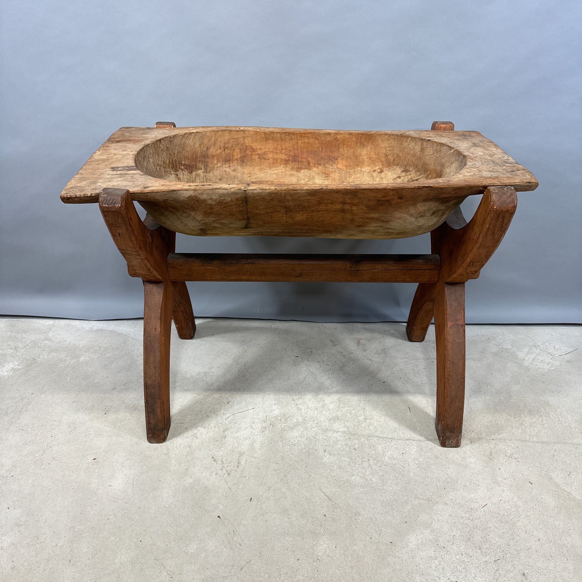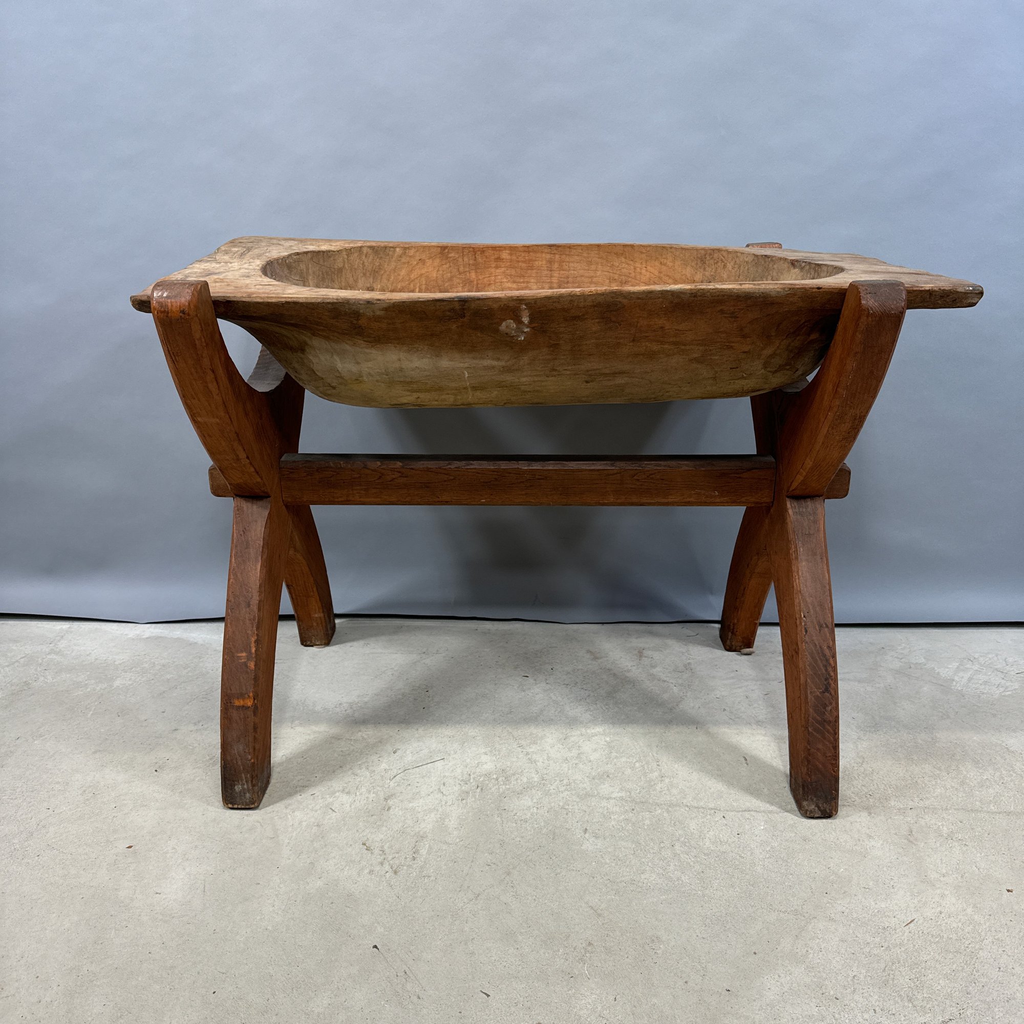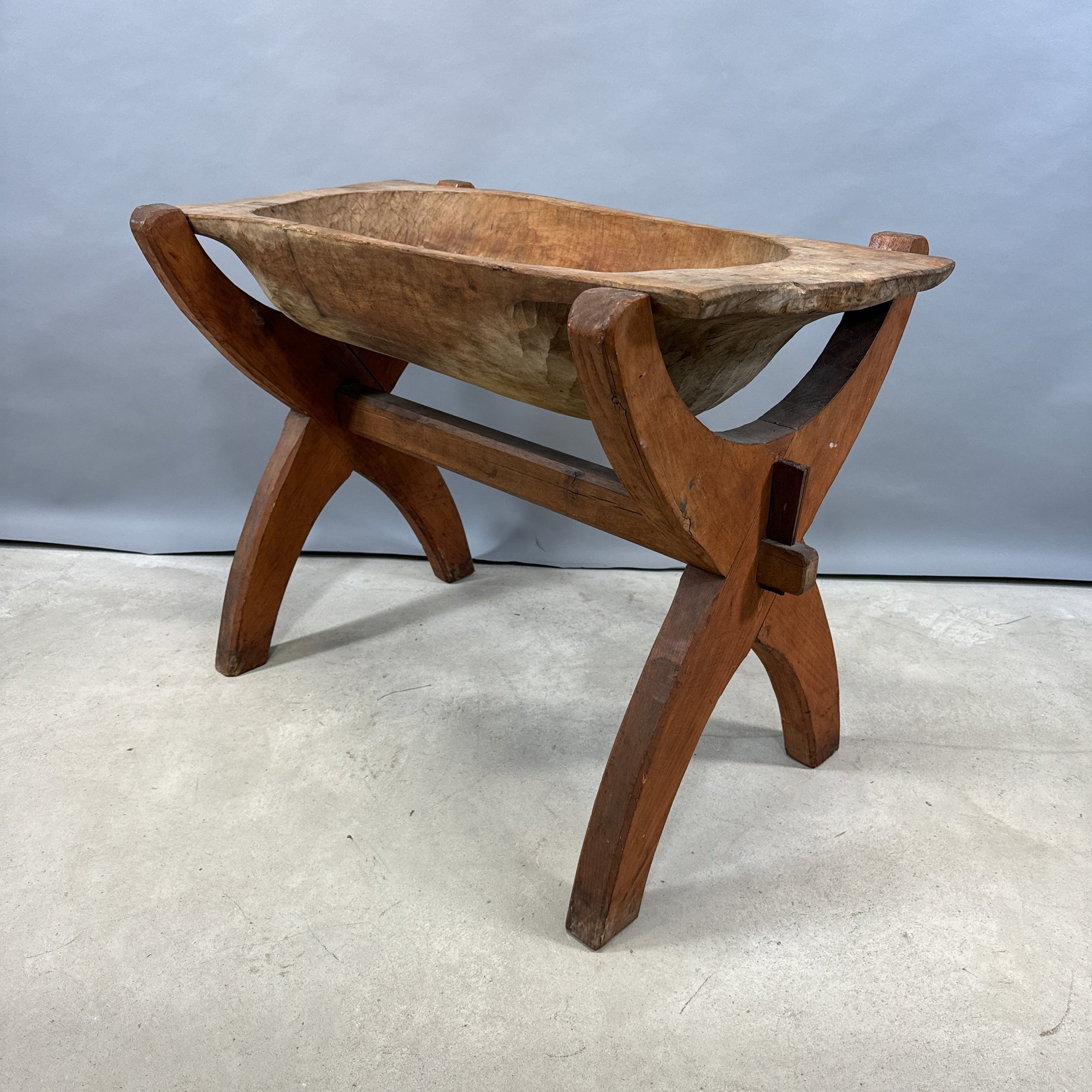 American Wooden Large Trencher, Mounted in a Stand. The trencher with wide ends mounted on a X-form stretcher.