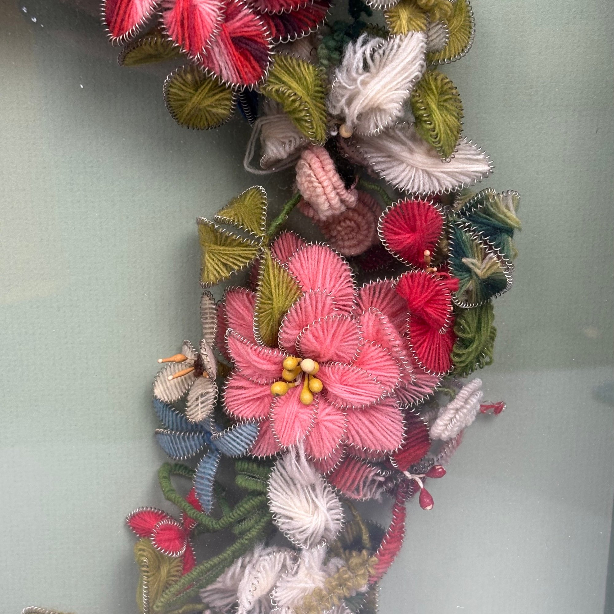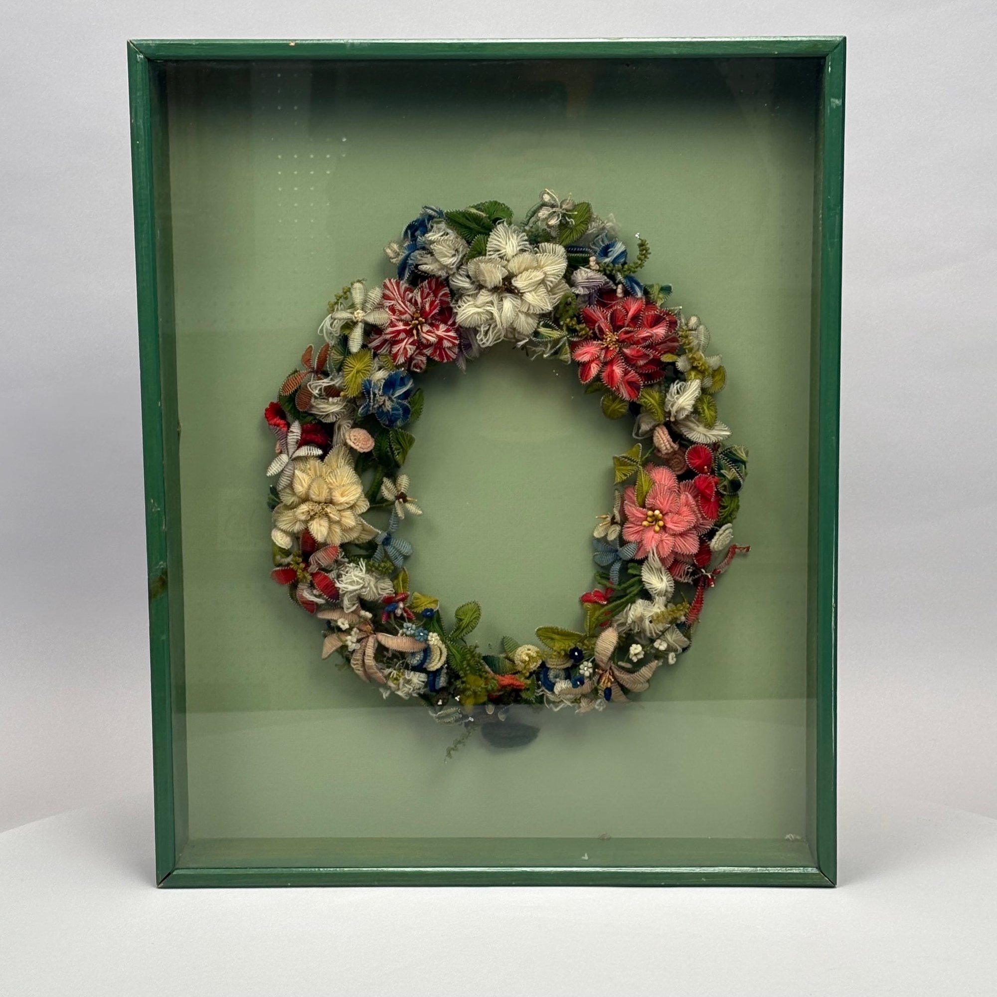 American Wool Work Floral Wreath, 1850-1870s. Housed in a shadowbox frame.