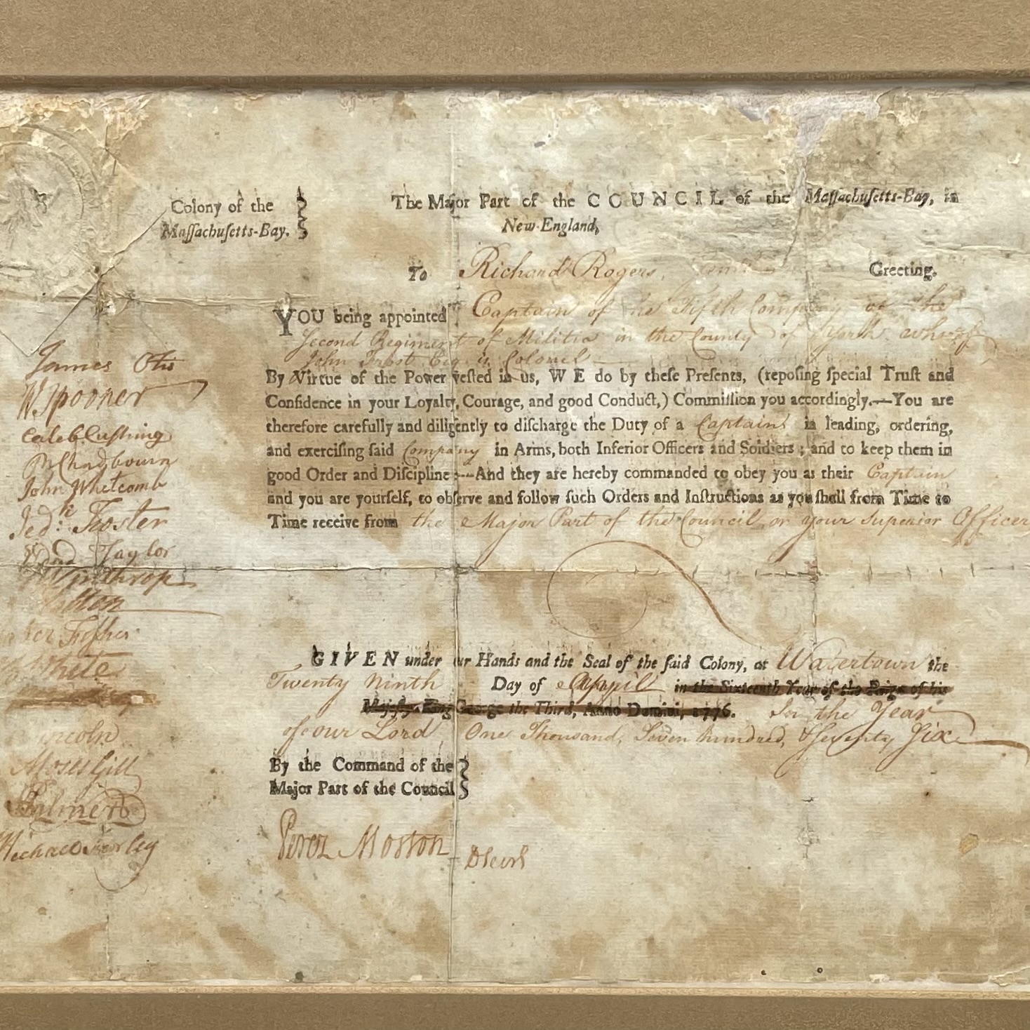 Inscribed "To Richard Rogers, Gentleman (?) Greeting, You being appointed Captain of the Fifth Company of the Second Regiment of Militia in the County of York whereof...," with additional documentation on the reverse.