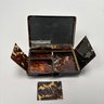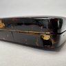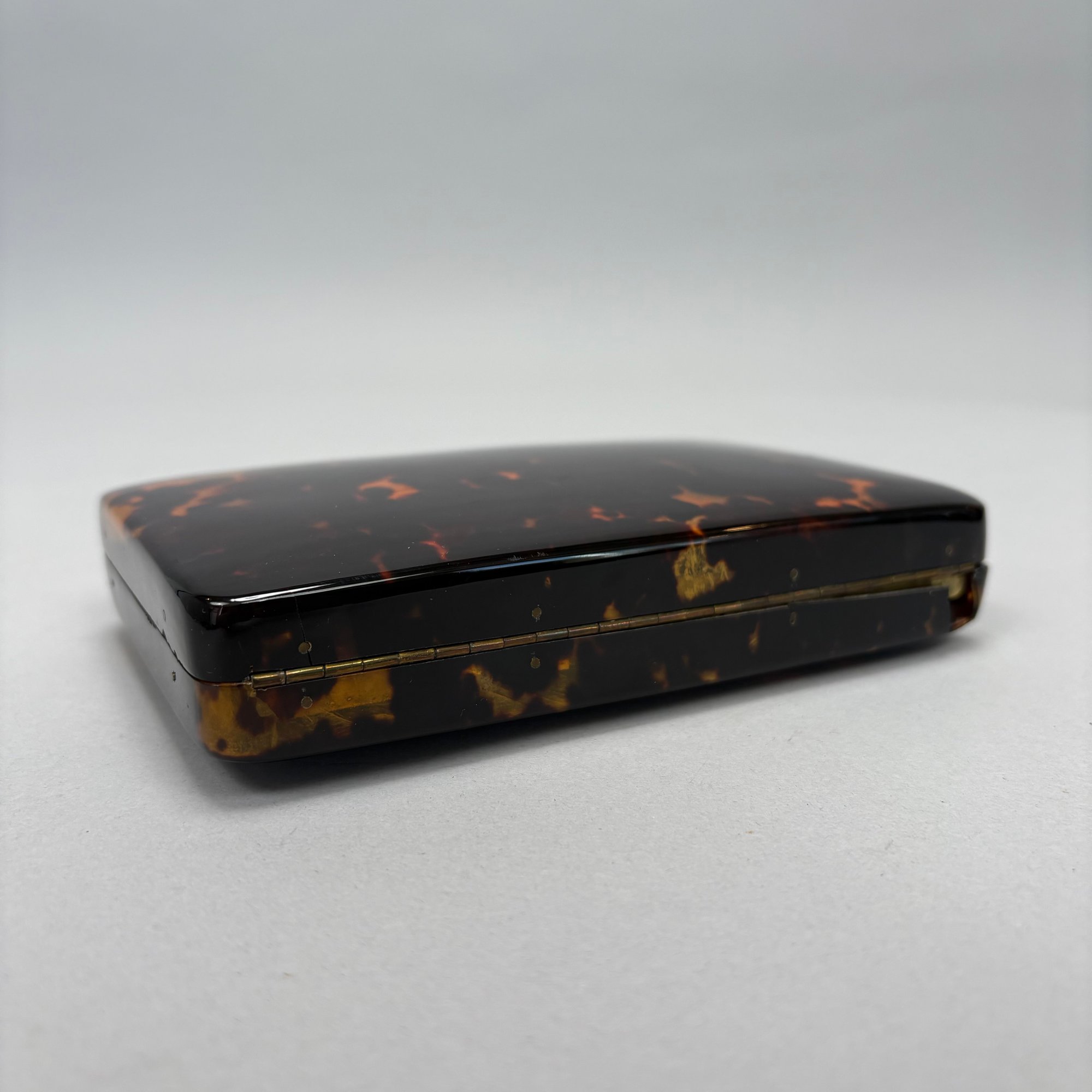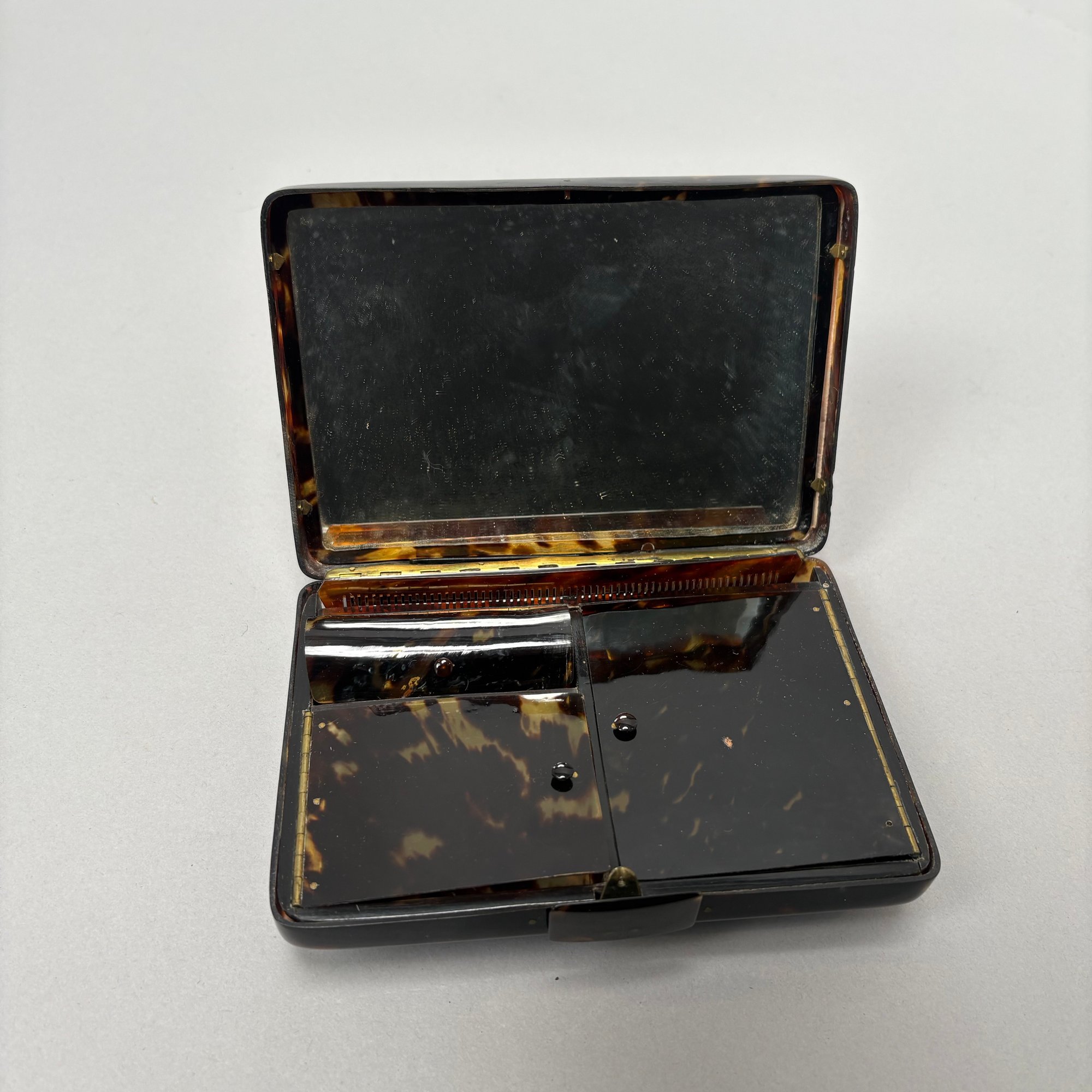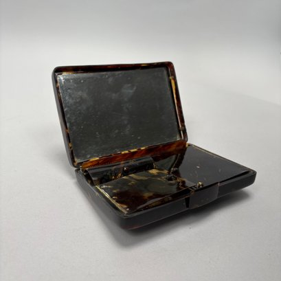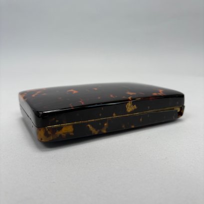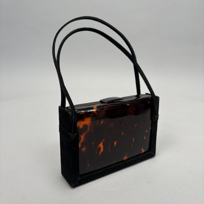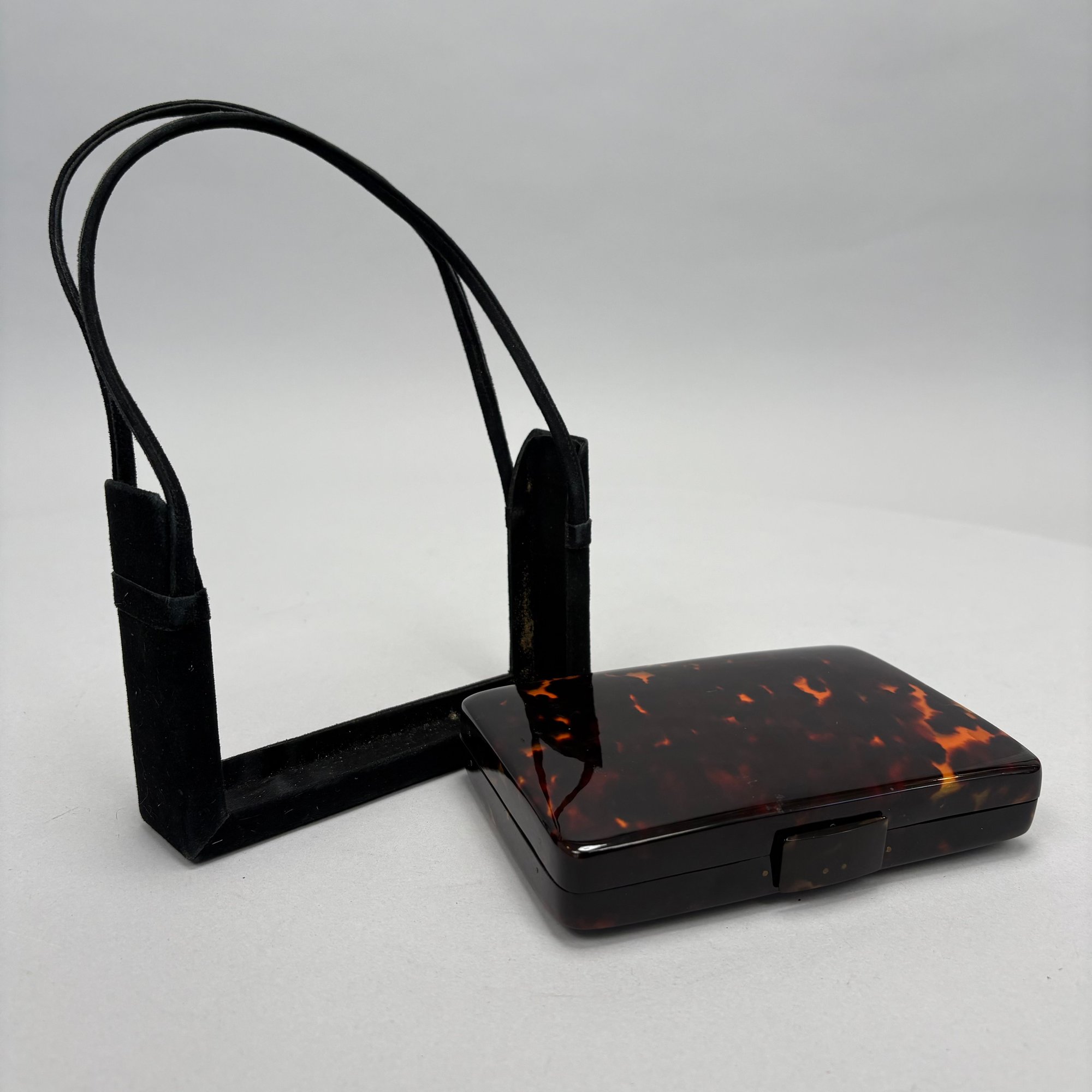 Art Deco Ladies Lucite Tortoiseshell Evening Bag, 1920-1940. The interior of the rectangular purse fitted with covered lipstick, compact and powder compartments, mounted in a black velvet frame with loop handles.