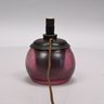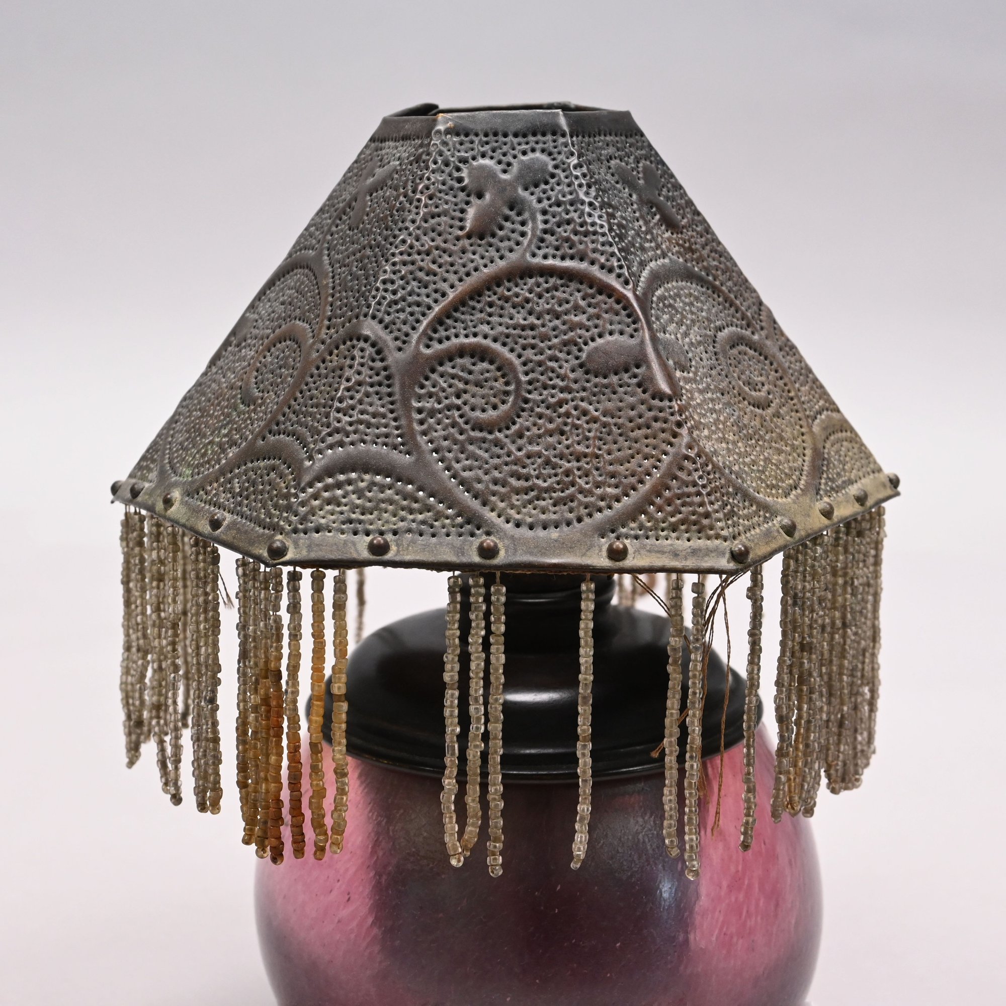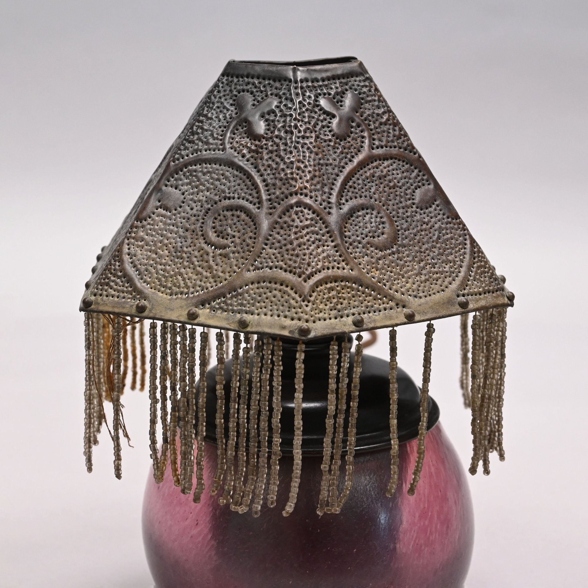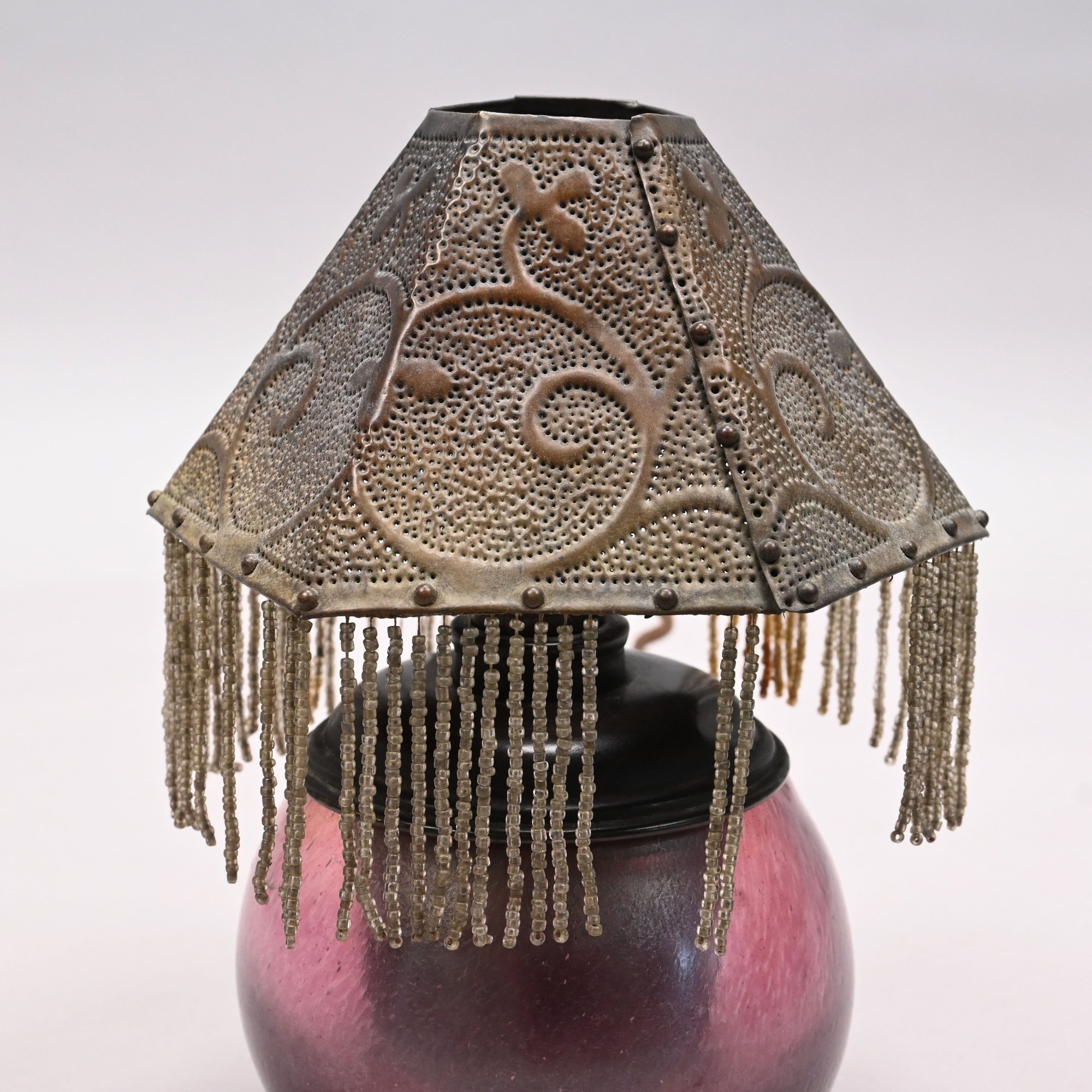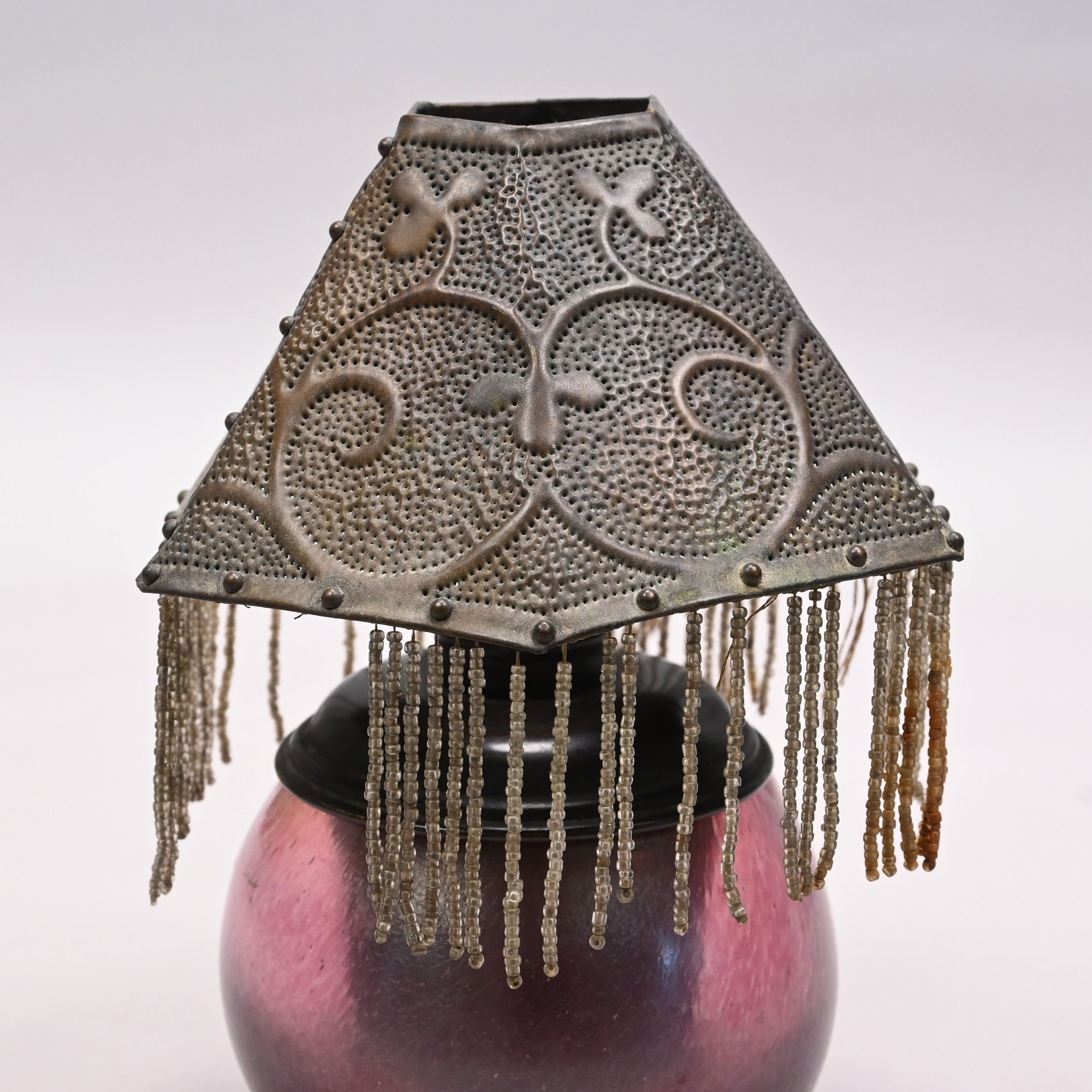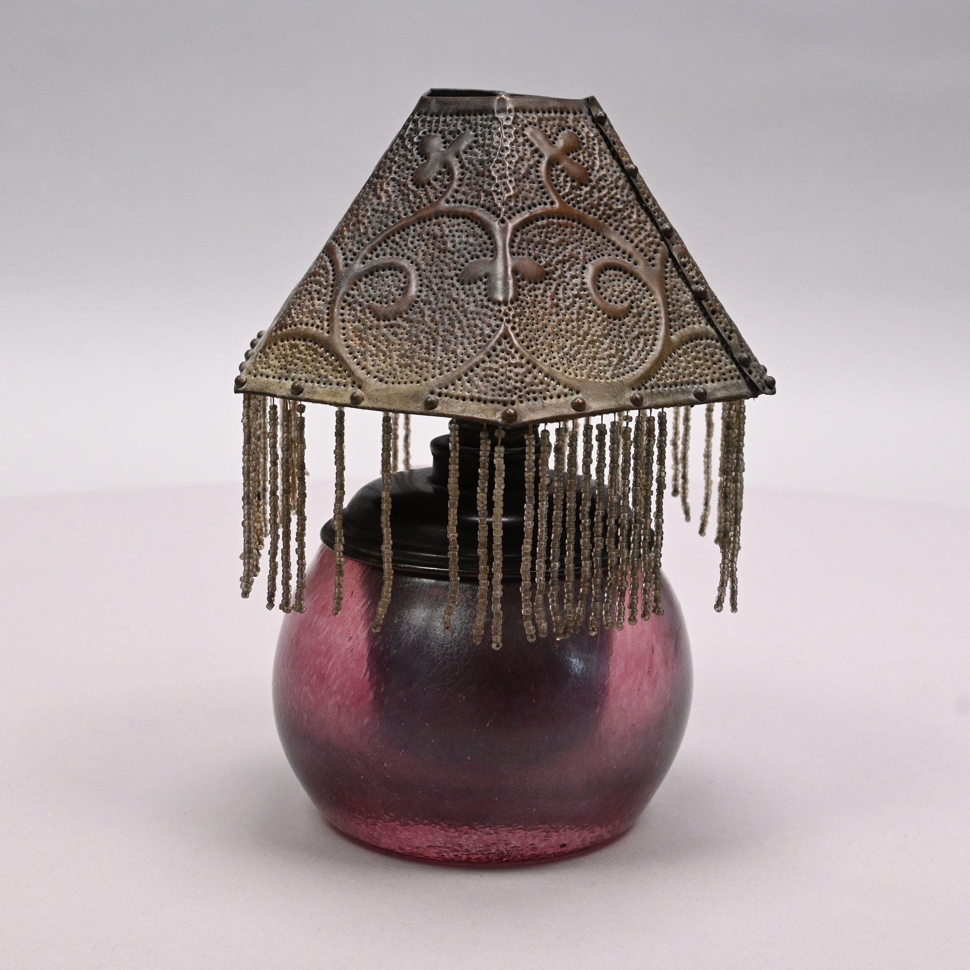 Art Glass Oil Lamp with Embossed Brass Shade, 1900 - 1920. The oil lamp in dark rose pink, engraved "Loetz/ Austria," the shade embossed with scrolling vinery and suspending beaded chains.