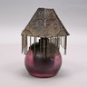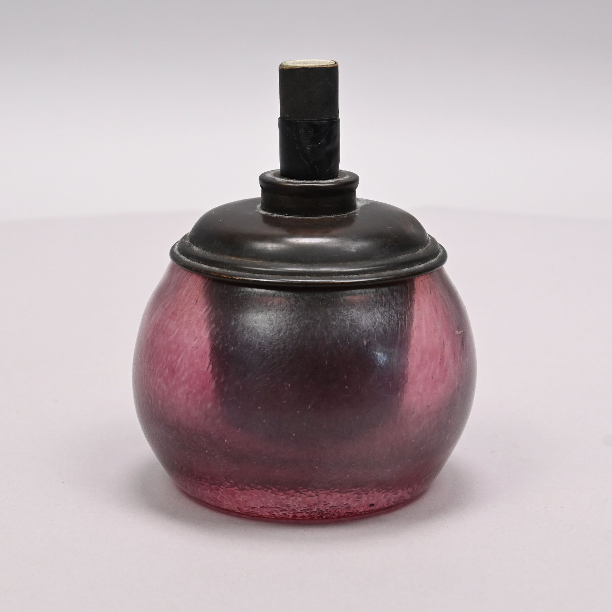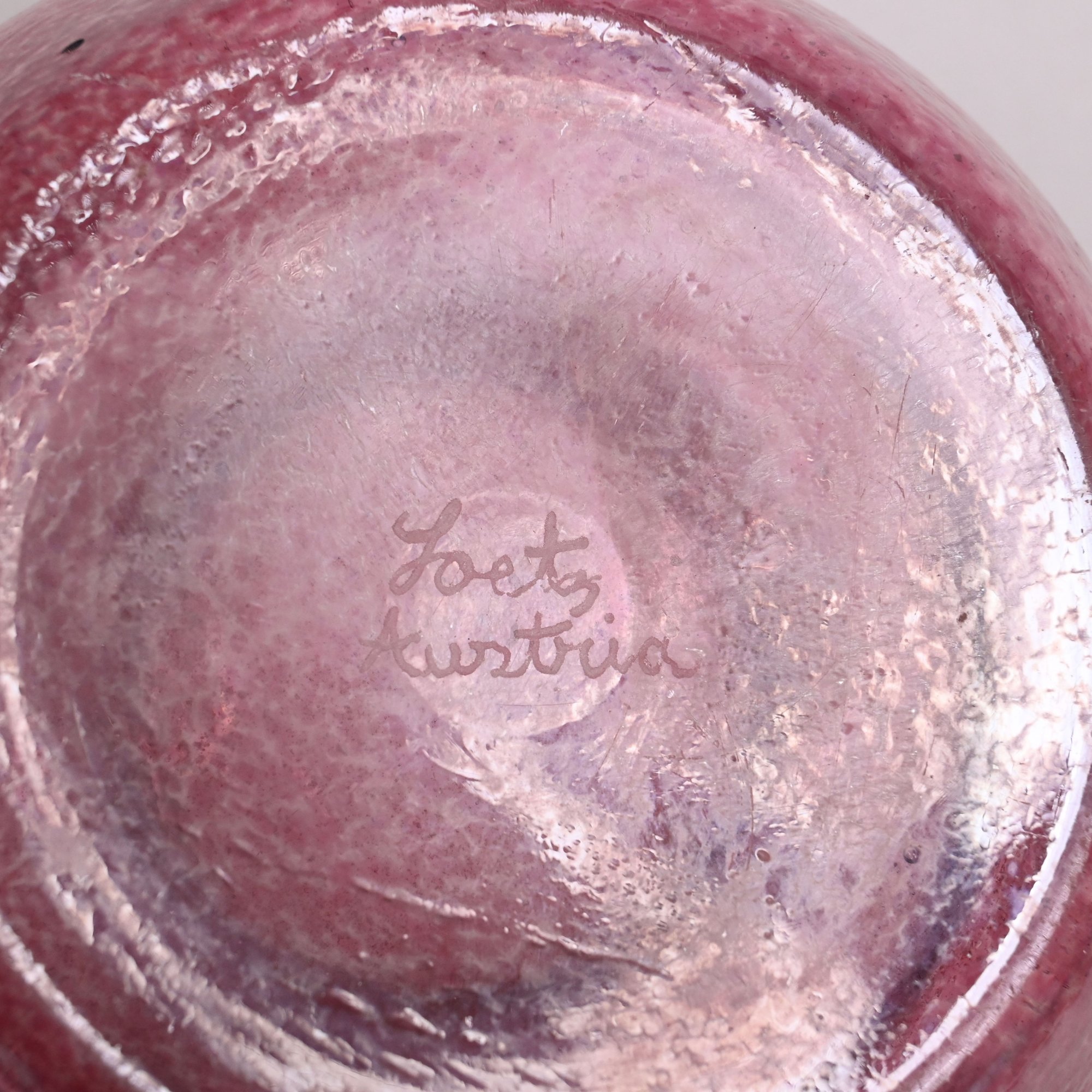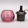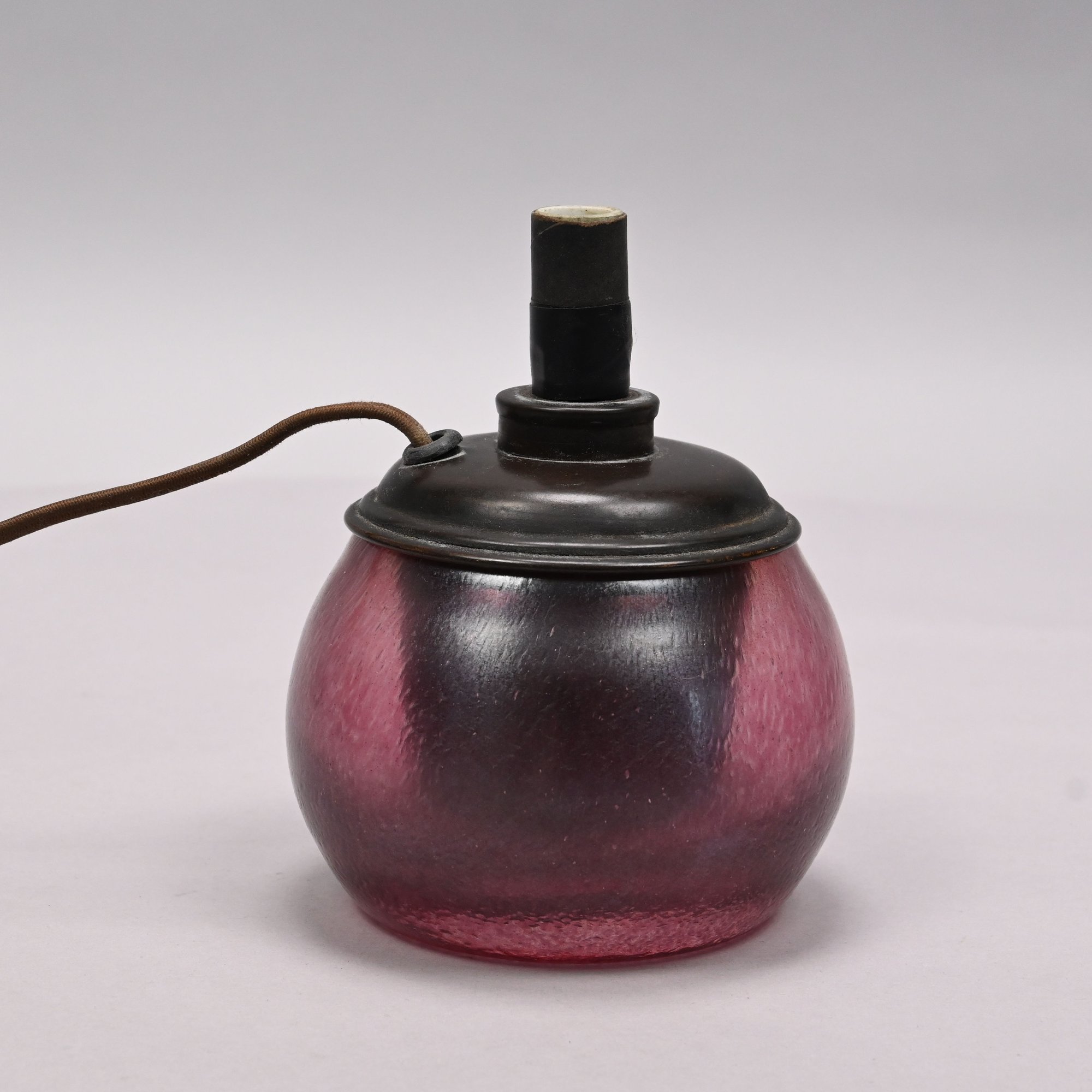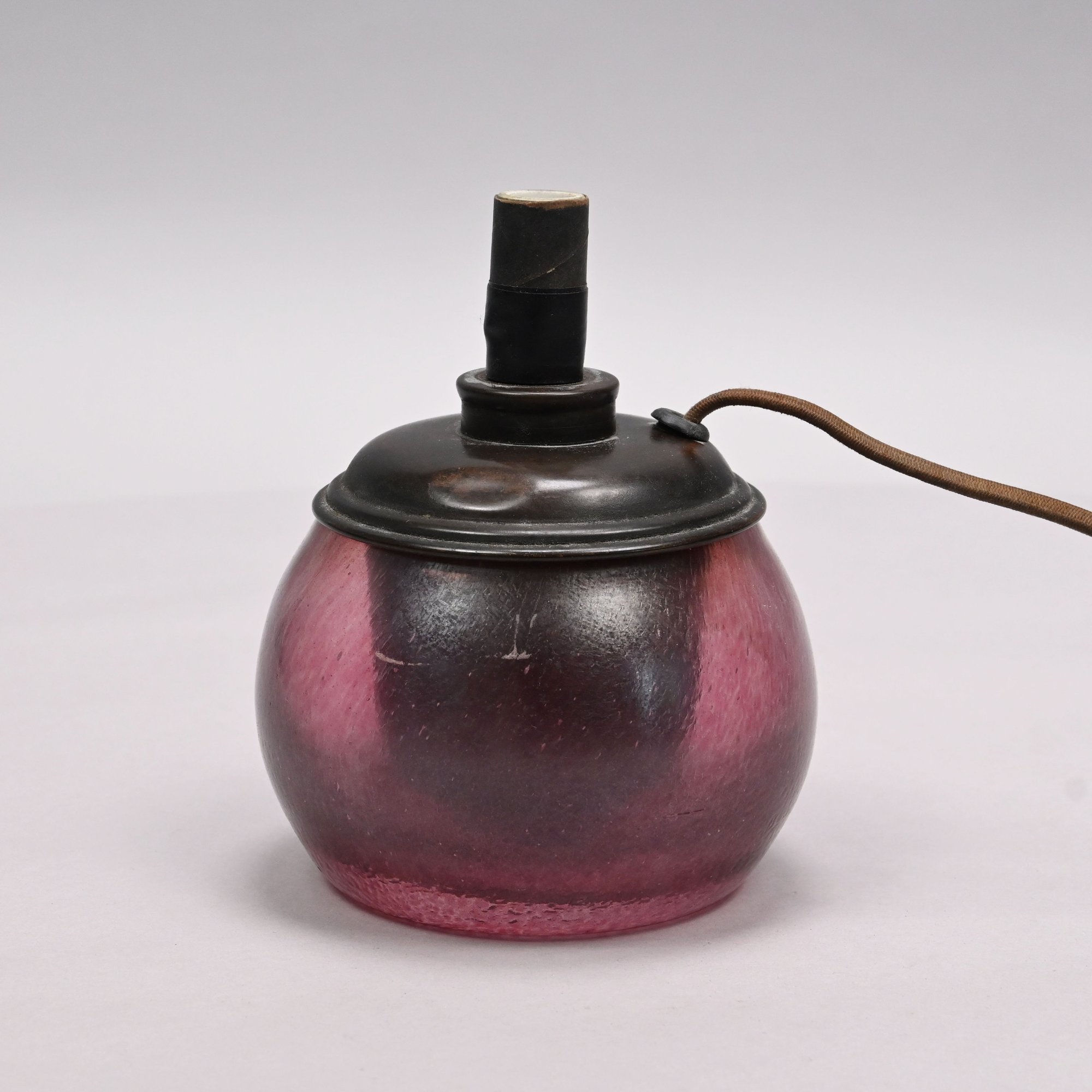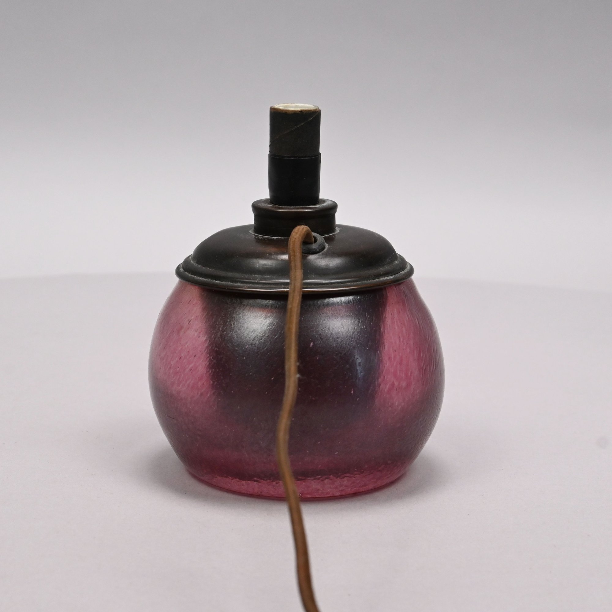 Art Glass Oil Lamp with Embossed Brass Shade, 1900 - 1920. The oil lamp in dark rose pink, engraved "Loetz/ Austria," the shade embossed with scrolling vinery and suspending beaded chains.