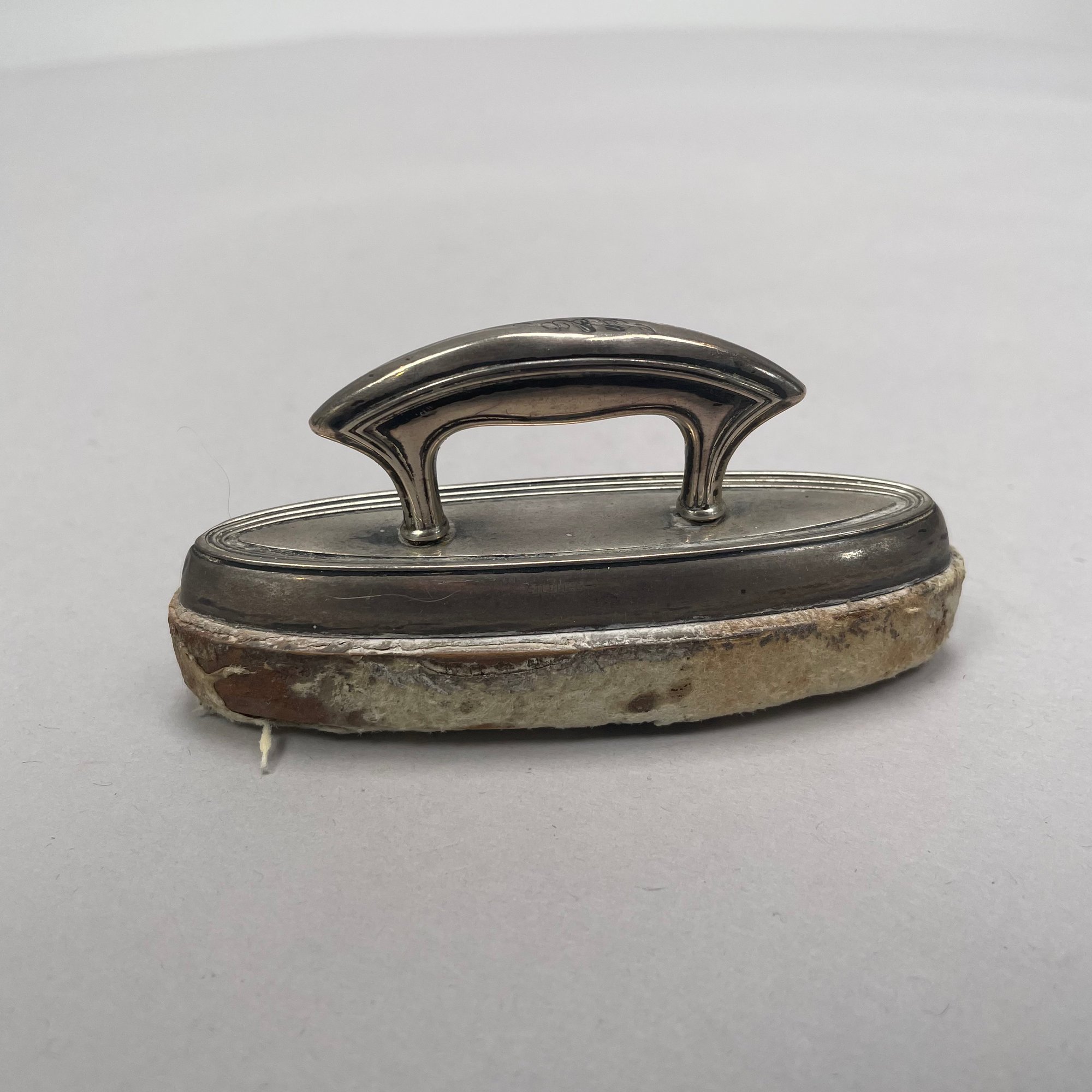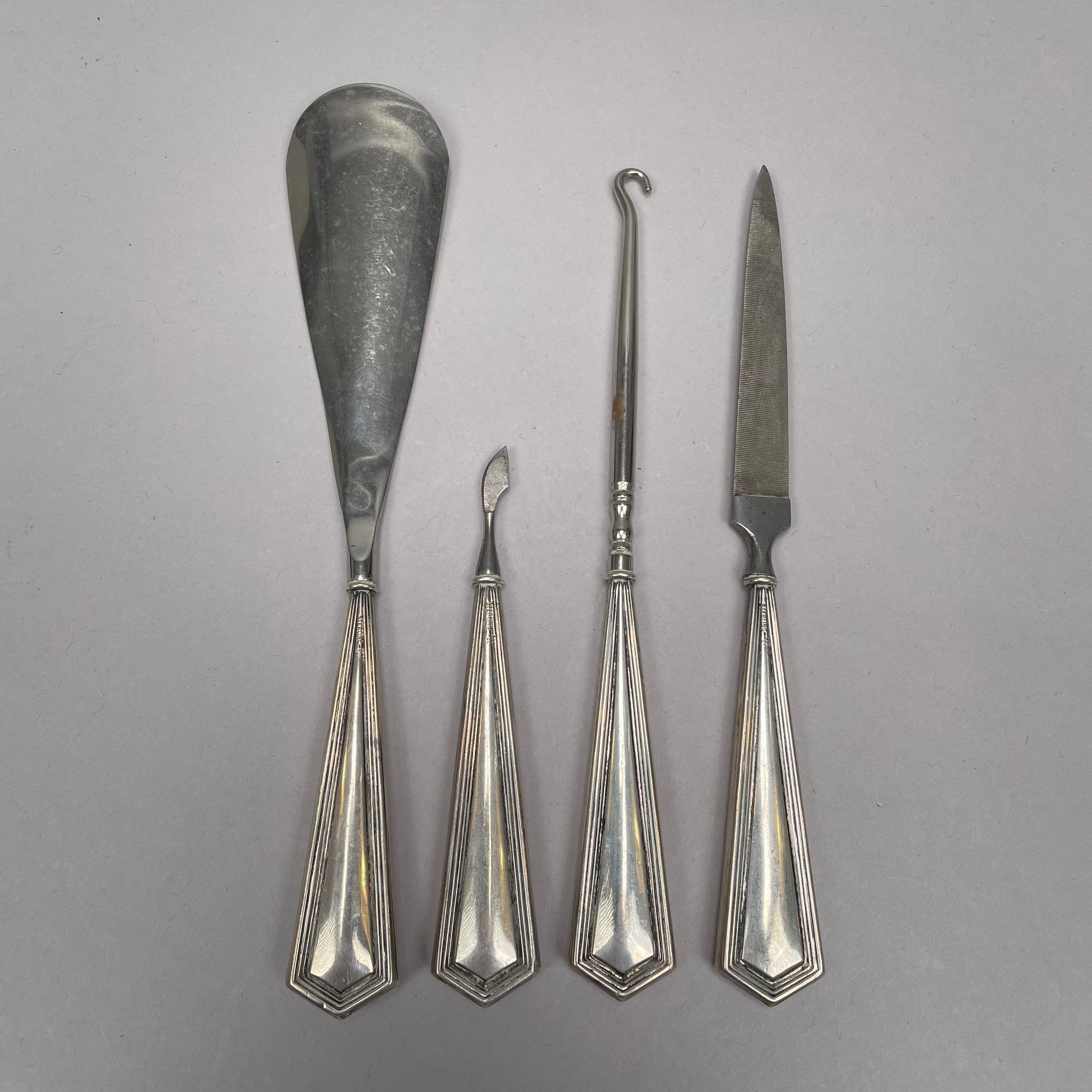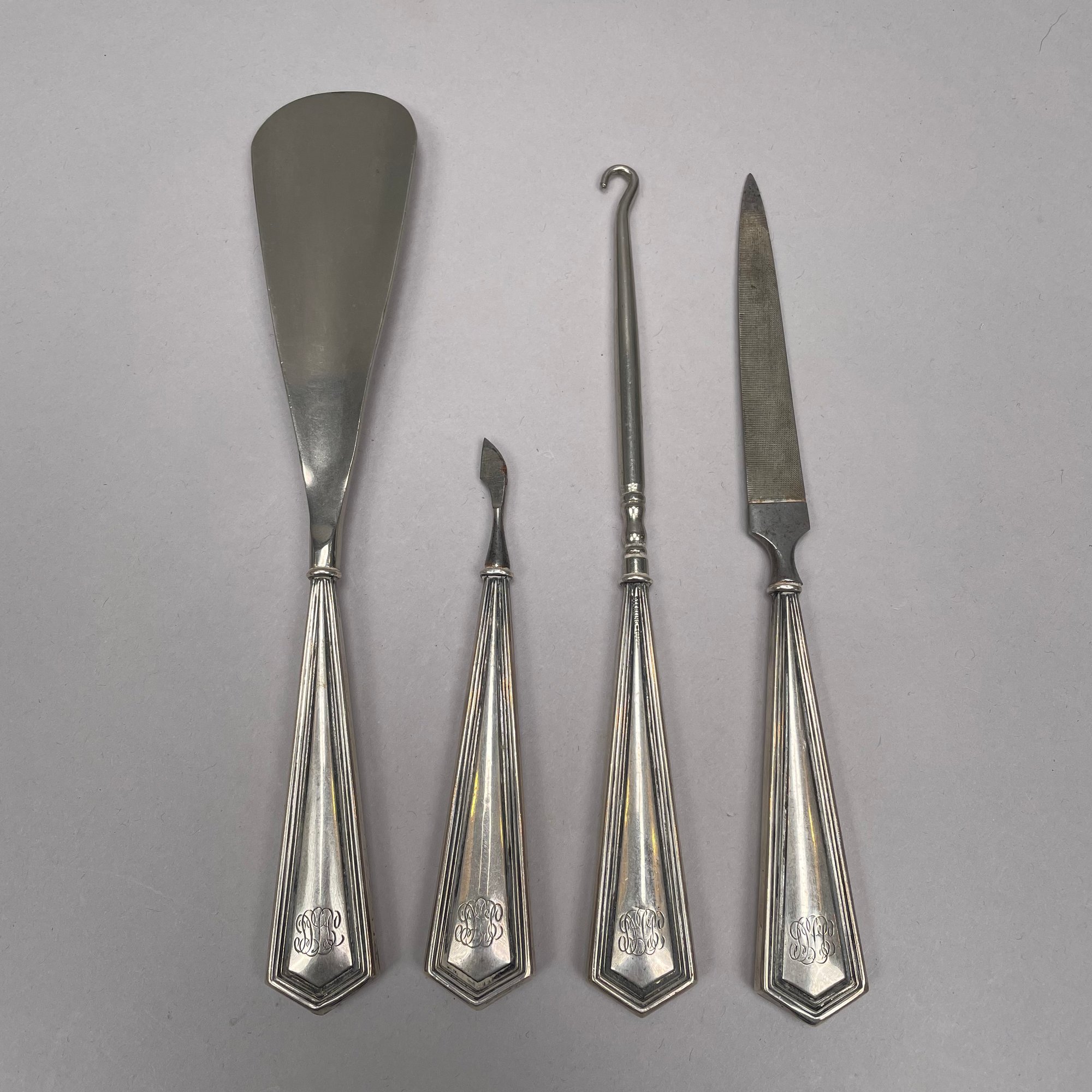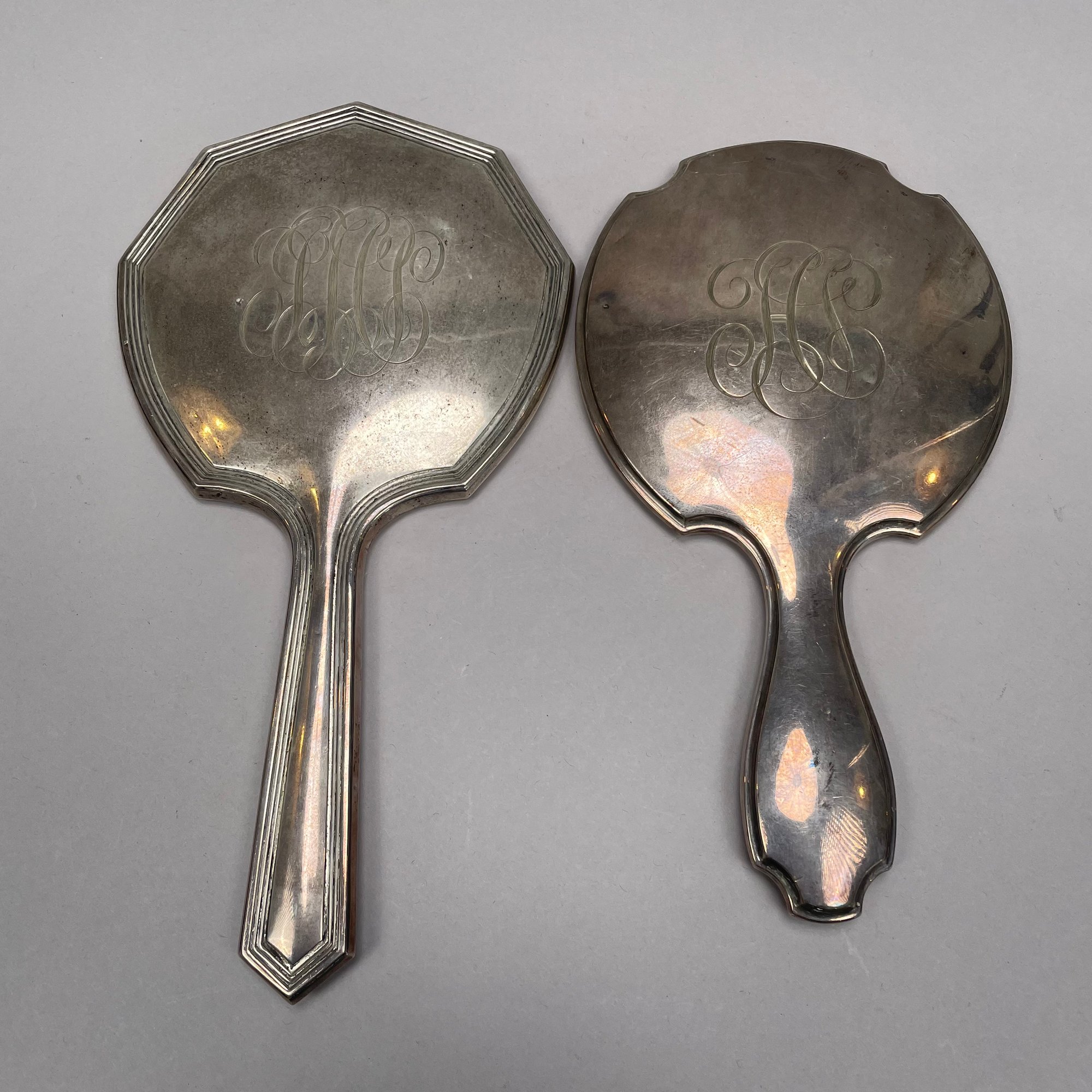 Assembled American Sterling Silver Dressing Set, Circa 1945. Comprising a hand mirror, marked with a tortoise and "STERLING;" a cuticle pusher, nail file, nail buffer, button hook and shoe horn, Webster Co., North Attleboro, Massachusetts; and a pattern "2050" hand mirror and pattern "1940" small jar, Simons Brothers, Philadelphia, Pennsylvania, various script initials, factory marks. Together with a Ronson "Standard" chrome cigarette lighter, Newark, New Jersey, engraved with the initials "PHS." (9)