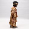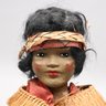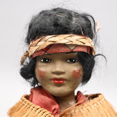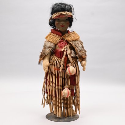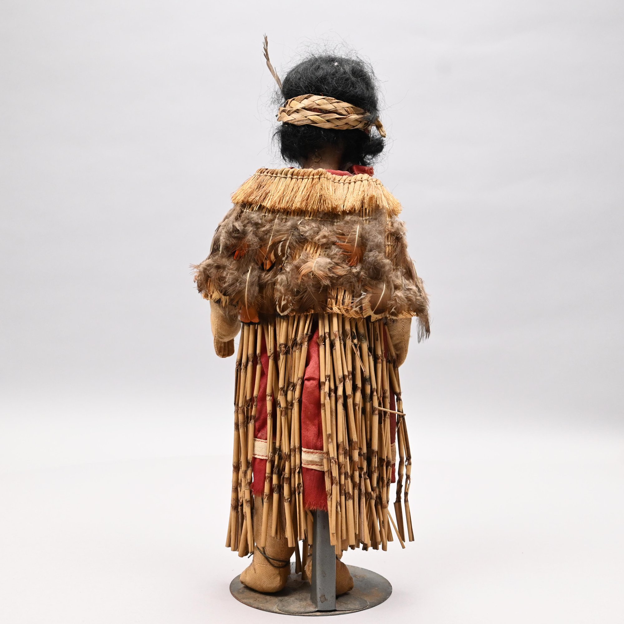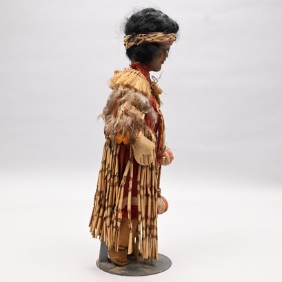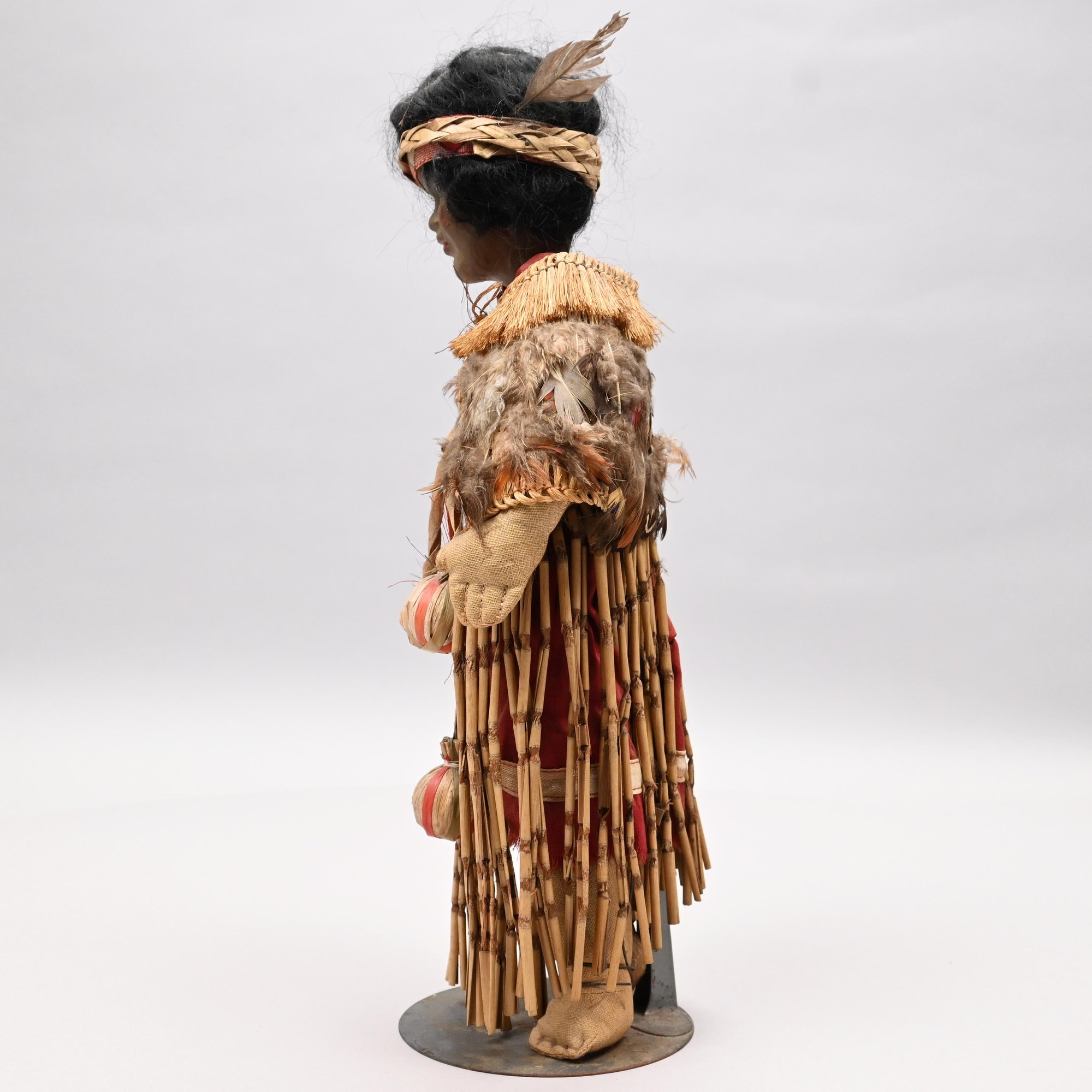 American Indian Doll, Early Twentieth Century. Composition head, canvas stuffed body, her black hair held by a woven headband, wearing a dried rush and feather shawl, red cotton undergarment and a skirt of horsetail reeds; with a metal stand.