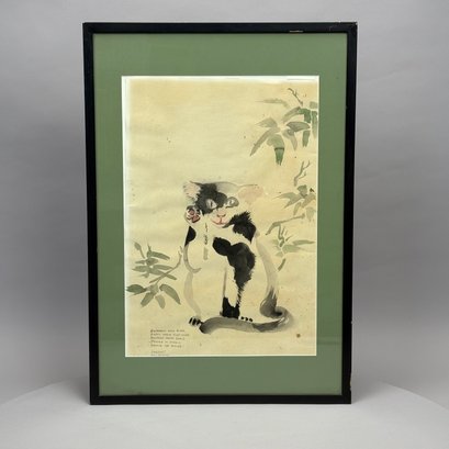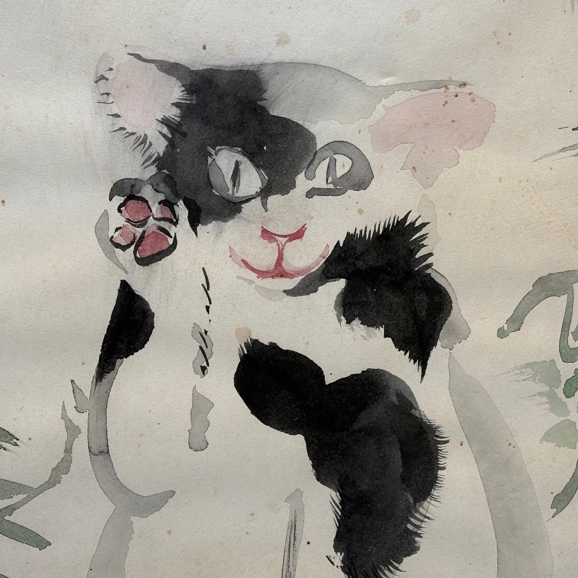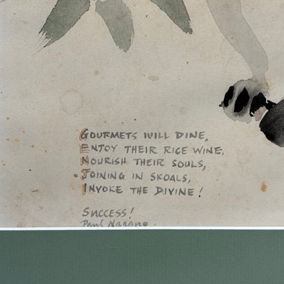 Paul Tatsumi Nagano (b. 1938, Massachusetts/ Hawaii). "Genji." Watercolor and ink on paper, depicting a cat seated before a bamboo branch and inscribed with the verse "GENJI," each vertical first letter the beginning of a line: "GOURMETS WILL DINE,/ ENJOY THEIR RICE WINE,/ NOURISH THEIR SOULS,/ JOINING IN SKOALS,/ INVOKE THE DIVINE!" and signed "SUCCESS!/ Paul Nagano," (20.75 x 14.375 inches, sight).