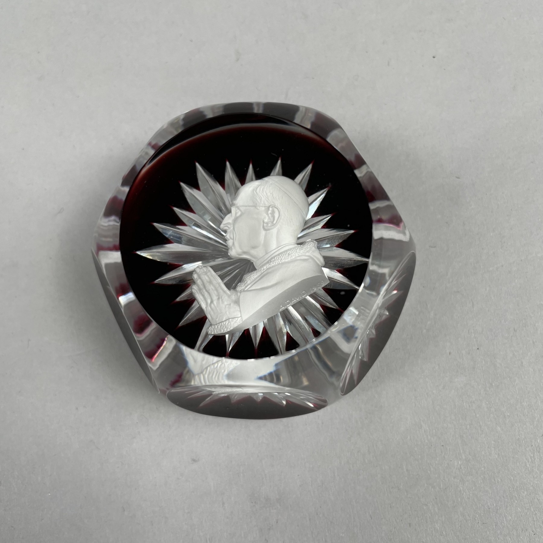 Six side facets and a top window, the sulphide portrait signed "A. DAVID 1959," set on a starburst cut garnet ground, etched "BACCARAT FRANCE" factory mark.