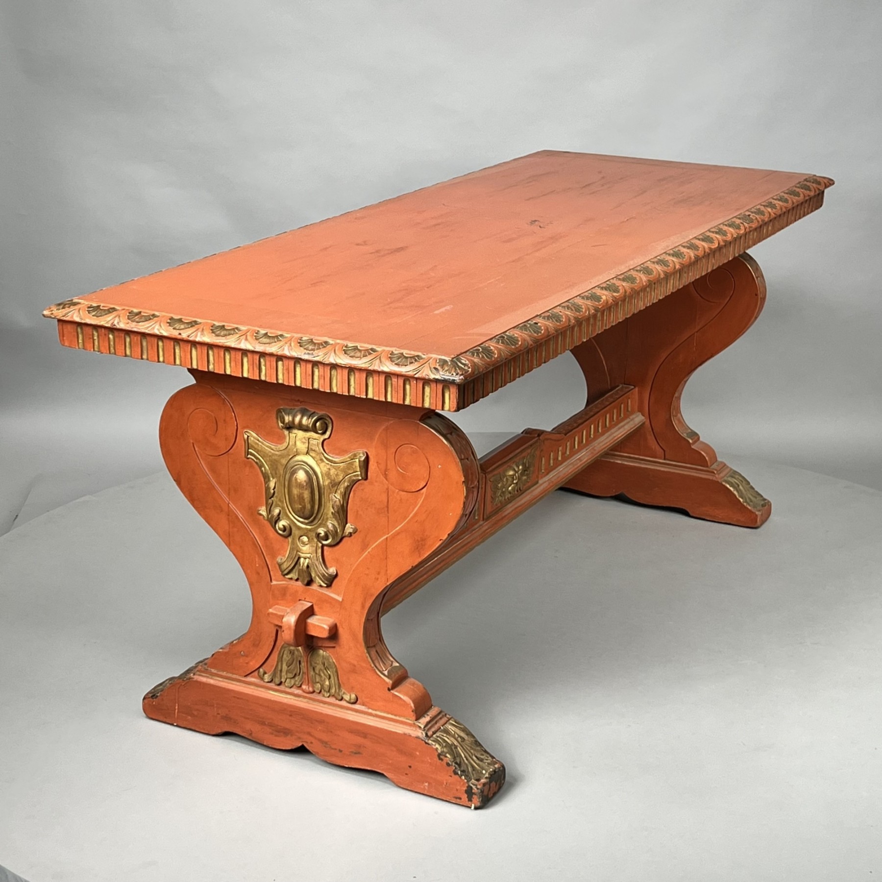 Of mortise and tenon construction, the rectangular top within a demi-flowerhead border above a fluted edge, raised on lyre-form supports, each carved and gilt with a cartouche, and joined by a stretcher carved and gilt with a winged grotesque mask.