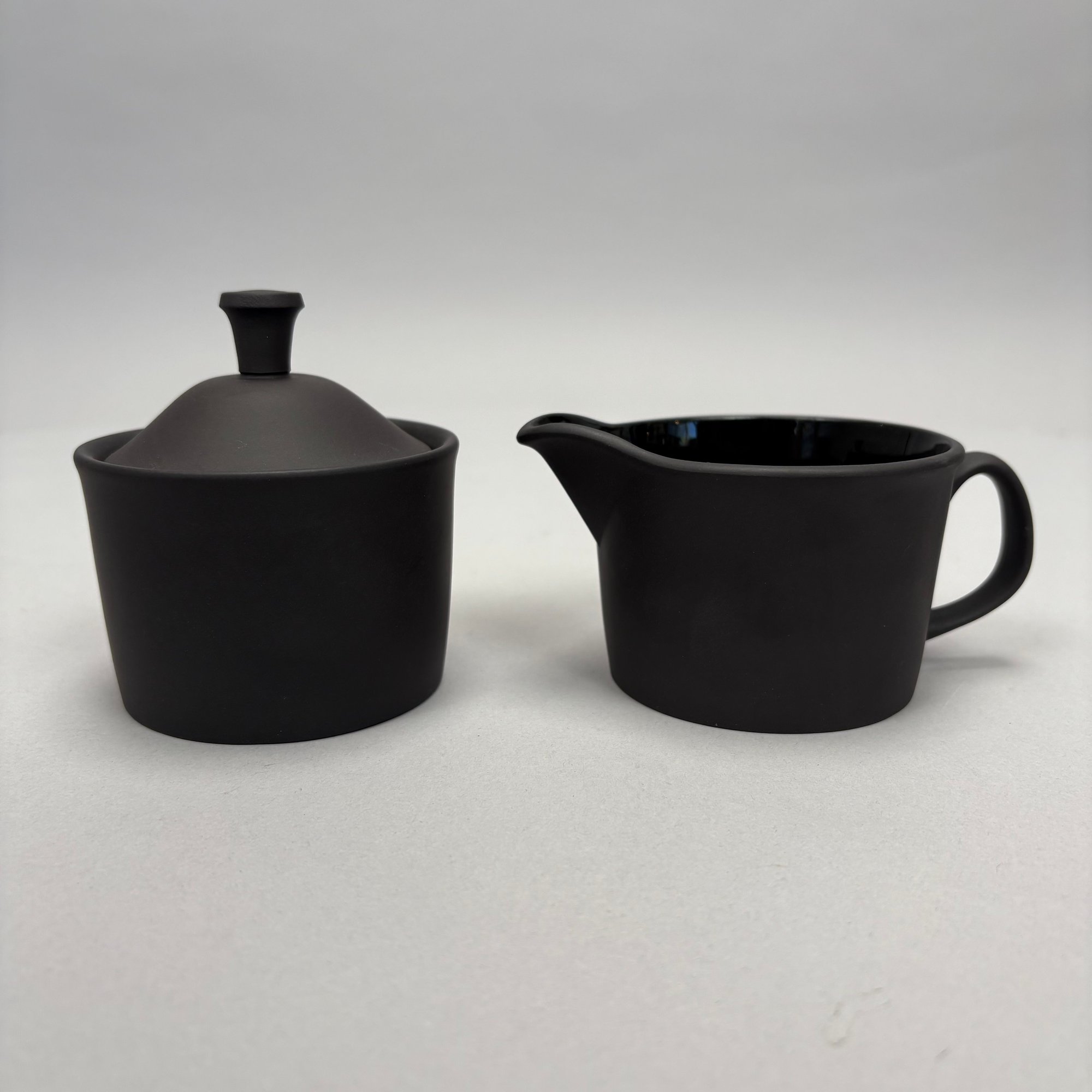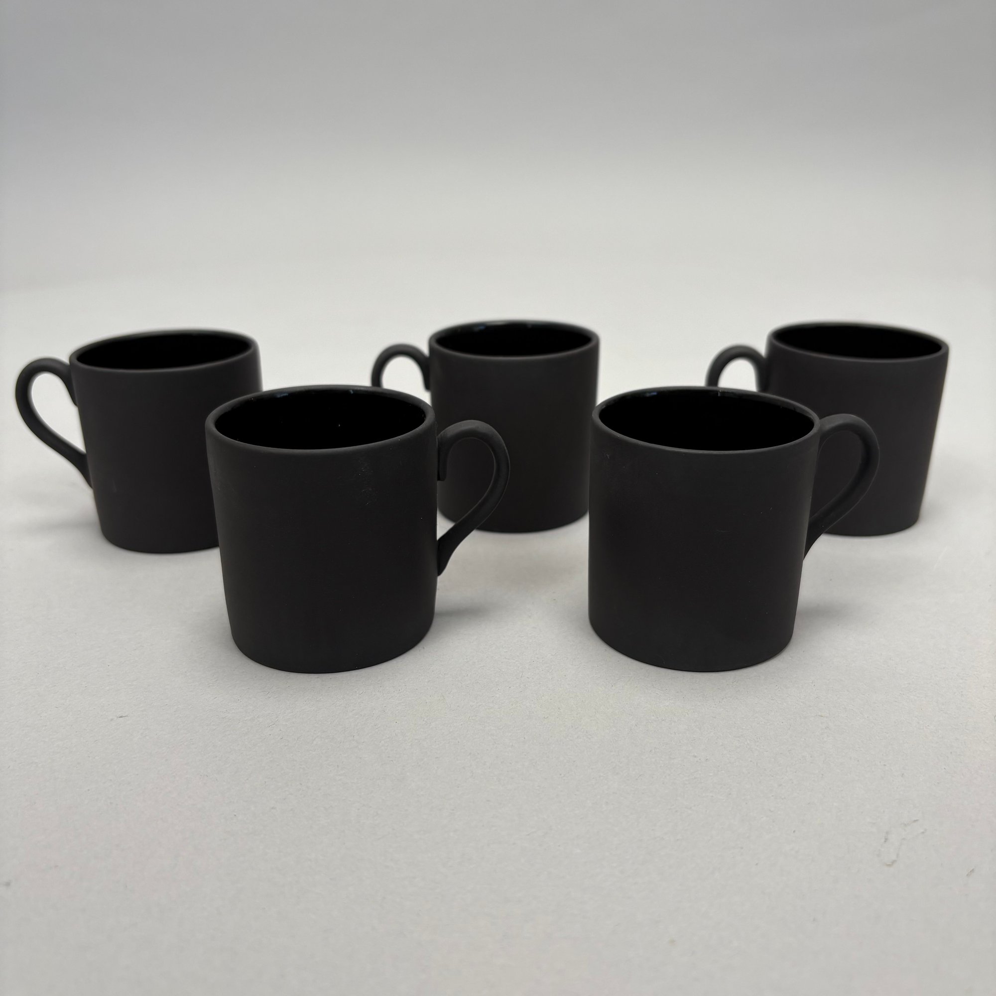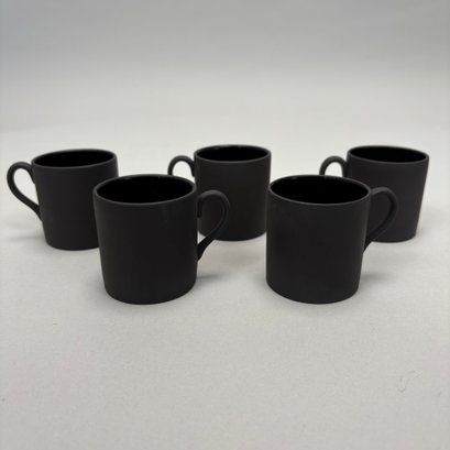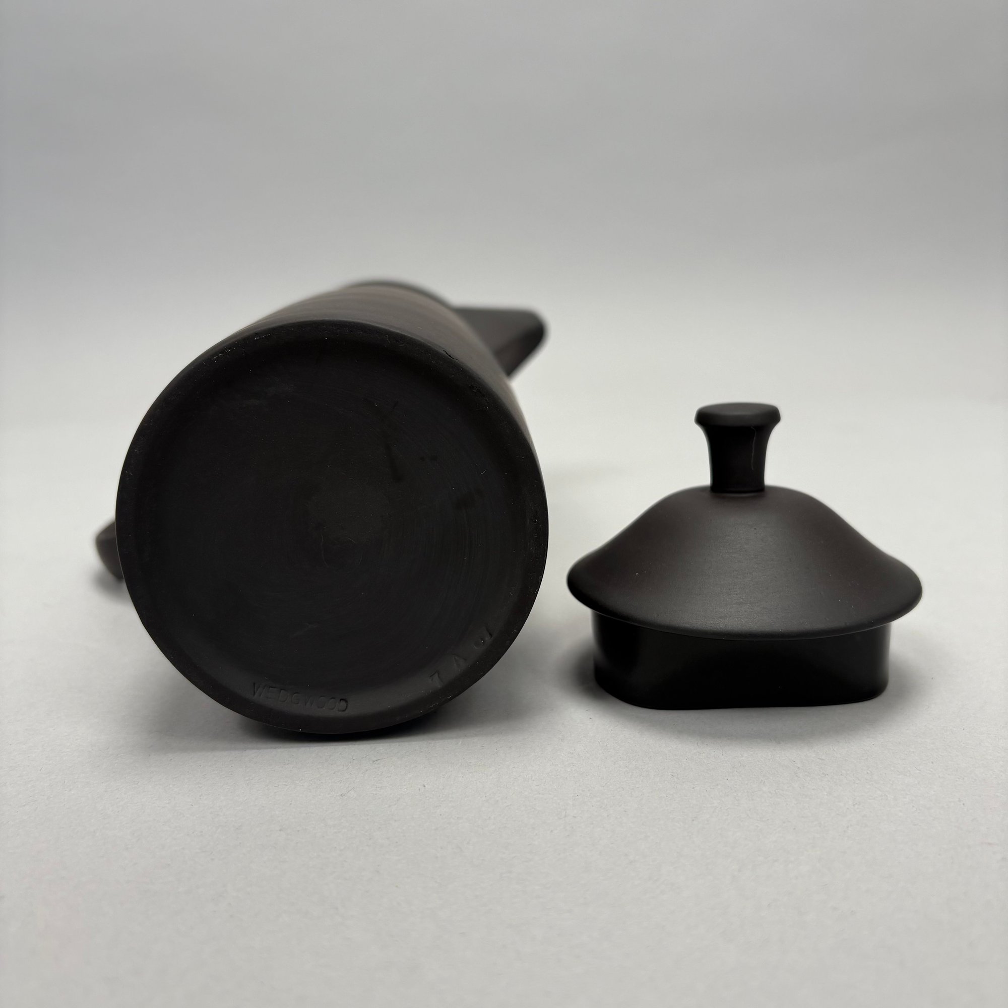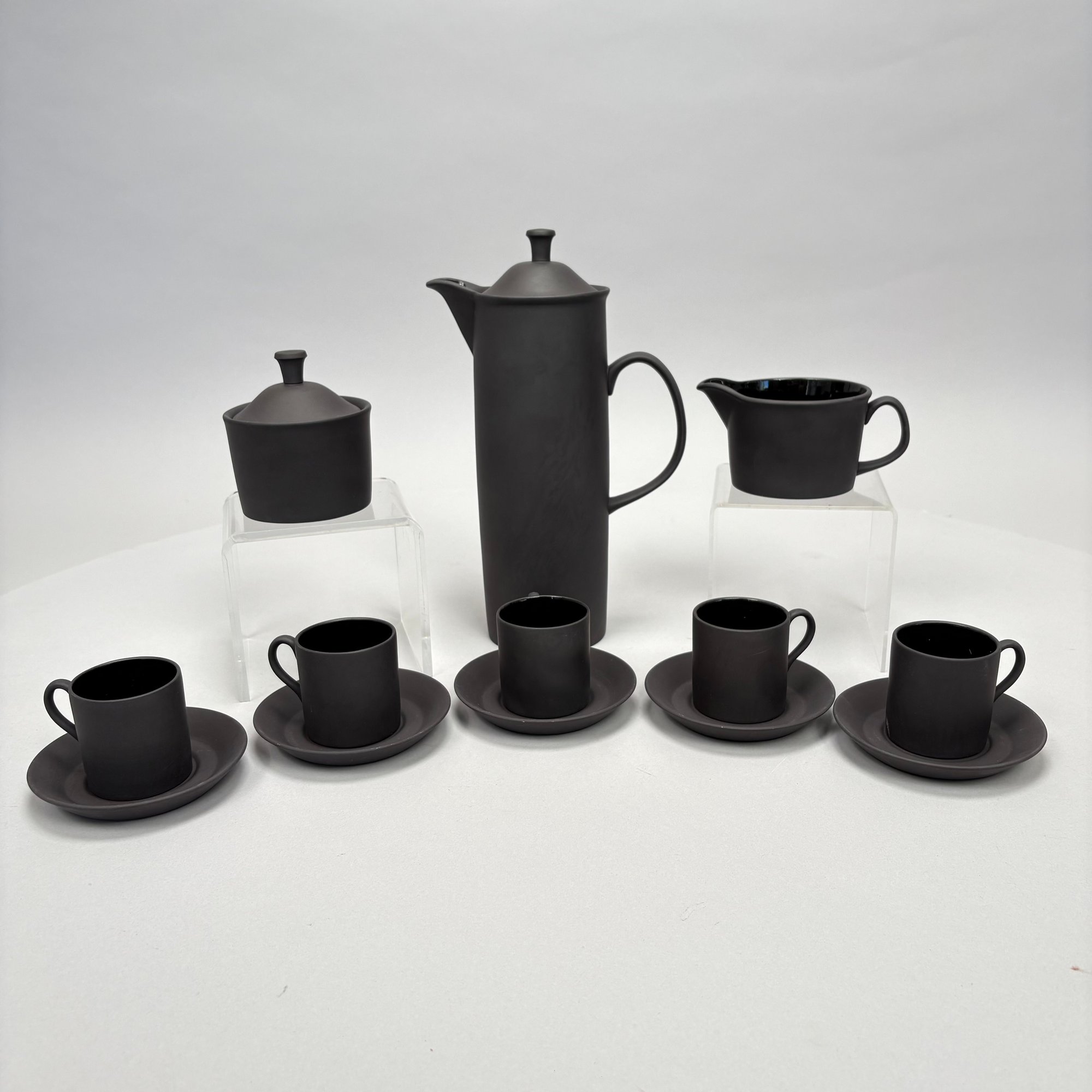 Black Basalt Coffee Service Designed by Robert Minkin (1928-2012) for Wedgwood, Mid-Century Modern and 1967. Impressed "WEDGWOOD" marks, the coffeepot, cream pitcher and sugar bowl and cover each dated "IA 1967," the cups and saucers also impressed "MADE IN ENGLAND."