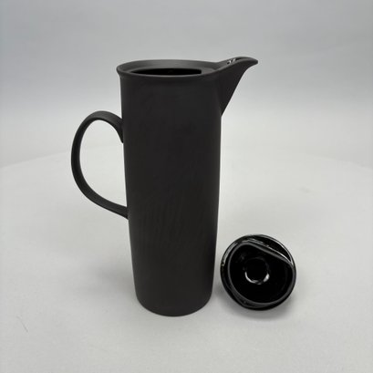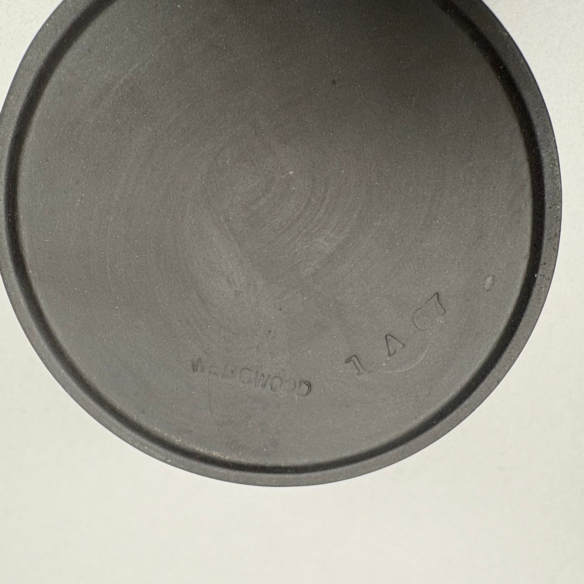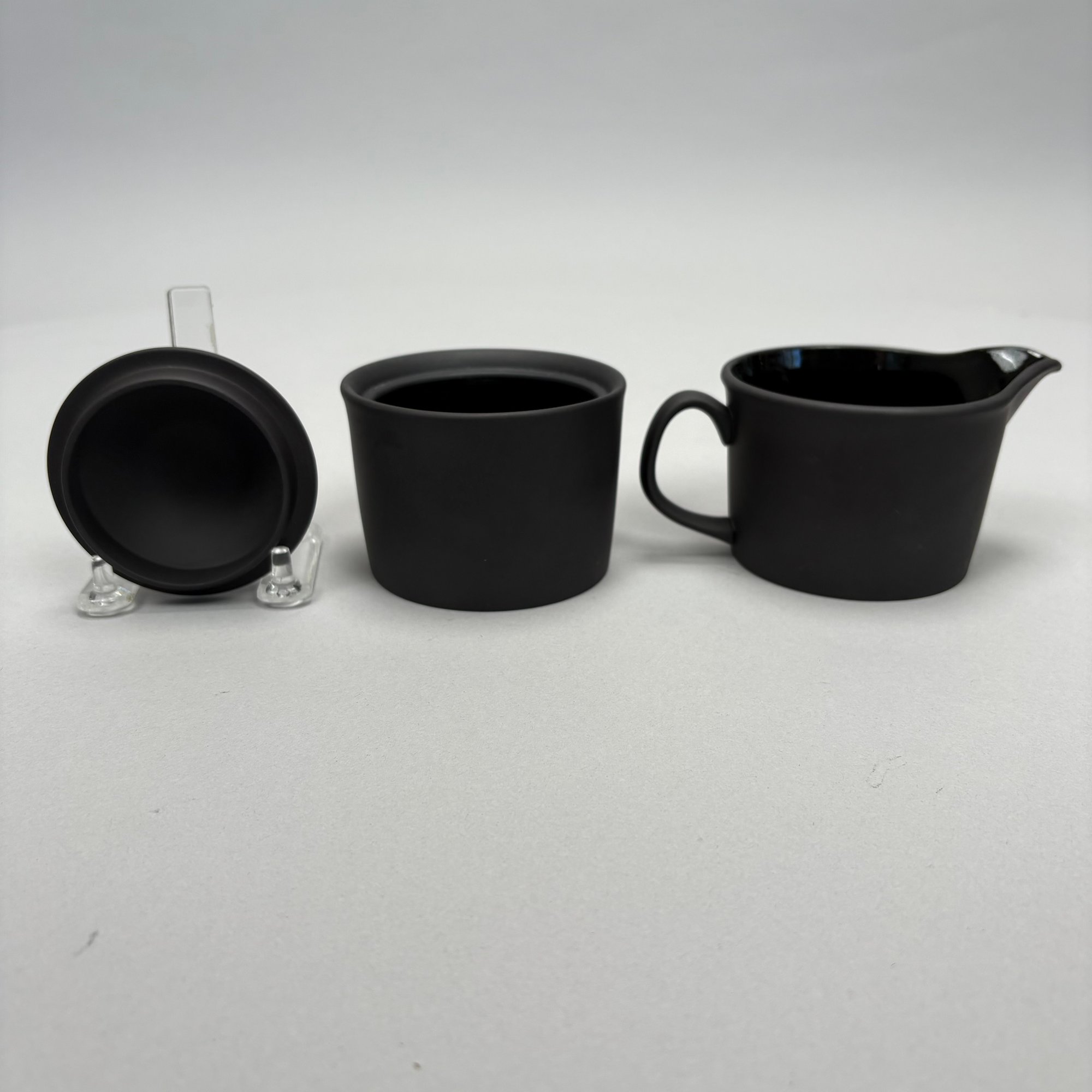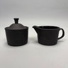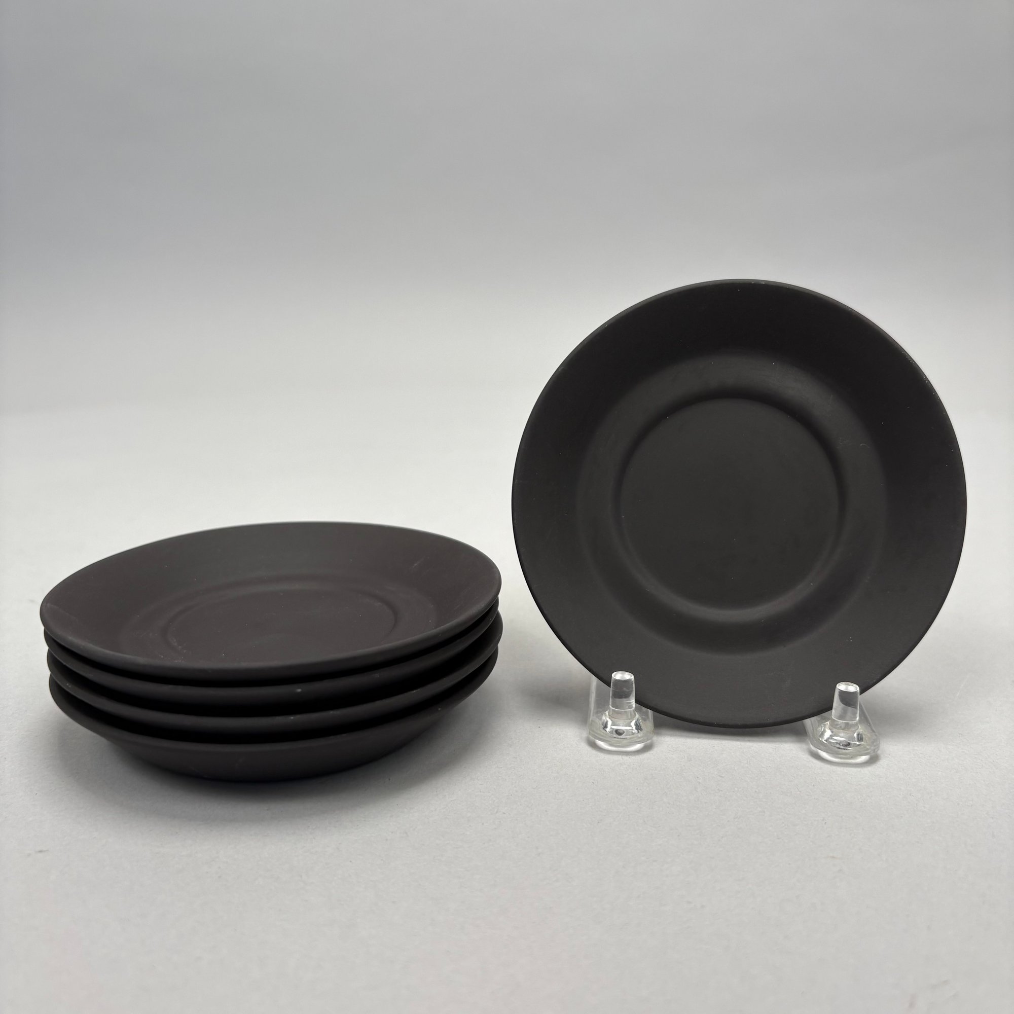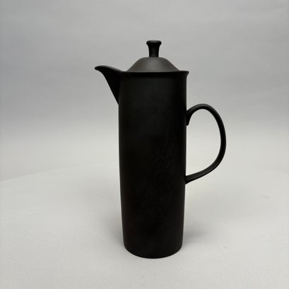 Black Basalt Coffee Service Designed by Robert Minkin (1928-2012) for Wedgwood, Mid-Century Modern and 1967. Impressed "WEDGWOOD" marks, the coffeepot, cream pitcher and sugar bowl and cover each dated "IA 1967," the cups and saucers also impressed "MADE IN ENGLAND."