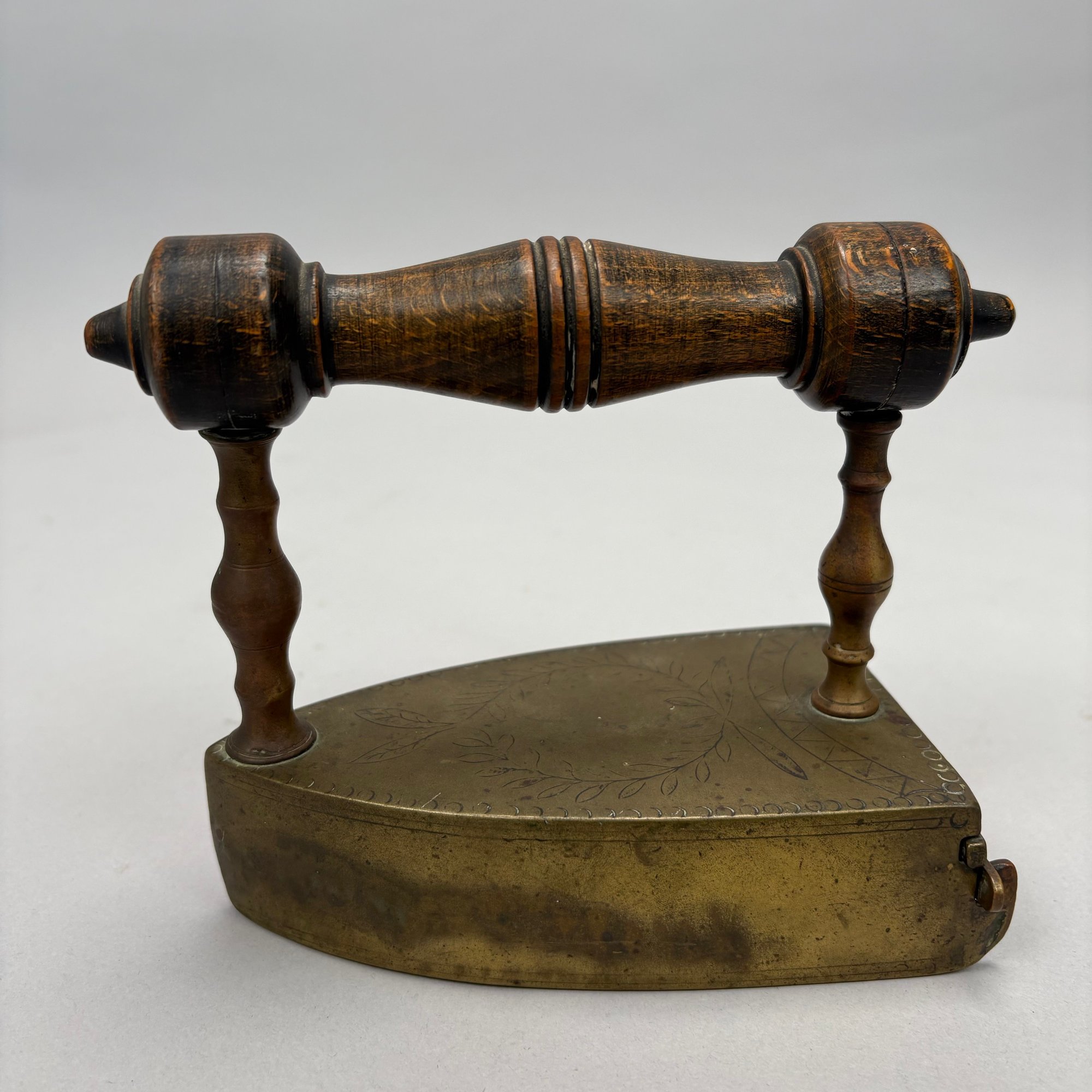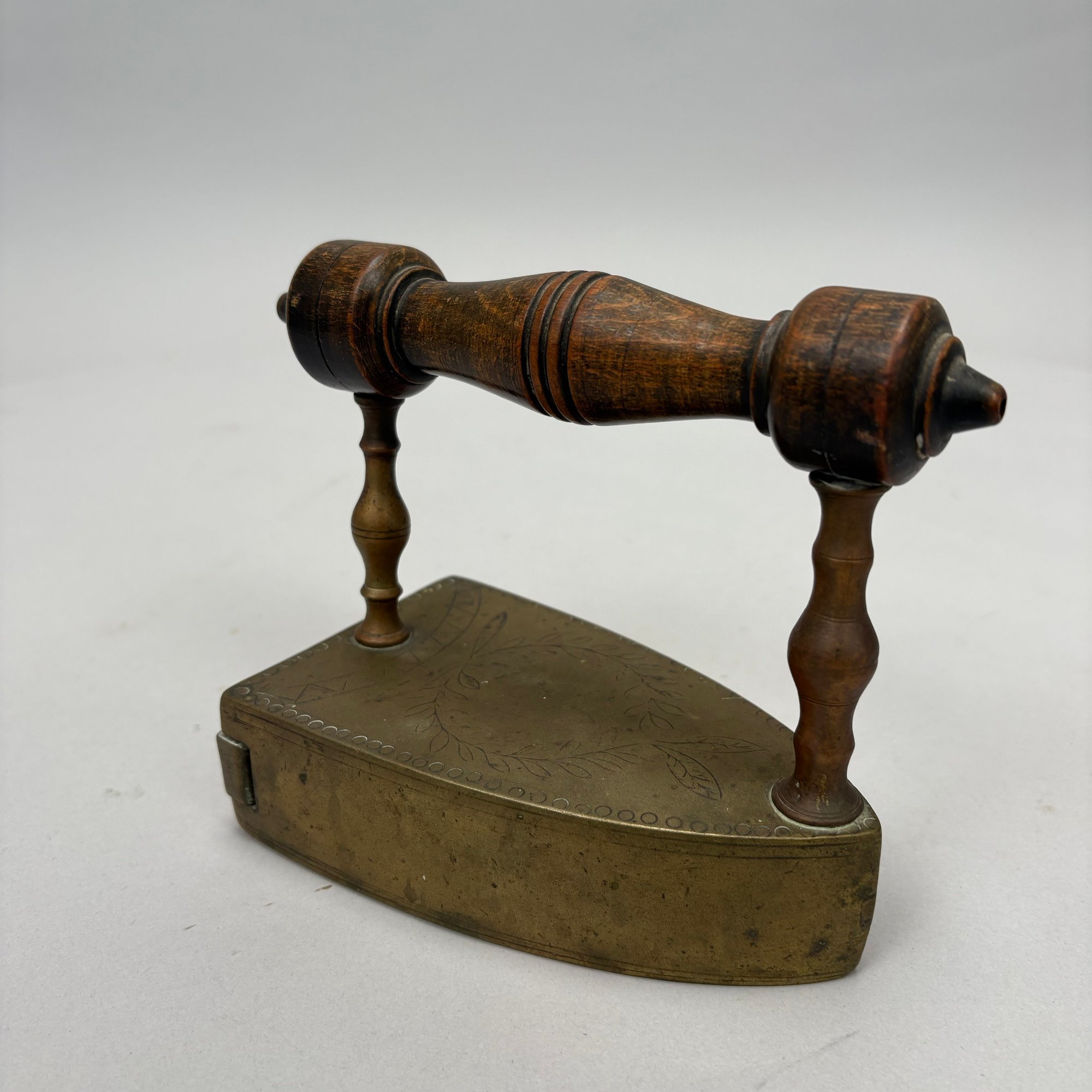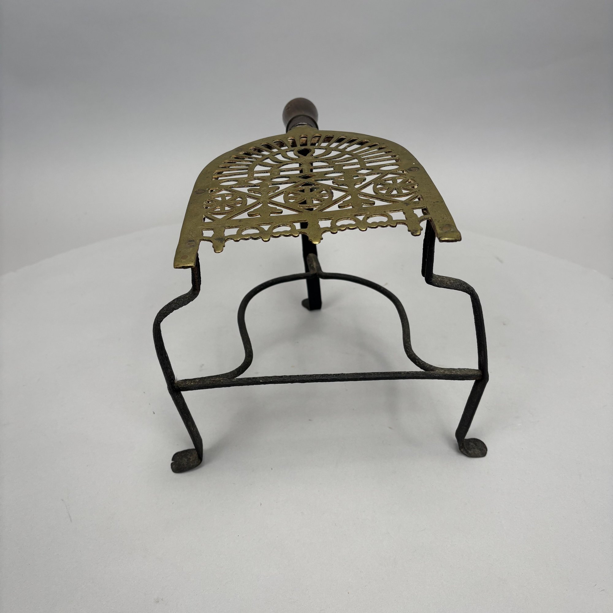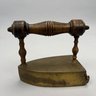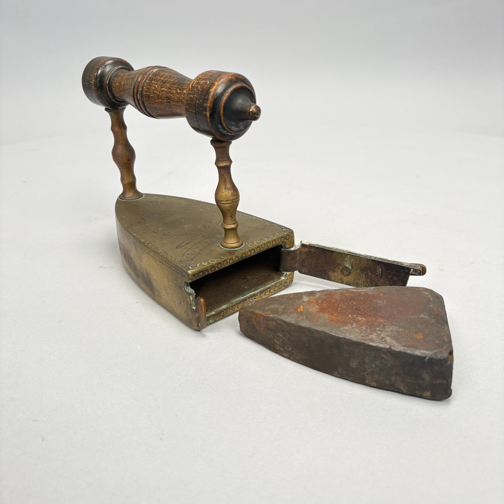 Brass and Wood Sad Iron and a Brass Fireplace Trivet, 19th Century. The iron engraved on the top with a foliate wreath, sawtooth band and circle border, the latched door enclosing a removable lead slug; the trivet on a wrought-iron base, each with a turned wood handle.