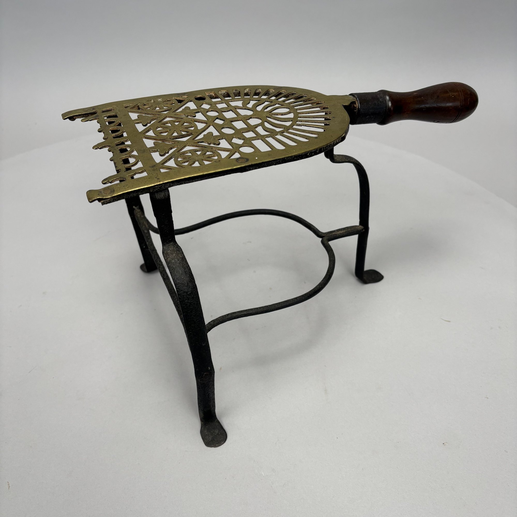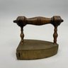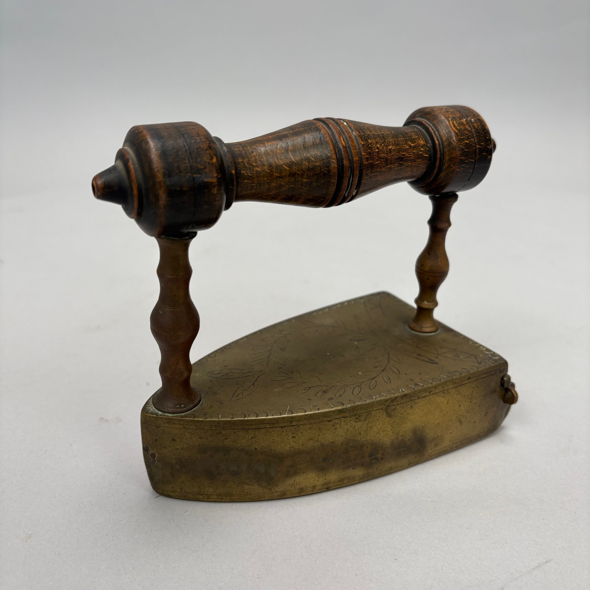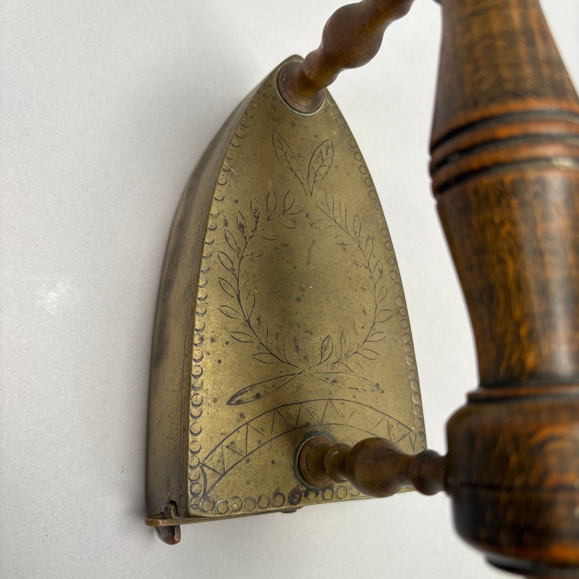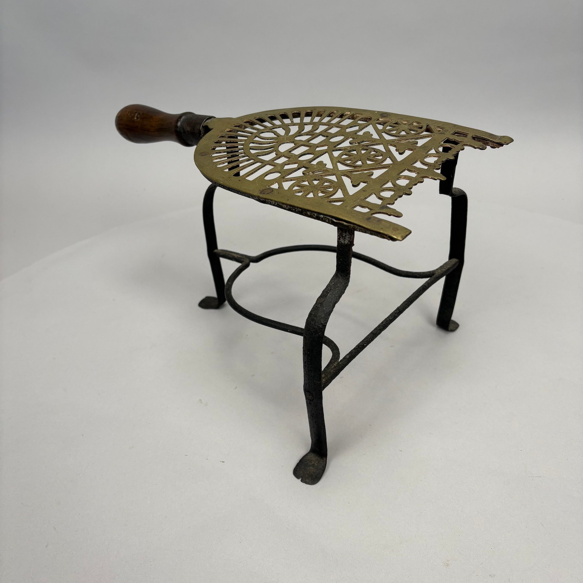 Brass and Wood Sad Iron and a Brass Fireplace Trivet, 19th Century. The iron engraved on the top with a foliate wreath, sawtooth band and circle border, the latched door enclosing a removable lead slug; the trivet on a wrought-iron base, each with a turned wood handle.