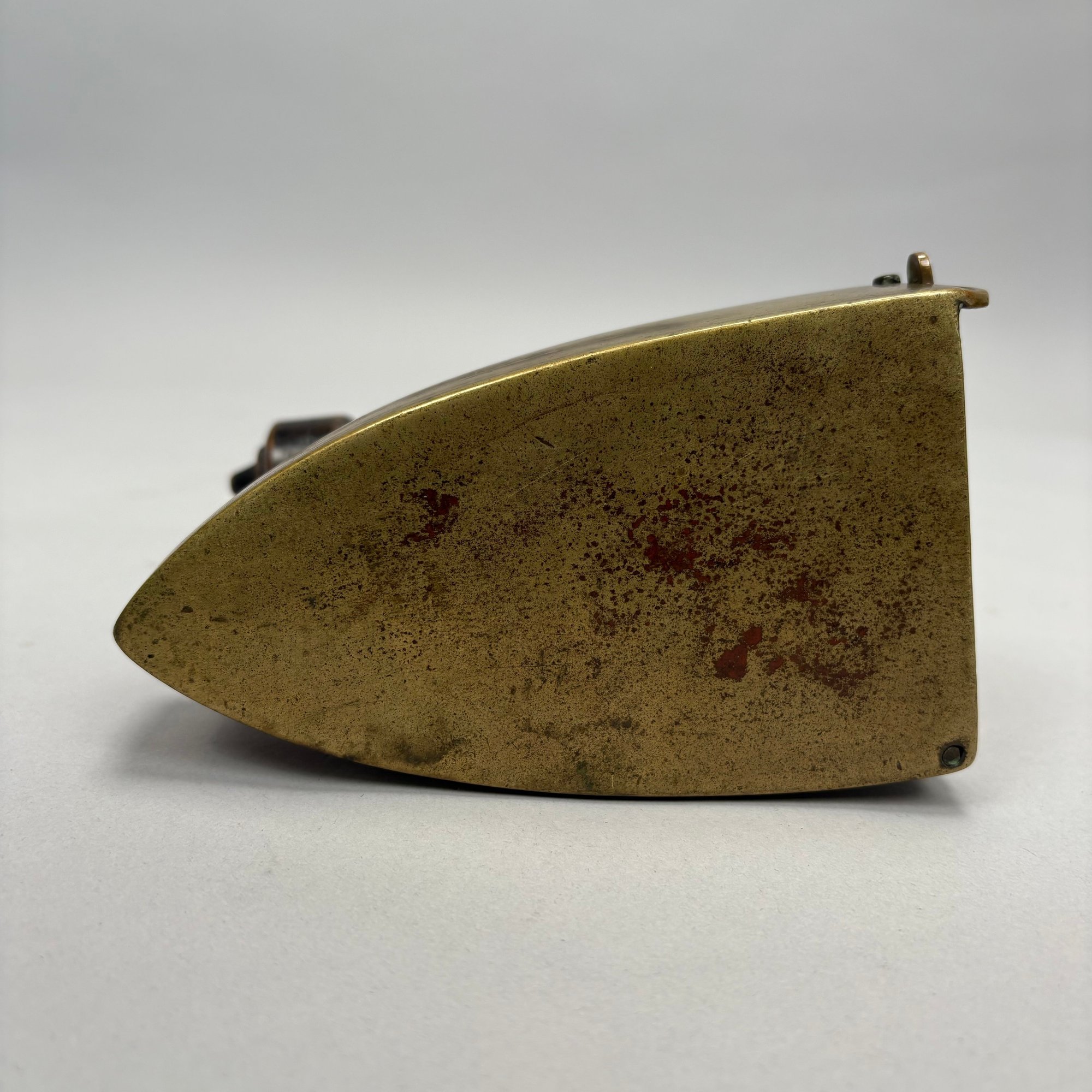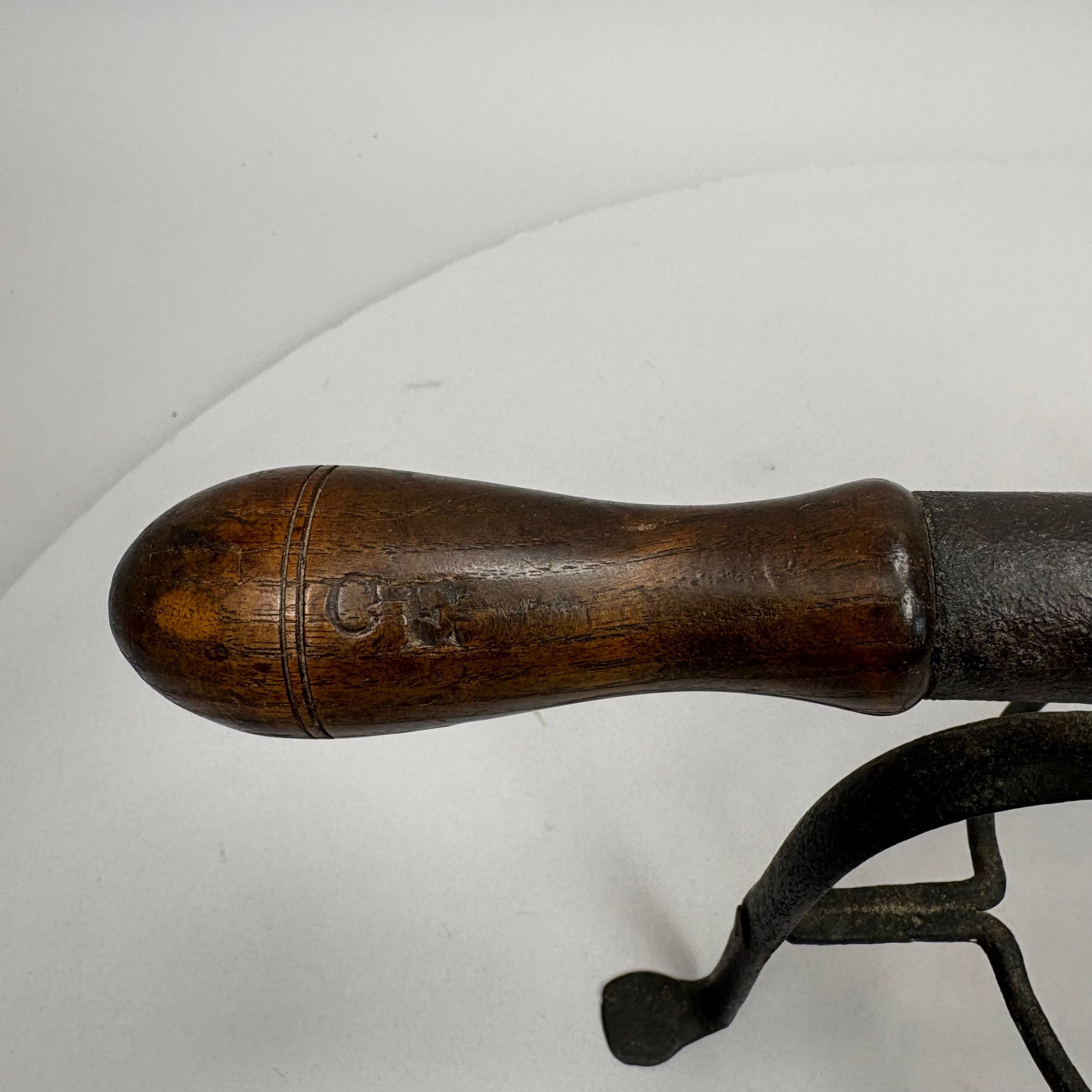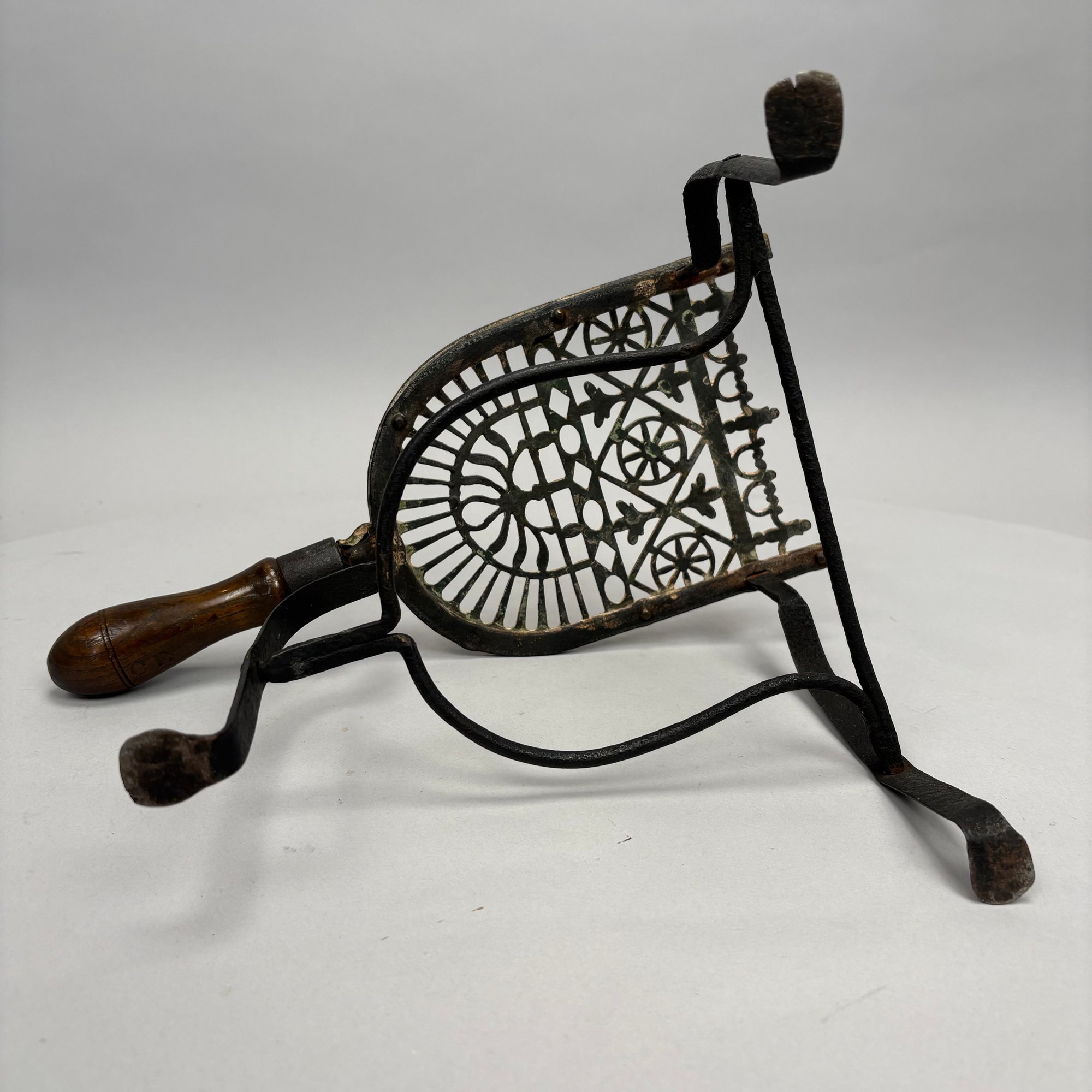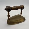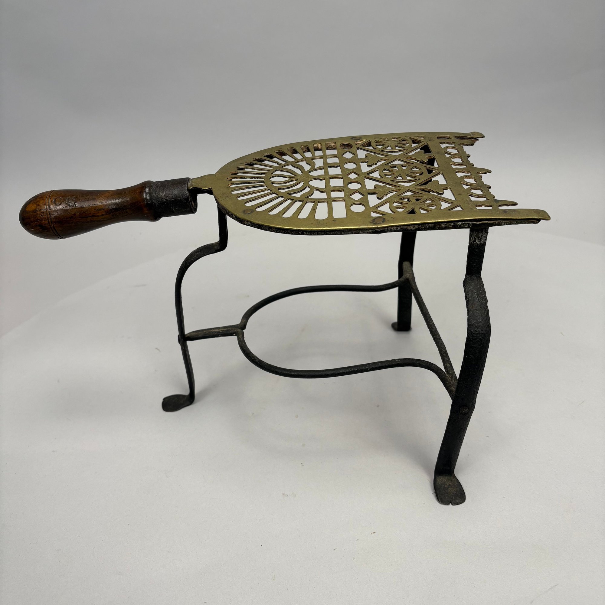 Brass and Wood Sad Iron and a Brass Fireplace Trivet, 19th Century. The iron engraved on the top with a foliate wreath, sawtooth band and circle border, the latched door enclosing a removable lead slug; the trivet on a wrought-iron base, each with a turned wood handle.