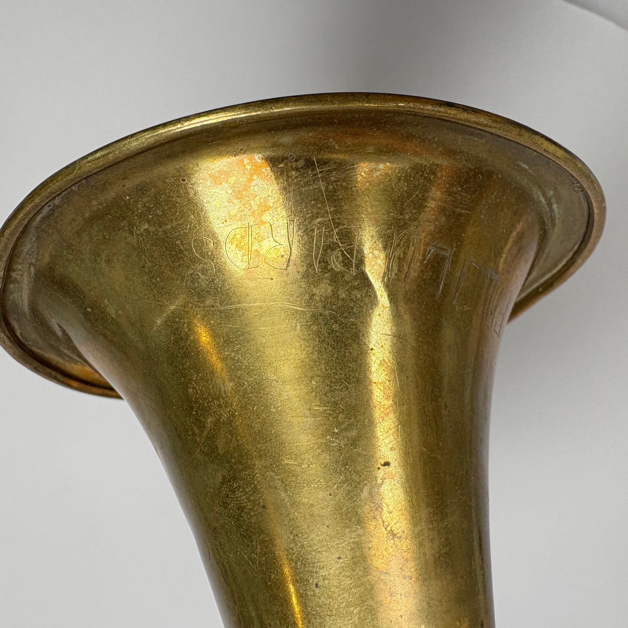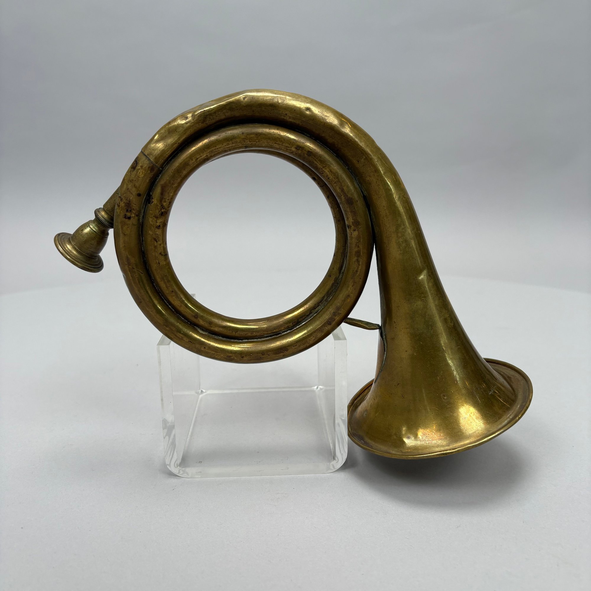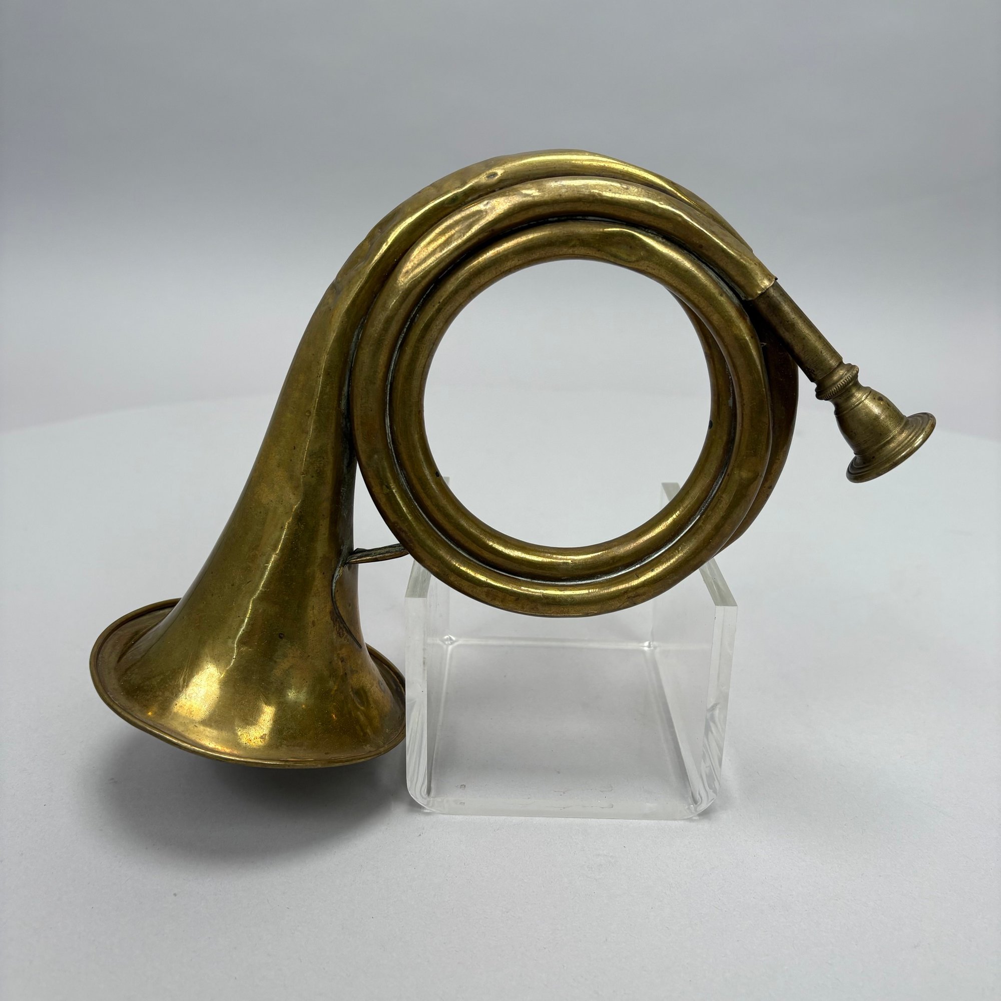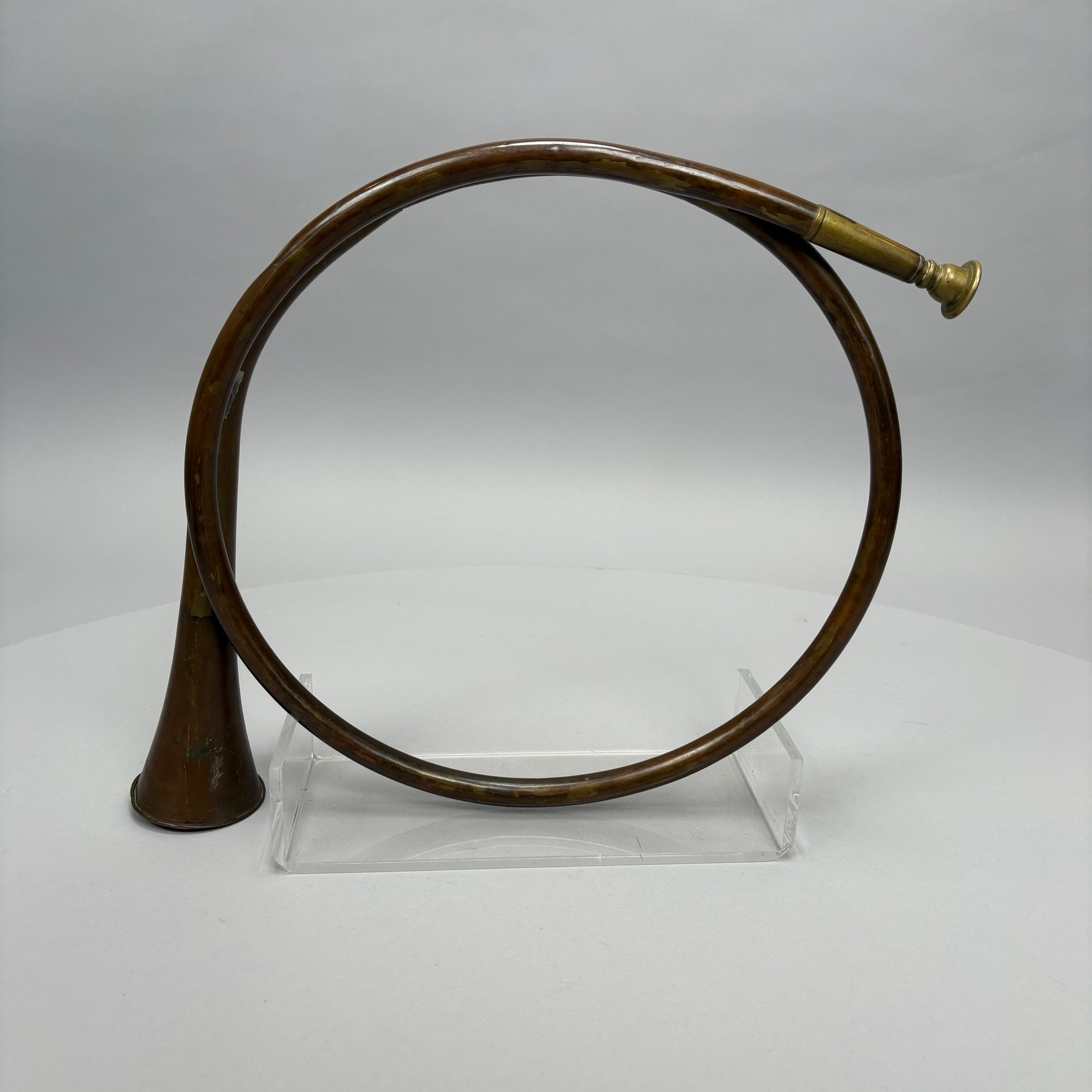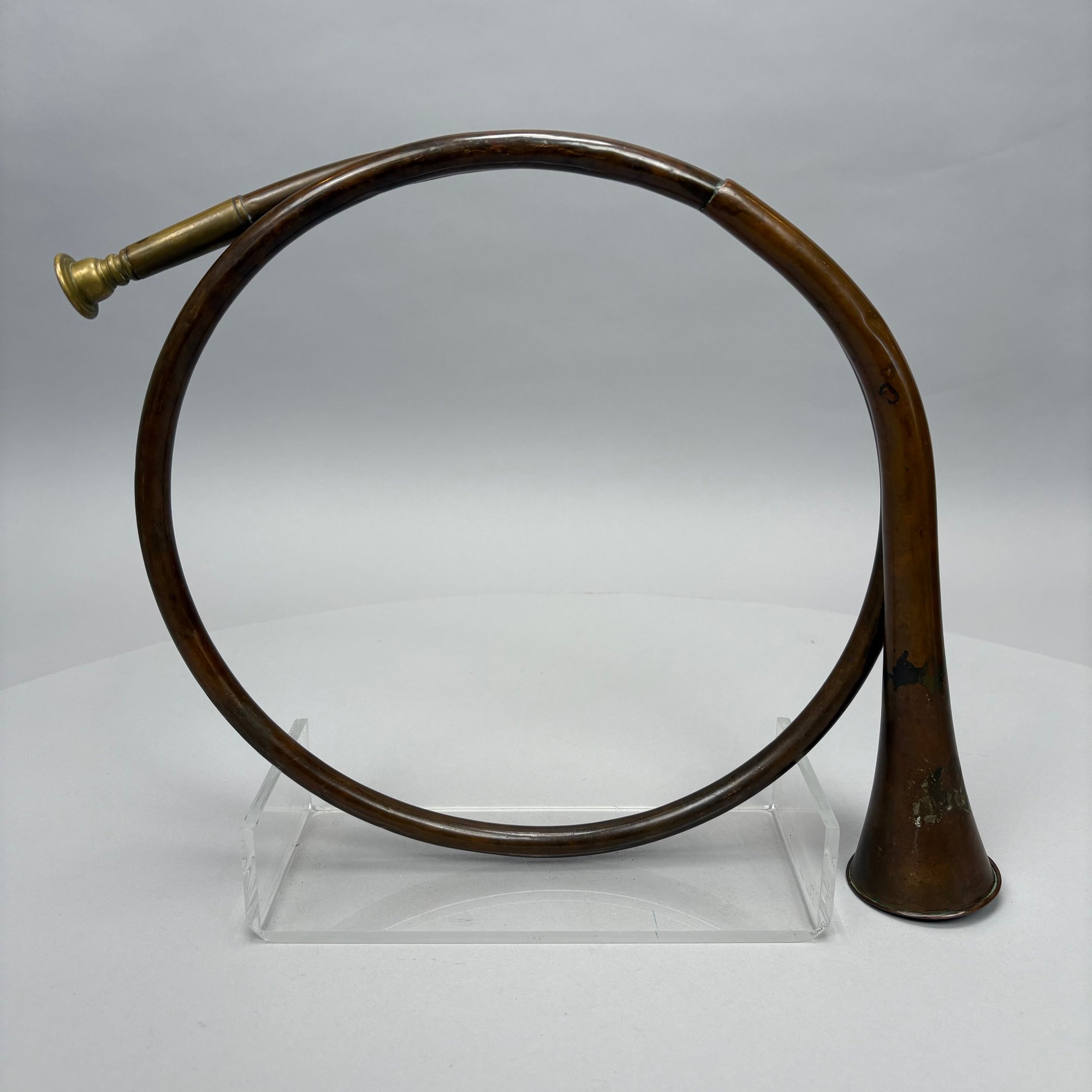 Brass Post Horn and a Brass and a Cooper Hunting Horn. The post horn marked with the initials "J.P." over an asterisks.