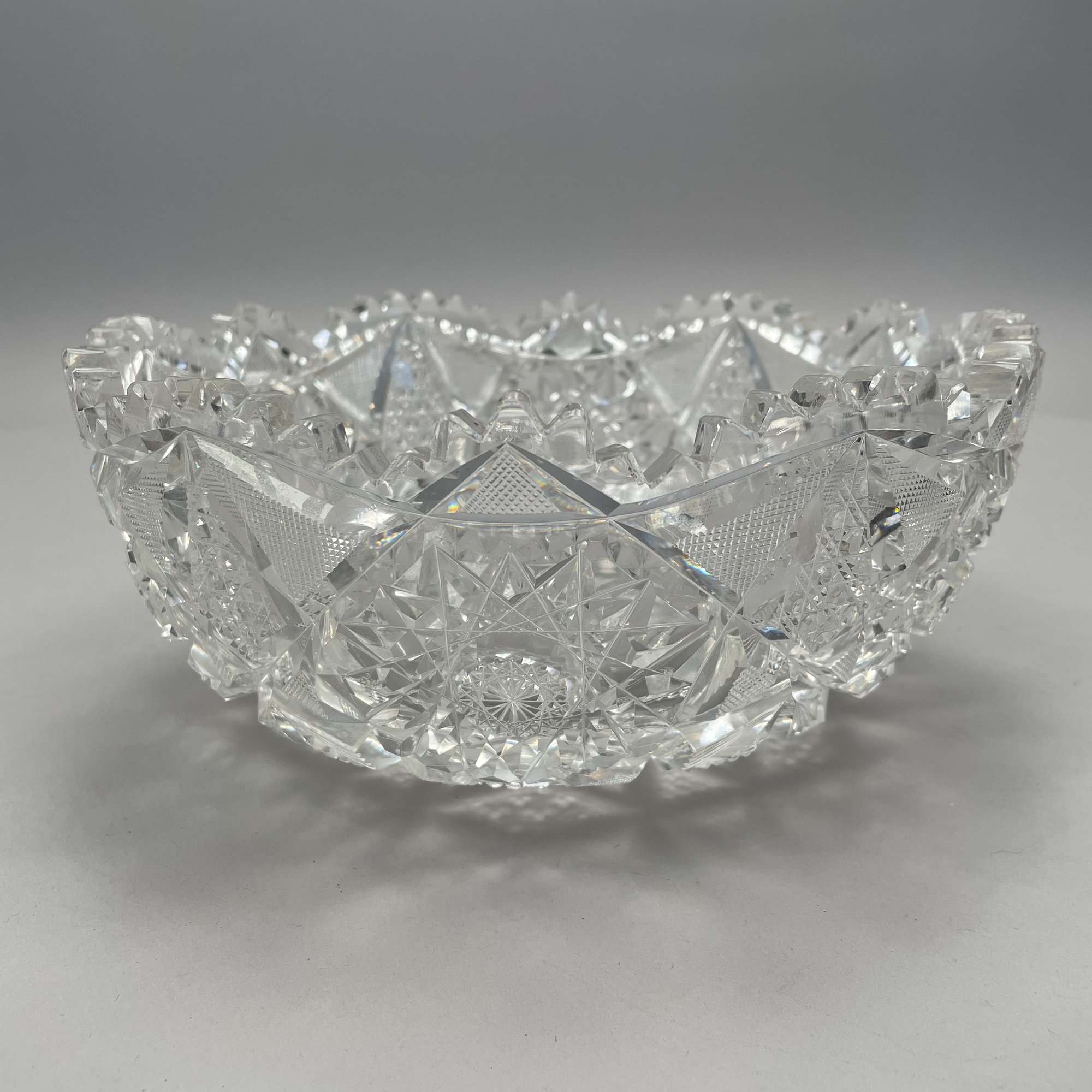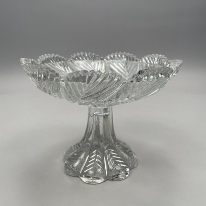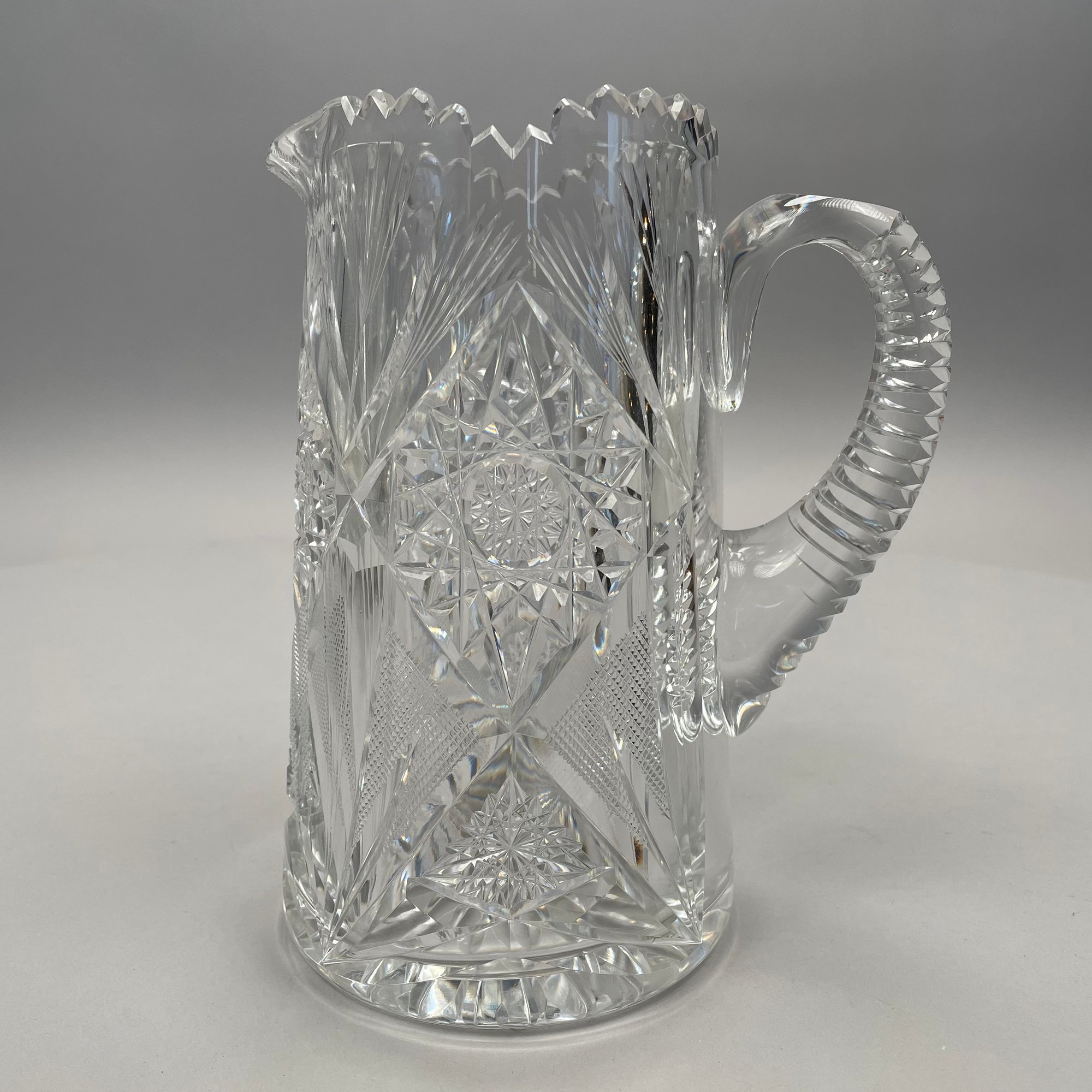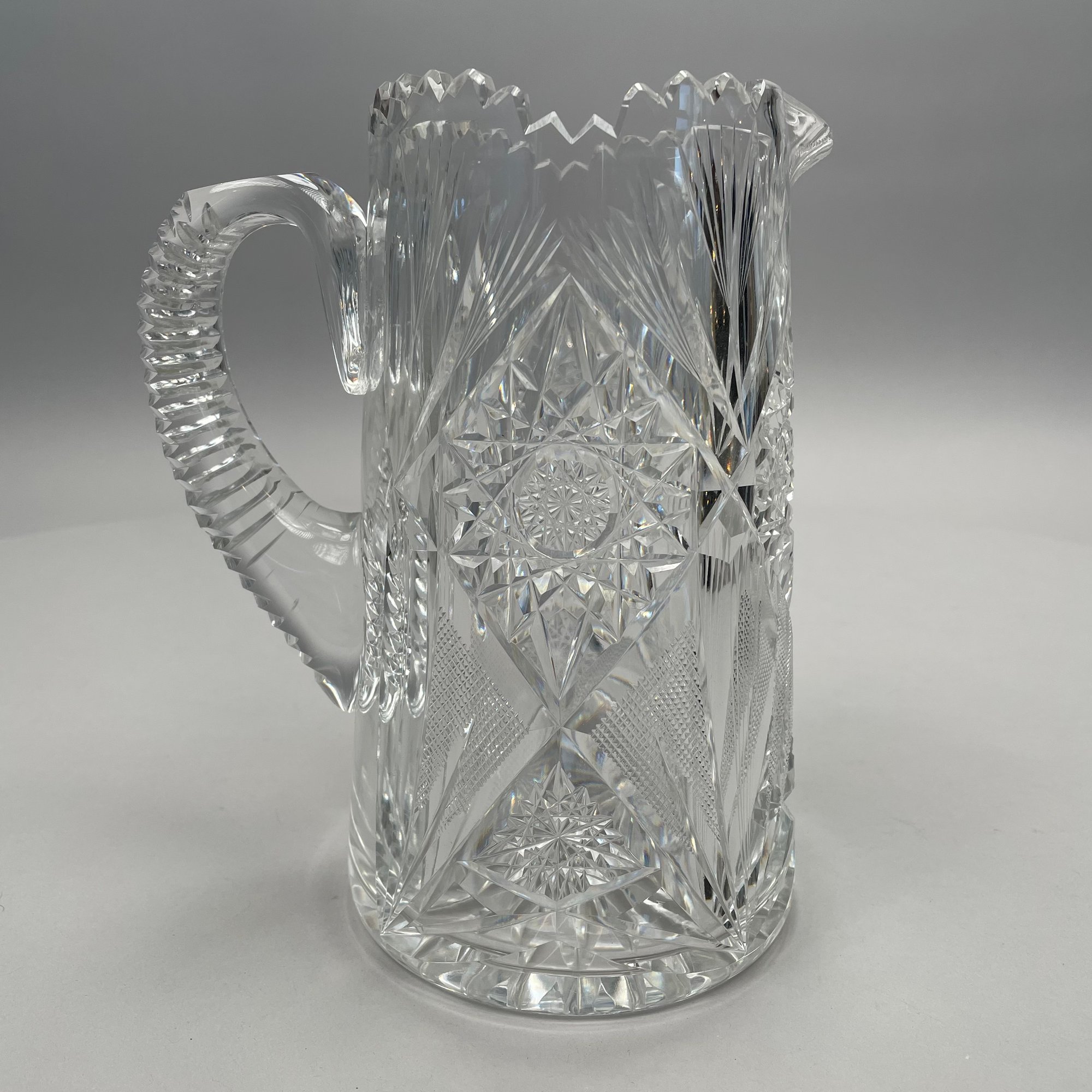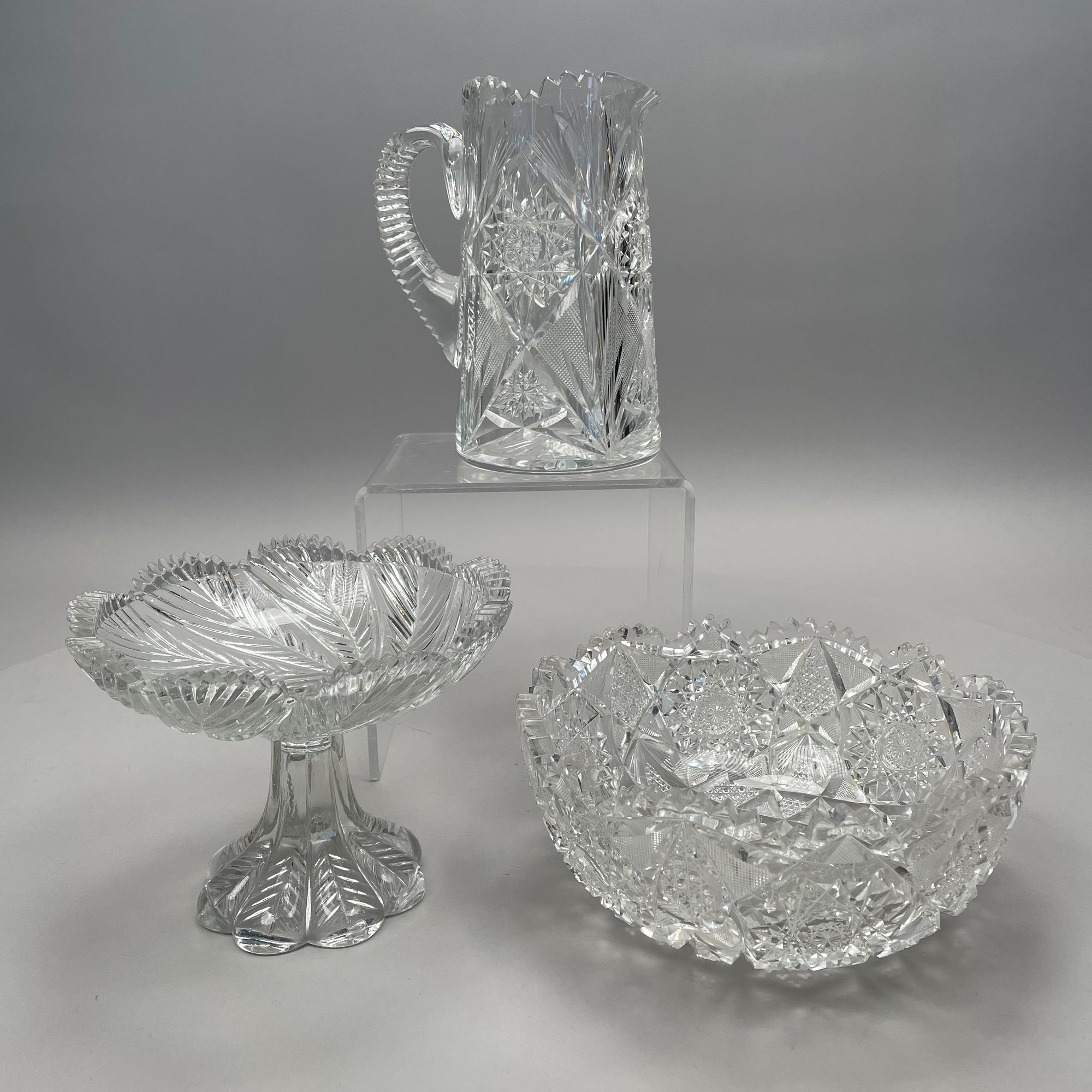 American Brilliant Cut Glass Pitcher and Bowl, and a Pressed Glass Tazza. The pitcher and bowl each cut in various hobstar, fan, strawberry diamond and cross-cut patterns; the tazza pressed in a spiral feather pattern.
