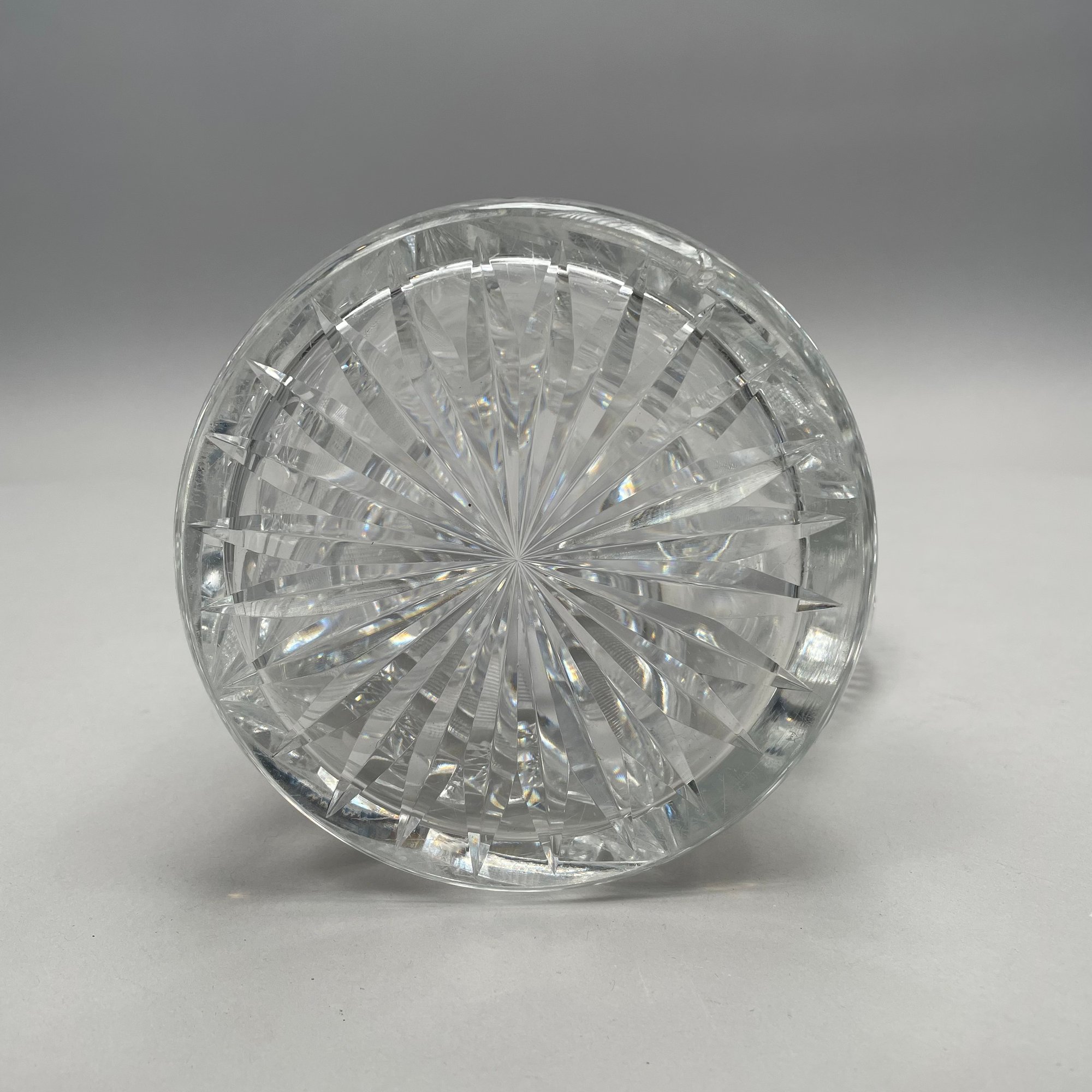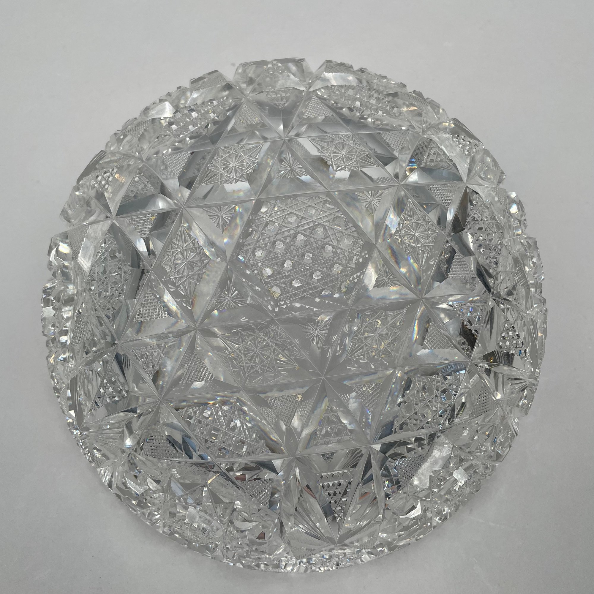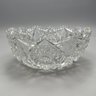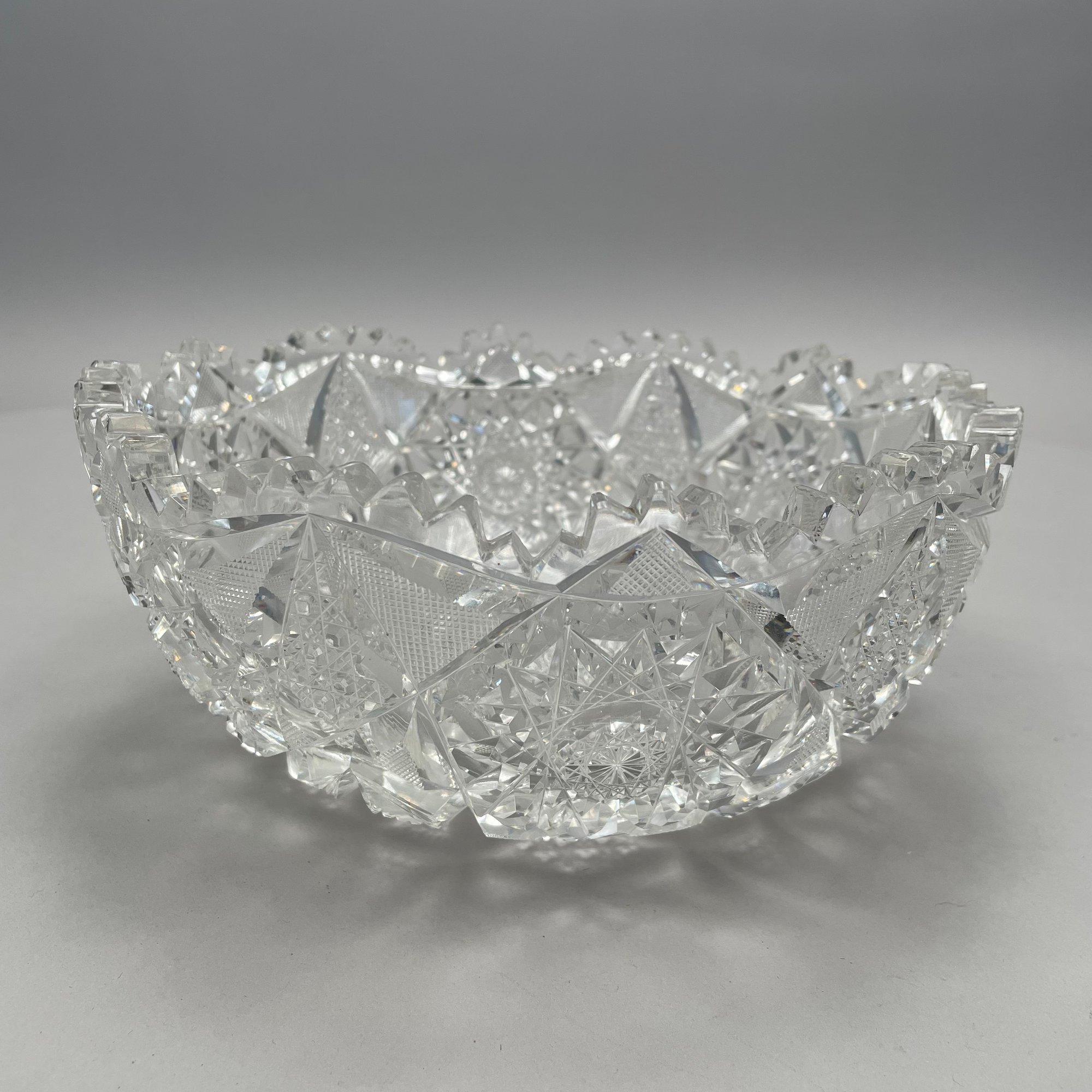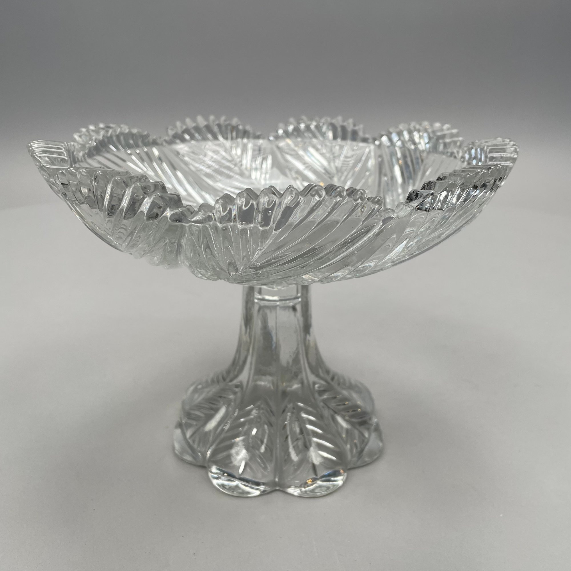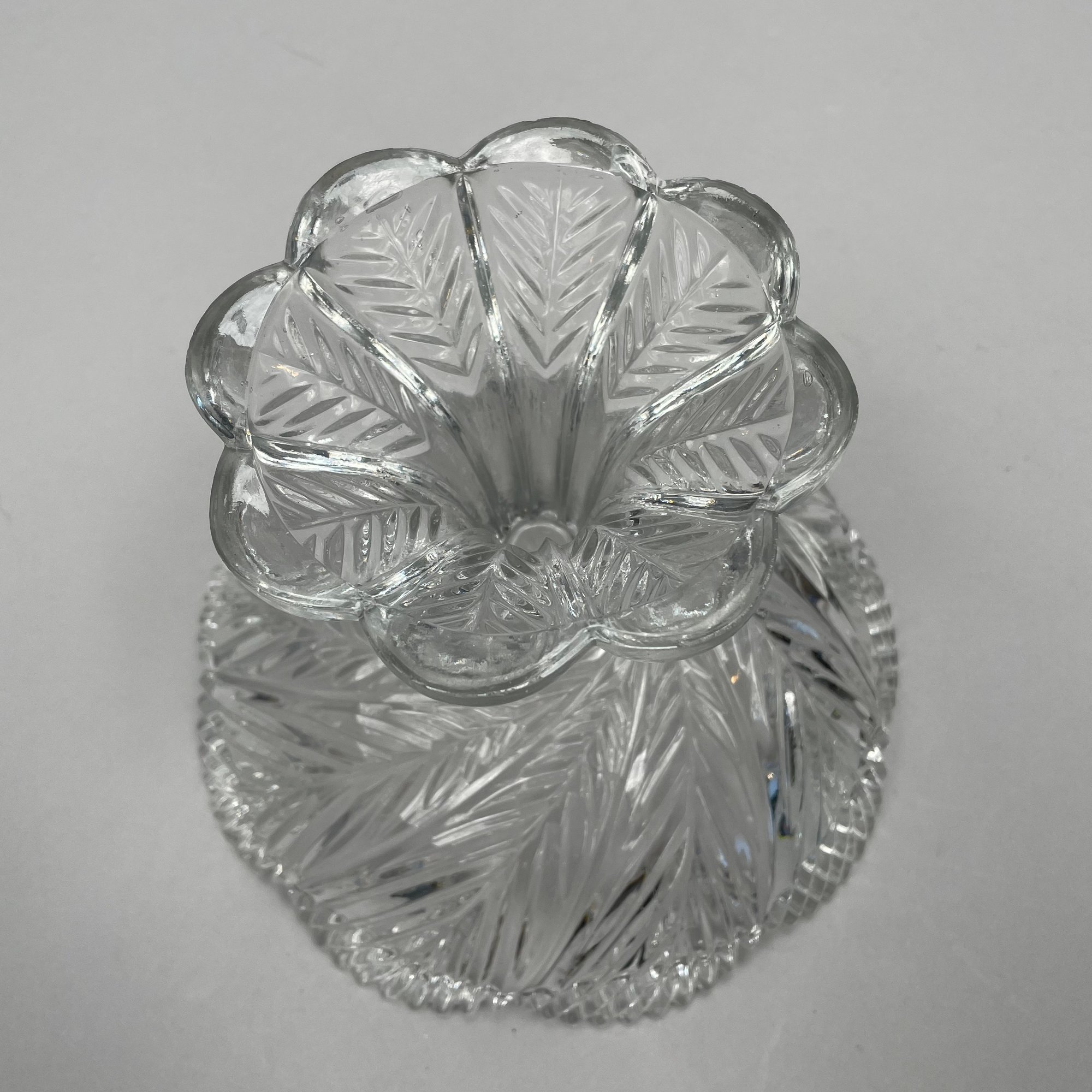 American Brilliant Cut Glass Pitcher and Bowl, and a Pressed Glass Tazza. The pitcher and bowl each cut in various hobstar, fan, strawberry diamond and cross-cut patterns; the tazza pressed in a spiral feather pattern.