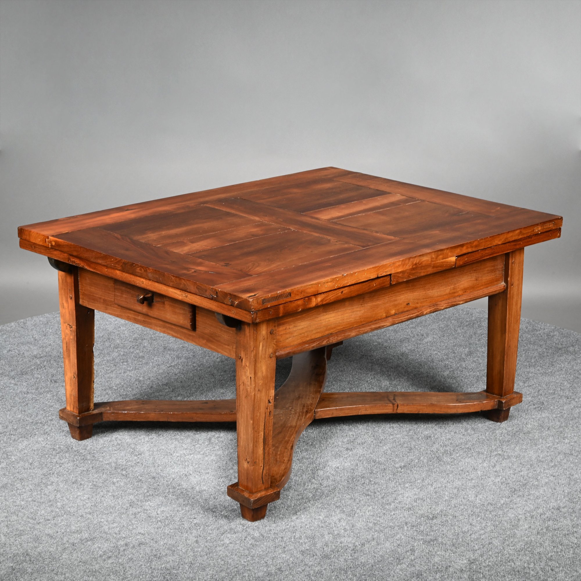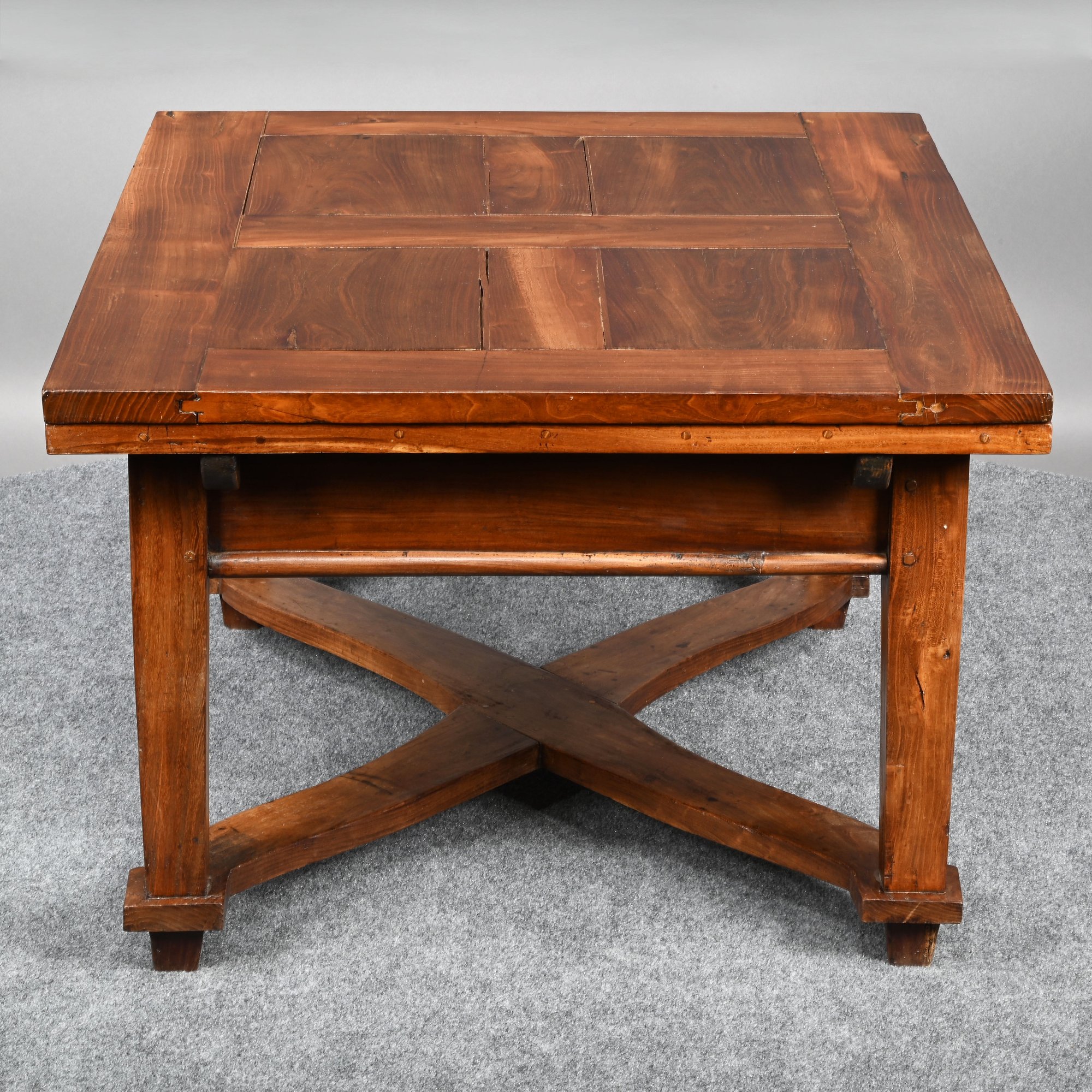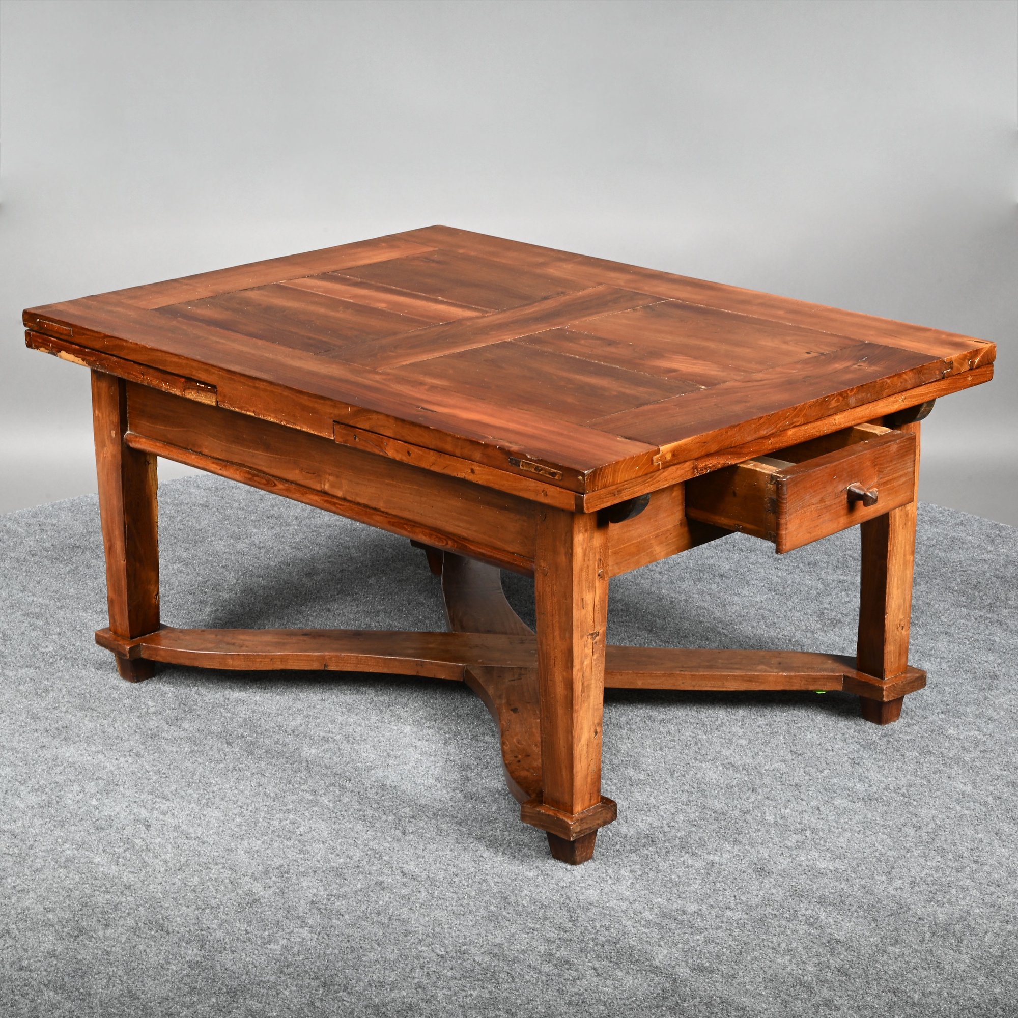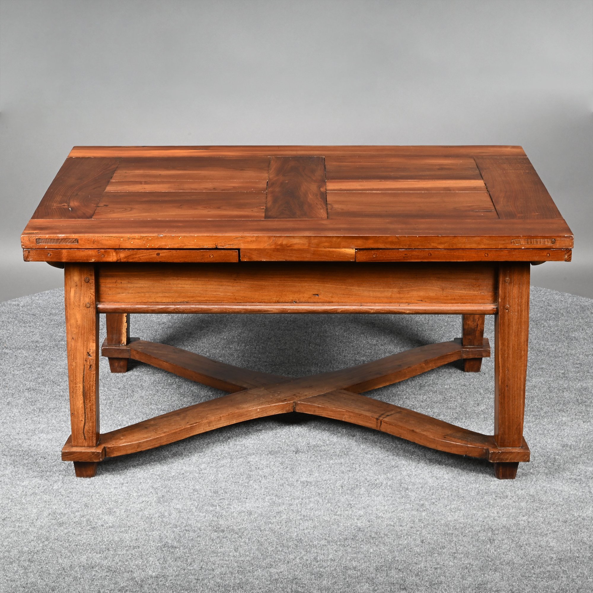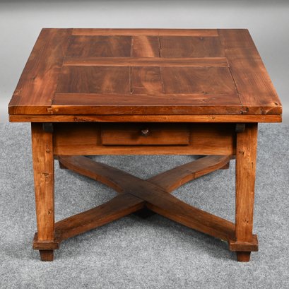 British Walnut Low Table. The rectangular panelled top fitted with two pull-out leaves on each short end, one short end with a drawer, raised on square tapered legs joined by a shaped X-form stretcher.
