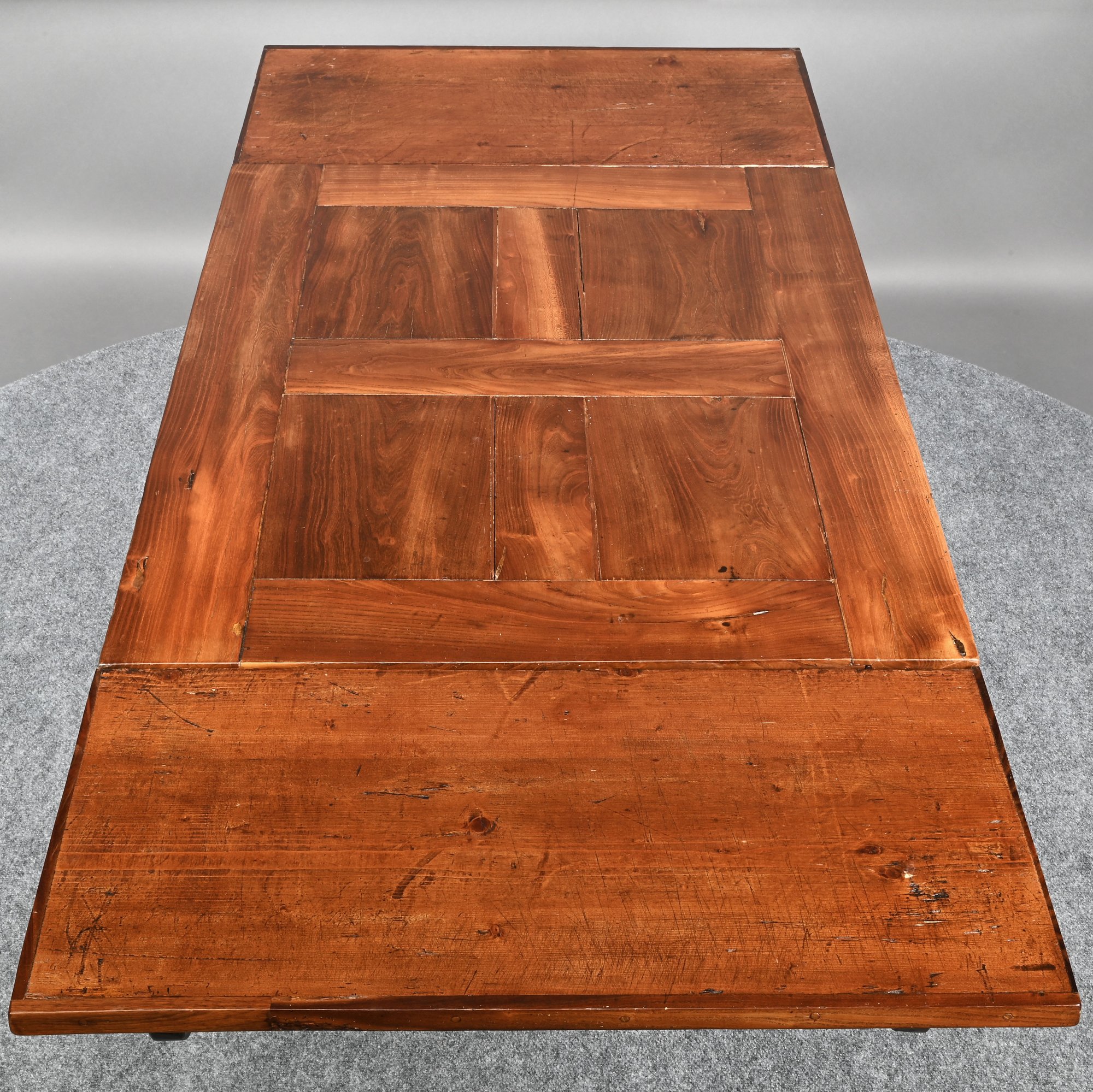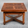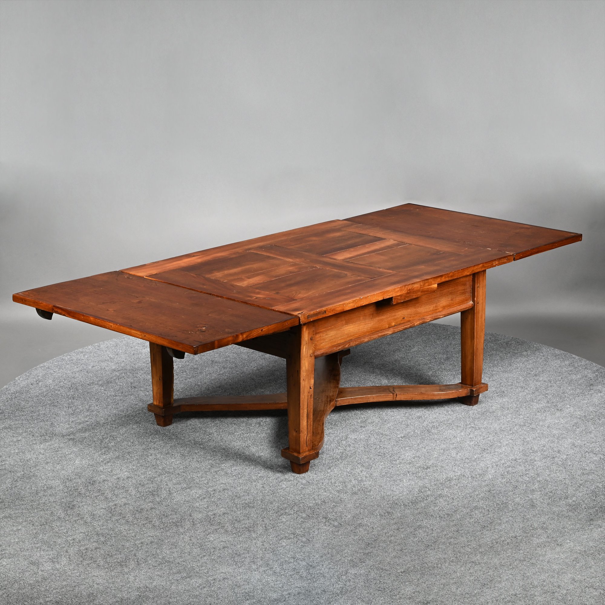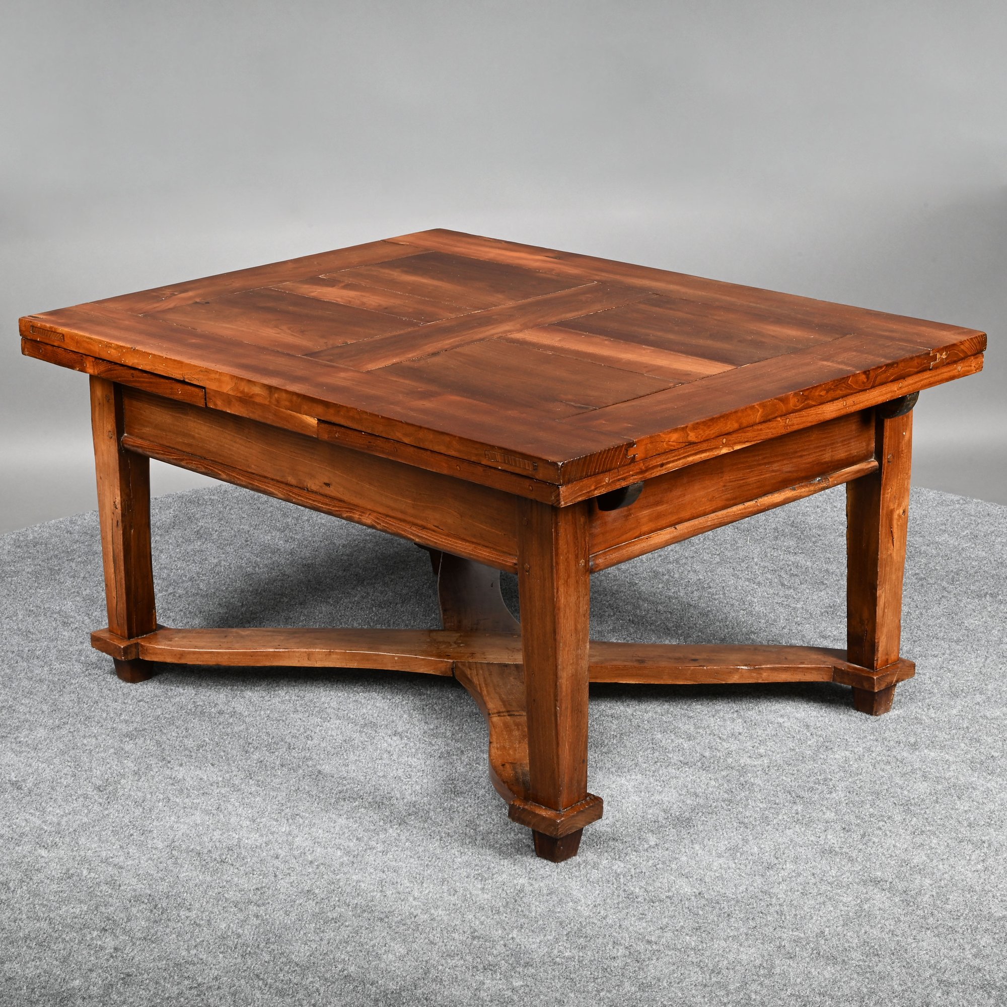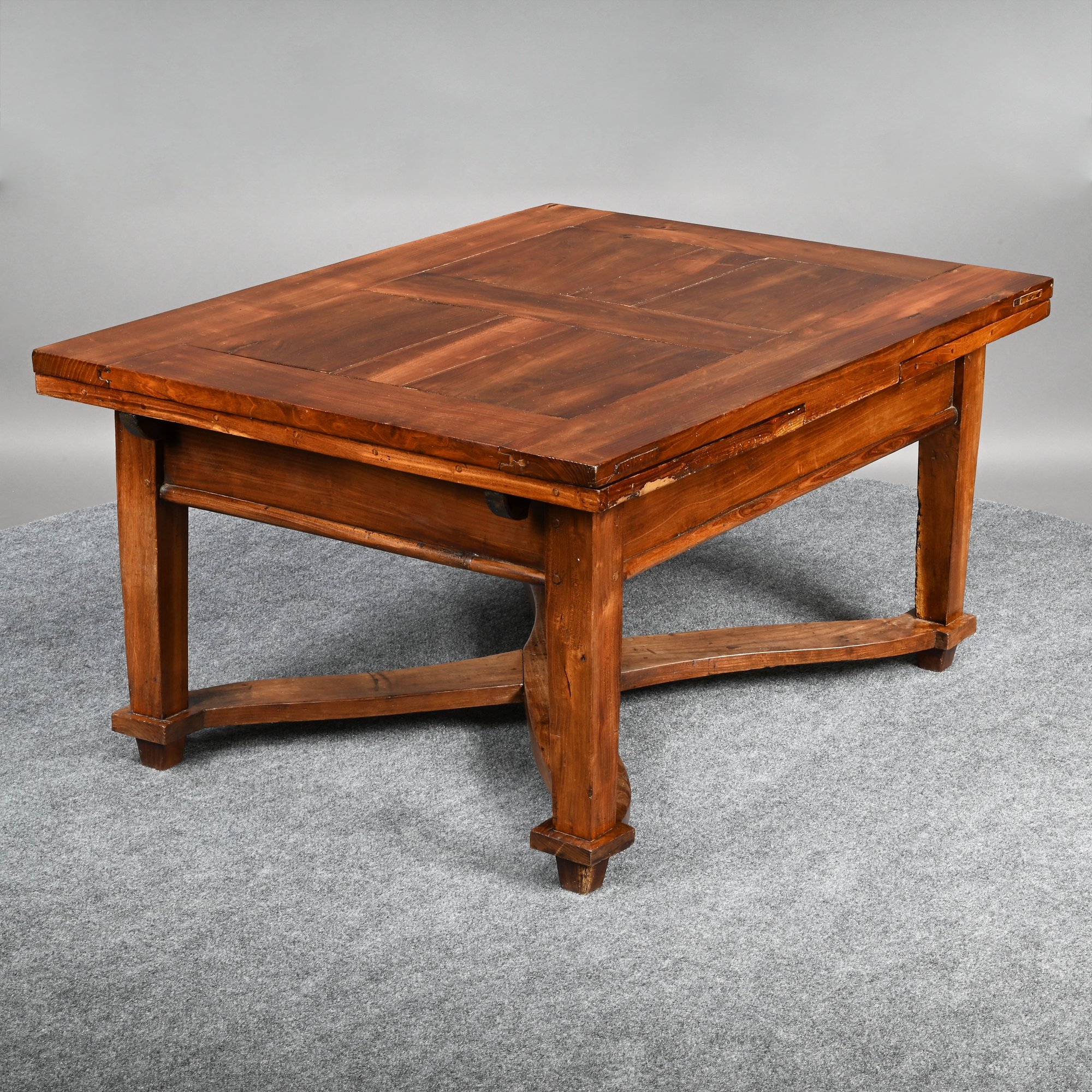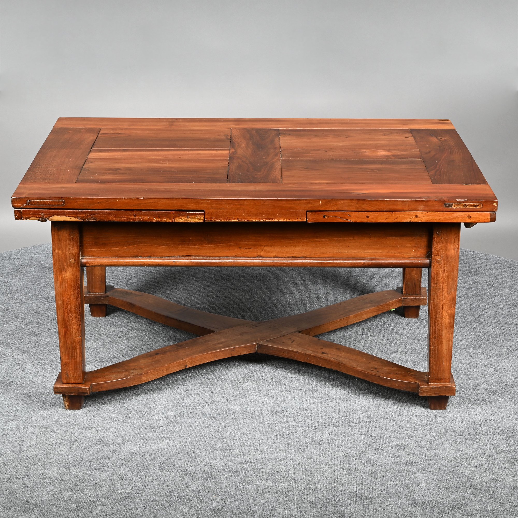 British Walnut Low Table. The rectangular panelled top fitted with two pull-out leaves on each short end, one short end with a drawer, raised on square tapered legs joined by a shaped X-form stretcher.