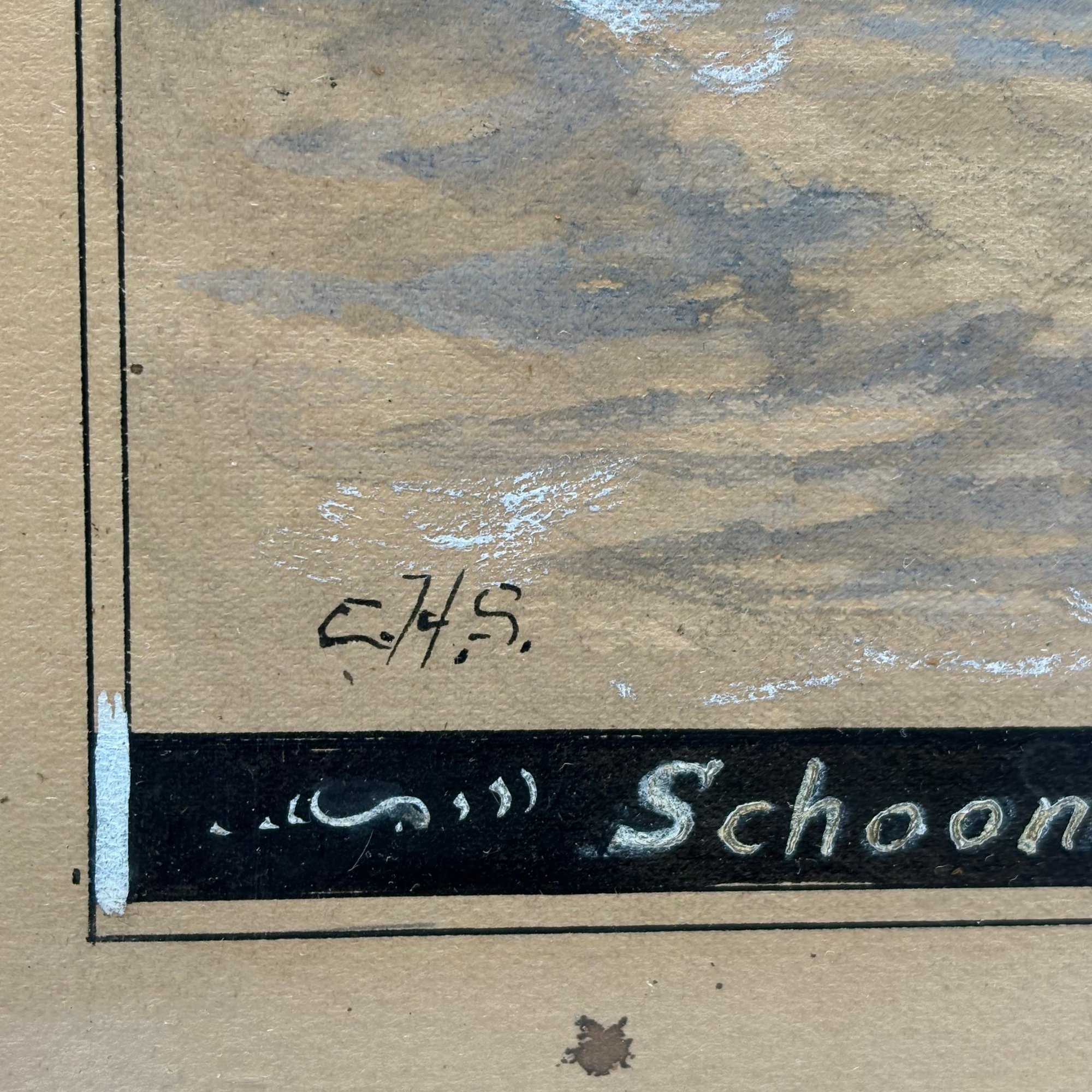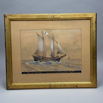 American School (C.H.S). Continental "Schooner Hannah Capt. Nicholson Broughton Master," 19th Century. Watercolor on paper, signed "C.H.S." lower left, (15.25 x 19.125 inches, sight); housed in a lemon gold frame.