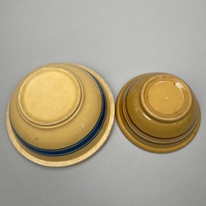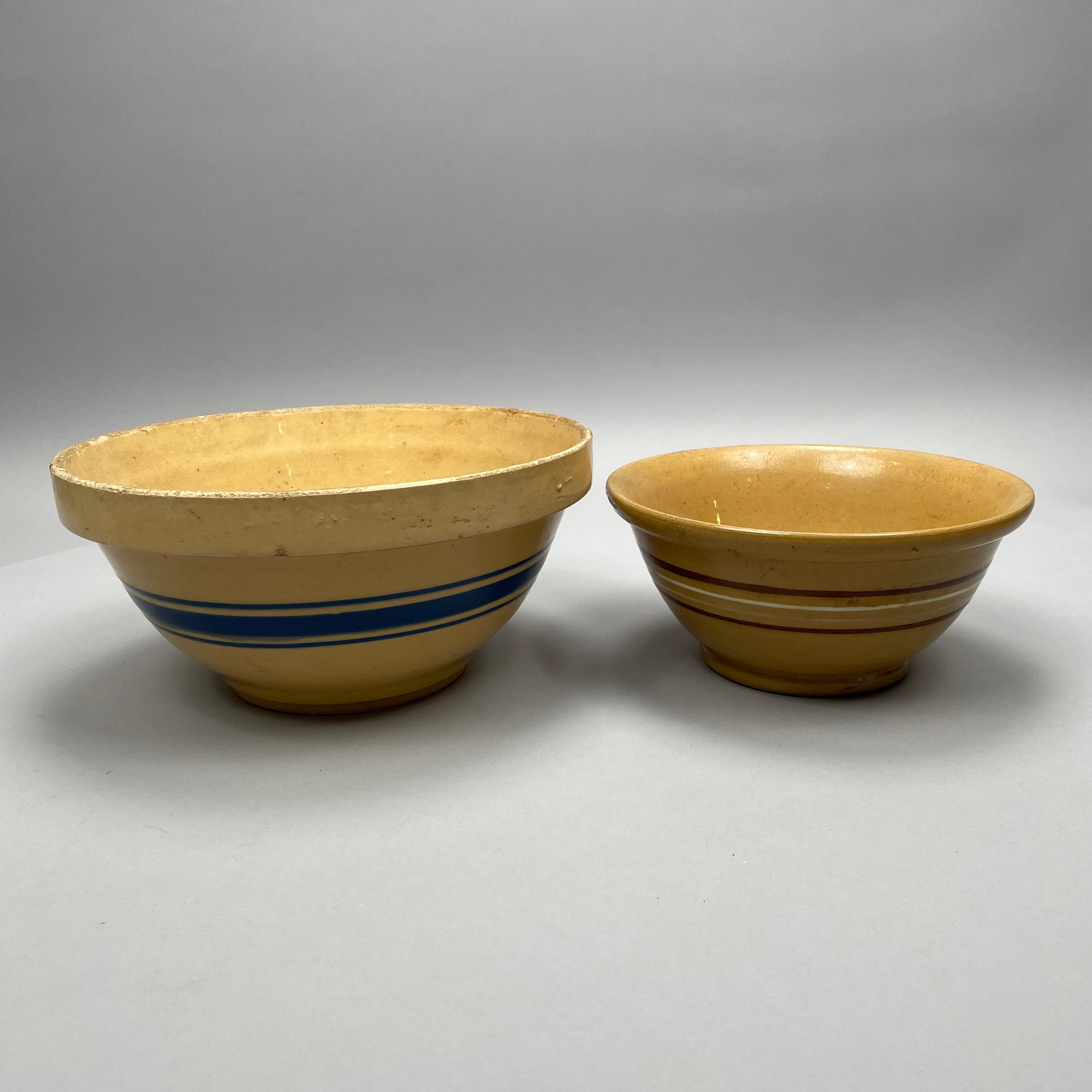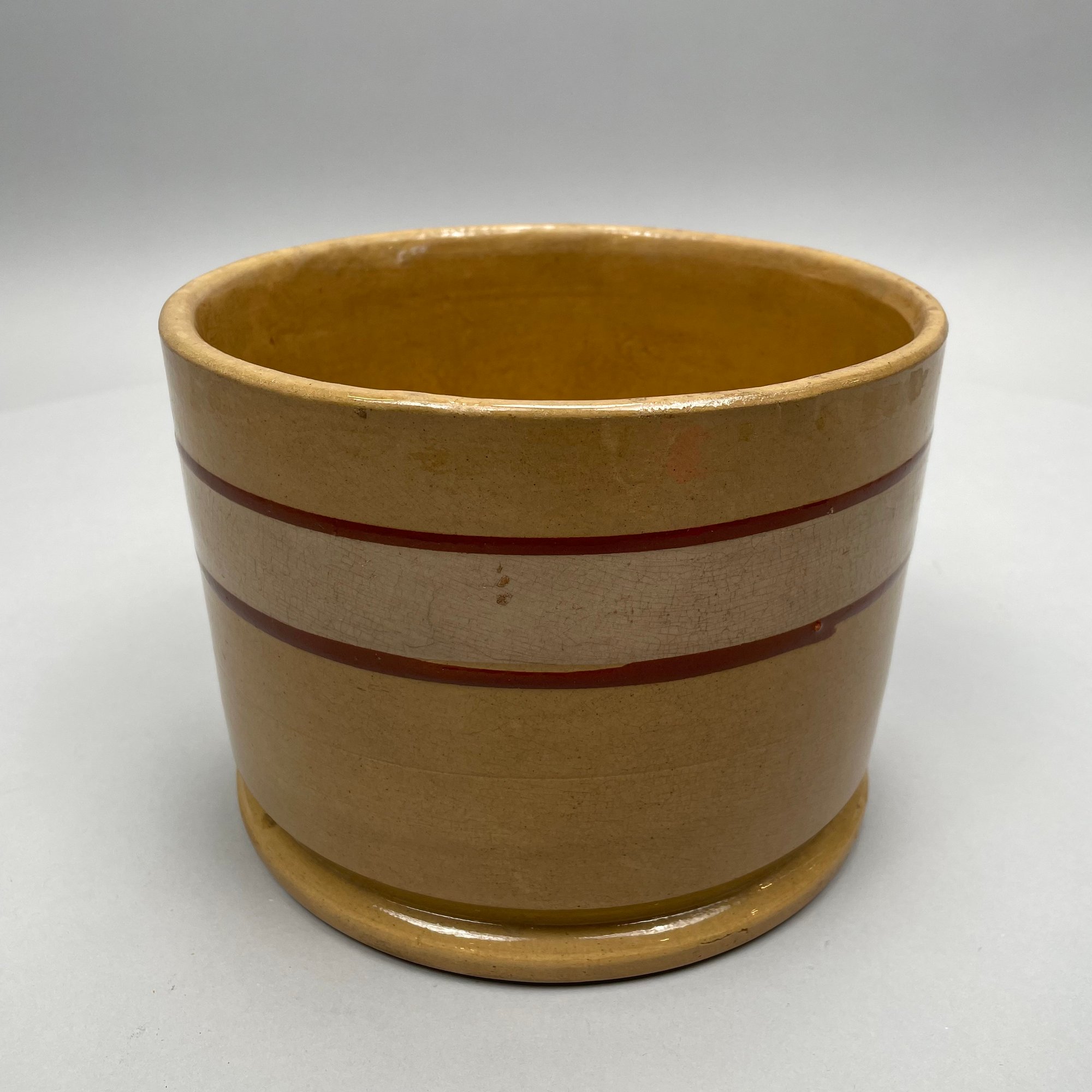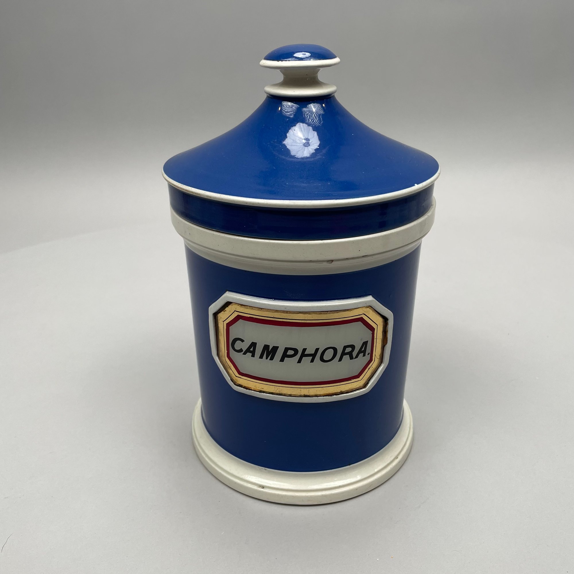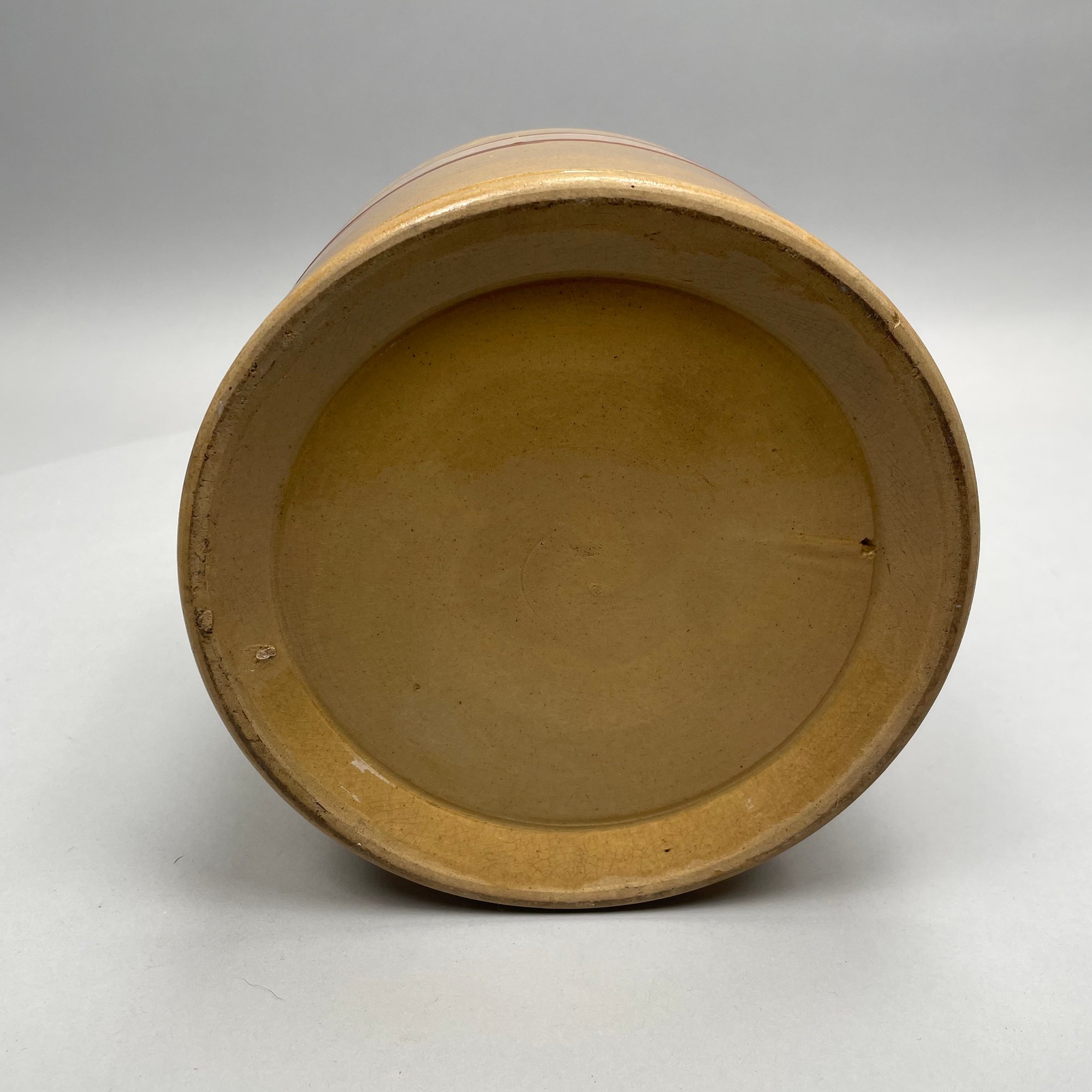 "CAMPHORA" Apothecary Jar Filled with Calling Cards, Two Yellow Ware Bowls and a Crock.