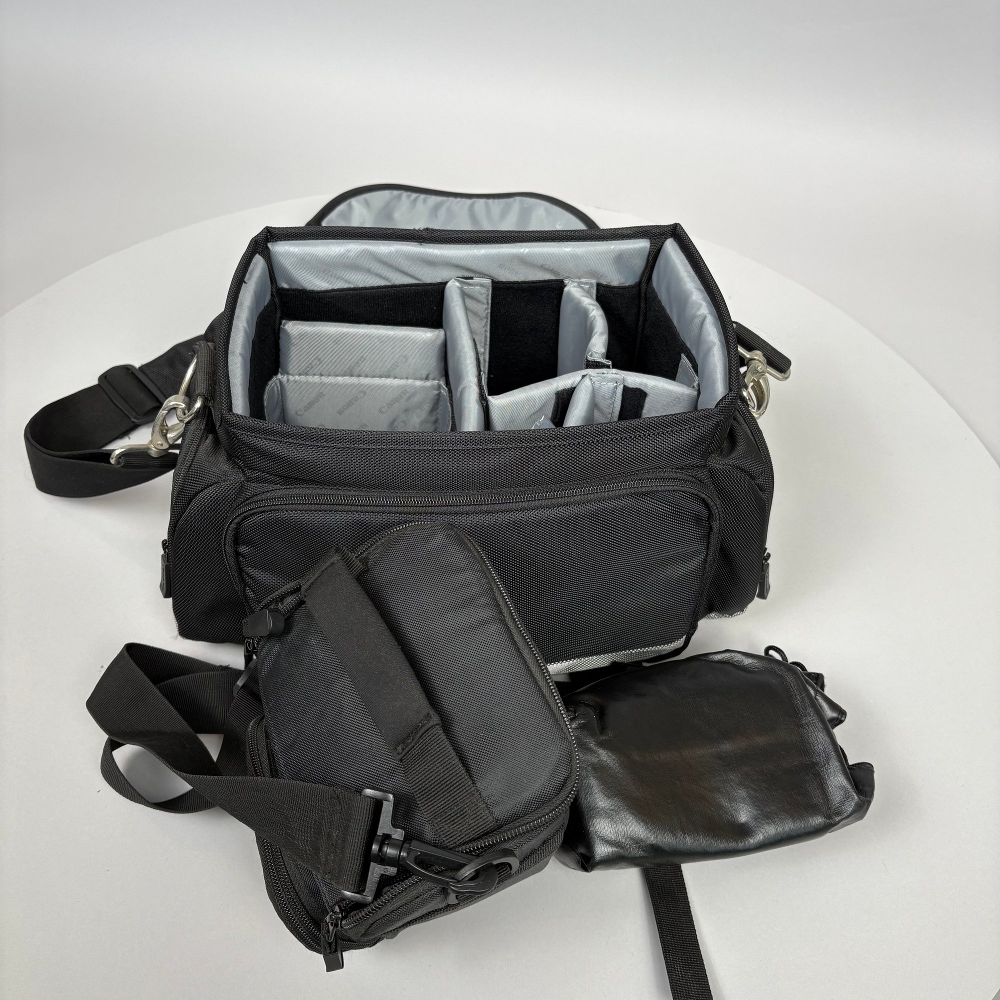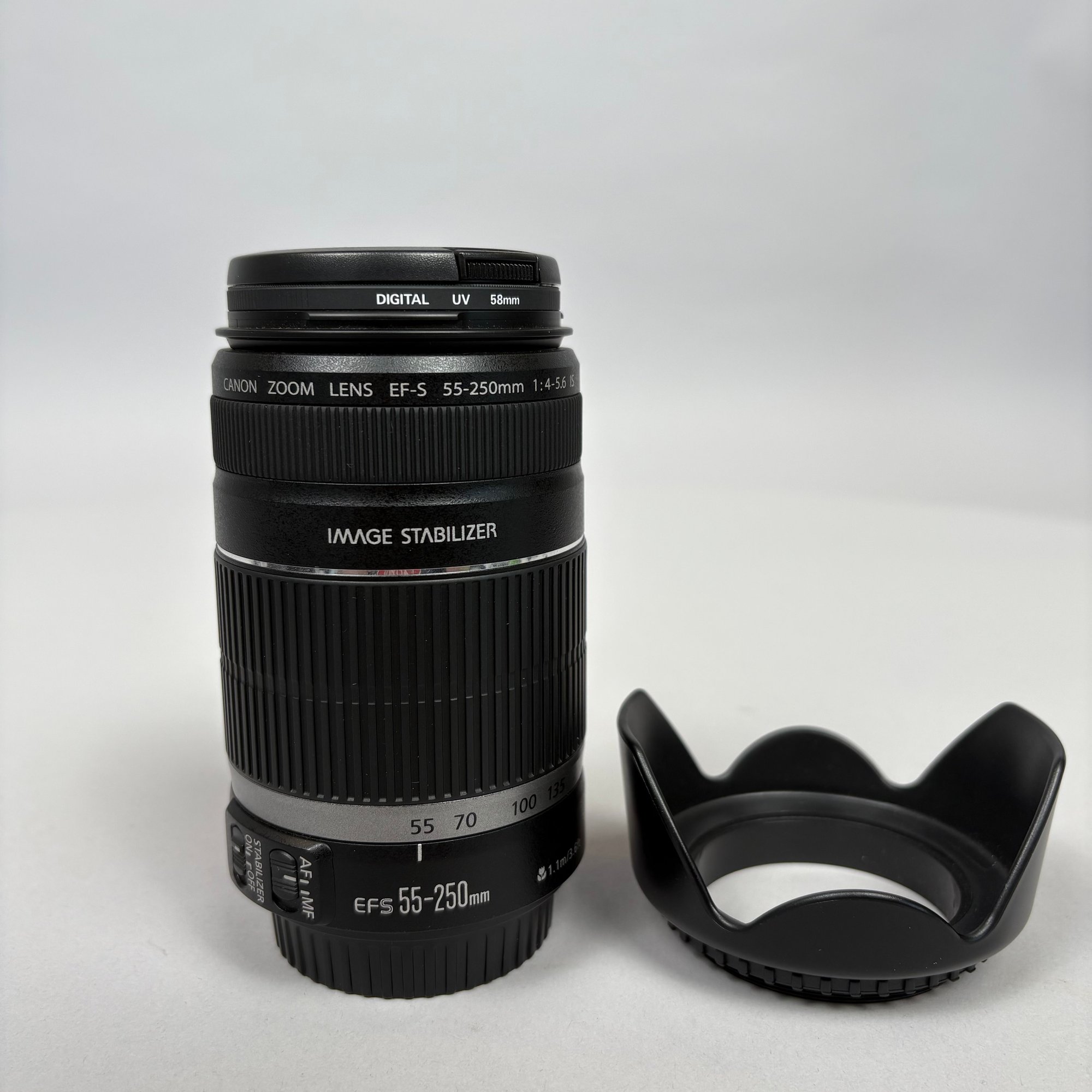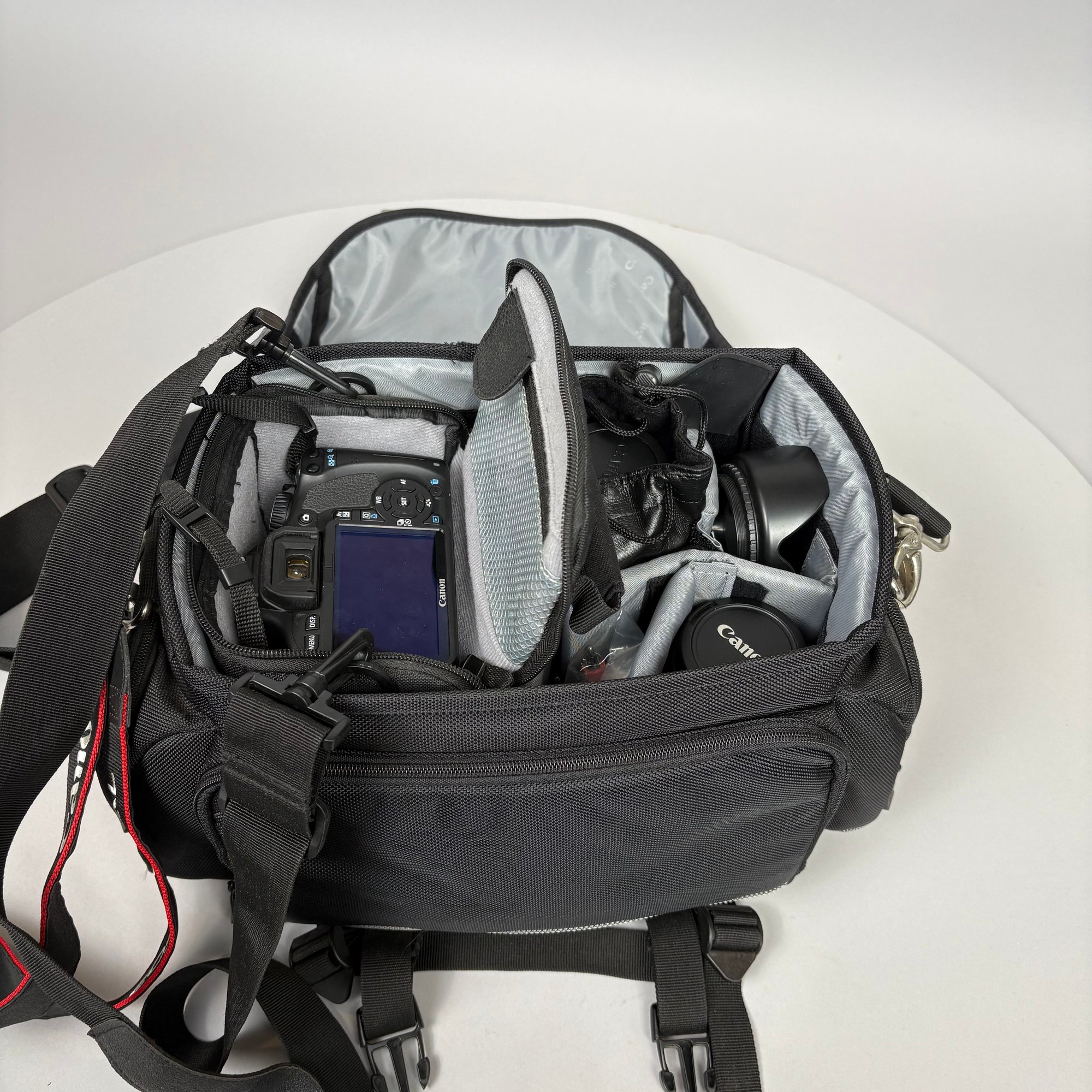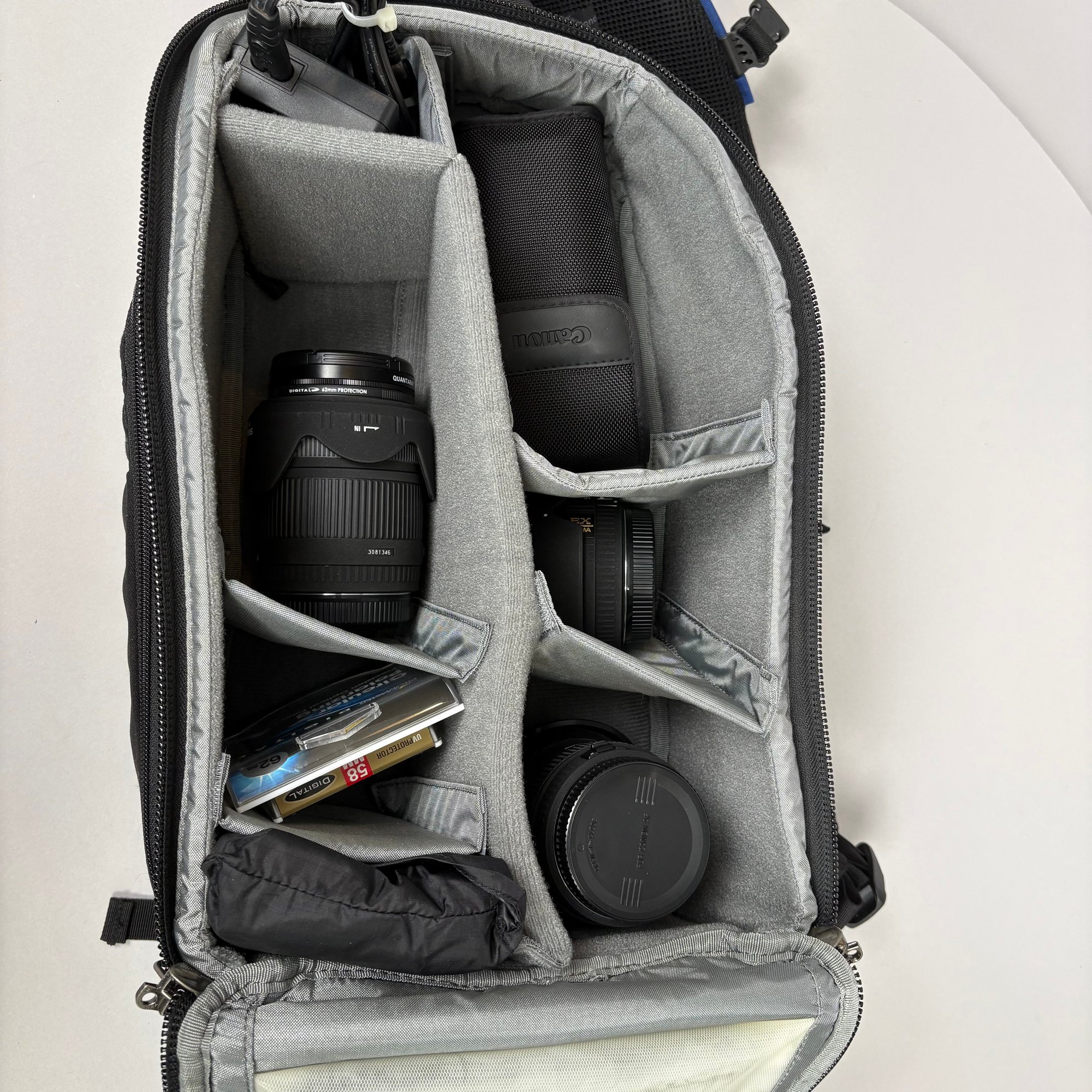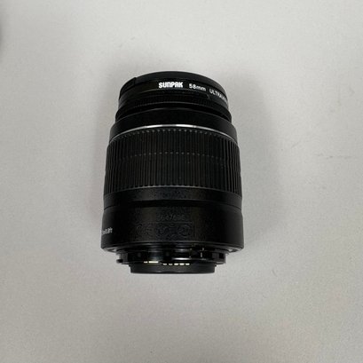 Canon EOS Rebel T2i Camera, with Accessories. Comprising a Canon EOS Rebel T2i camera body, together with a Canon EFS 18-55mm macro 0.25m flash 0.8 ft; Sunpak UV filter; Canon EFS 55-250mm 1: 4-5.6 lens fitted with a UV filter; Canon macro 100mm 1:2.8 lens with lens hood; Sigma 28-300mm 1:3.5-6.3 lens fitted with a UV filter; a Quantaray circular polarizer C-P.L filter and lens hood; Sigma 10-20 mm 1:4-5.6 fitted with a Tiffen UV filter and Tiffen circular polarizer filter and lens hood; Sigma 30 mm 1:1.4 fitted with a Tiffen UV filter and lens hood; Canon speedlite 430 EX flash and carrying case; Promaster Digital 62 mm circular polarizing filter (new in box); one Canon battery; two after market batteries and charger; Canon camera bag; Thinktank camera backpack.