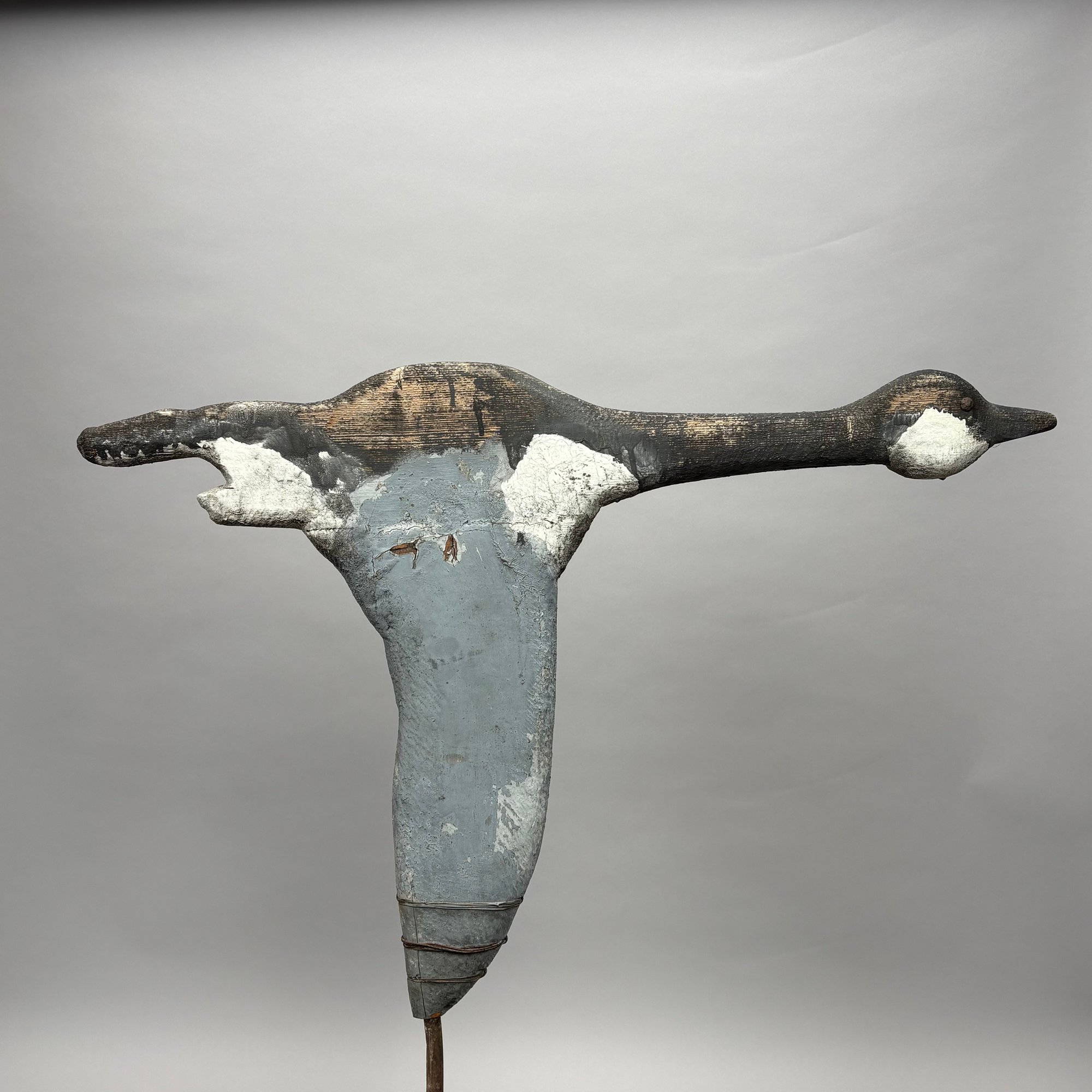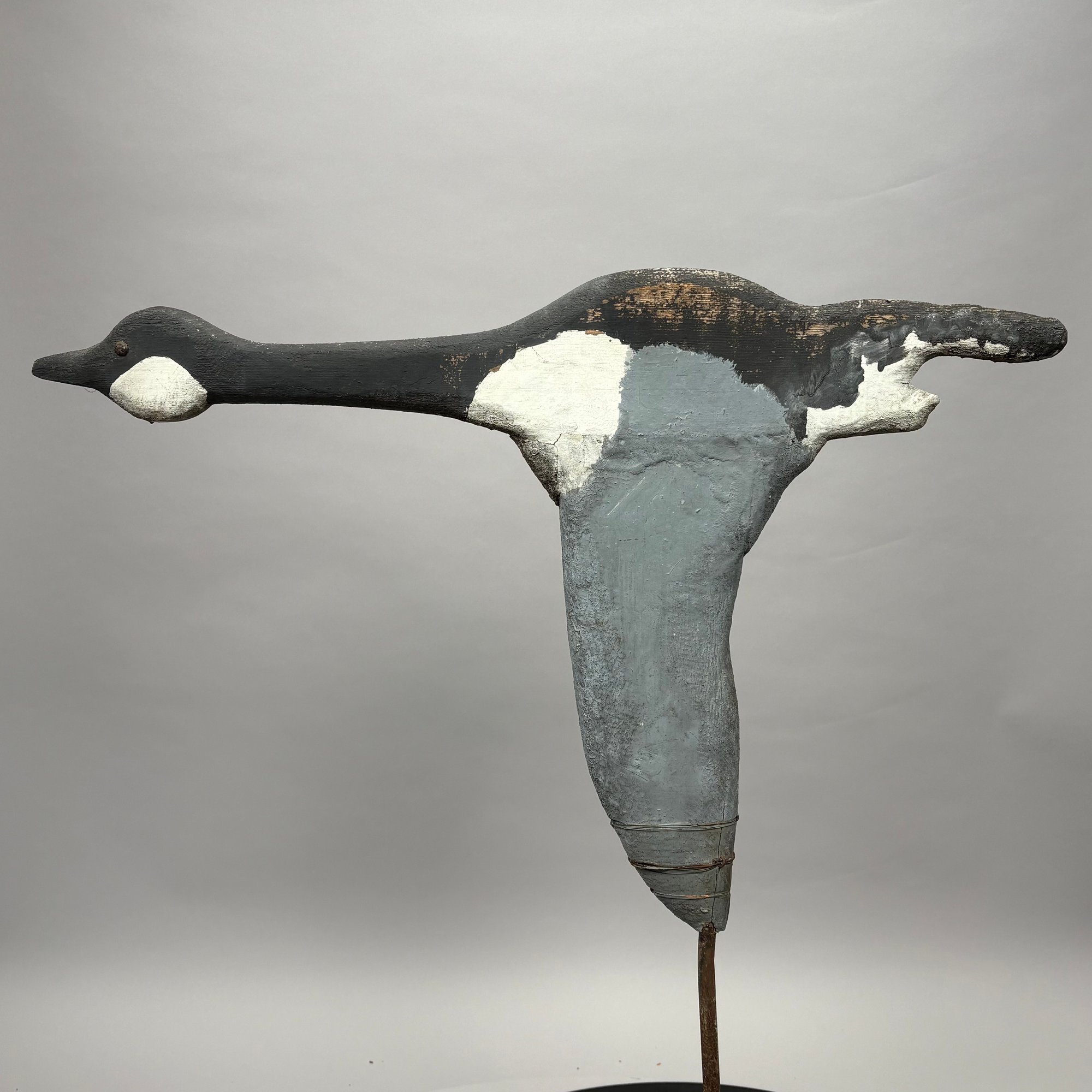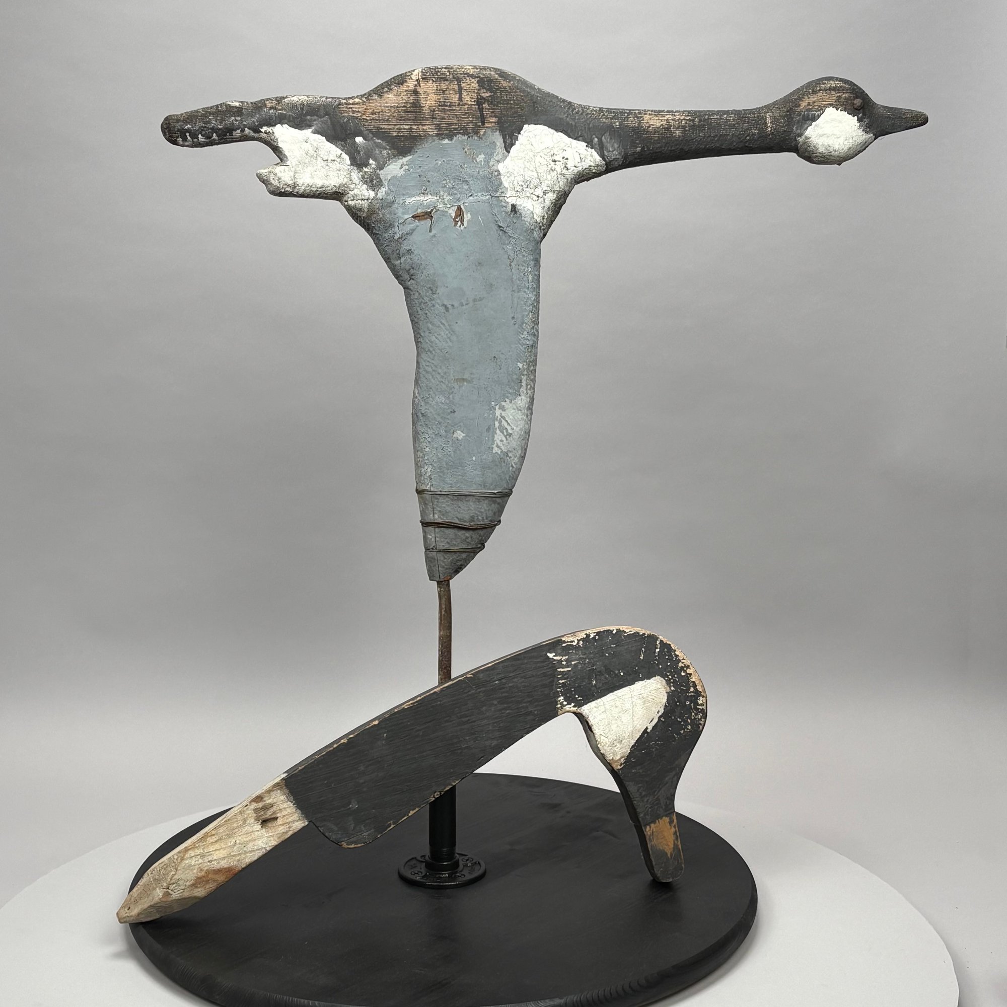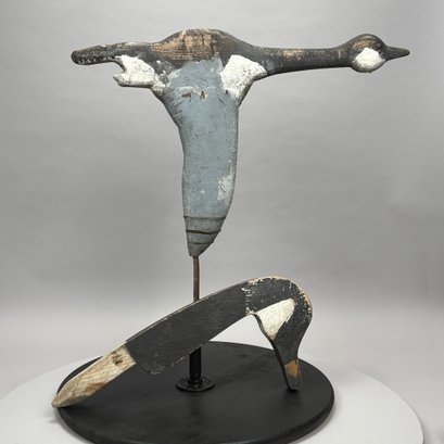 Carved and Painted Wood Canada Goose Decoy and a Weathervane, 20th Century. The goose head decoy inscribed in pencil "USED IN ESSEX MARSH 1920/ MADE BY / JOE LINCOLN/ ACCORD MASS;" the weathervane a carved goose in flight.
