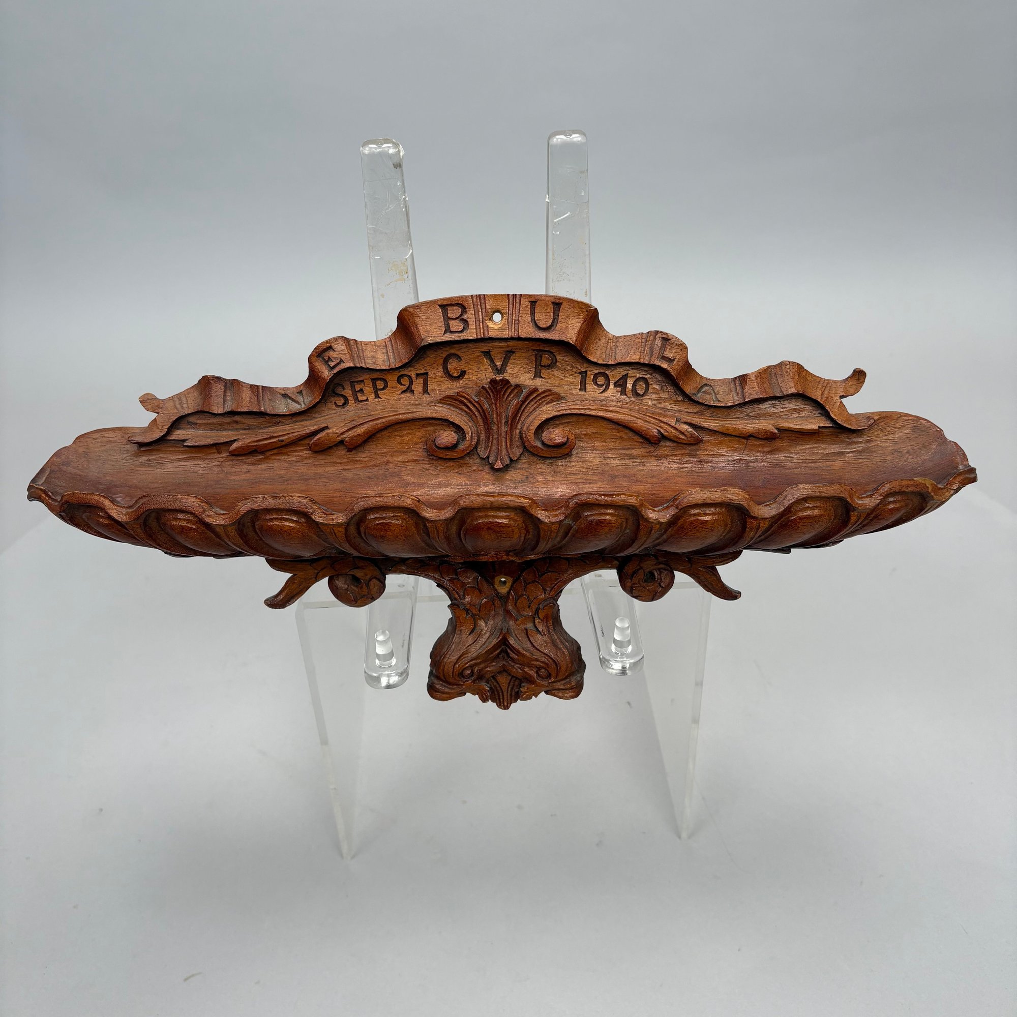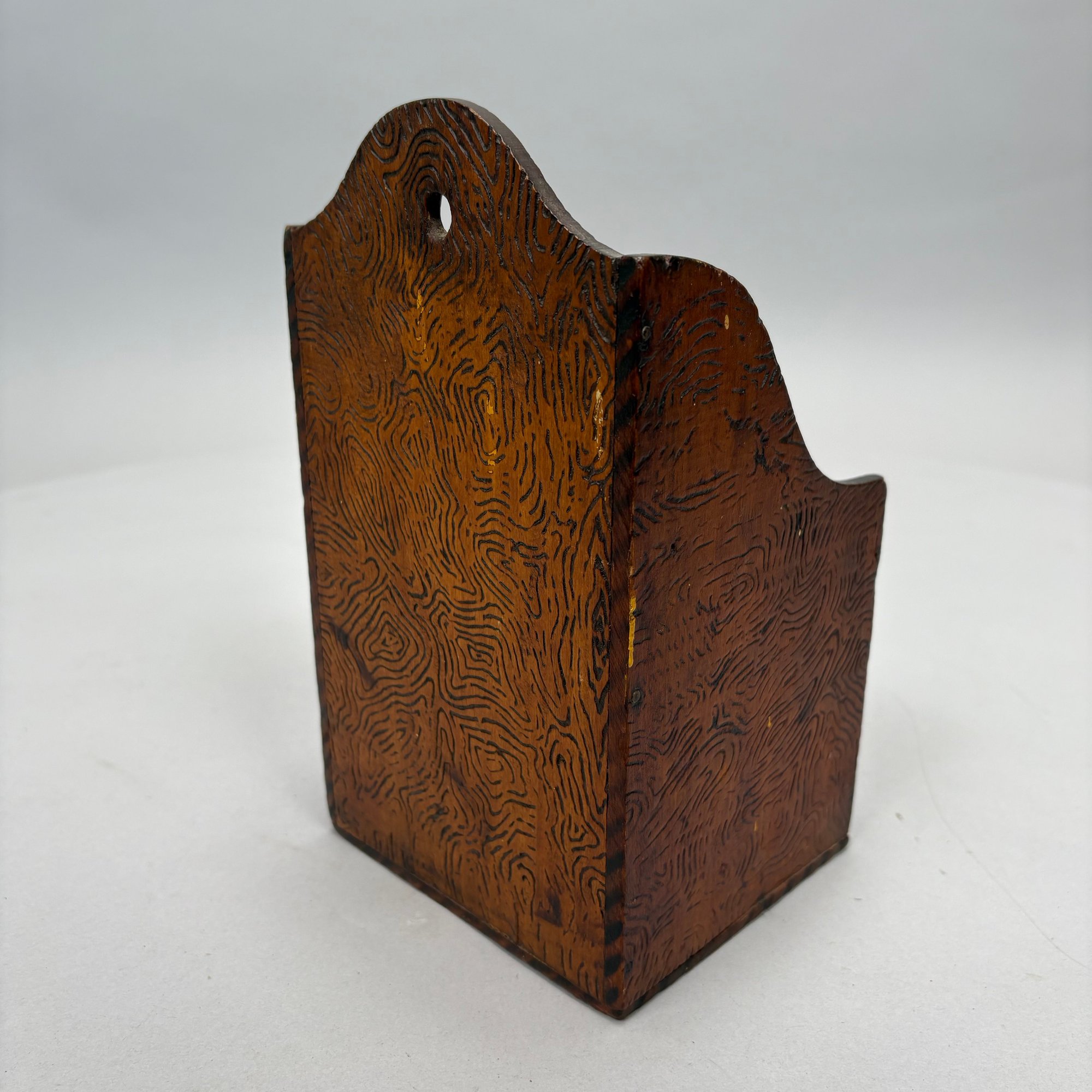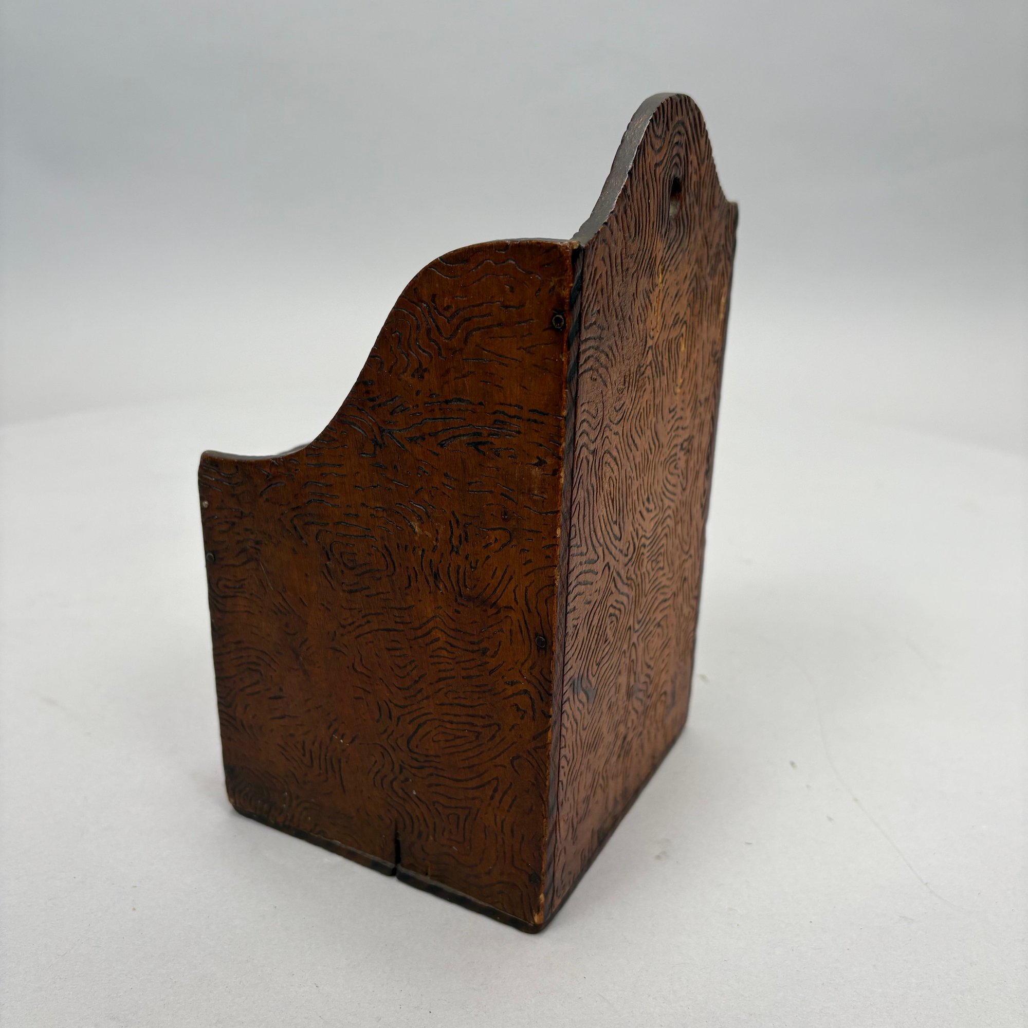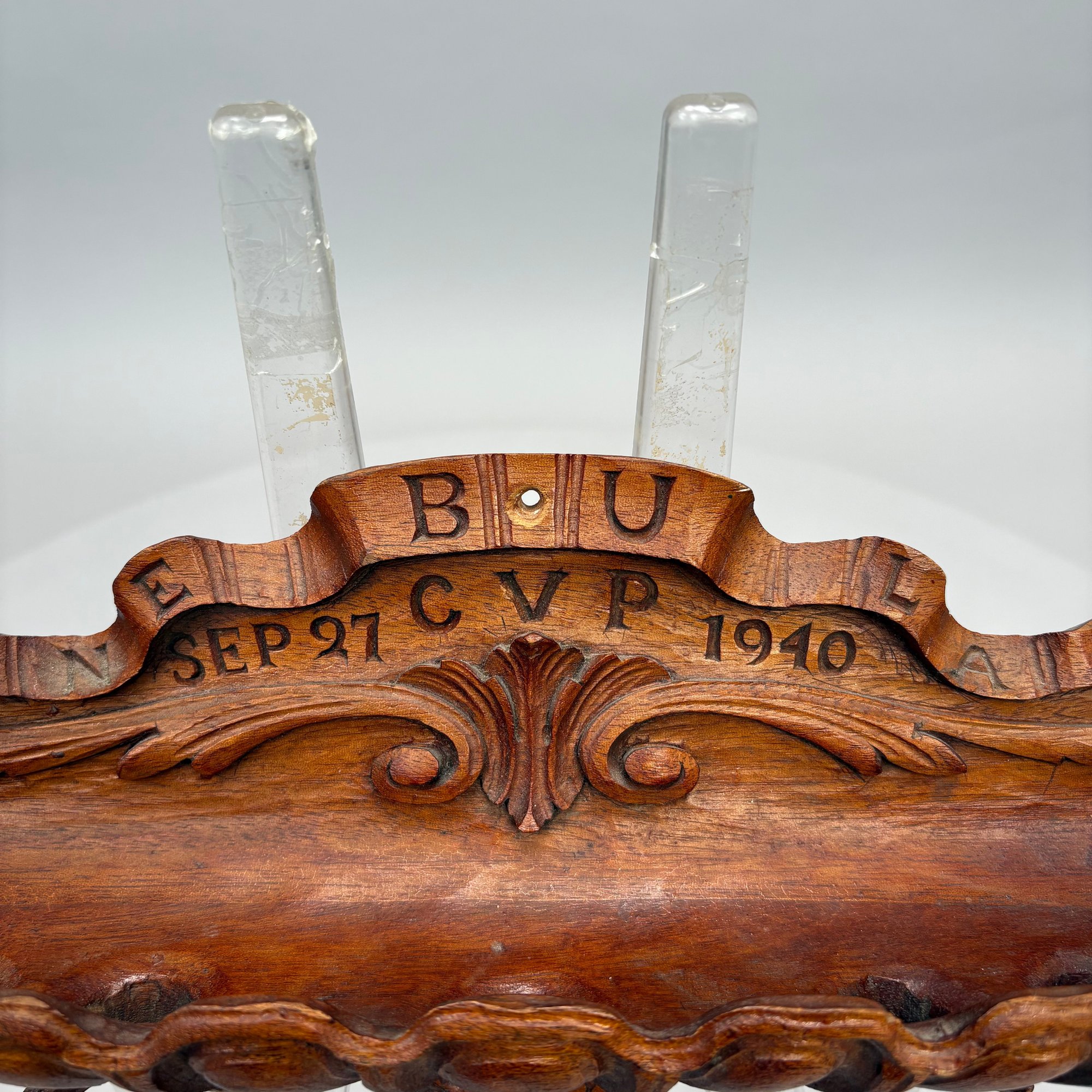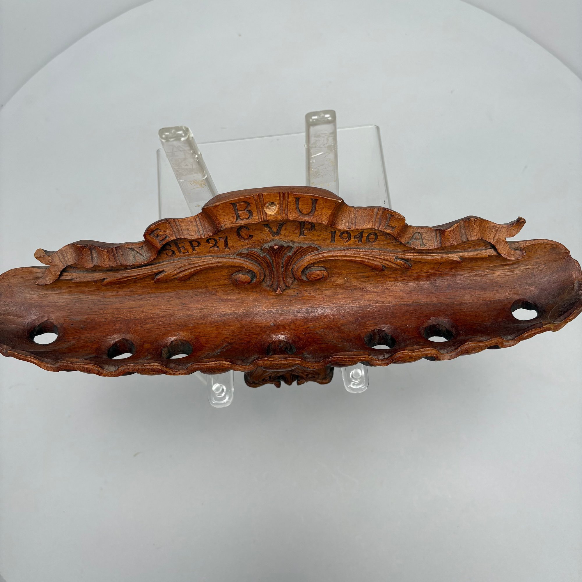 Carved Walnut Presentation Pipe Rack, 1940, Two Pipes and a Pyrography Salt Box. The pipe rack inscribed "NE BU LA/ SEP 27 CVP 1940" and carved with a pair of pendant dolphins, with two vintage pipes; the salt box decorated in a faux bois pattern and inscribed "salt" on the front.