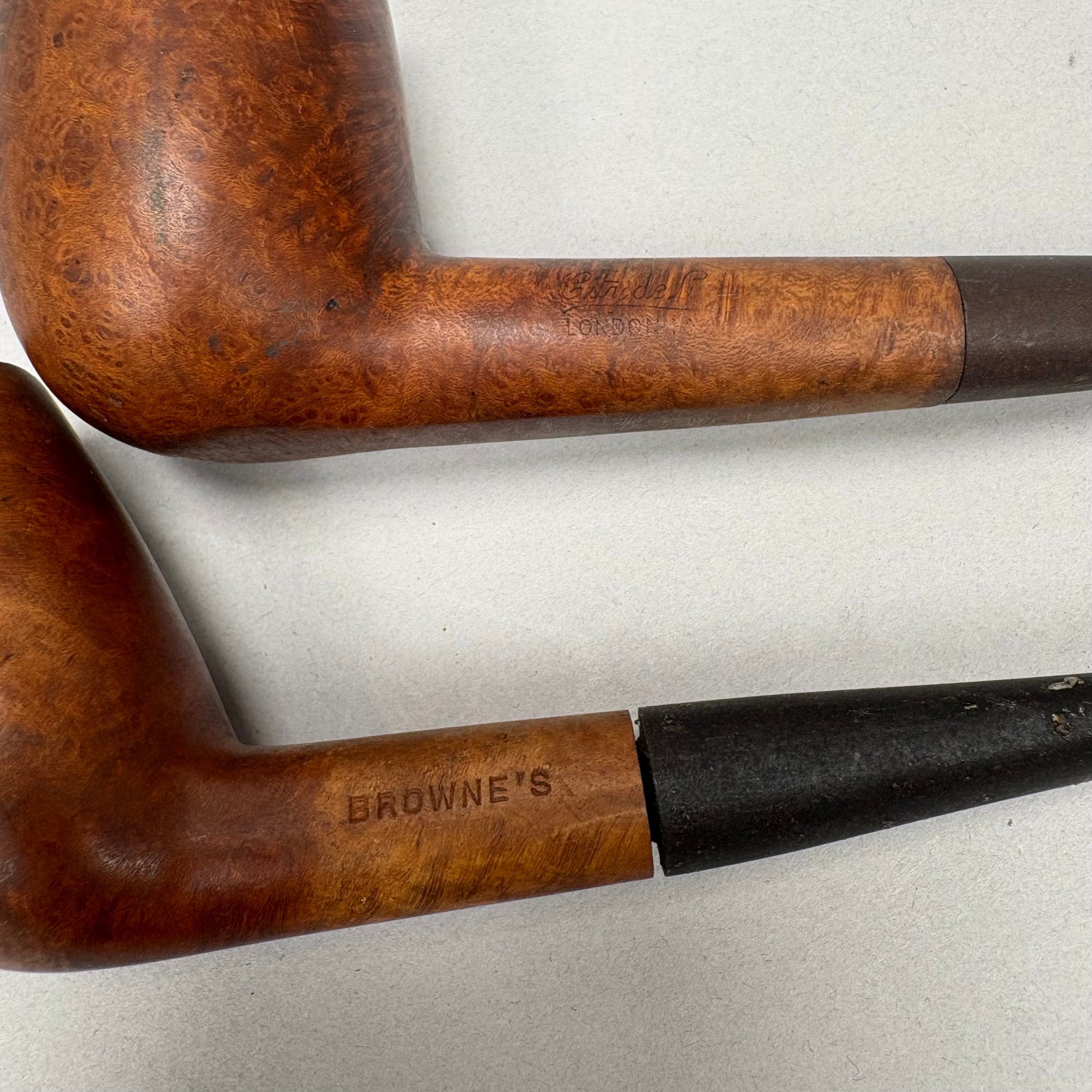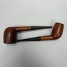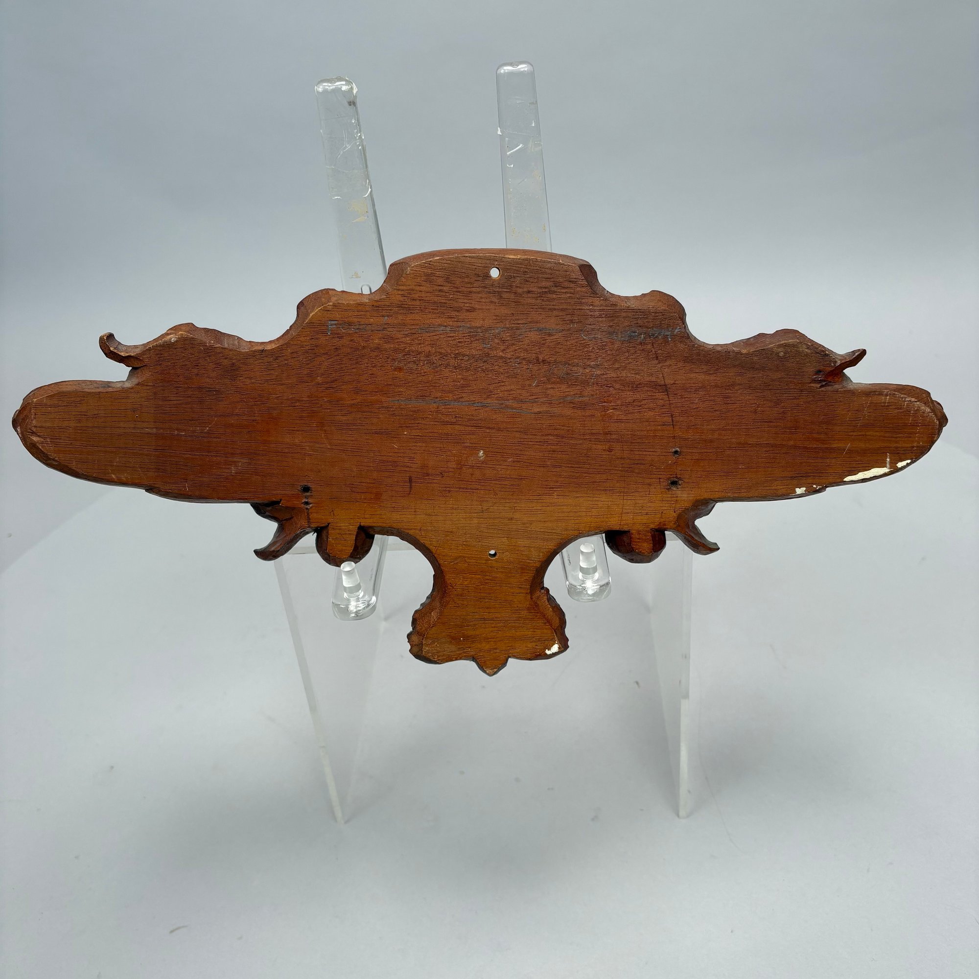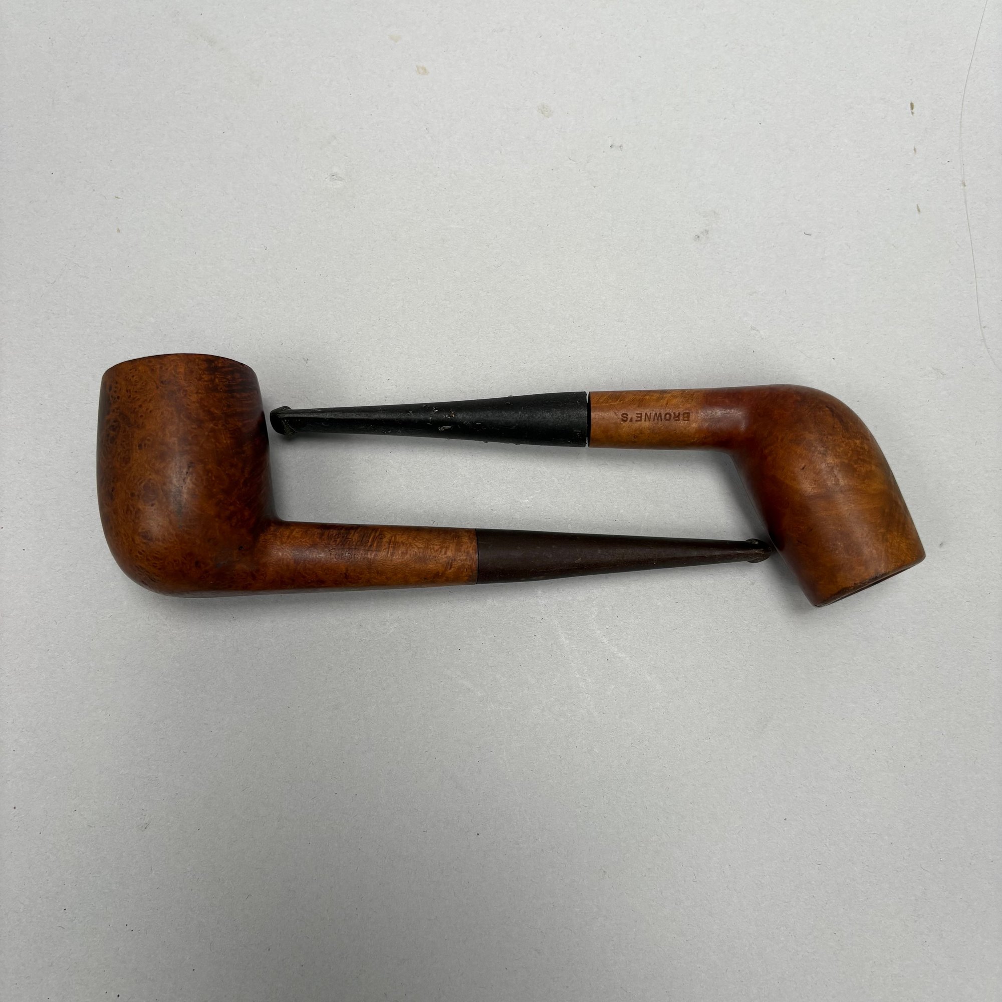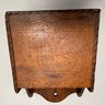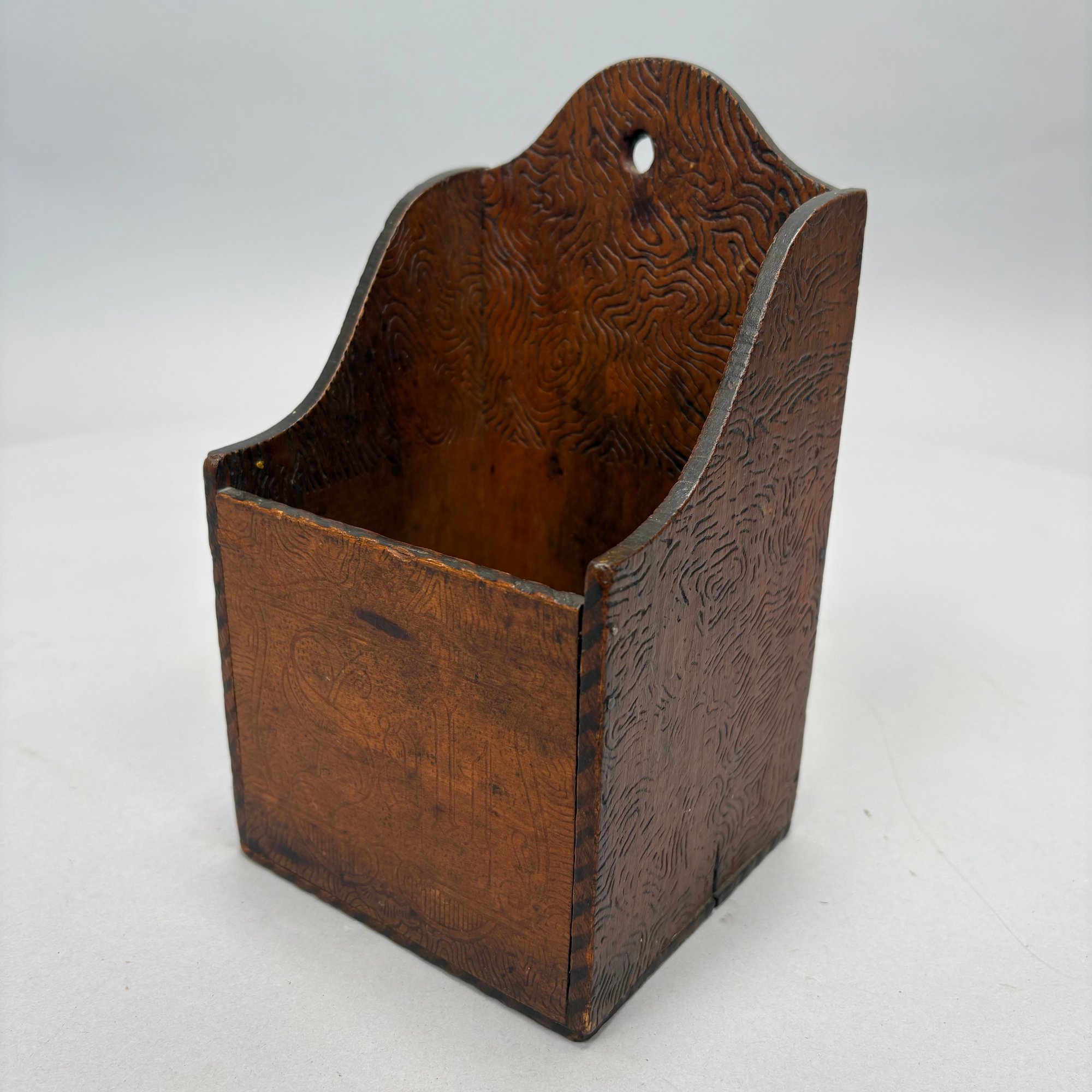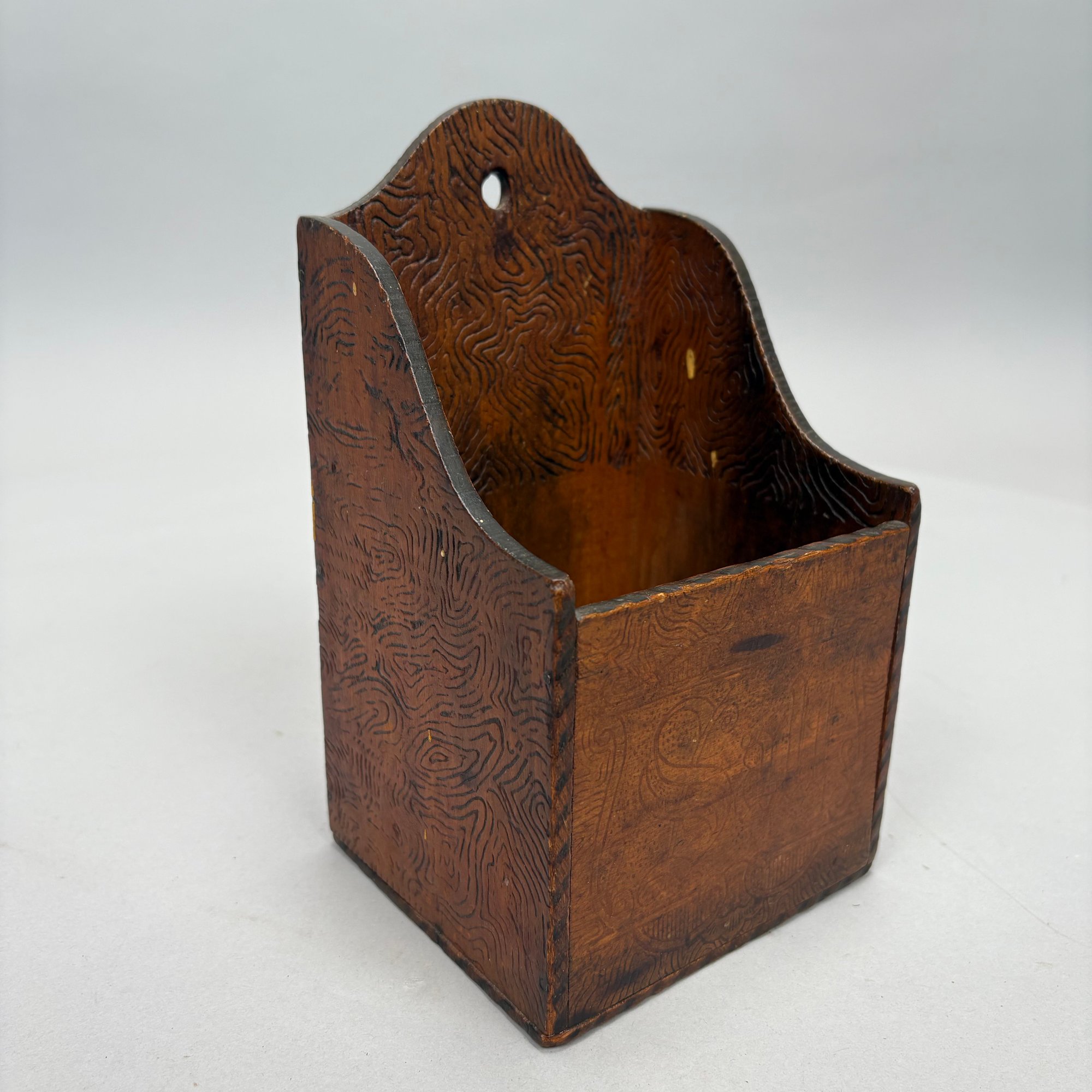 Carved Walnut Presentation Pipe Rack, 1940, Two Pipes and a Pyrography Salt Box. The pipe rack inscribed "NE BU LA/ SEP 27 CVP 1940" and carved with a pair of pendant dolphins, with two vintage pipes; the salt box decorated in a faux bois pattern and inscribed "salt" on the front.