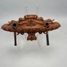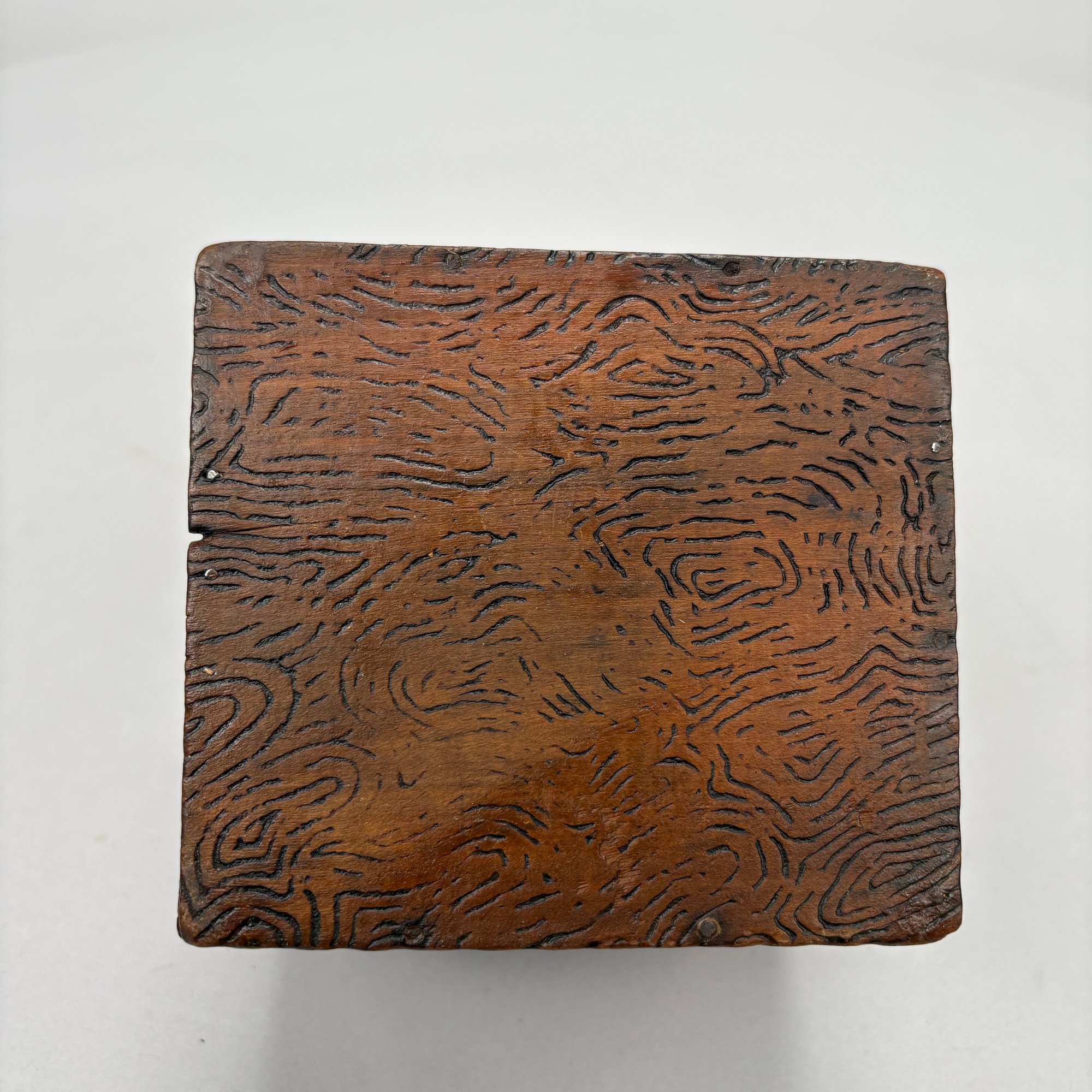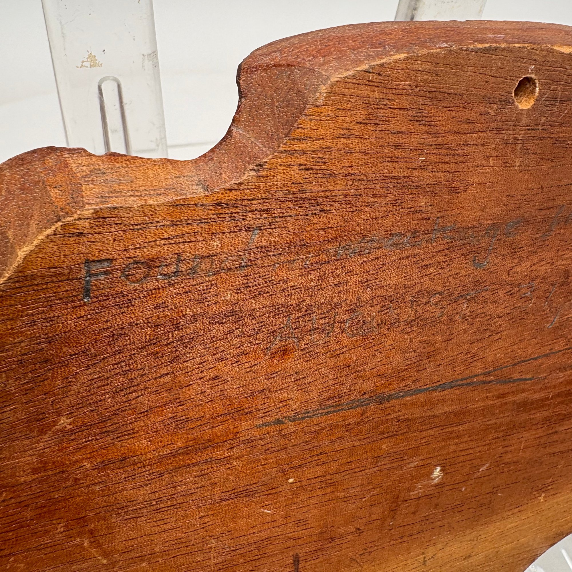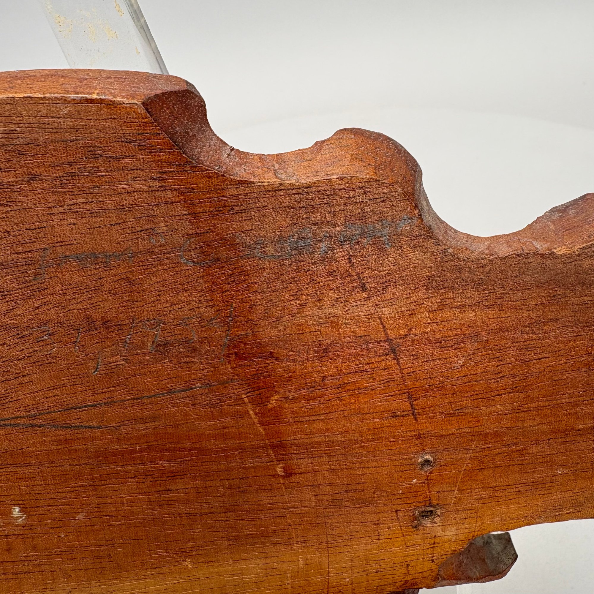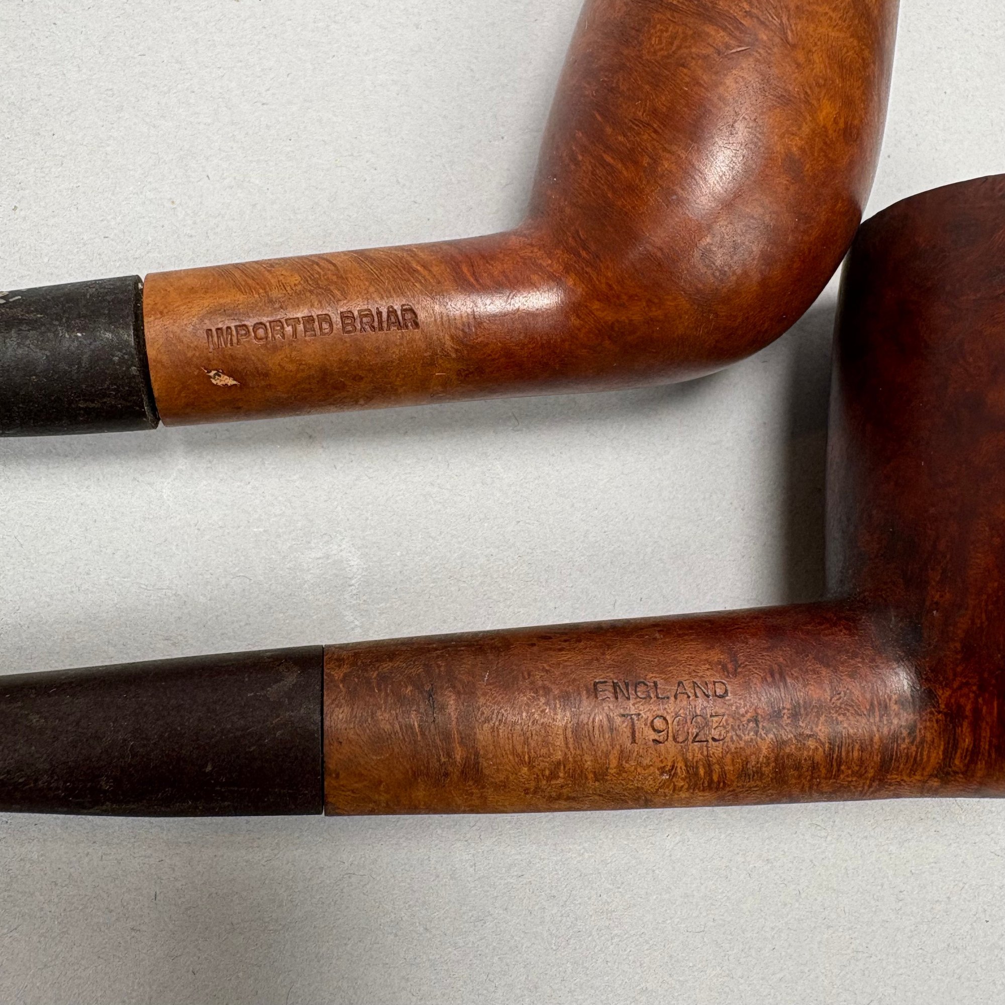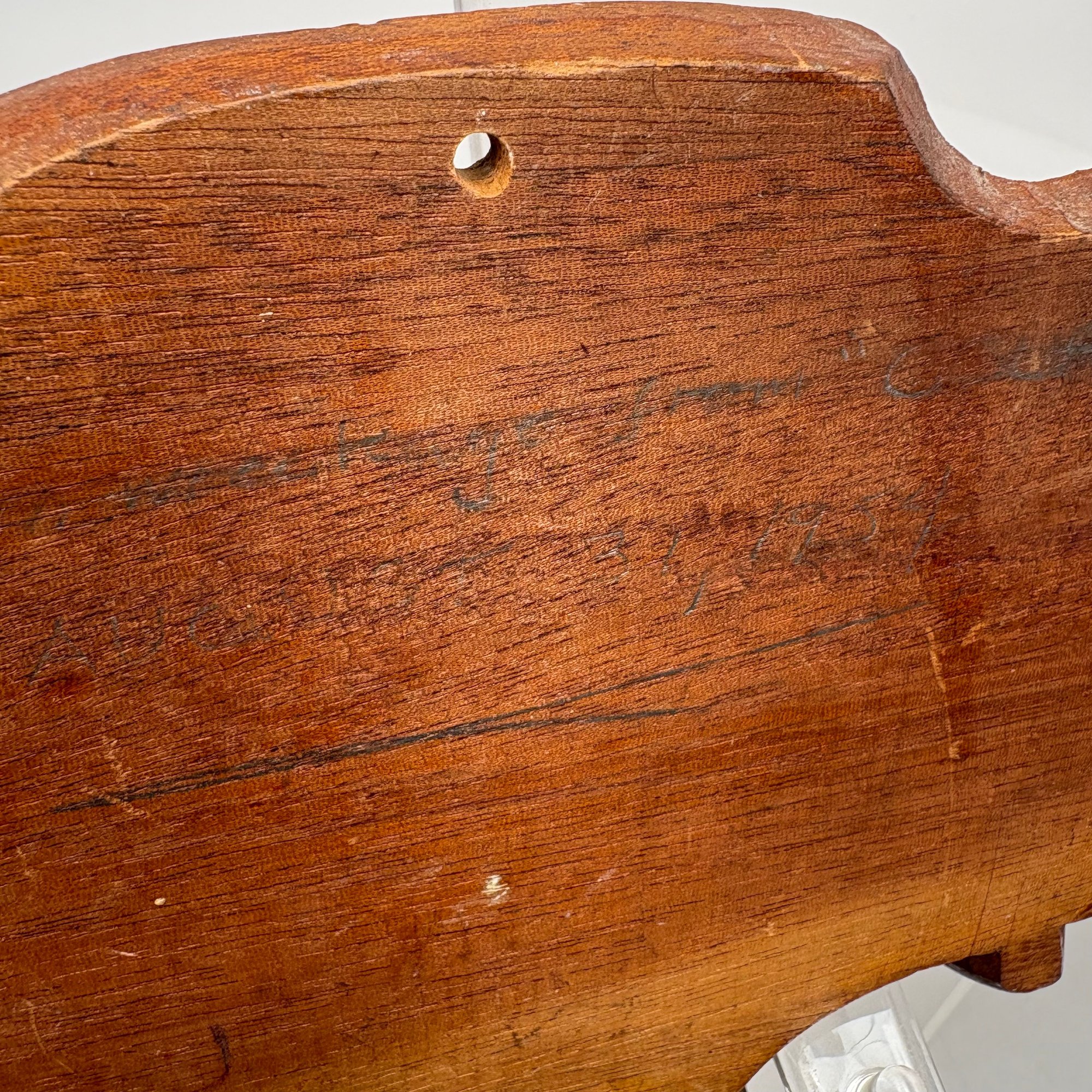 Carved Walnut Presentation Pipe Rack, 1940, Two Pipes and a Pyrography Salt Box. The pipe rack inscribed "NE BU LA/ SEP 27 CVP 1940" and carved with a pair of pendant dolphins, with two vintage pipes; the salt box decorated in a faux bois pattern and inscribed "salt" on the front.