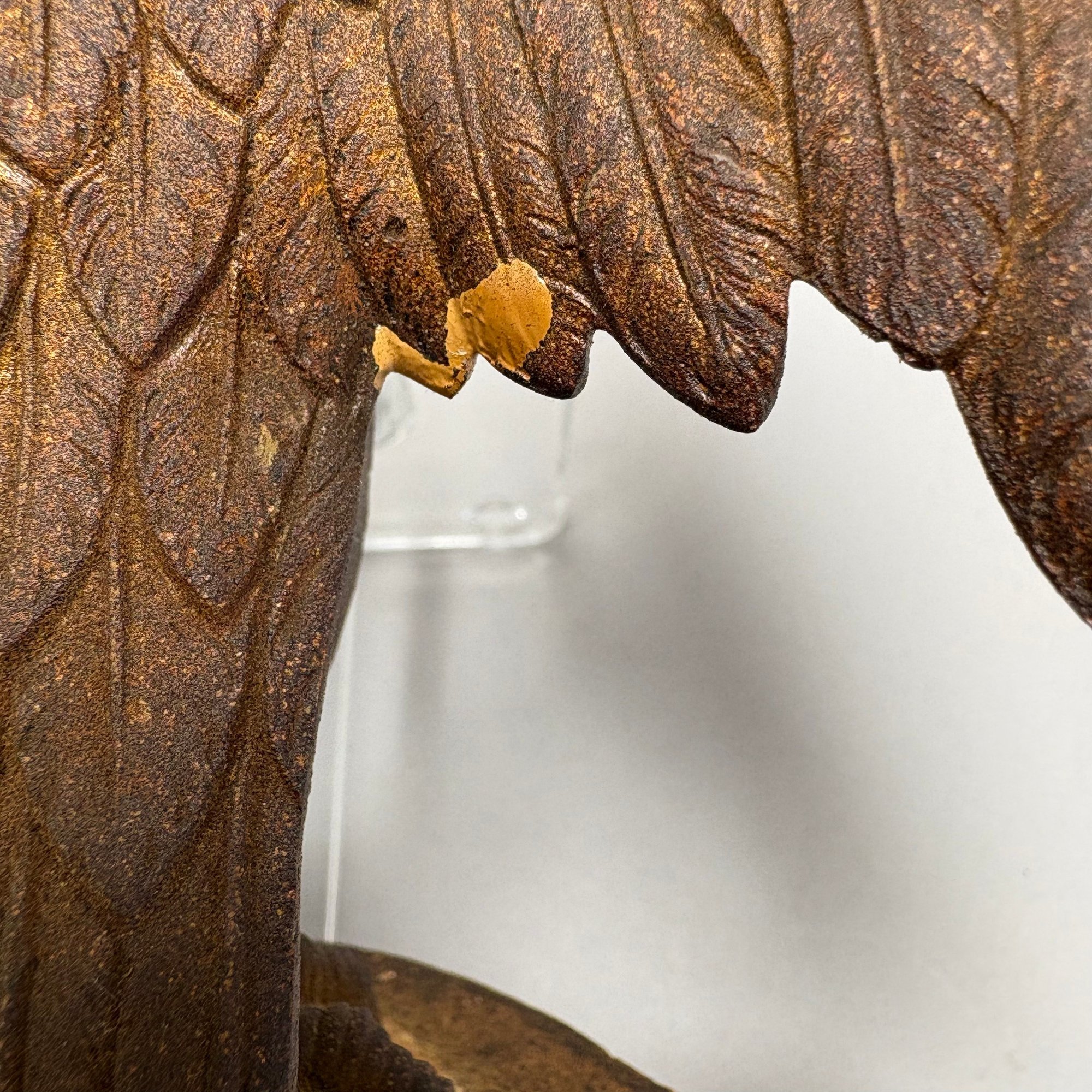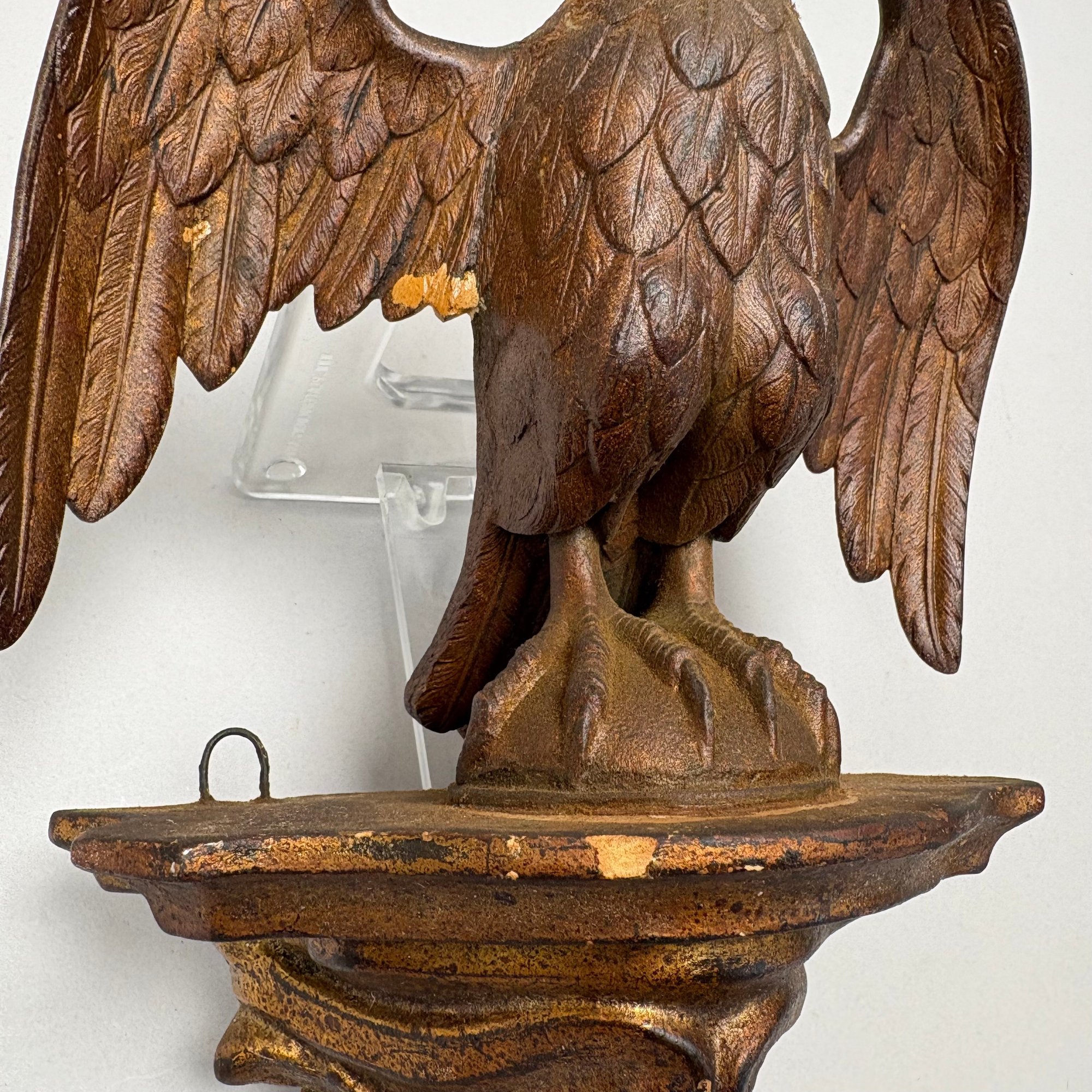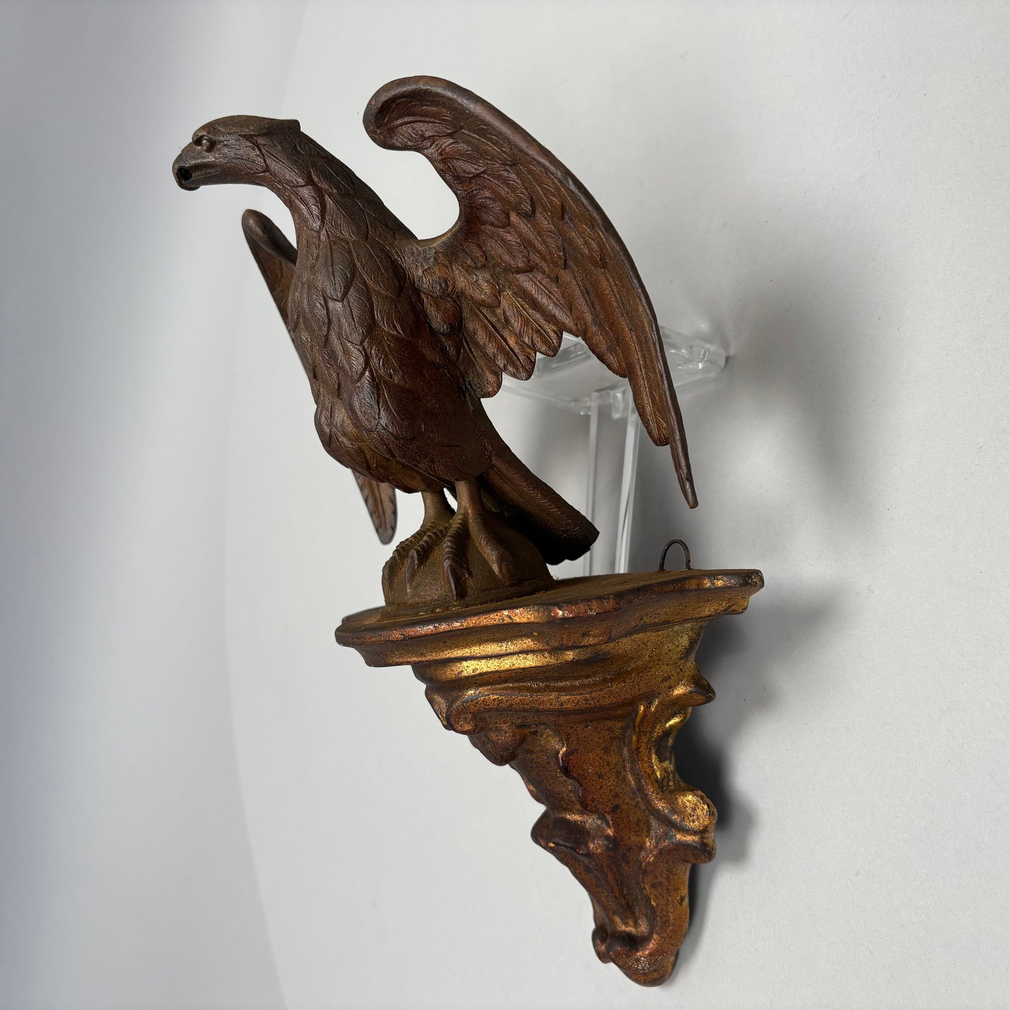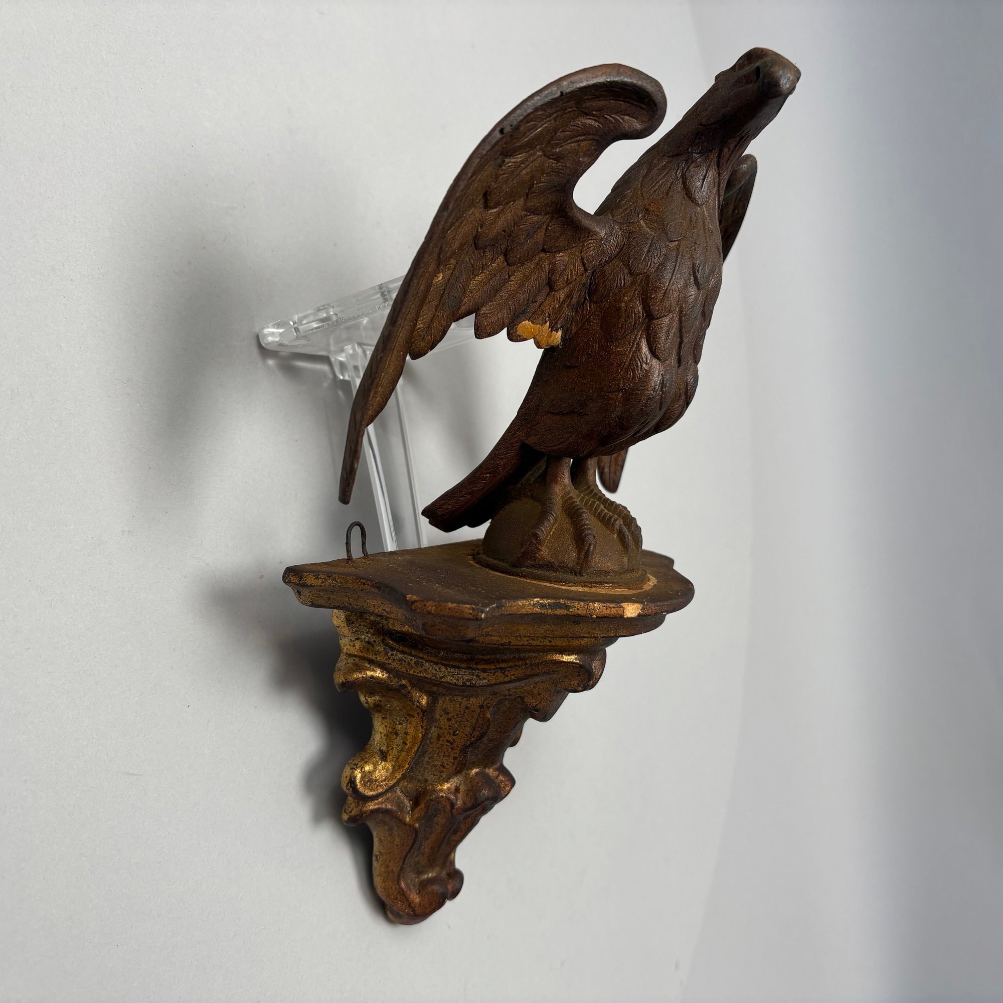 Cast Patinated-Metal and Gilt-Plaster Figure of a Displayed Eagle, Perched Atop a Bracket Shelf.
