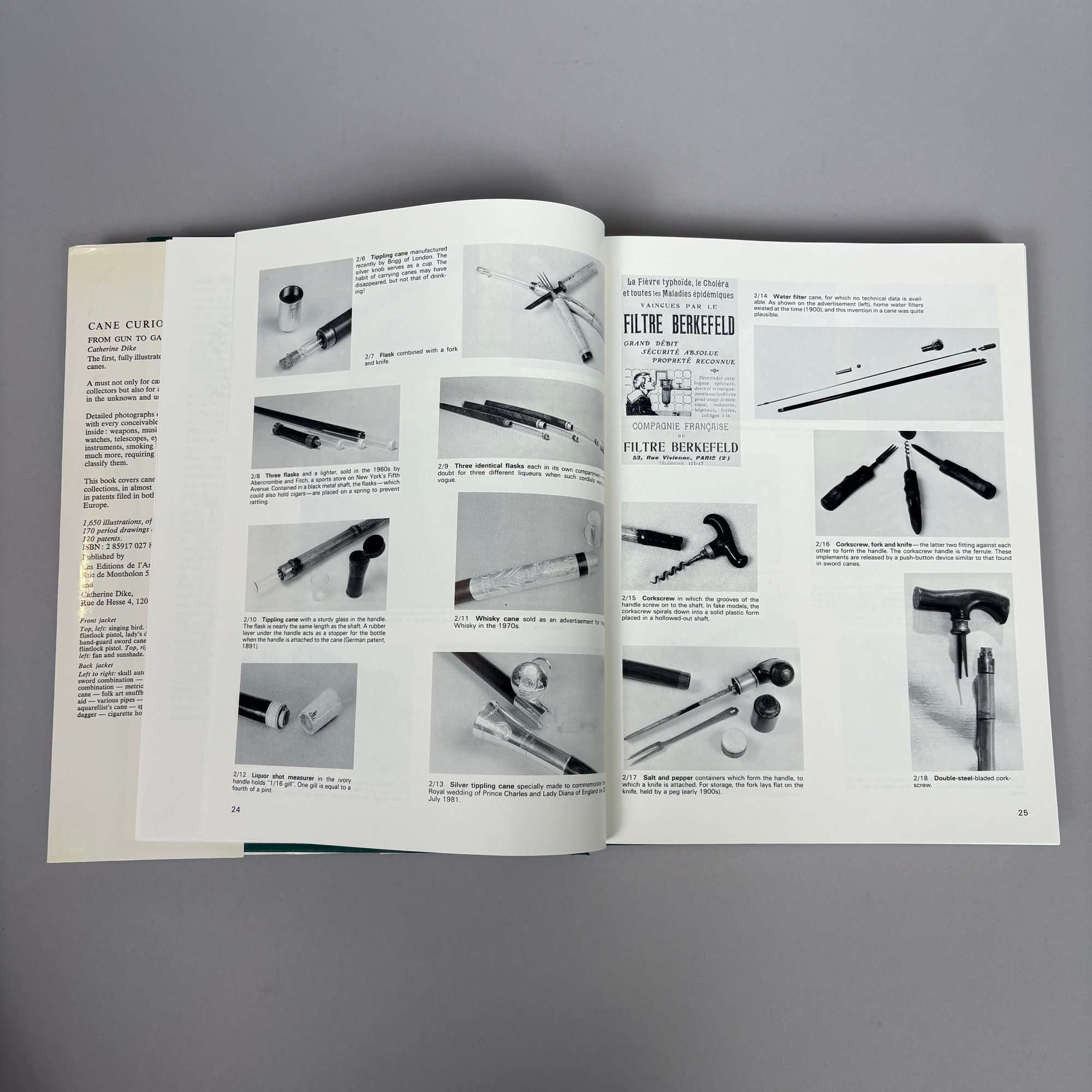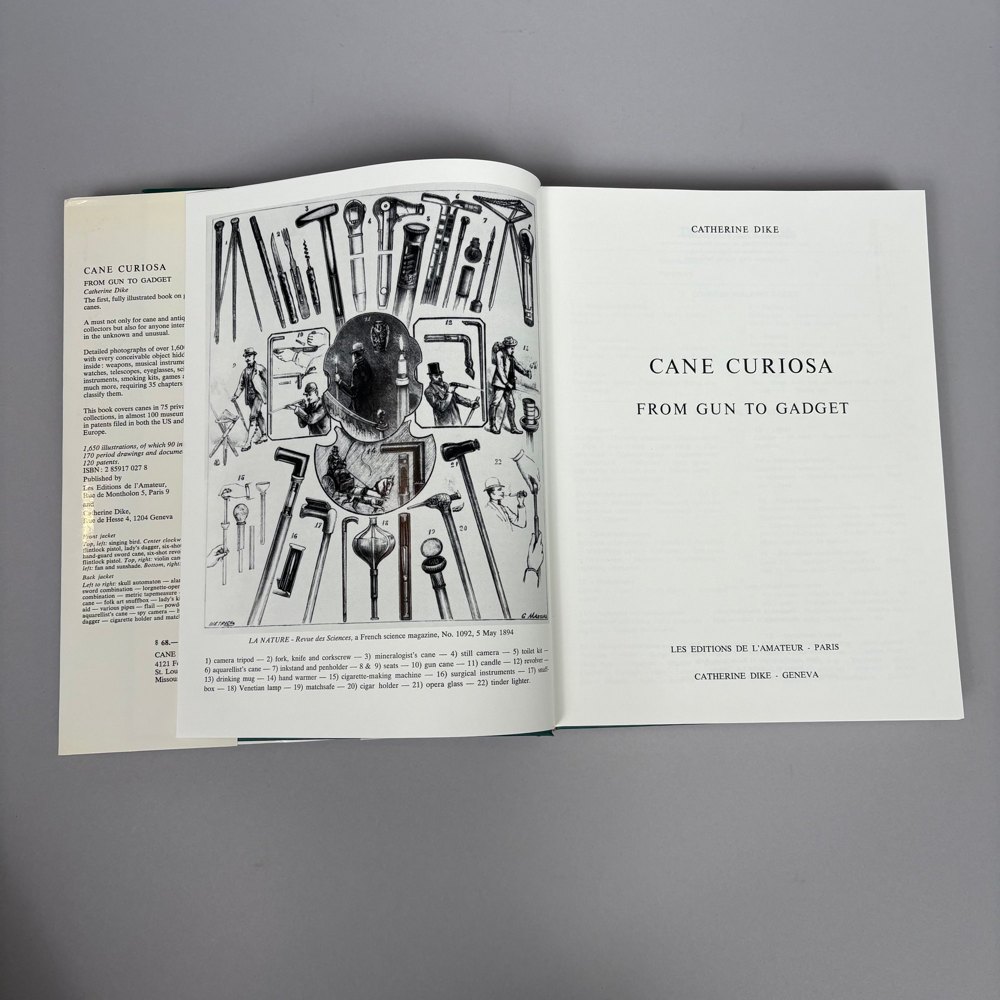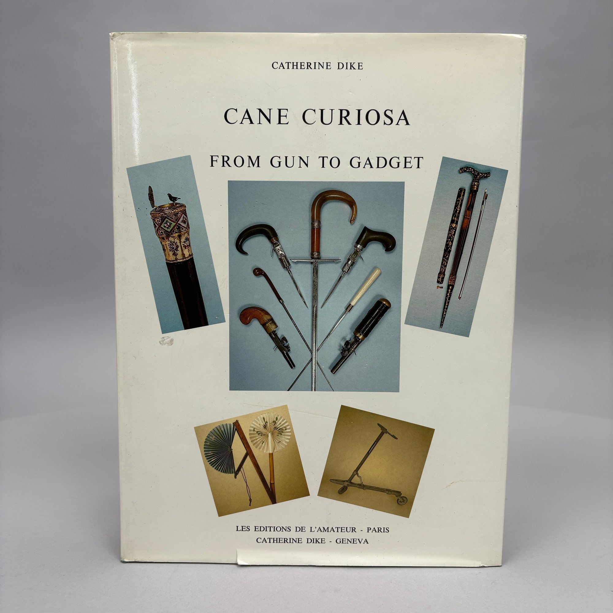 Catherine Dike. "Cane Curiosa: From Gun to Gadget." Paris: Les Editions de L'Amateur, 1983. Illustrated in color and black and white with canes as works of art, cosmetics boxes, match safes, timepieces, butterfly nets, telescopes, surveying instruments, narcotics dispensers, tool sets, weapons and others.