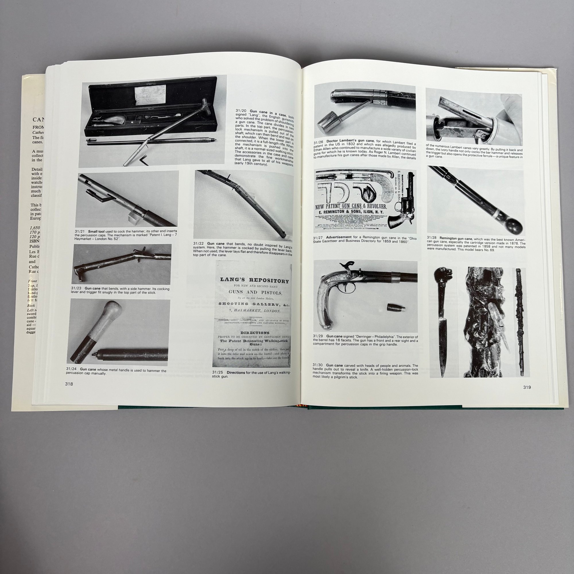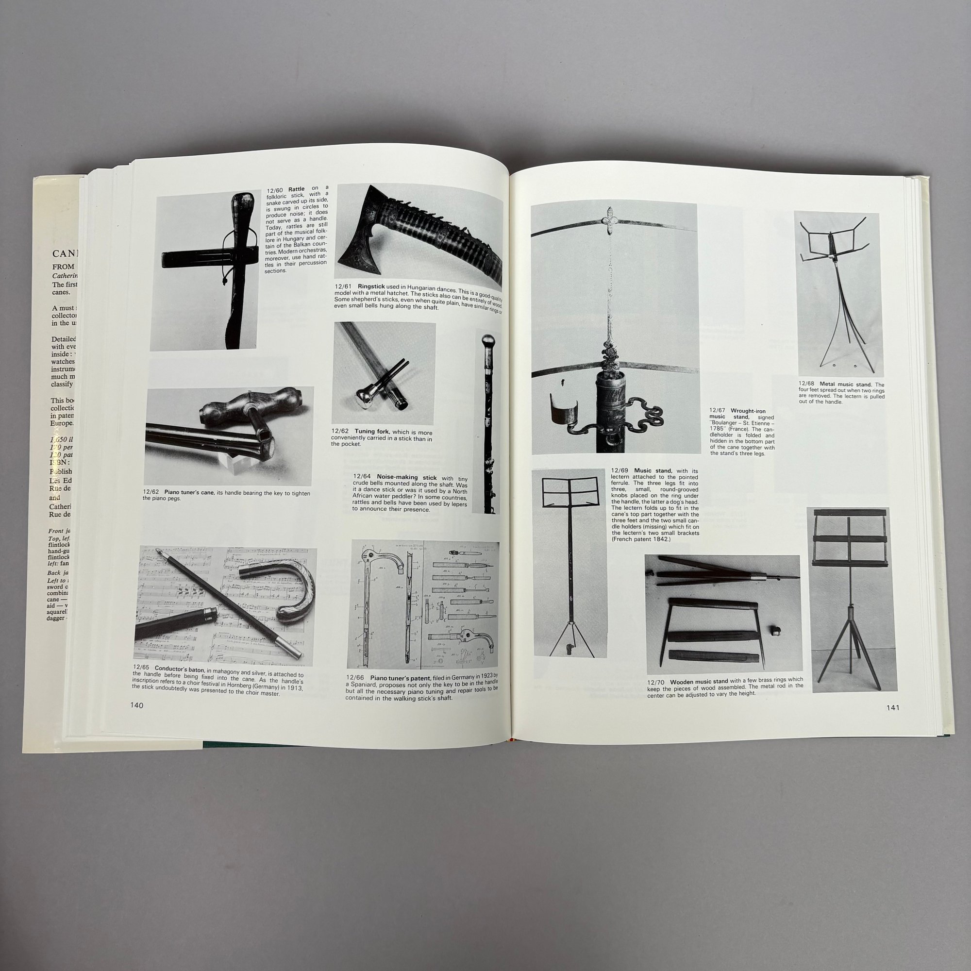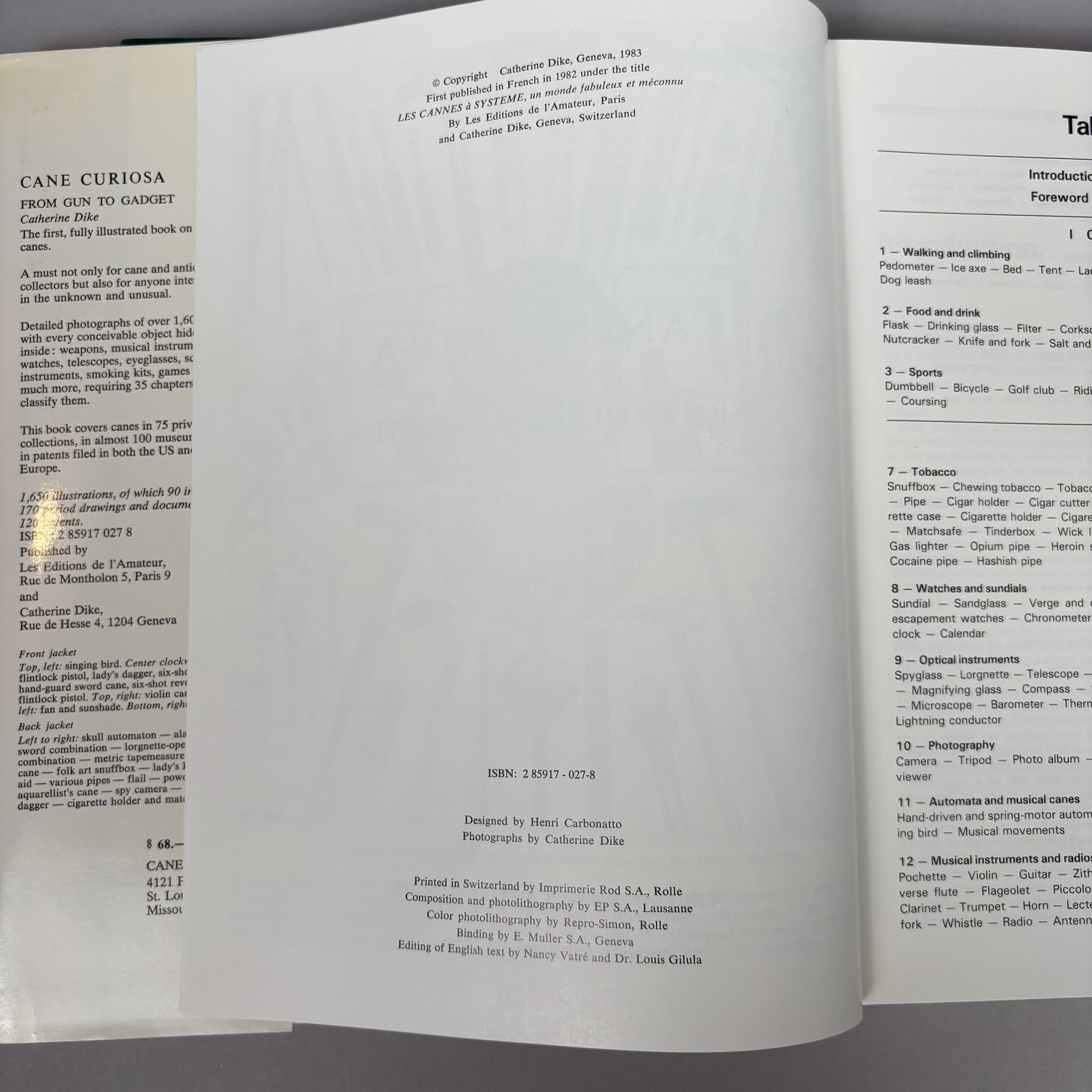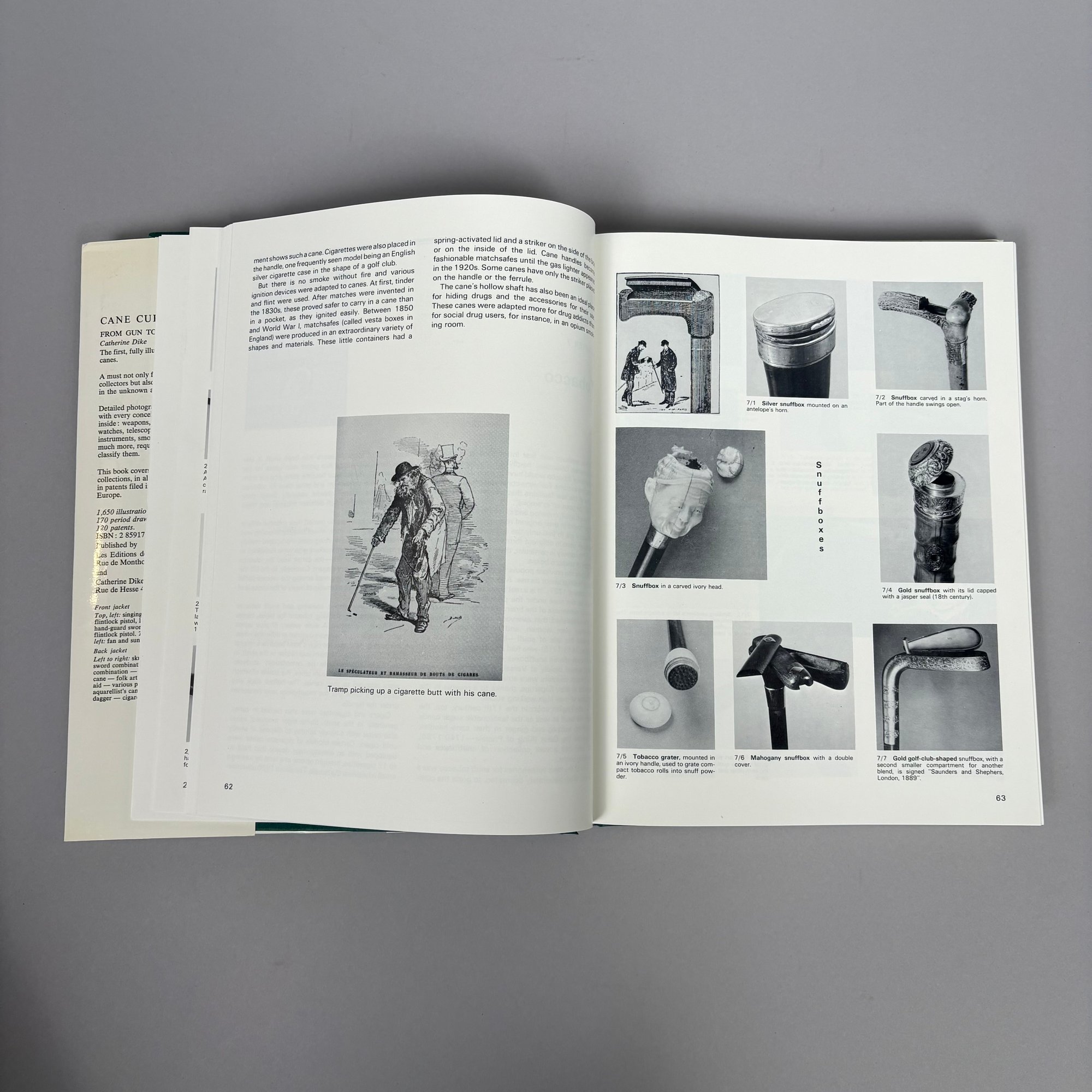 Catherine Dike. "Cane Curiosa: From Gun to Gadget." Paris: Les Editions de L'Amateur, 1983. Illustrated in color and black and white with canes as works of art, cosmetics boxes, match safes, timepieces, butterfly nets, telescopes, surveying instruments, narcotics dispensers, tool sets, weapons and others.
