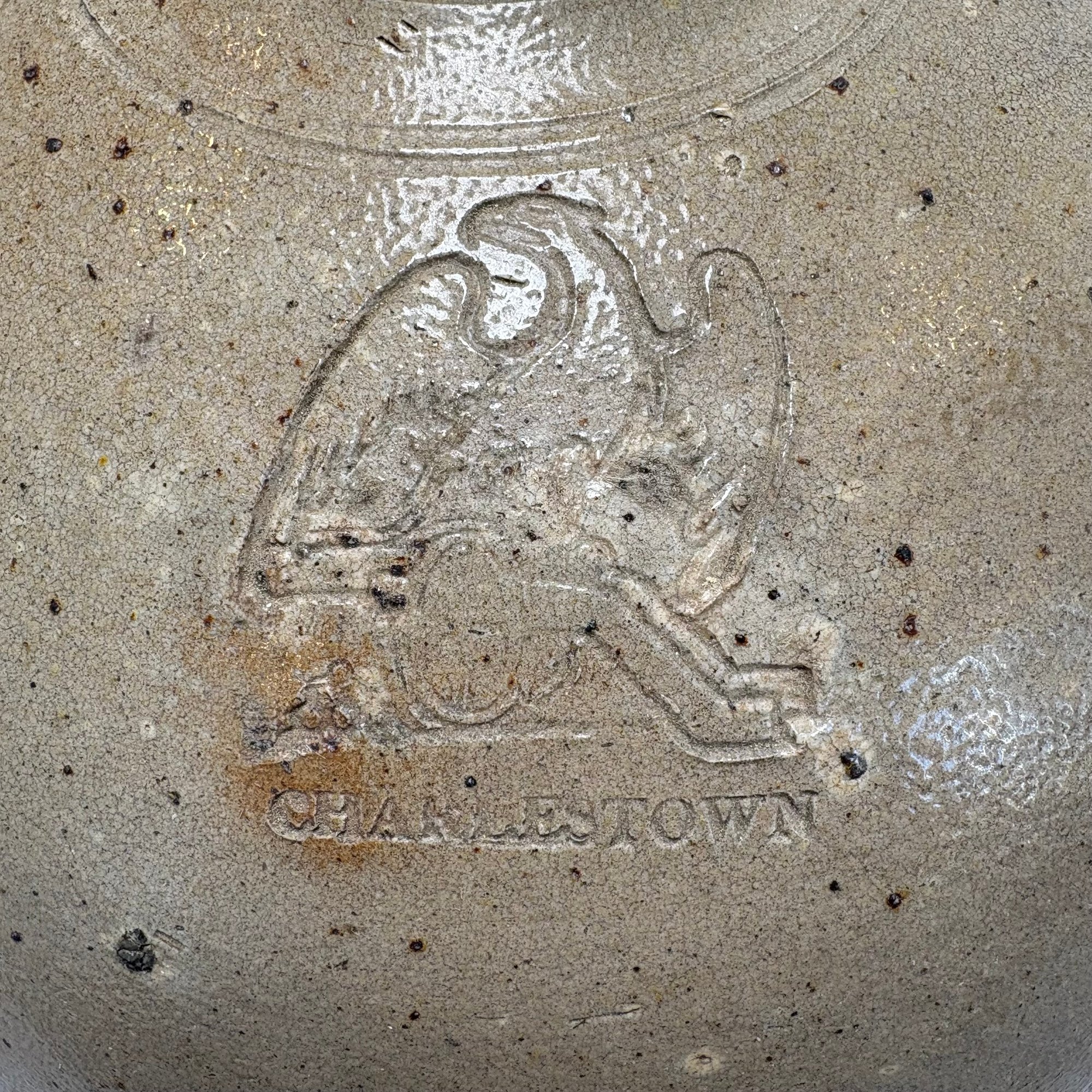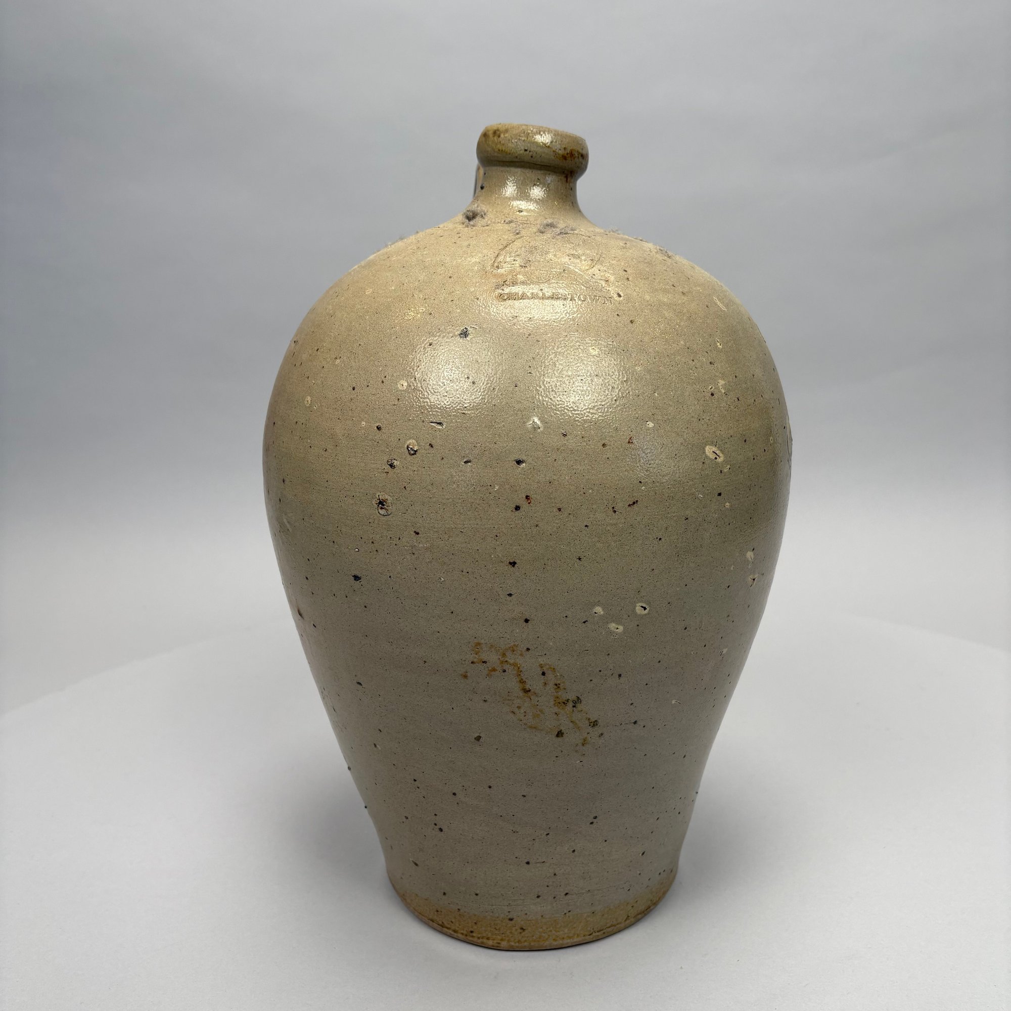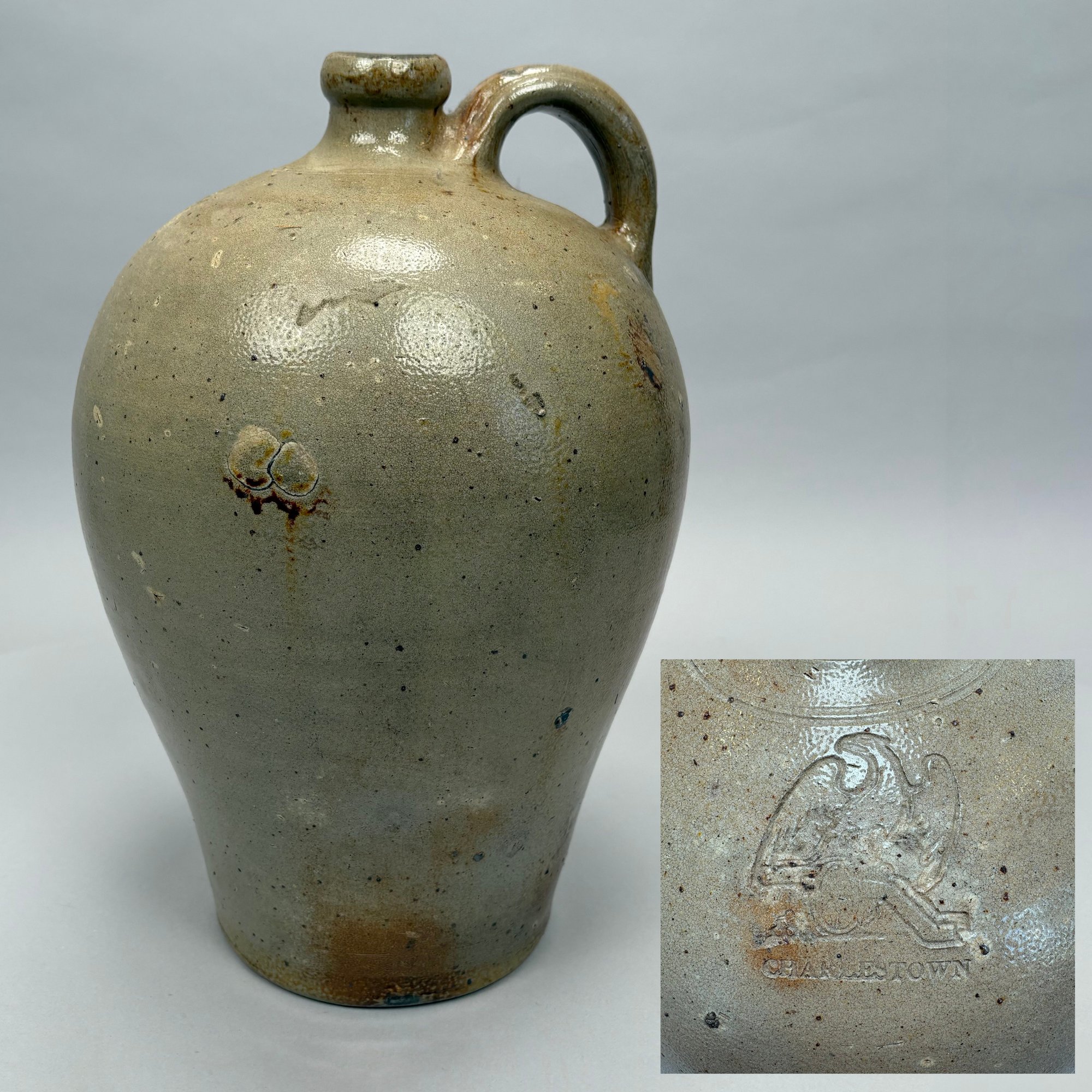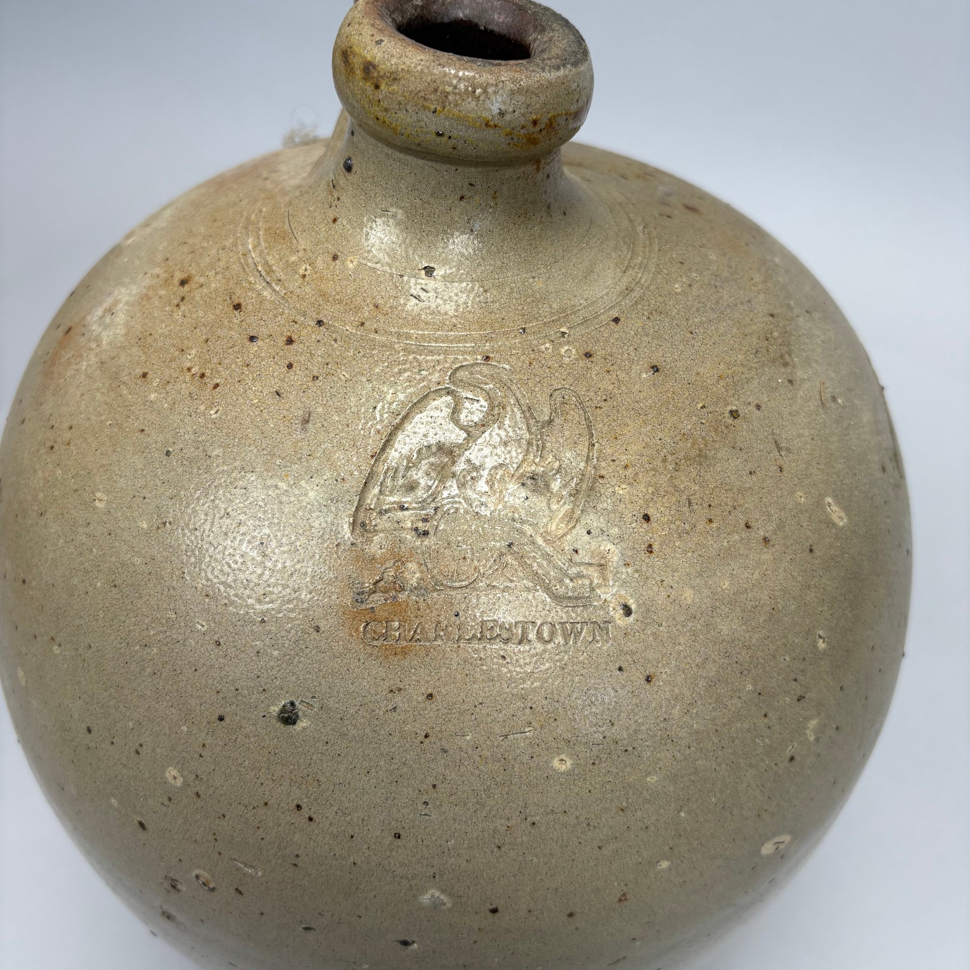 Charlestown, Massachusetts Saltglaze Stoneware Iron-Decorated Jug, Attributed to Frederick Carpenter, Charlestown, Massachusetts, 1812-1827. Of ovoid shape, impressed with an eagle perched atop a cannon above "CHARLESTOWN."