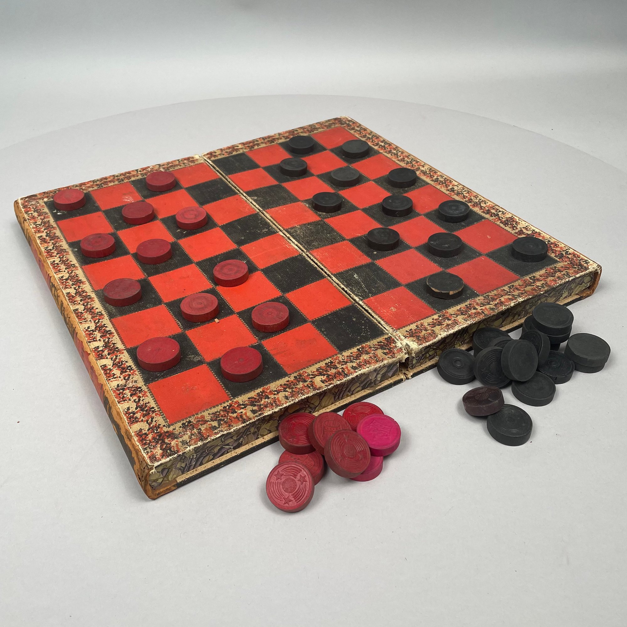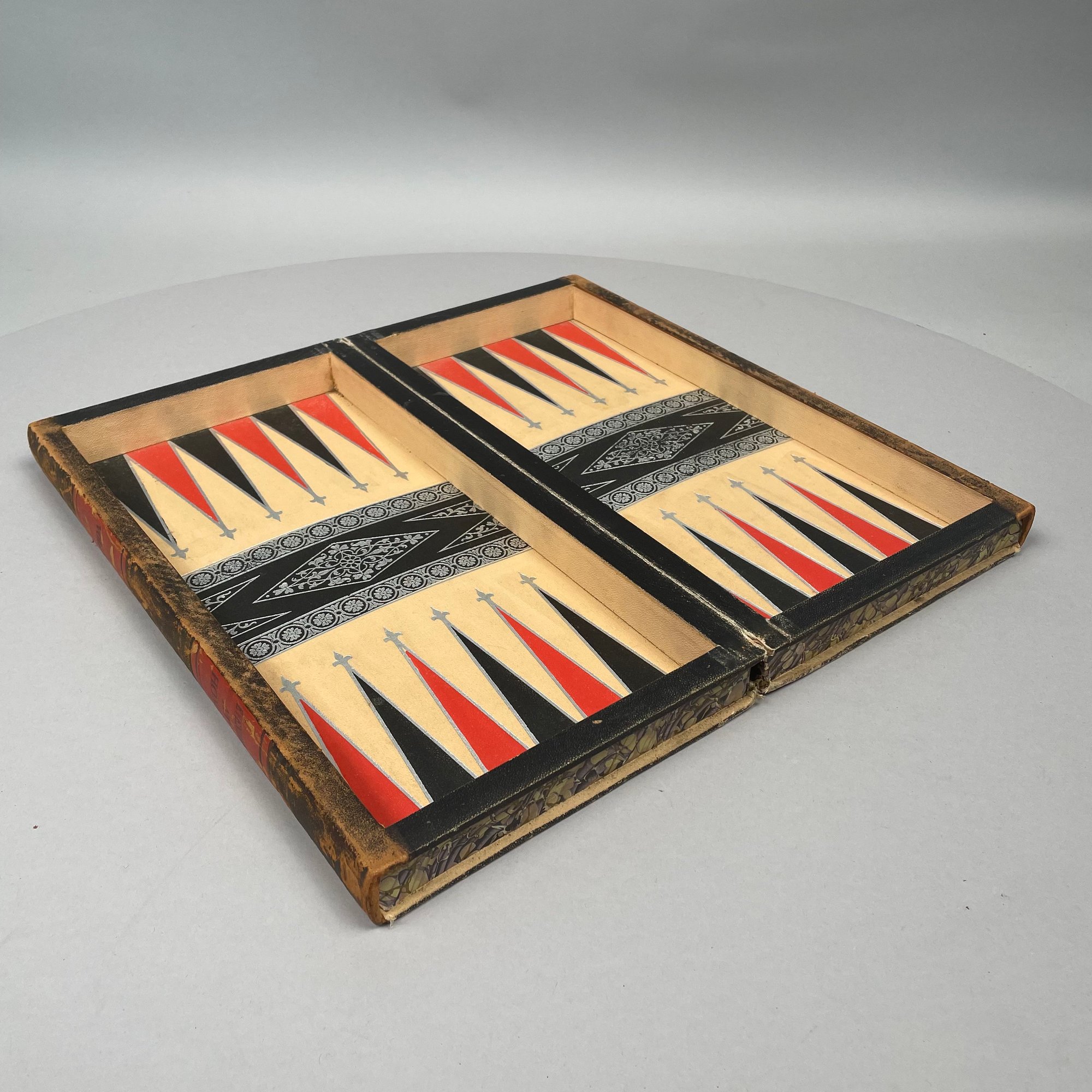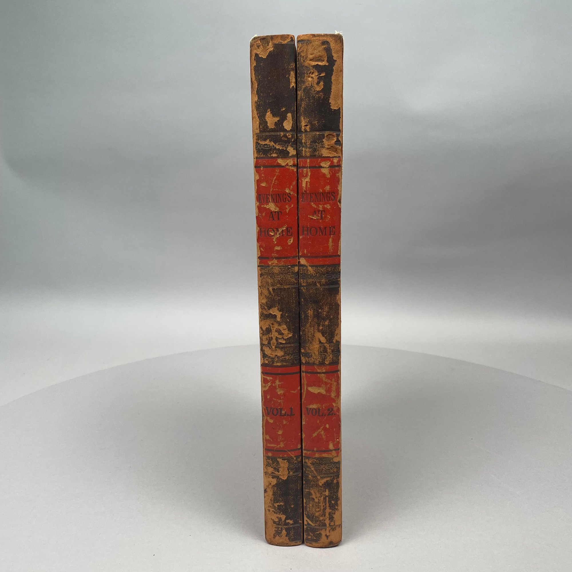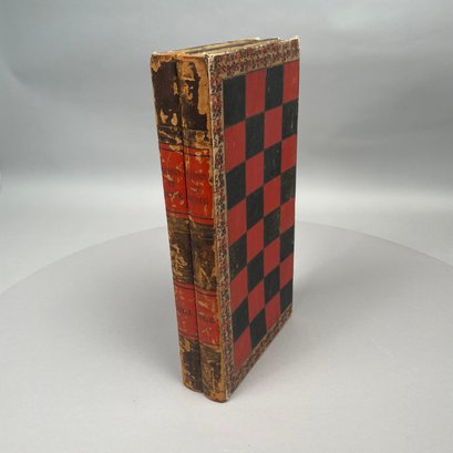 Chess and Backgammon Board in the Form of a Two Volume Folio. Twenty-nine black checkers and twenty-one red checkers, the spines of the books titled "EVENINGS AT HOME," "VOL. 1" and "VOL. 2."