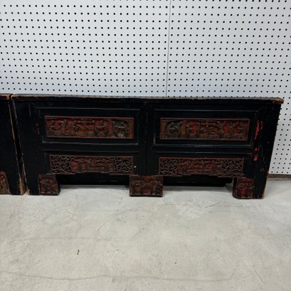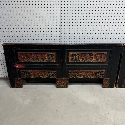 Chinese Carved, Painted and Gilt Wood Bed. Carved with figural panels, painted in red, black and gold.