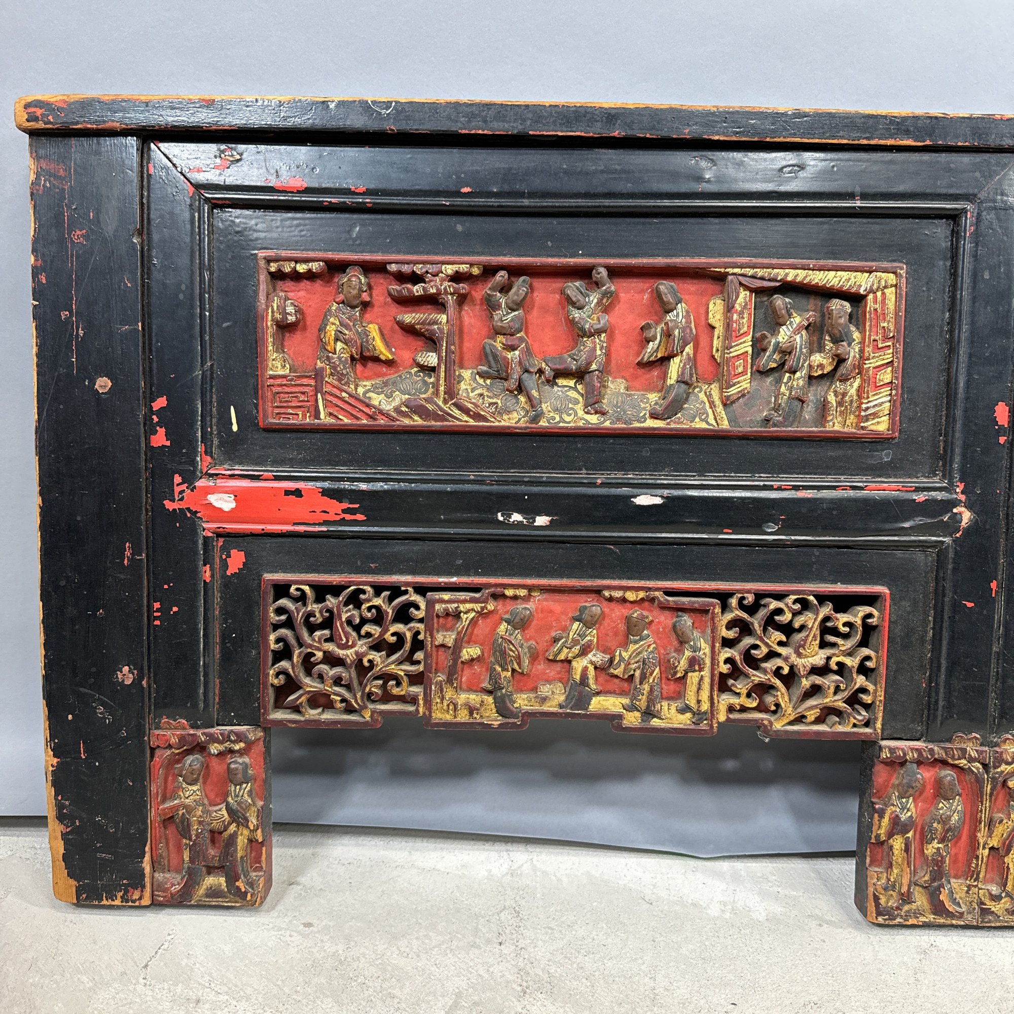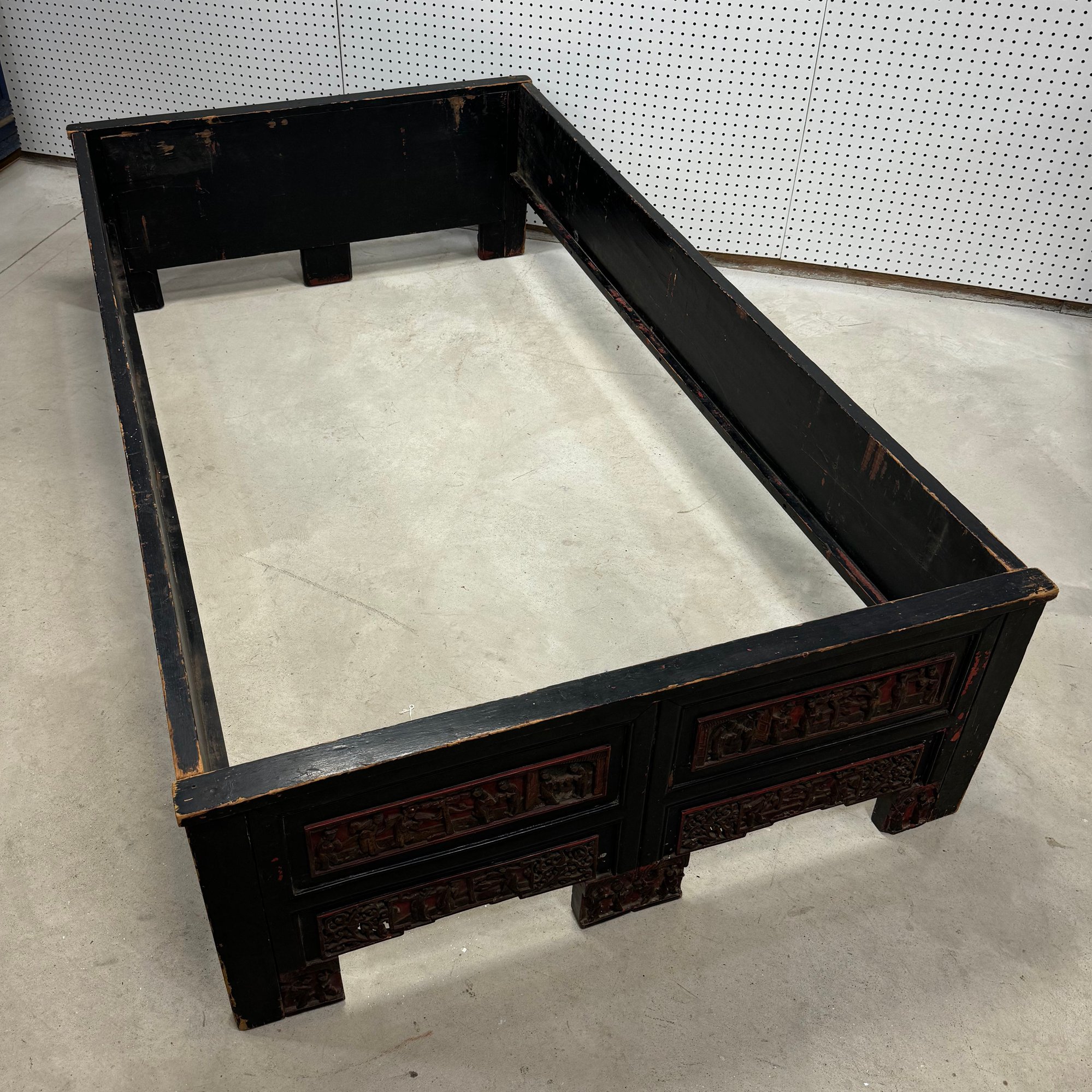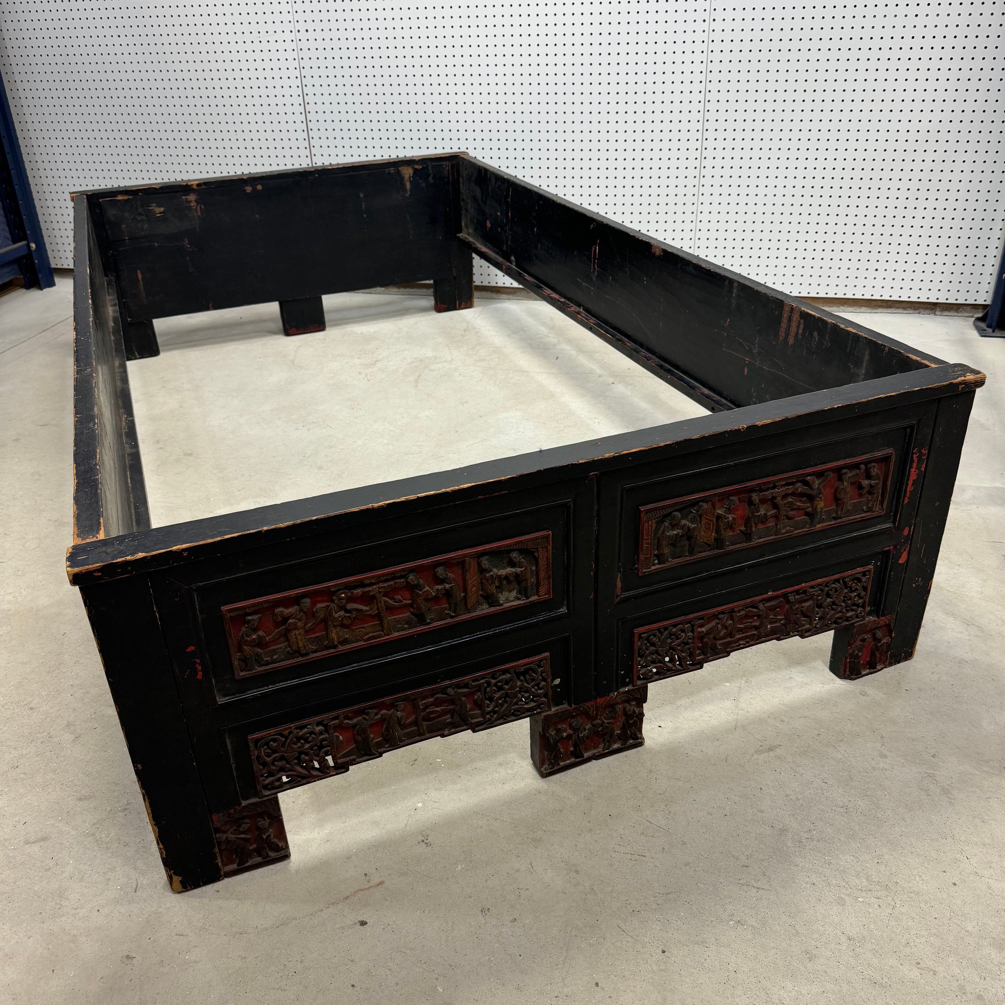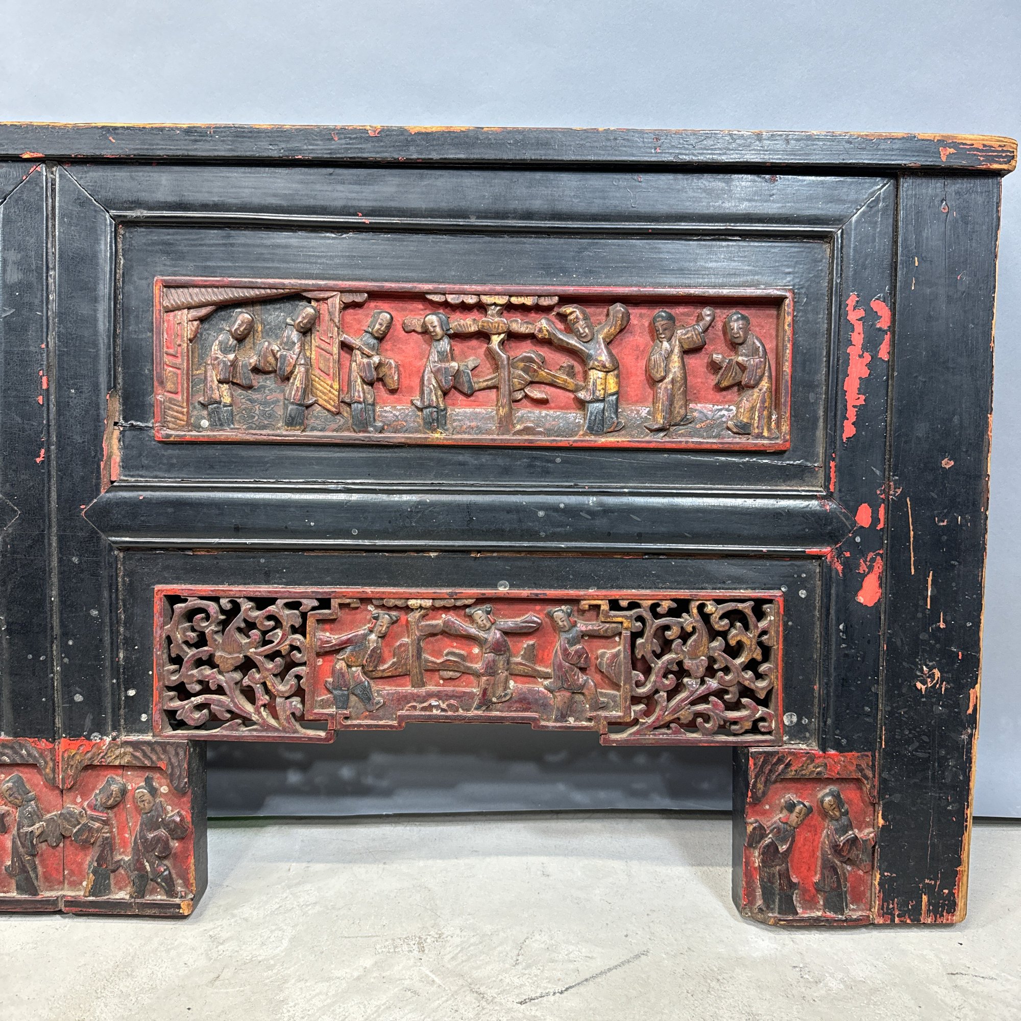 Chinese Carved, Painted and Gilt Wood Bed. Carved with figural panels, painted in red, black and gold.