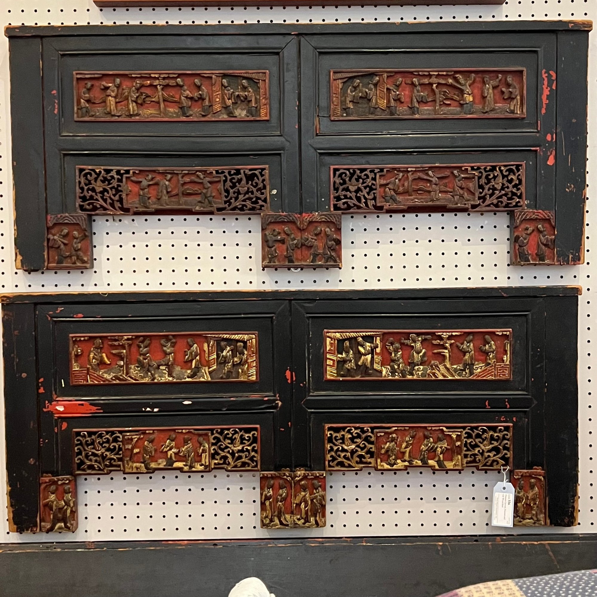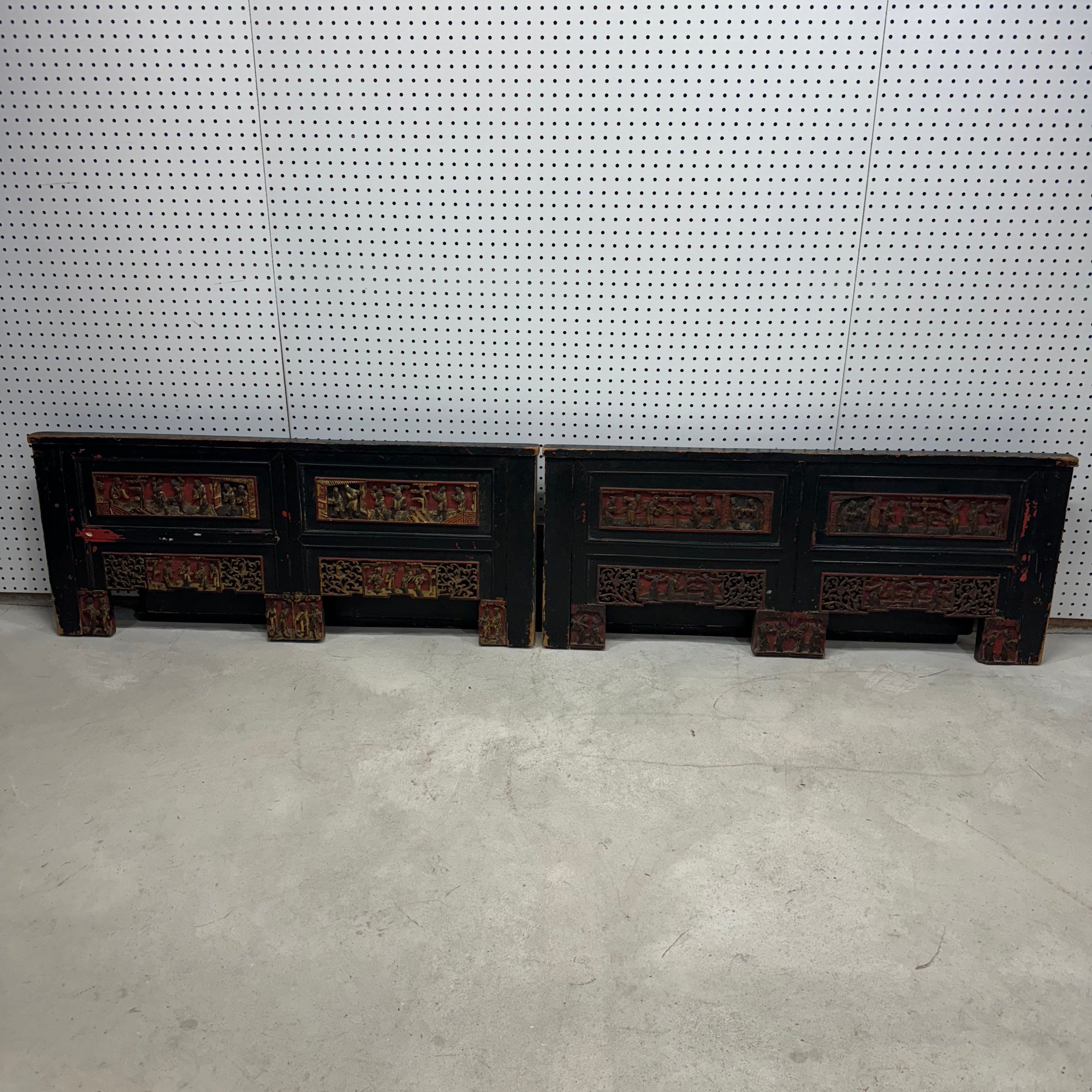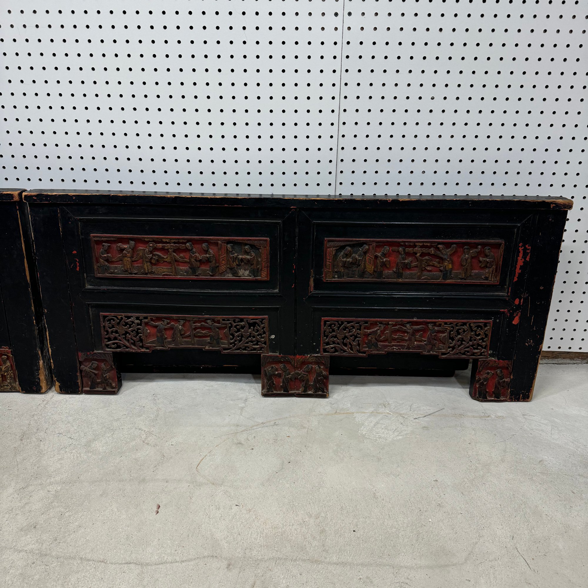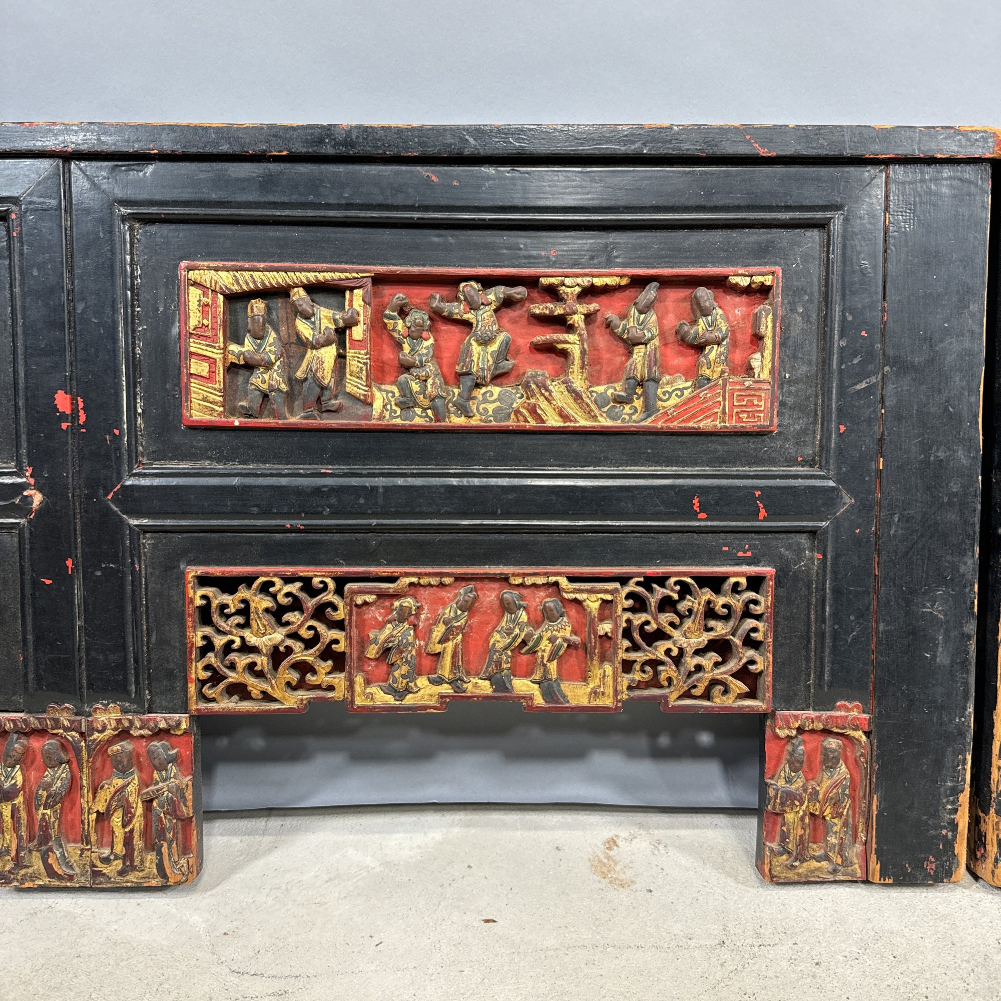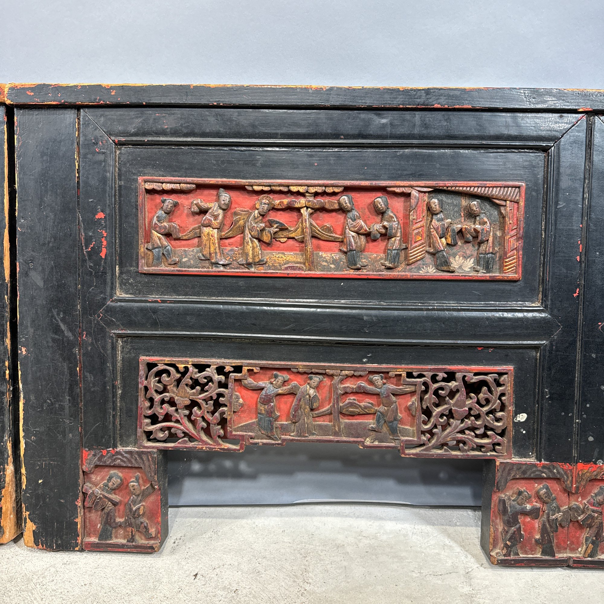 Chinese Carved, Painted and Gilt Wood Bed. Carved with figural panels, painted in red, black and gold.