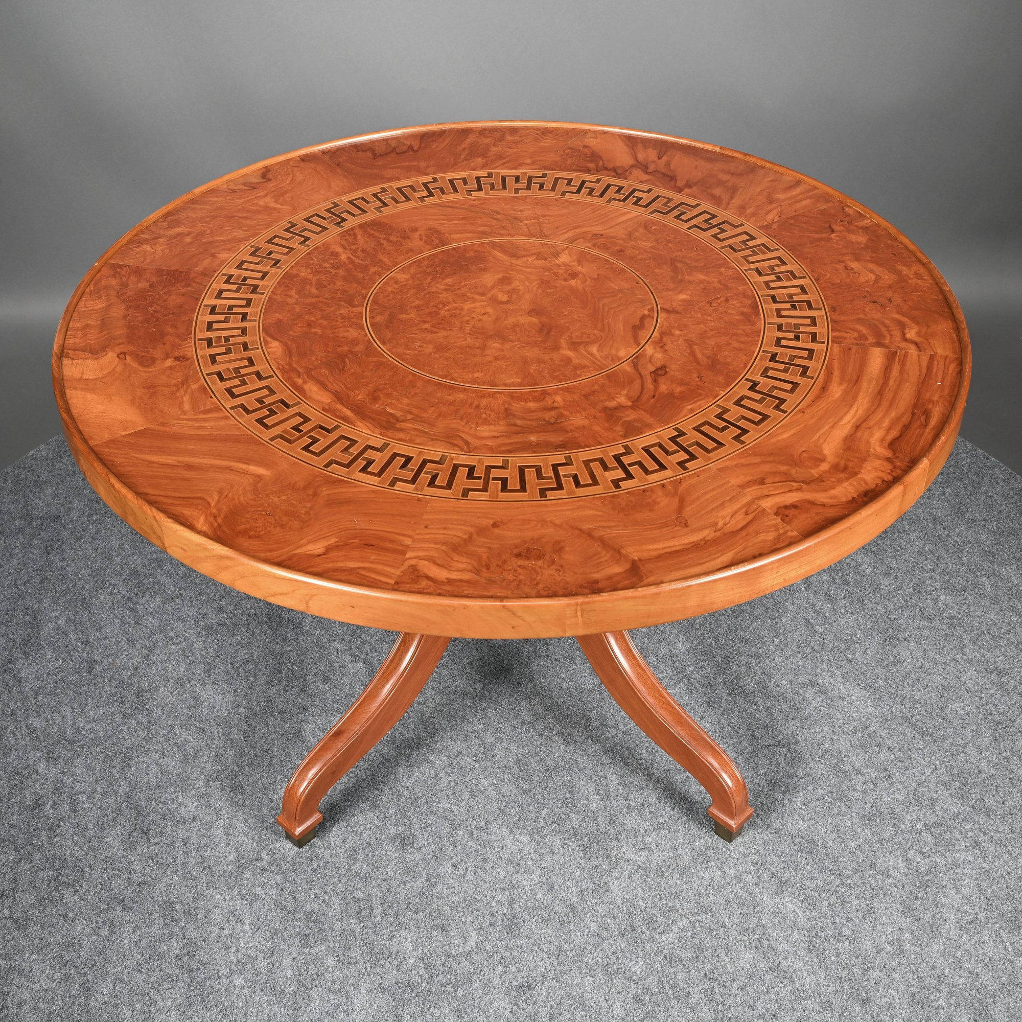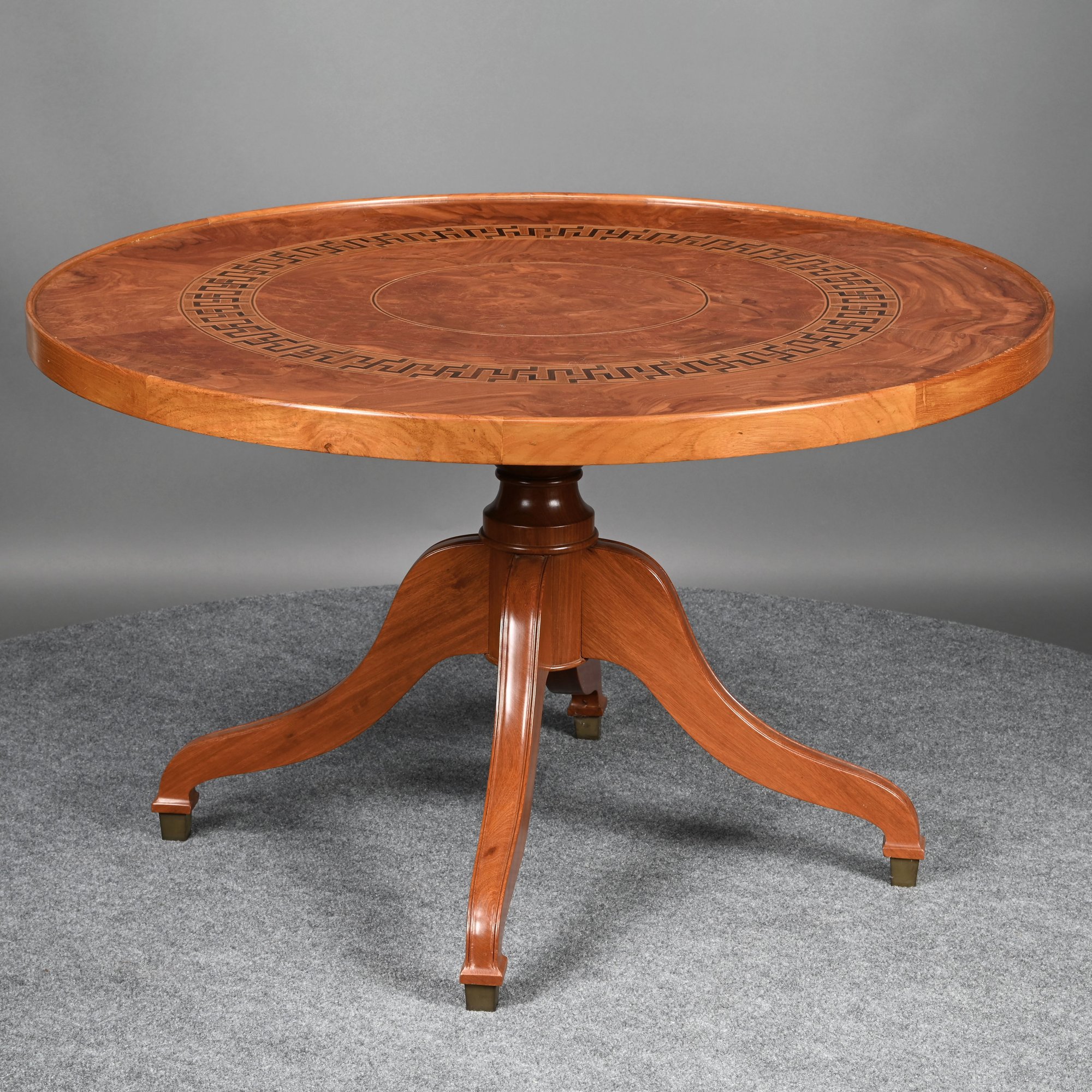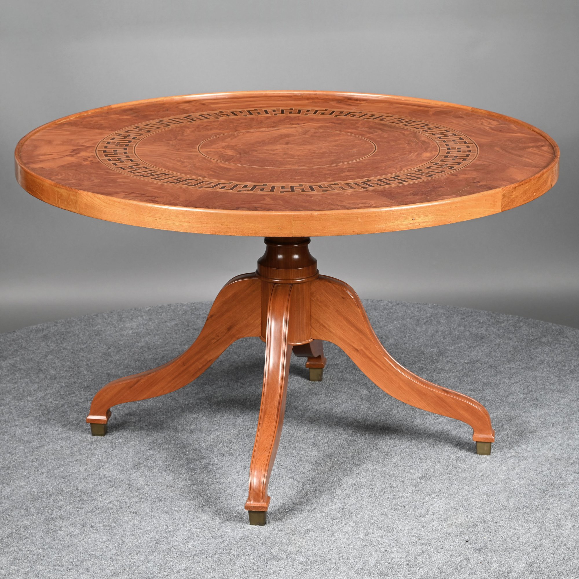 Chinese Inlaid Burlwood Dining Table, Charlotte Horstman, Ltd. The circular dish top inlaid in the center with a circular band within a large keyfret border in various woods, above an urn standard and raised on downswept legs, affixed under the top with two "CHARLOTTE HORSTMAN LTD." paper labels; with a hinged auxiliary demilune tabletop of larger diameter.
