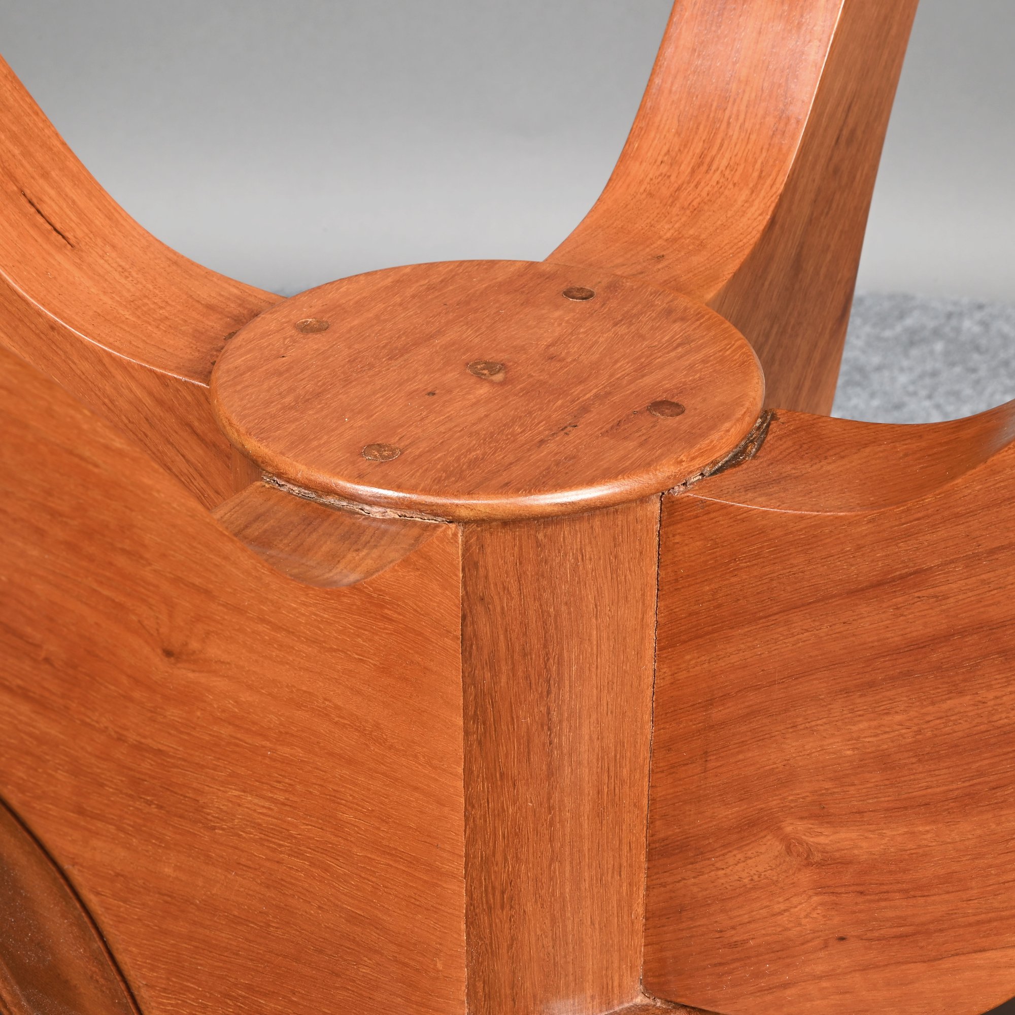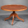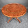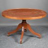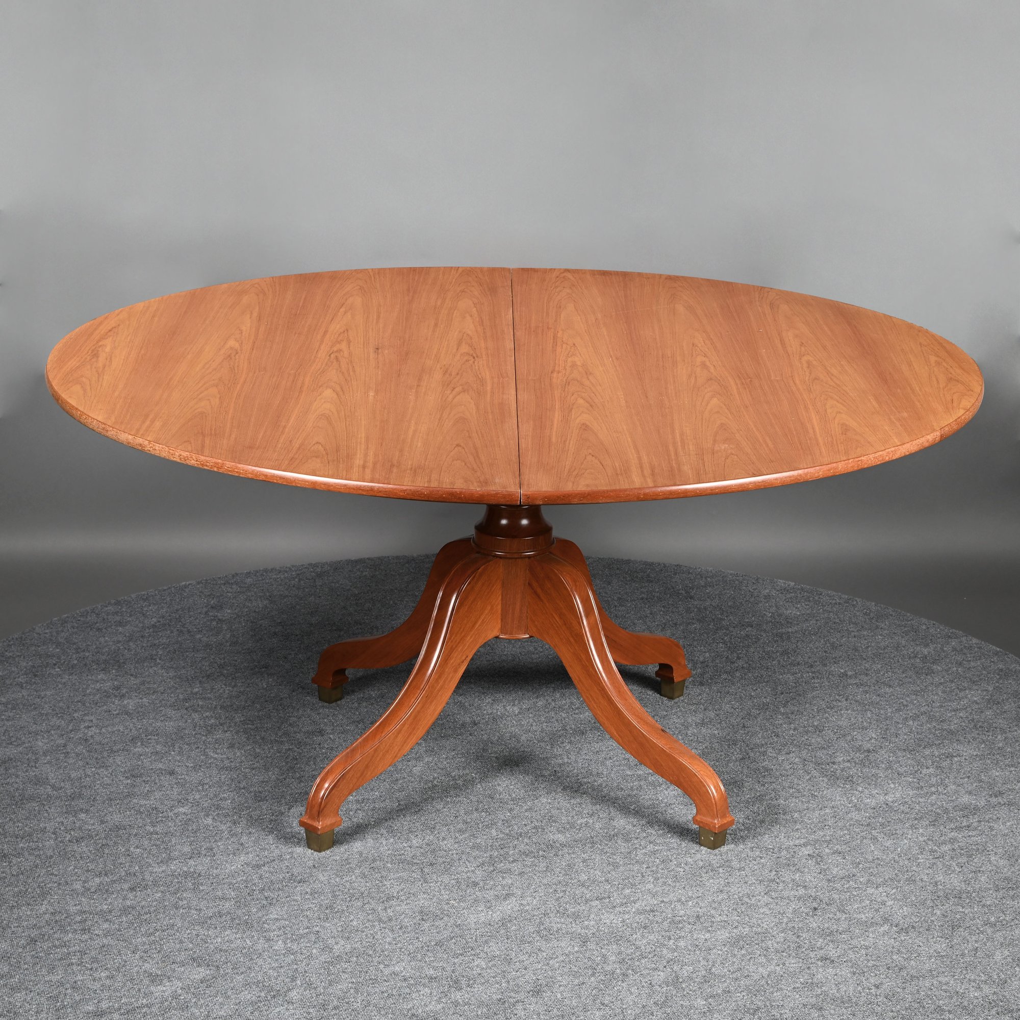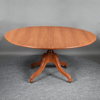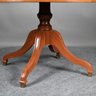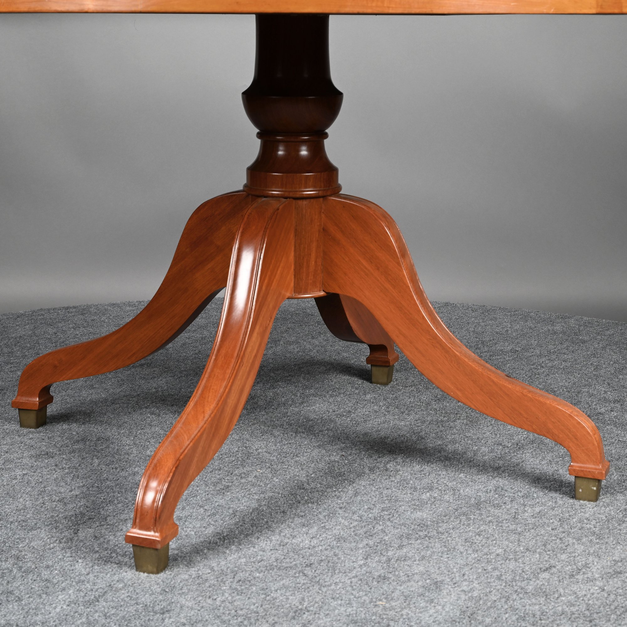 Chinese Inlaid Burlwood Dining Table, Charlotte Horstman, Ltd. The circular dish top inlaid in the center with a circular band within a large keyfret border in various woods, above an urn standard and raised on downswept legs, affixed under the top with two "CHARLOTTE HORSTMAN LTD." paper labels; with a hinged auxiliary demilune tabletop of larger diameter.