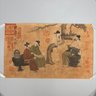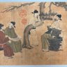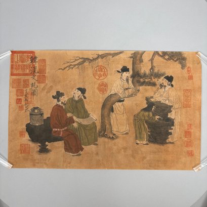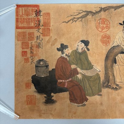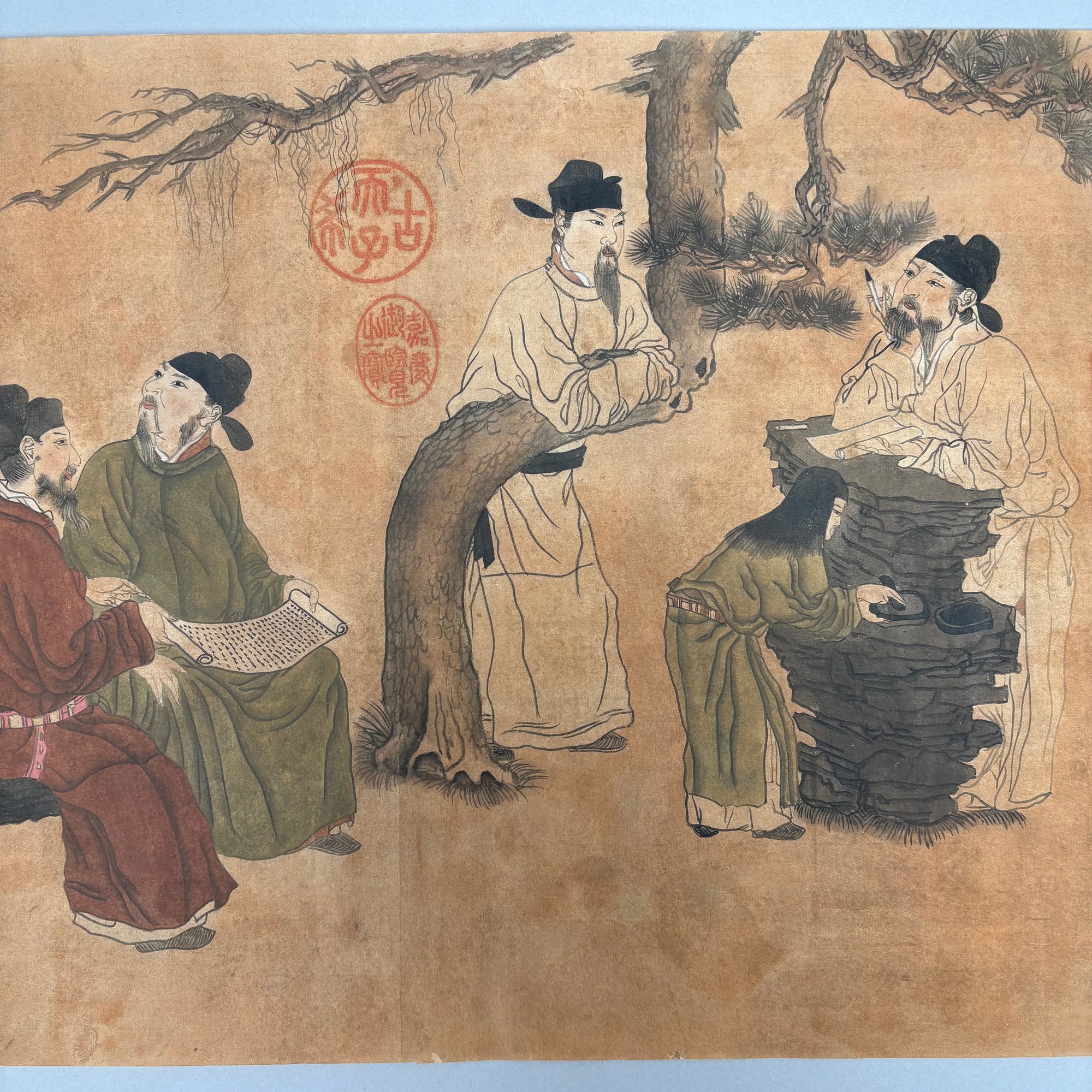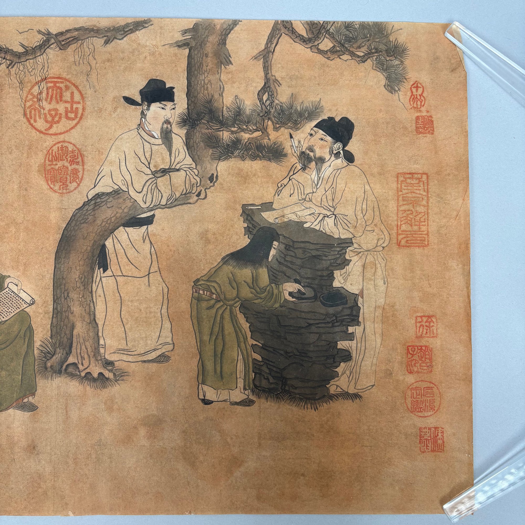 Chinese Painting and Calligraphy. Ink and colors on paper, depicting four scholars, one leaning over a bent pine tree trunk and the other against a rock pile, with an attendant grinding ink on an ink stone, and two scholars holding a scroll, seated on a rock beside a "picnic" or food storage basket, calligraphic inscription left side, and numerous collectors' and/or artists' red seals.