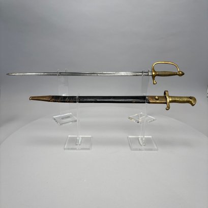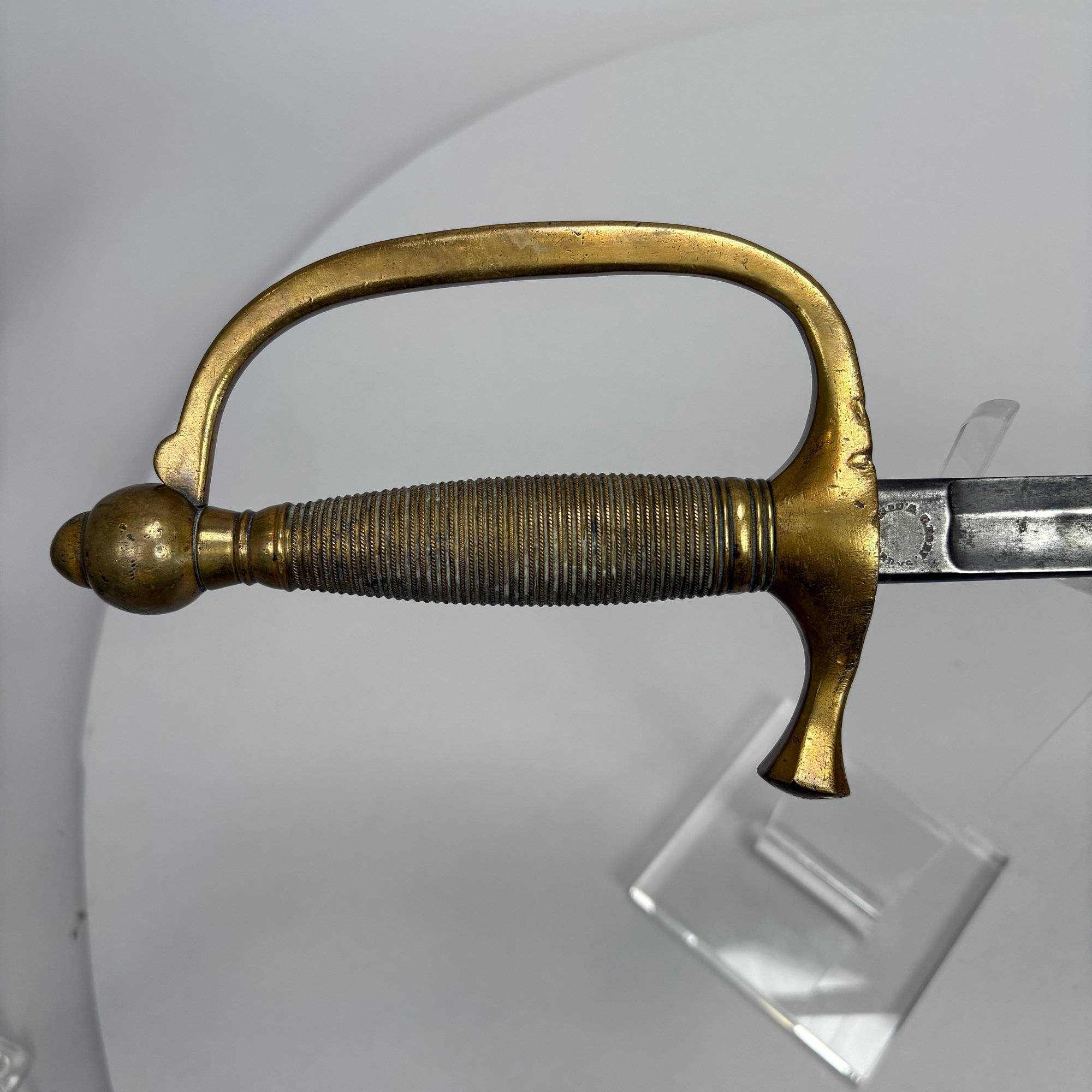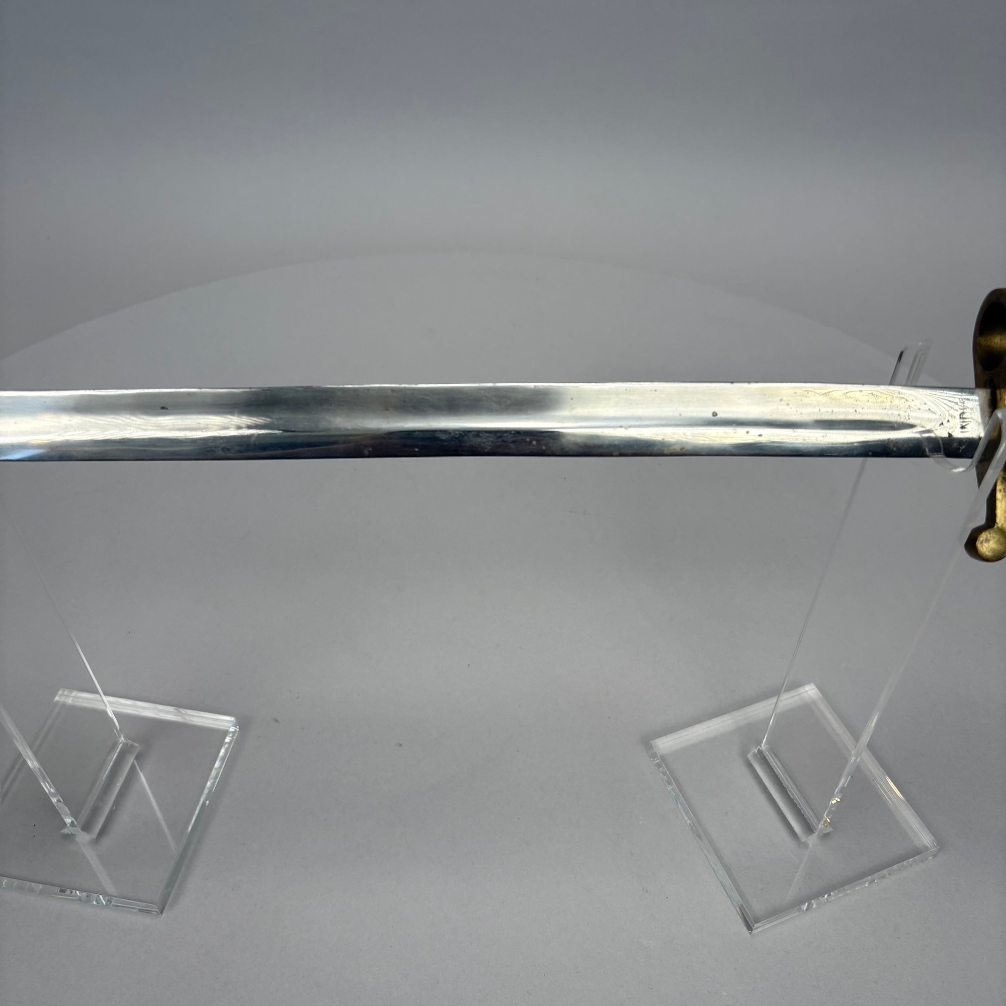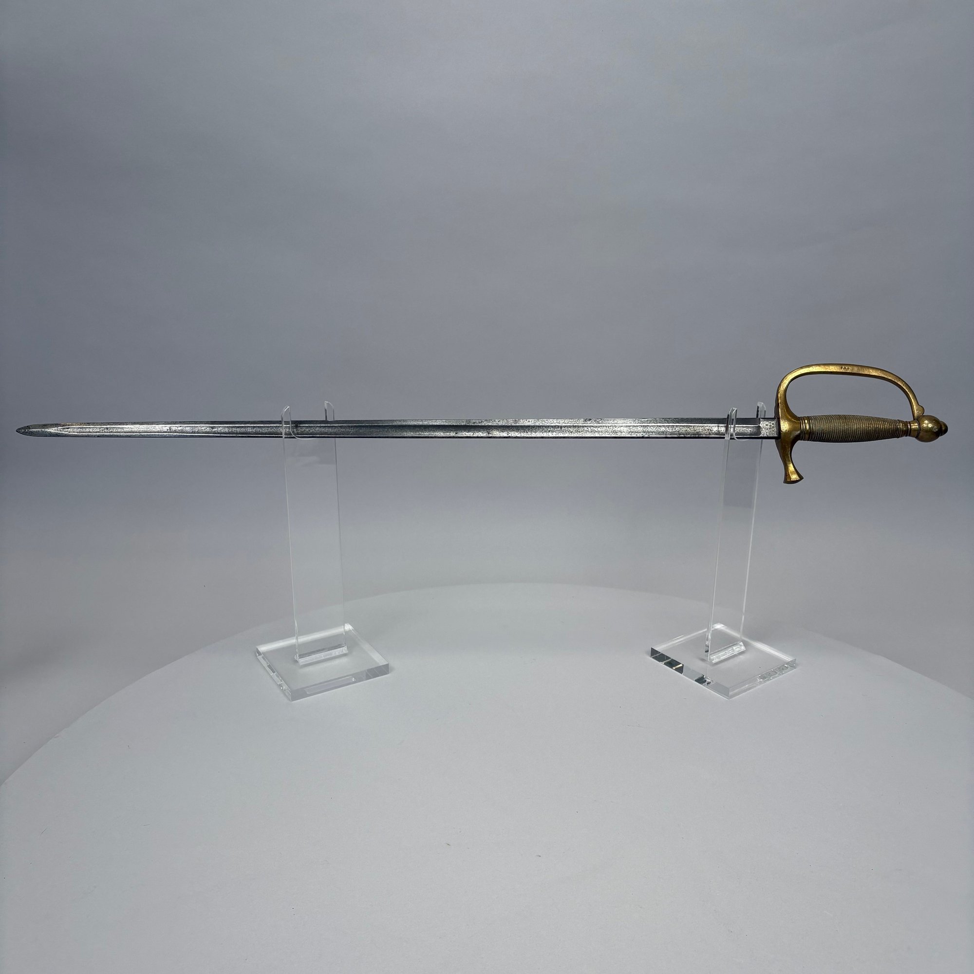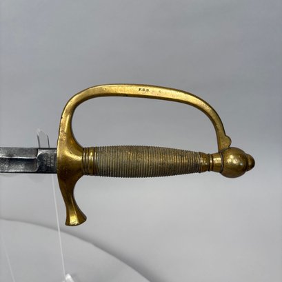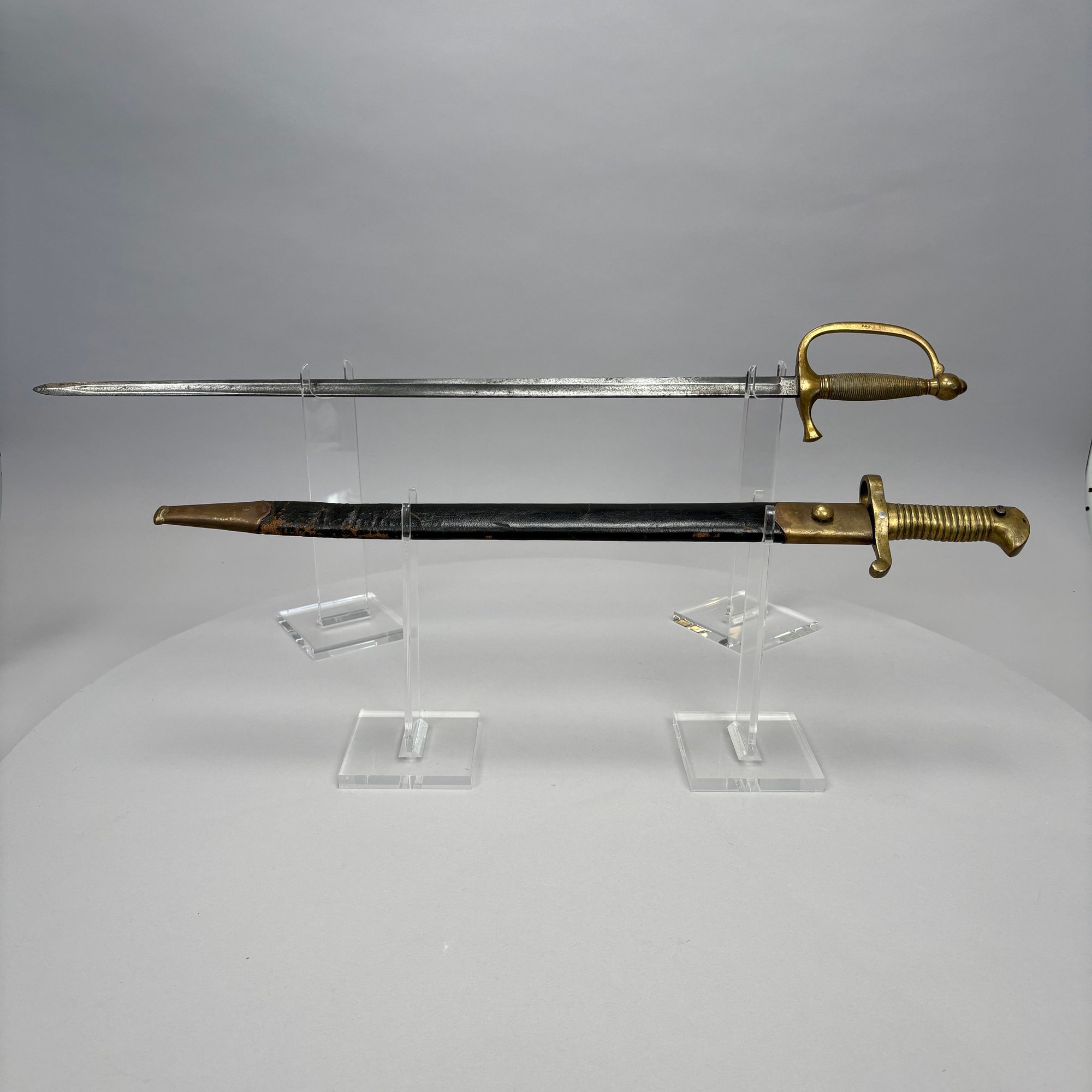 Civil War Era Model 1840 Musician's Sword, Christopher Roby, Chelmsford, Massachusetts, 1863; and an Indian Sword. The musician's sword stamped on one side of the ferule "C. ROBY/ W. CHELMSFORD MS" and on the other "U.S. 1863/ F.S.S." (inspectors initials for Frederic S. Strong); the Indian sword marked "INDIA.,' housed in a leather scabbard.