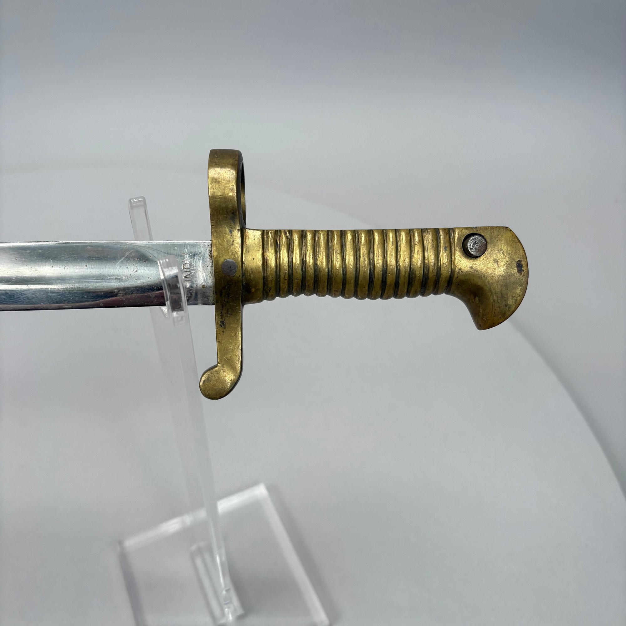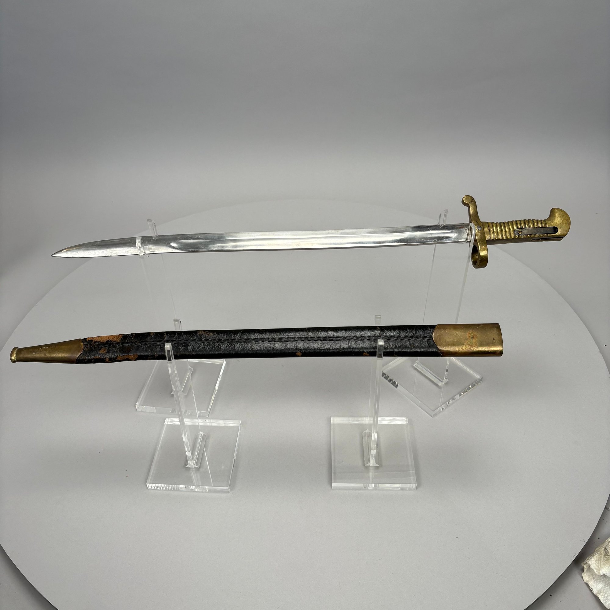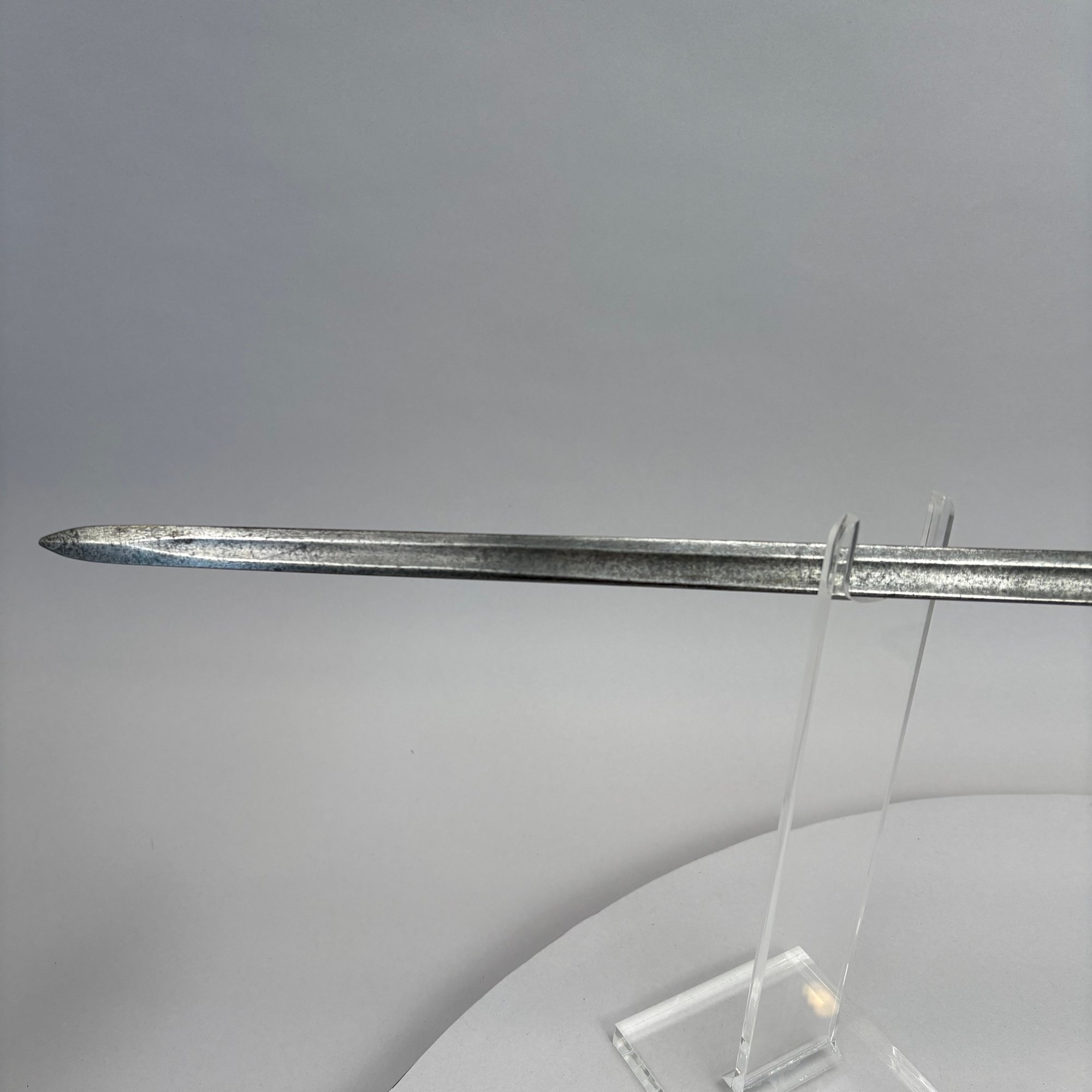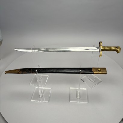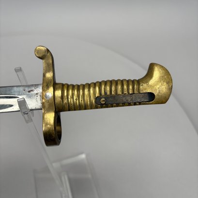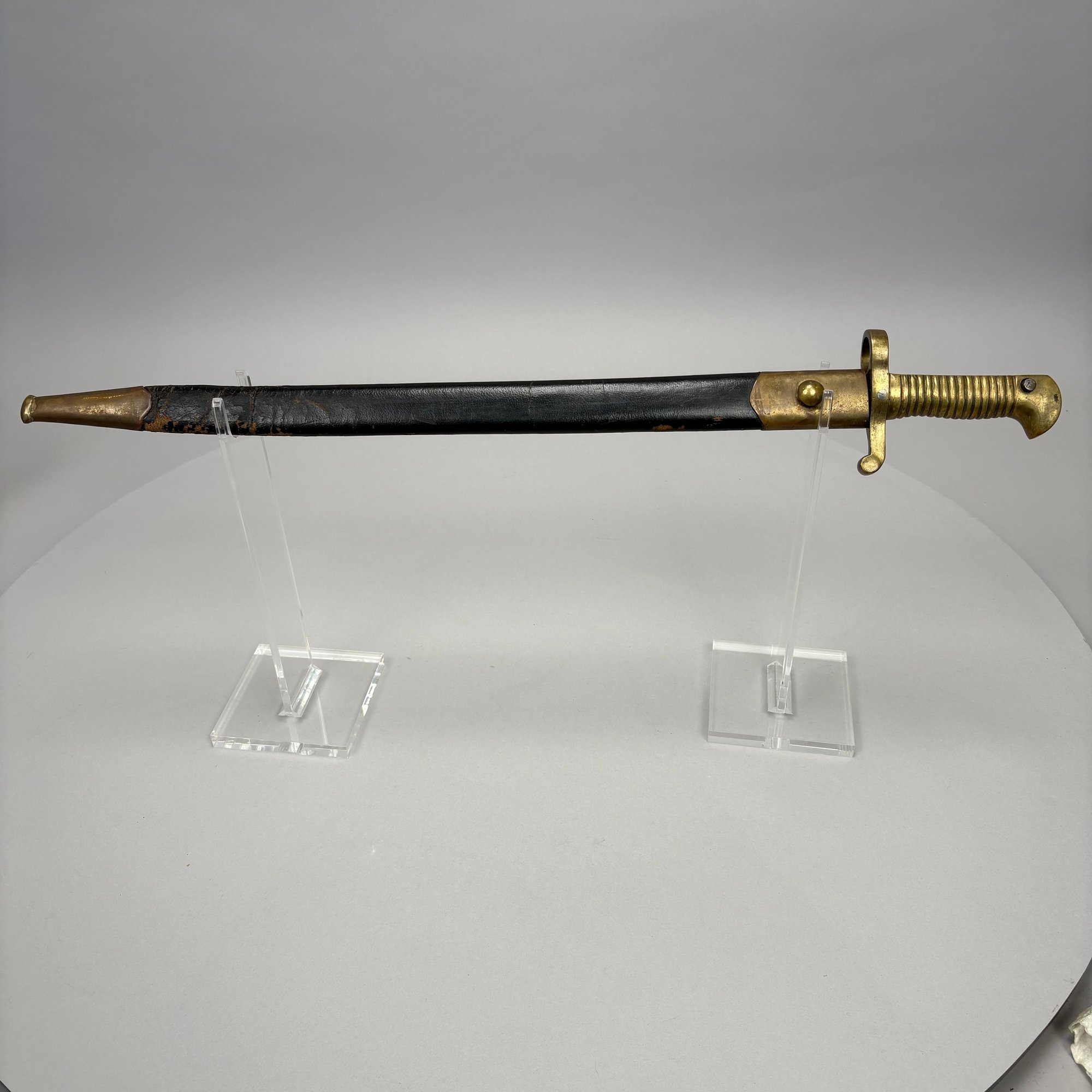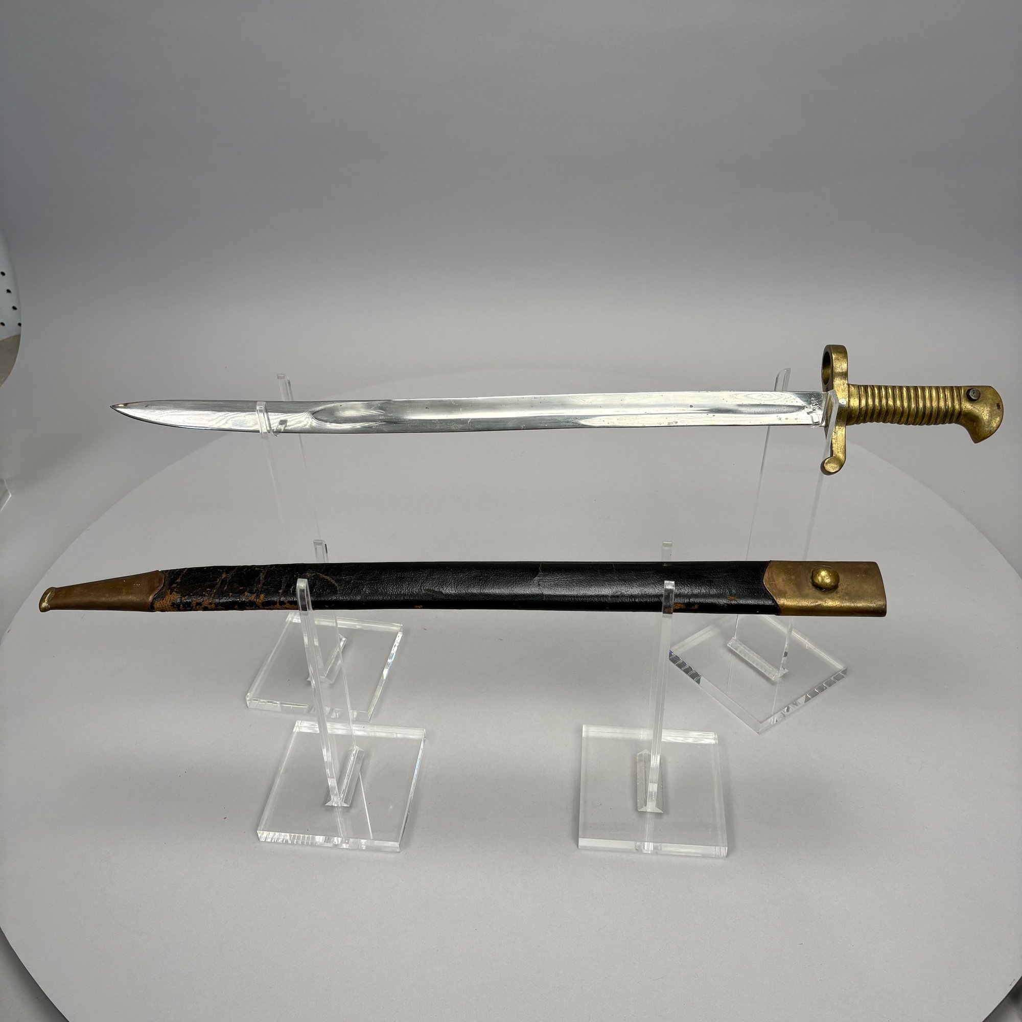 Civil War Era Model 1840 Musician's Sword, Christopher Roby, Chelmsford, Massachusetts, 1863; and an Indian Sword. The musician's sword stamped on one side of the ferule "C. ROBY/ W. CHELMSFORD MS" and on the other "U.S. 1863/ F.S.S." (inspectors initials for Frederic S. Strong); the Indian sword marked "INDIA.,' housed in a leather scabbard.