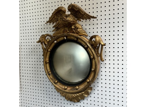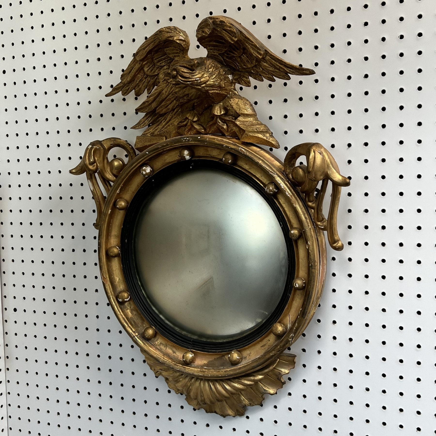 The circular convex mirror plate surrounded by a molded frame applied with spherules, surmounted by a displayed eagle crest within scrolled foliage, above a double rococo shell pendant, with two foliate arms fitted with two cut-glass drip-pans and prisms.